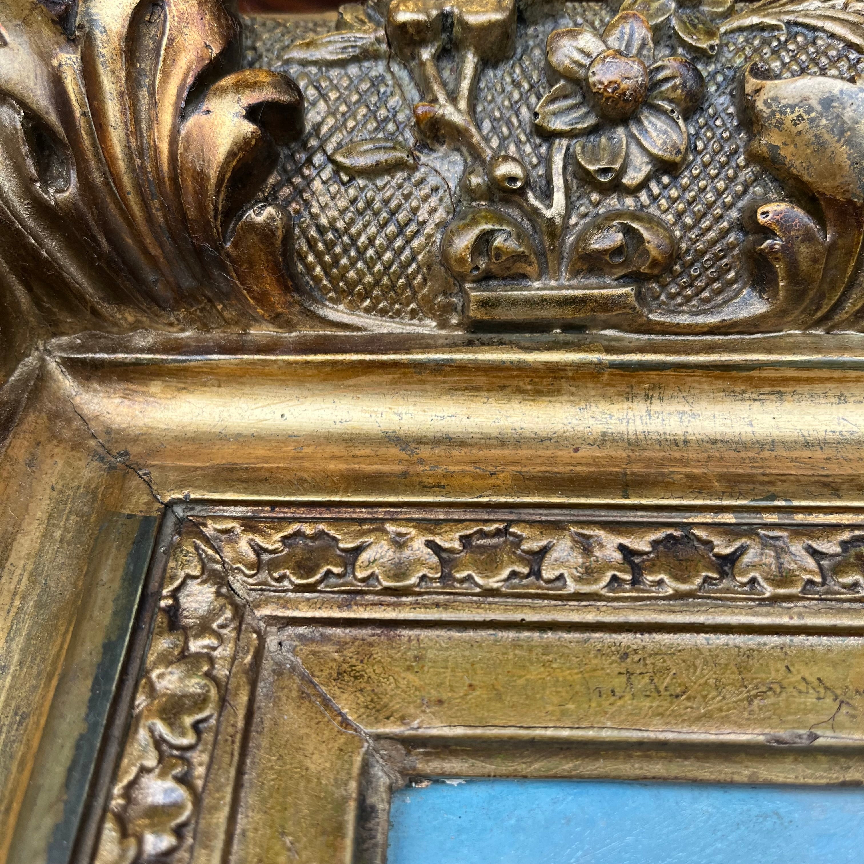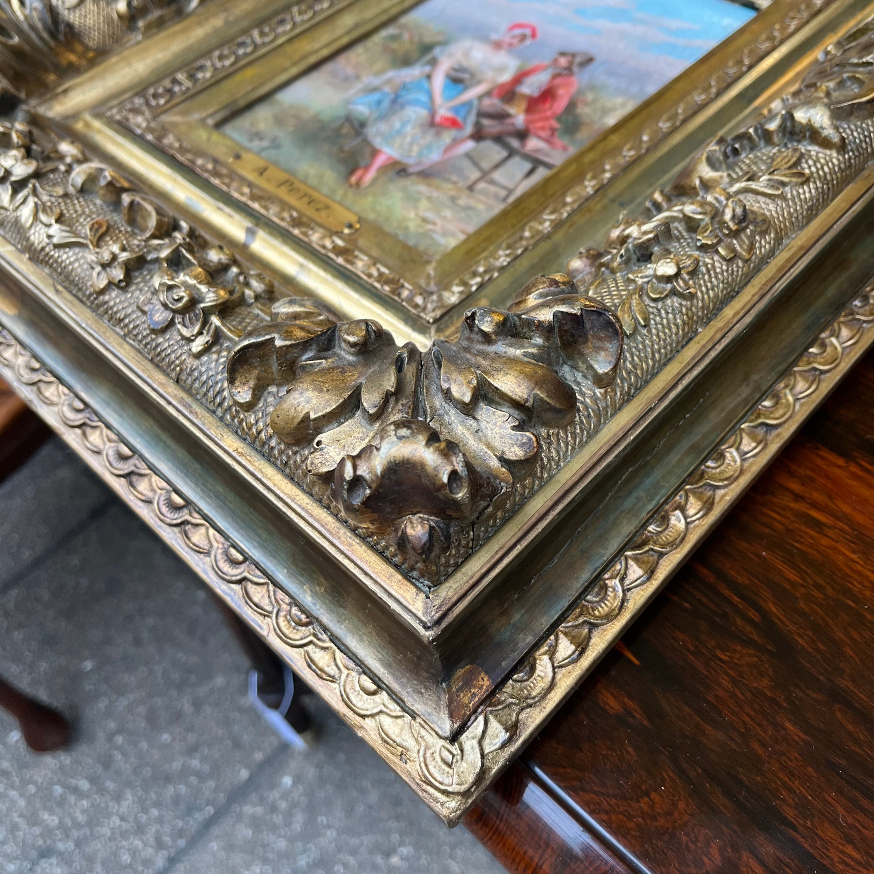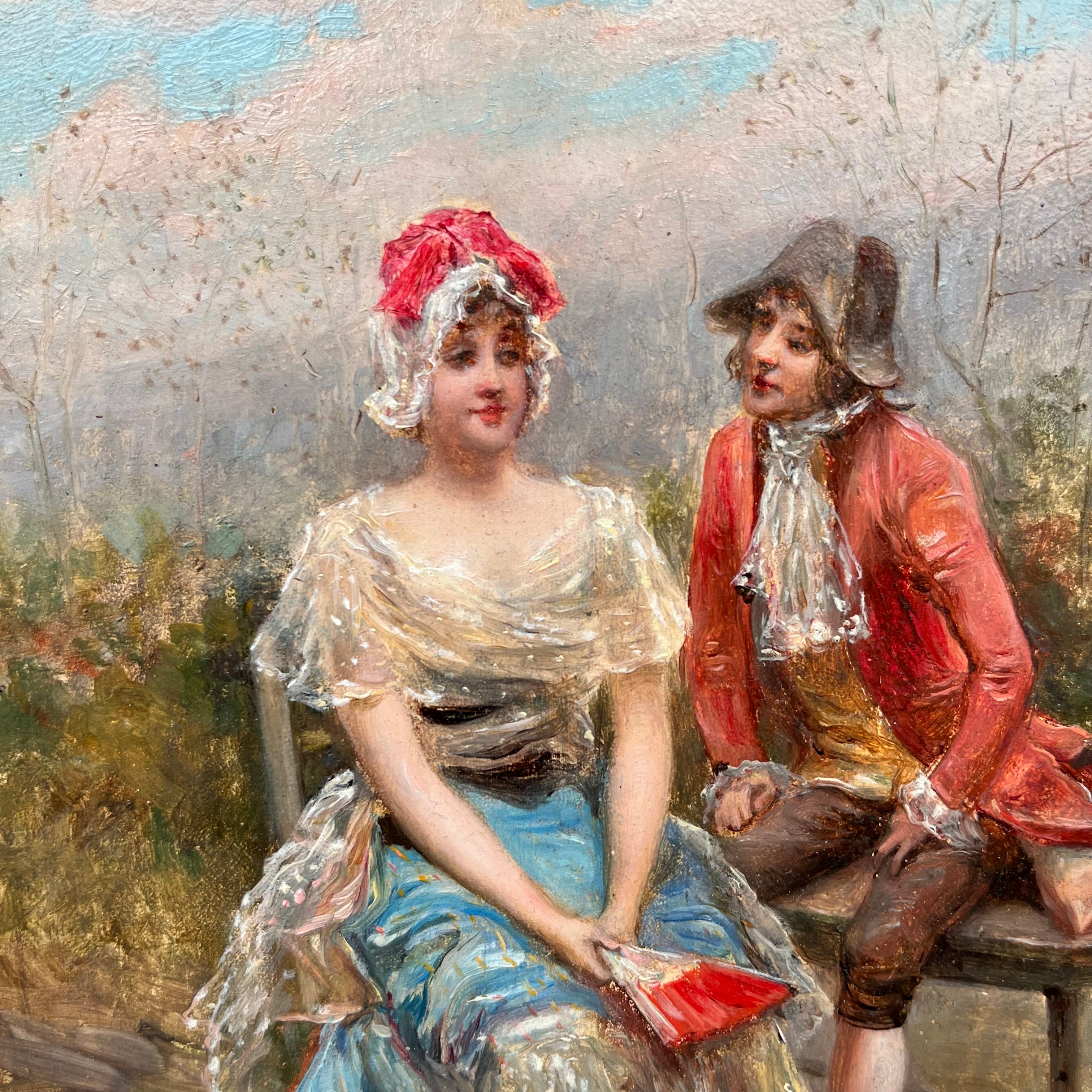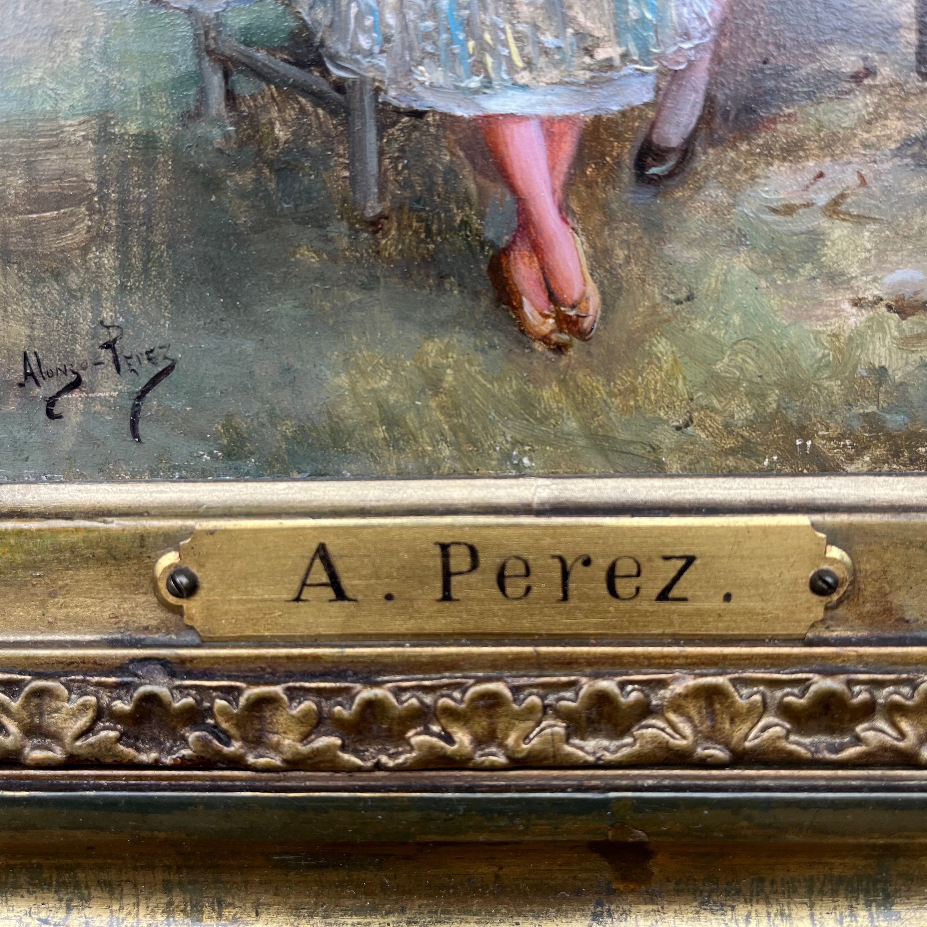 Óleo sobre madera del artista español Alonso Pérez (1881 - 1914), representando a una dama sentada en un jardín, mirando hacia el frente, junto a un caballero. El parece estar diciéndole algo, pero ella no lo mira, sino que mantiene su pose. La escena está detalladamente pintada, capturando con delicadeza no solo las texturas de los encajes y vuelos de su vestido, los dobleces de las telas y los gestos de los personajes, sino que las texturas del paisaje y el cielo. La obra tiene un grandioso marco de madera tallada en relieves, terminada en una elegante pintura dorada.