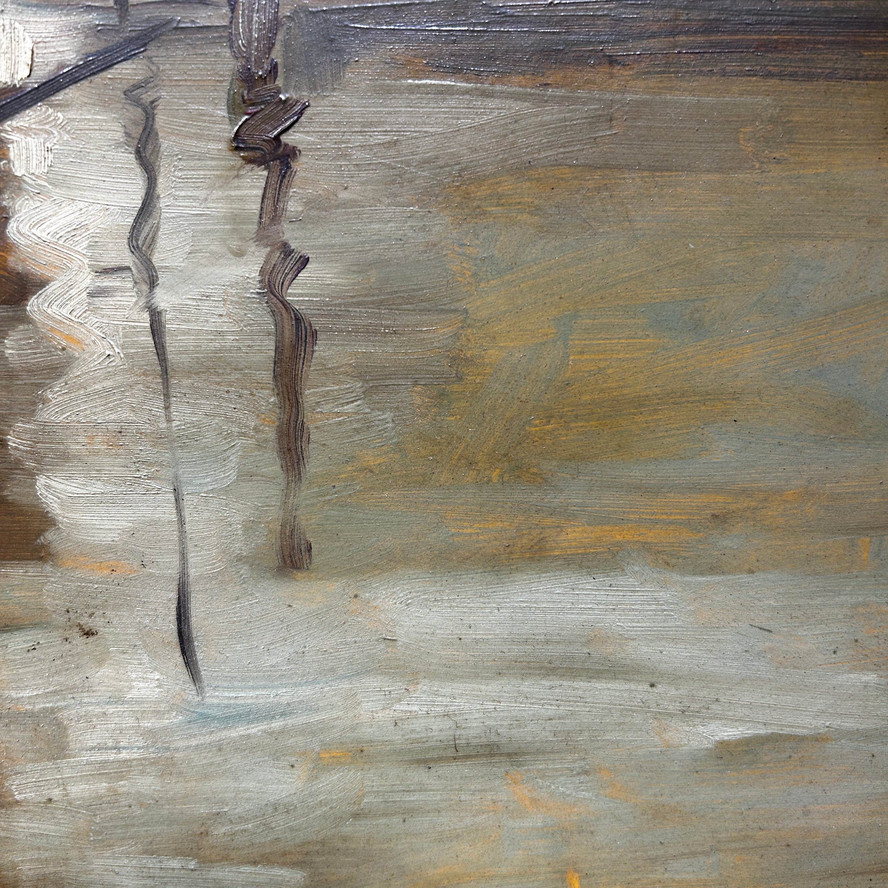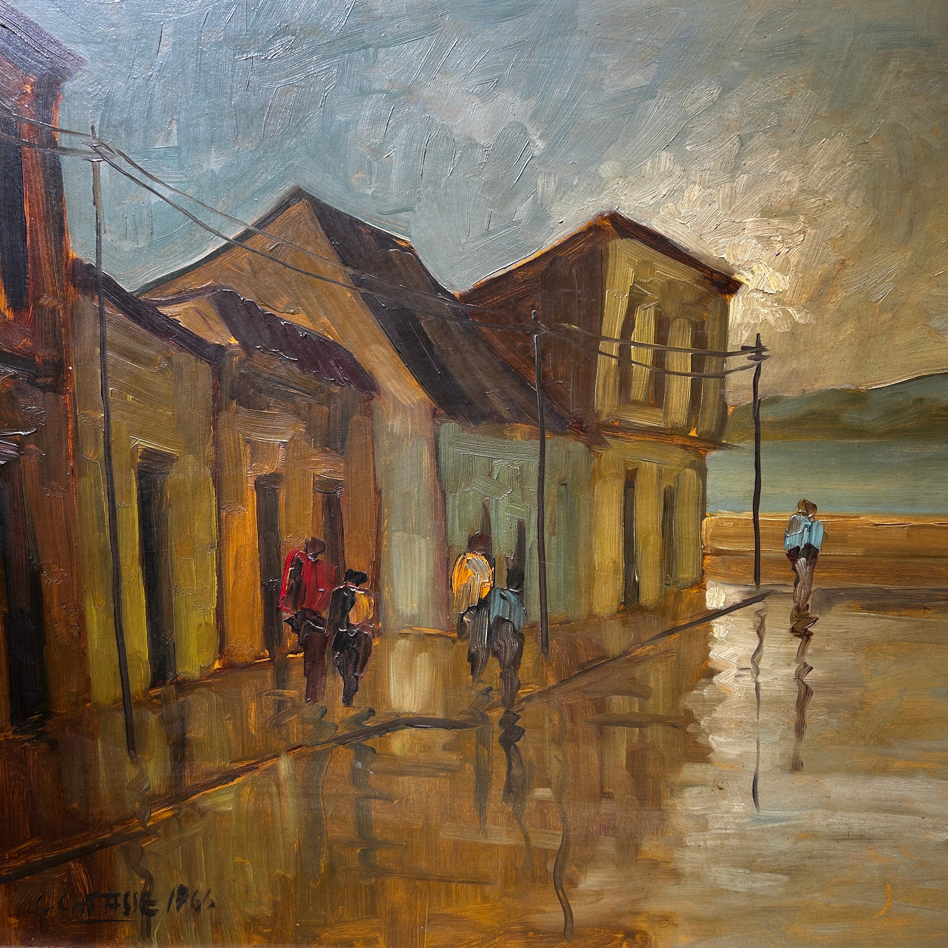 Óleo sobre tela del pintor chileno Carlos Tapia Sepúlveda, conocido como Catasse. Este óleo corresponde a una primera etapa de su obra, antes de radicarse en Ecuador. En ella podemos ver un típico paisaje costero de Chile, probablemente del sur, reconocible por sus casitas coloridas, los días más nublados, y el horizonte abierto. Podemos ver algunos personajes caminando y el reflejo de las calles mojadas. La obra tiene un marco de madera tallada en relieves sutiles y terminada en dorado.