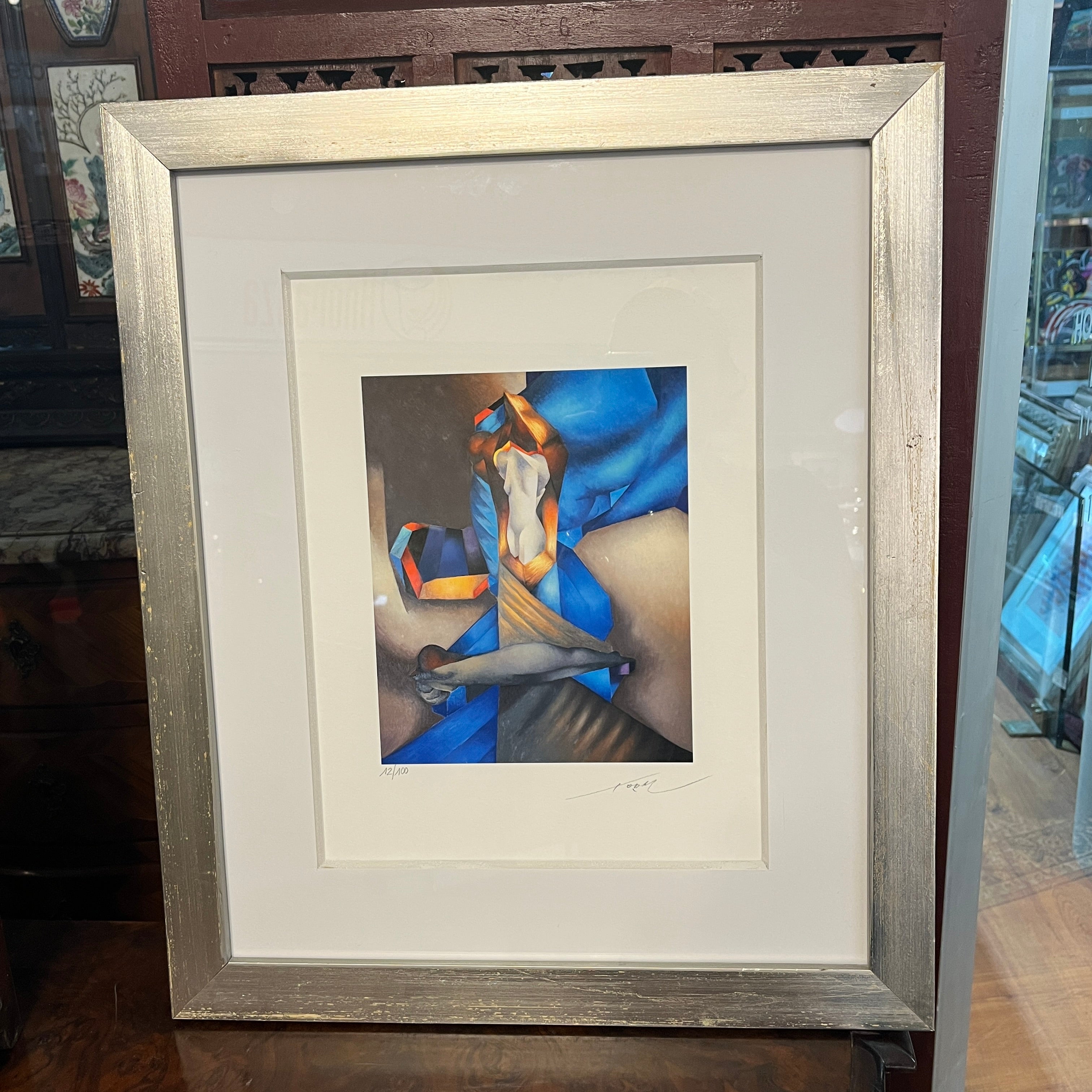 Grabado digital en técnica Giclée sobre papel de algodón, del destacado artista nacional Mario Toral titulada ‘Estatuas en cobalto’. Numerado y firmado a mano. Ejemplar 12/100. La obra tiene un marco de madera, de diseño sobrio y contemporáneo, terminada en plateado.