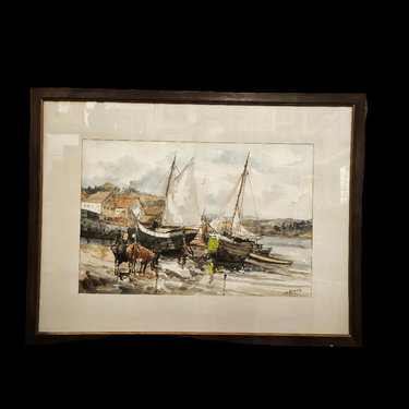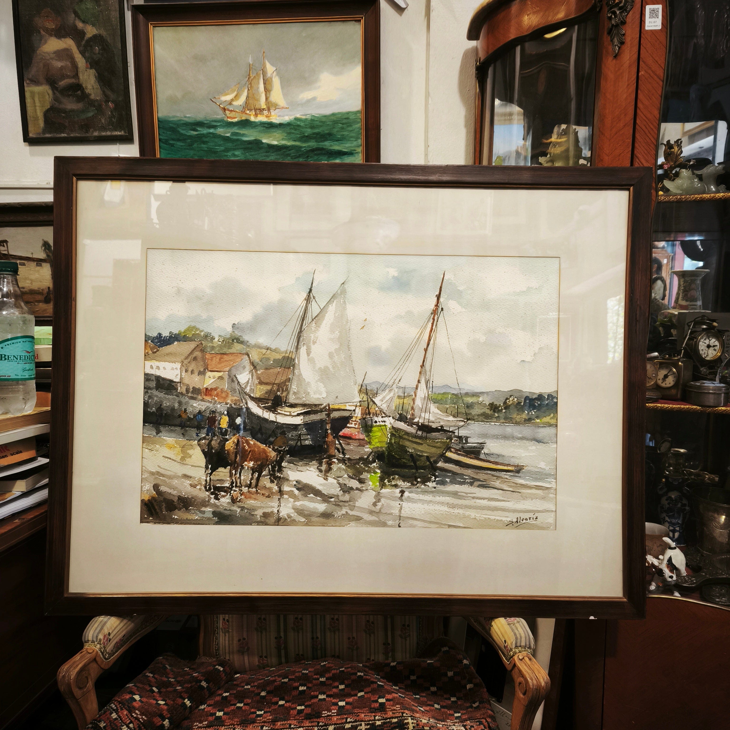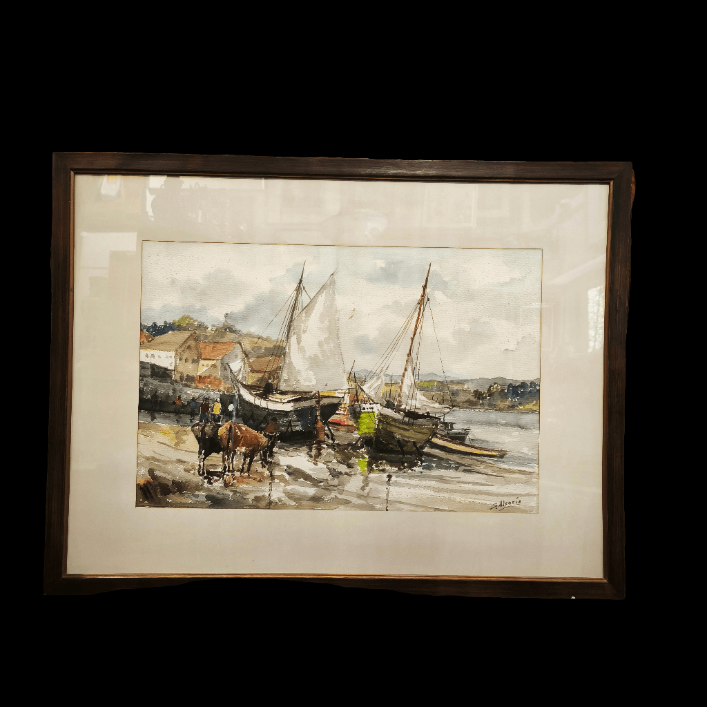 Bella Acuarela del pintor chileno Santiago Alegria, en la obra vemos retratados barcos en la orilla de la playa. Marco de madera cafe claro.