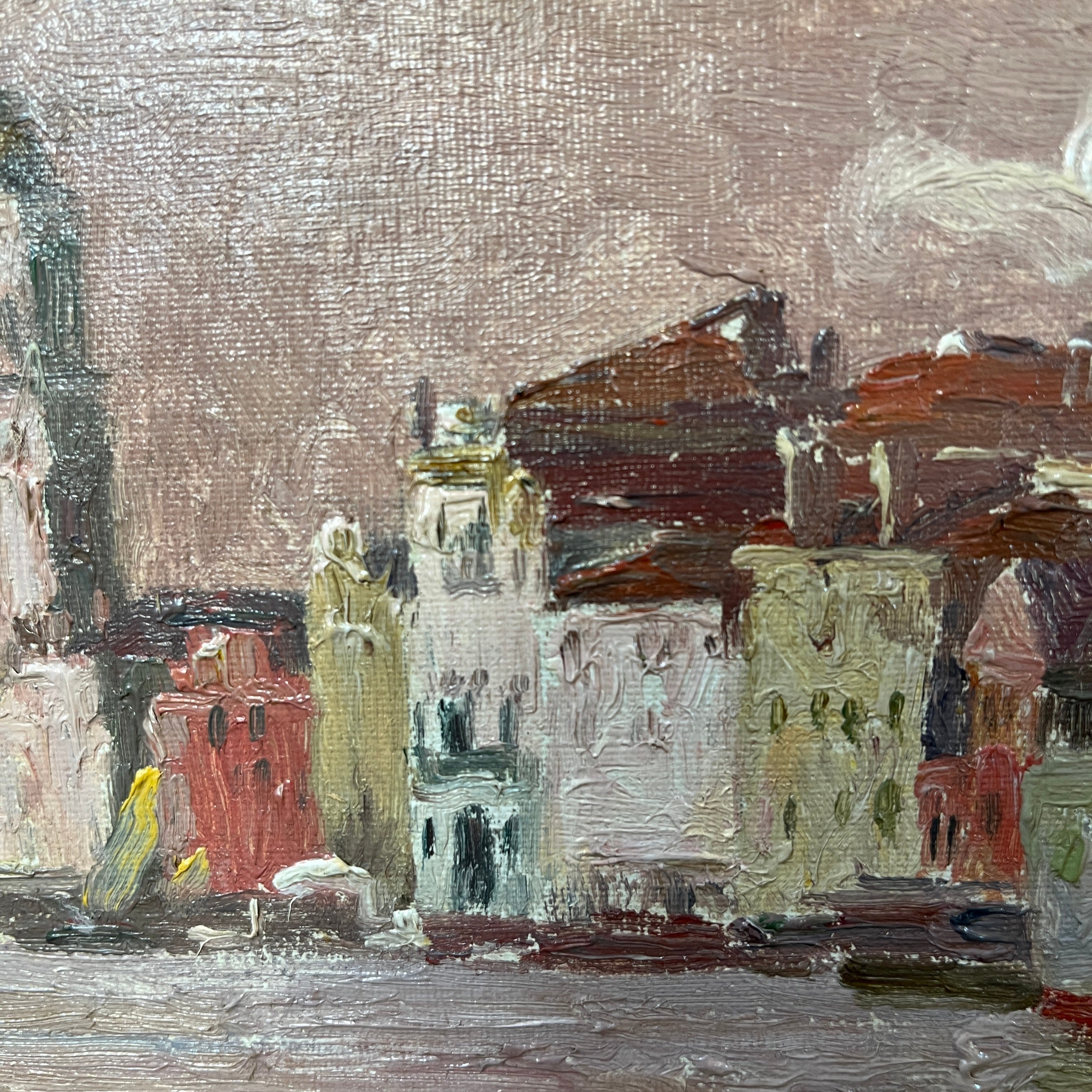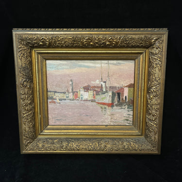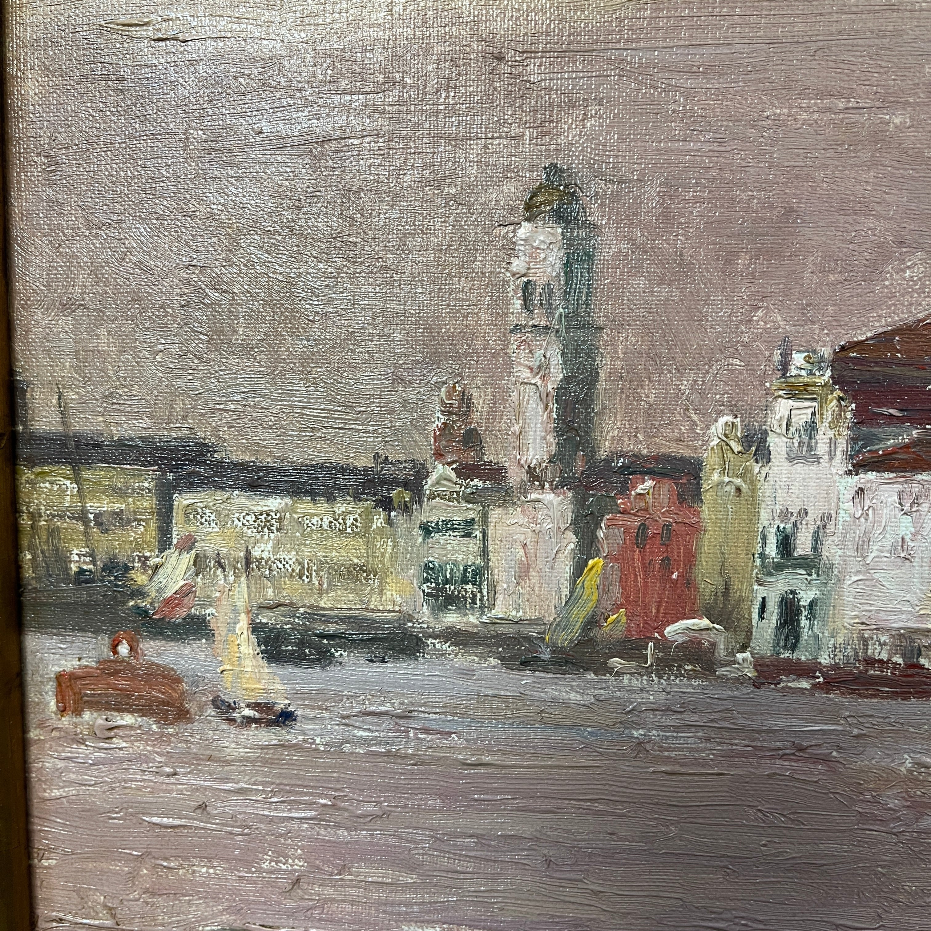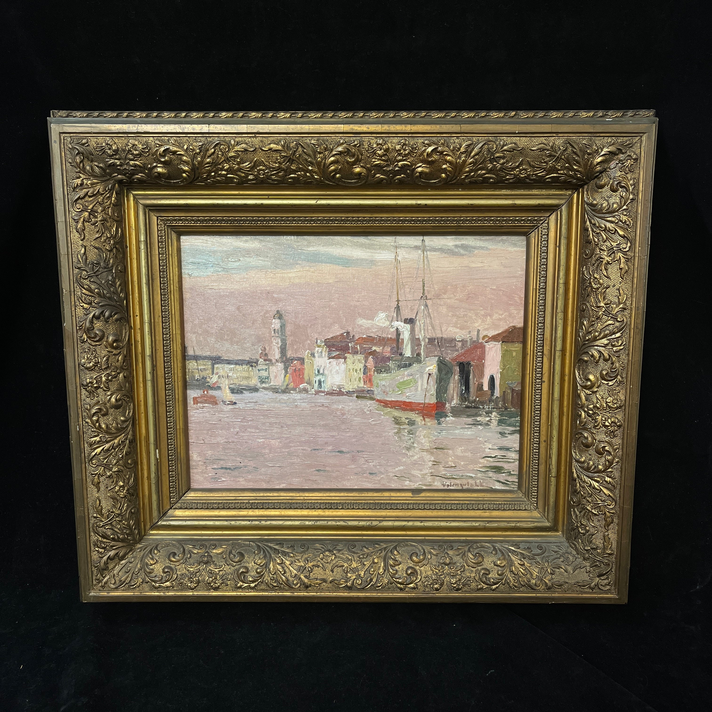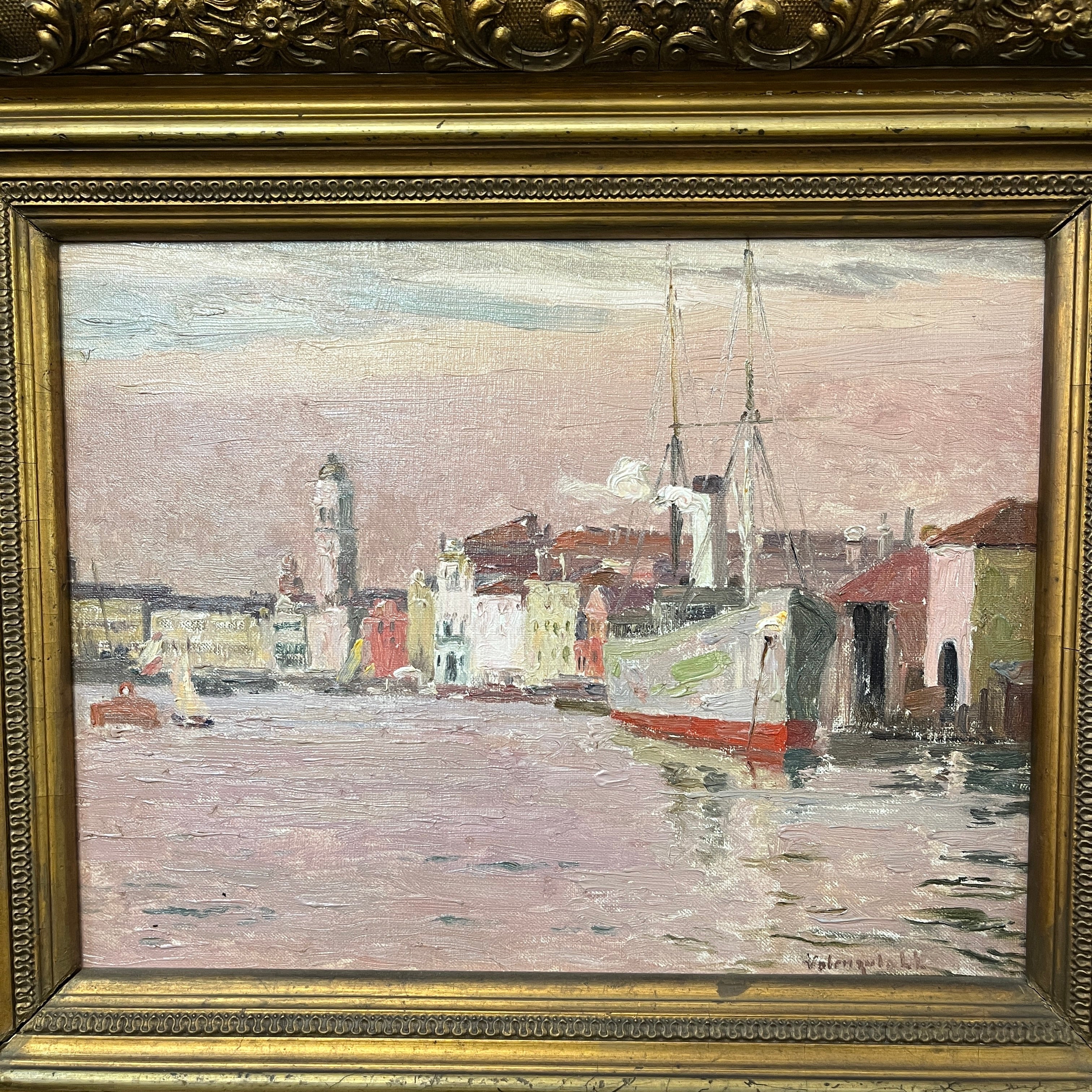 Óleo sobre cartón del reconocido pintor chileno Alberto Valenzuela Llanos, representando una vista desde el canal de la magnífica ciudad italiana de Venecia. Con un tinte rosa, que colorea el cielo y el mar, el artista captura el paisaje con sutileza, haciendo que los edificios y barcos amarrados en el canal sigan una paleta de rojos, grises y blancos. Aunque no tiene fecha escrita, la obra debe haber sido pintada entre 1901 y 1906, años en que el pintor vivió en París y viajó por Europa. La obra está enmarcada en madera pintada en dorado y tallada con decorados de relieves.