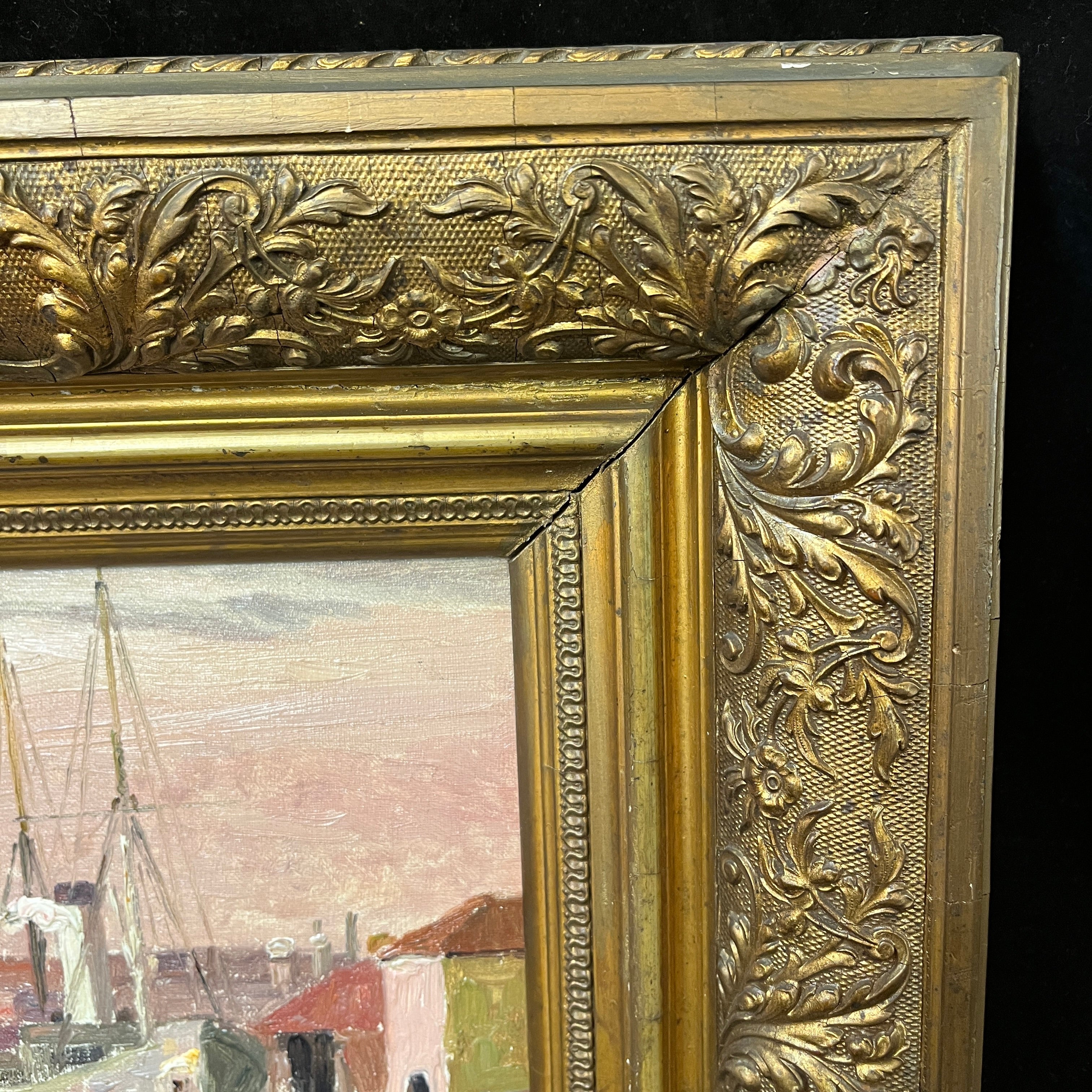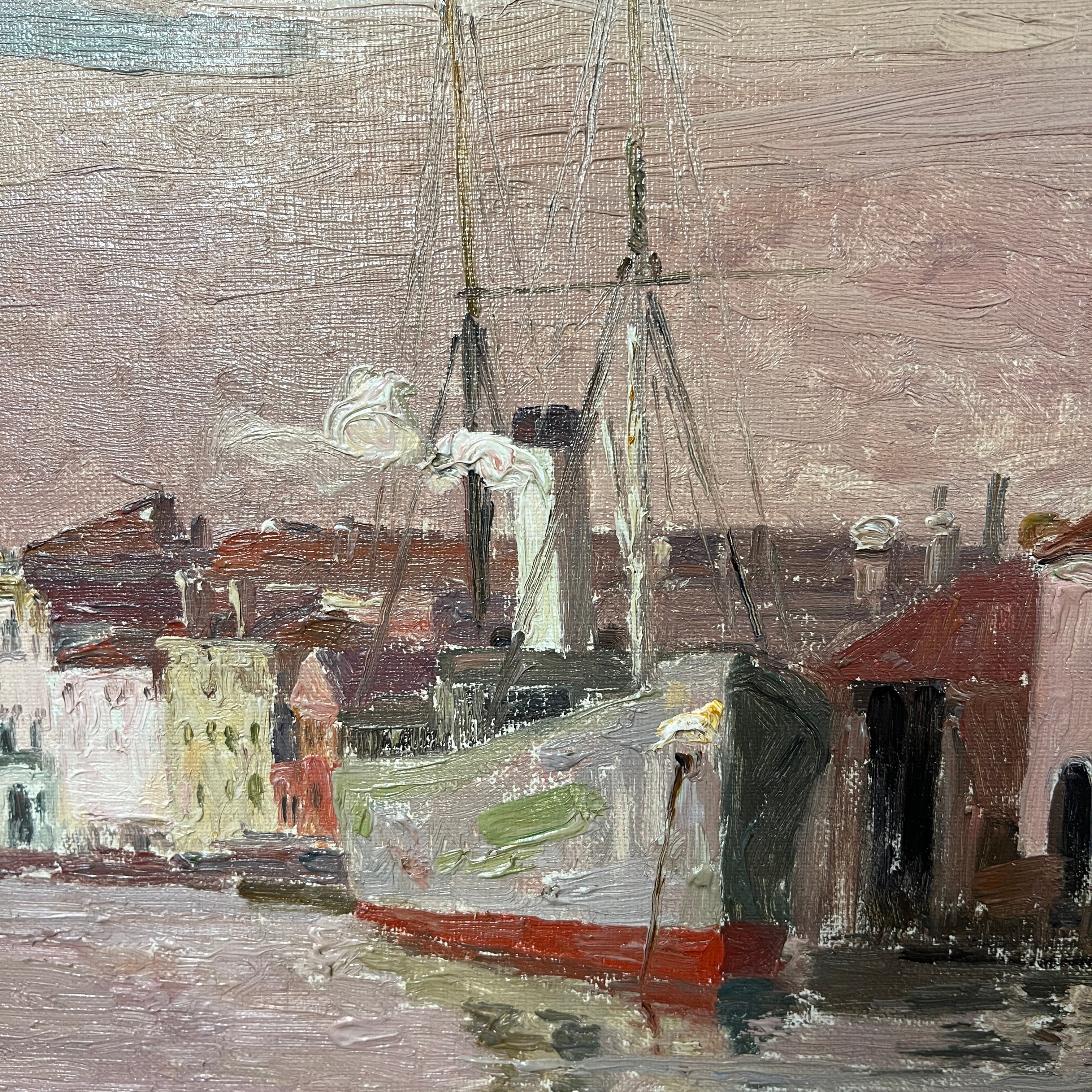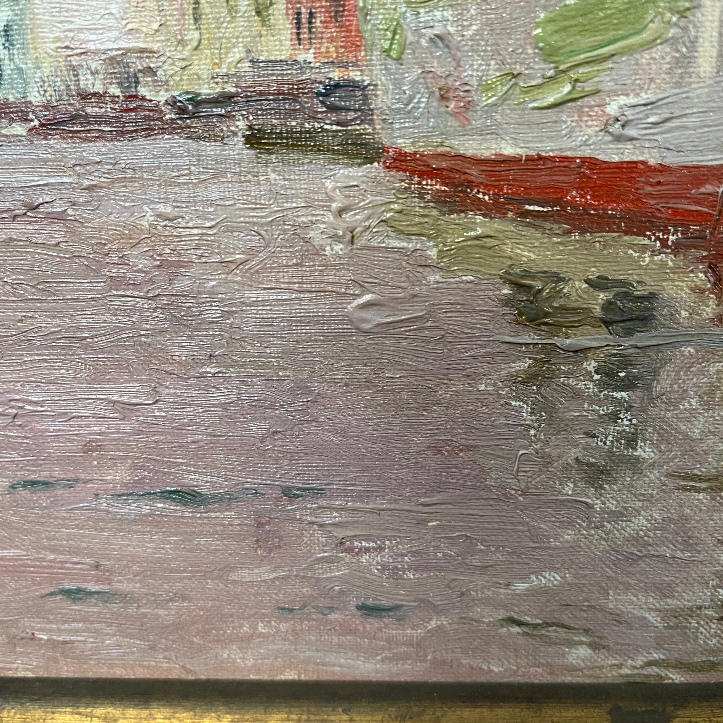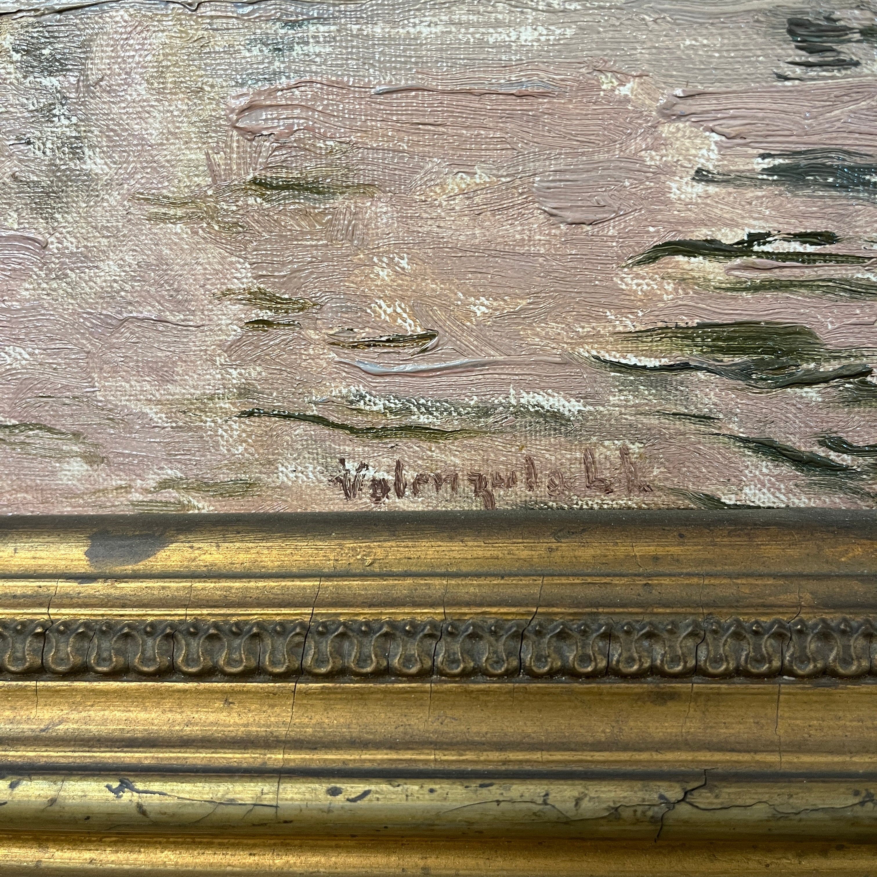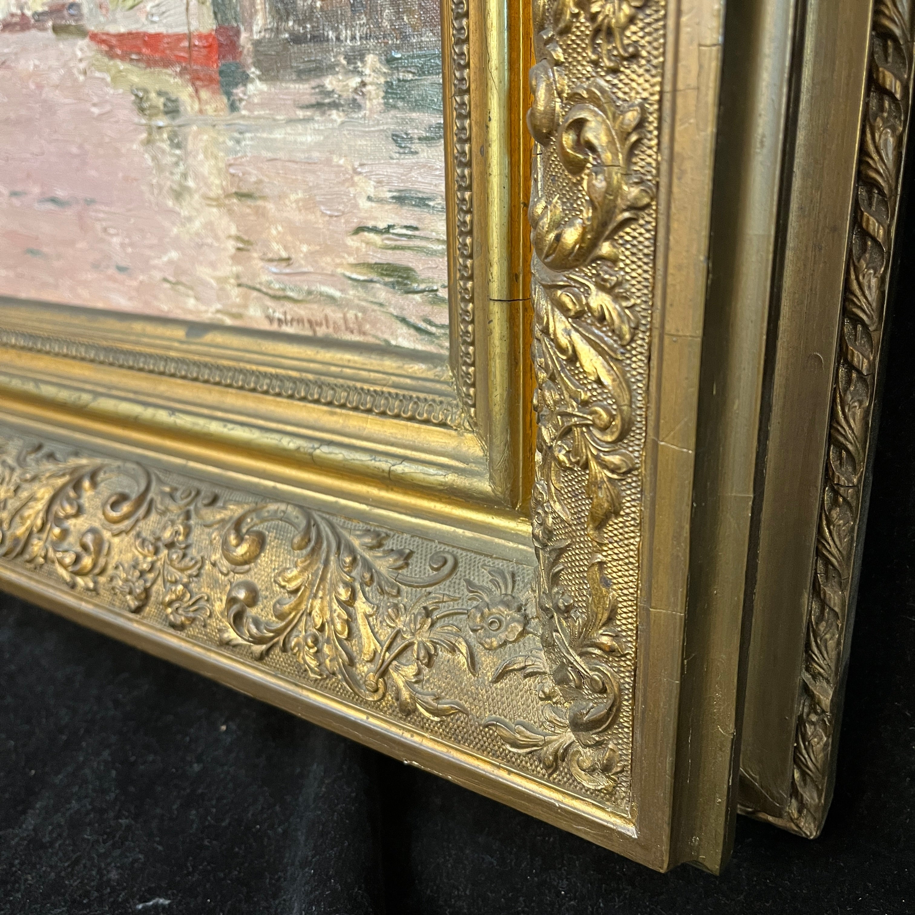 Óleo sobre cartón del reconocido pintor chileno Alberto Valenzuela Llanos, representando una vista desde el canal de la magnífica ciudad italiana de Venecia. Con un tinte rosa, que colorea el cielo y el mar, el artista captura el paisaje con sutileza, haciendo que los edificios y barcos amarrados en el canal sigan una paleta de rojos, grises y blancos. Aunque no tiene fecha escrita, la obra debe haber sido pintada entre 1901 y 1906, años en que el pintor vivió en París y viajó por Europa. La obra está enmarcada en madera pintada en dorado y tallada con decorados de relieves.