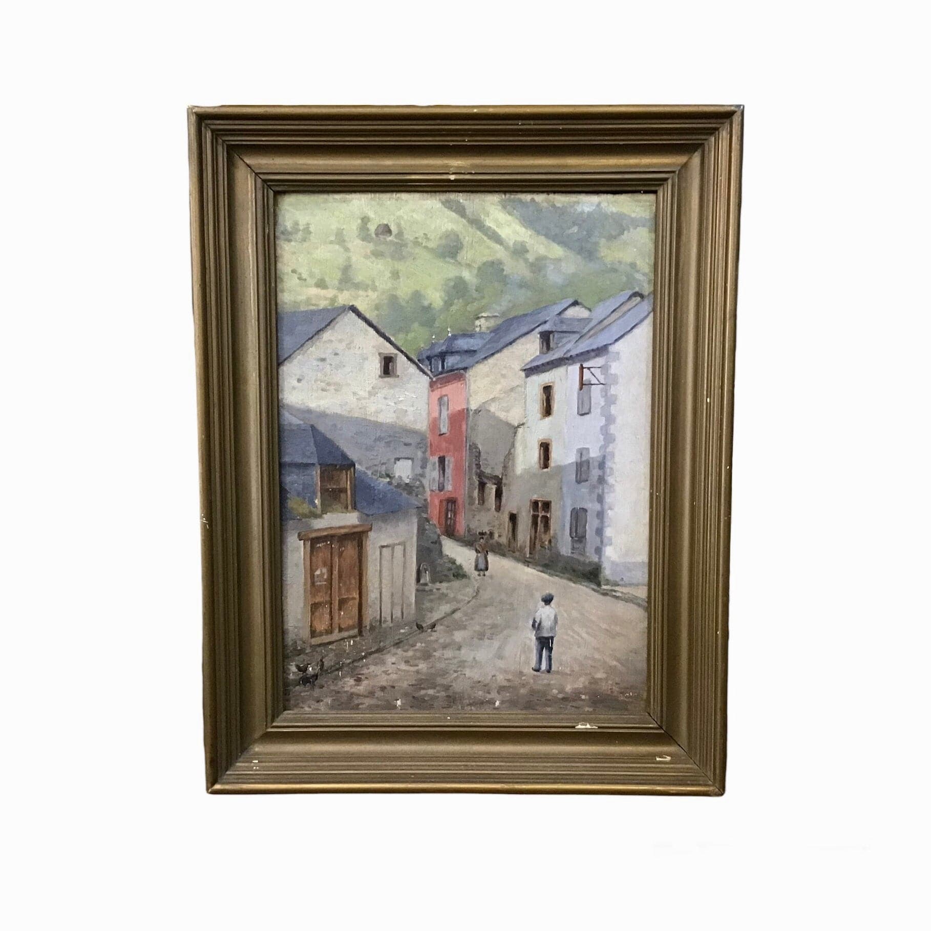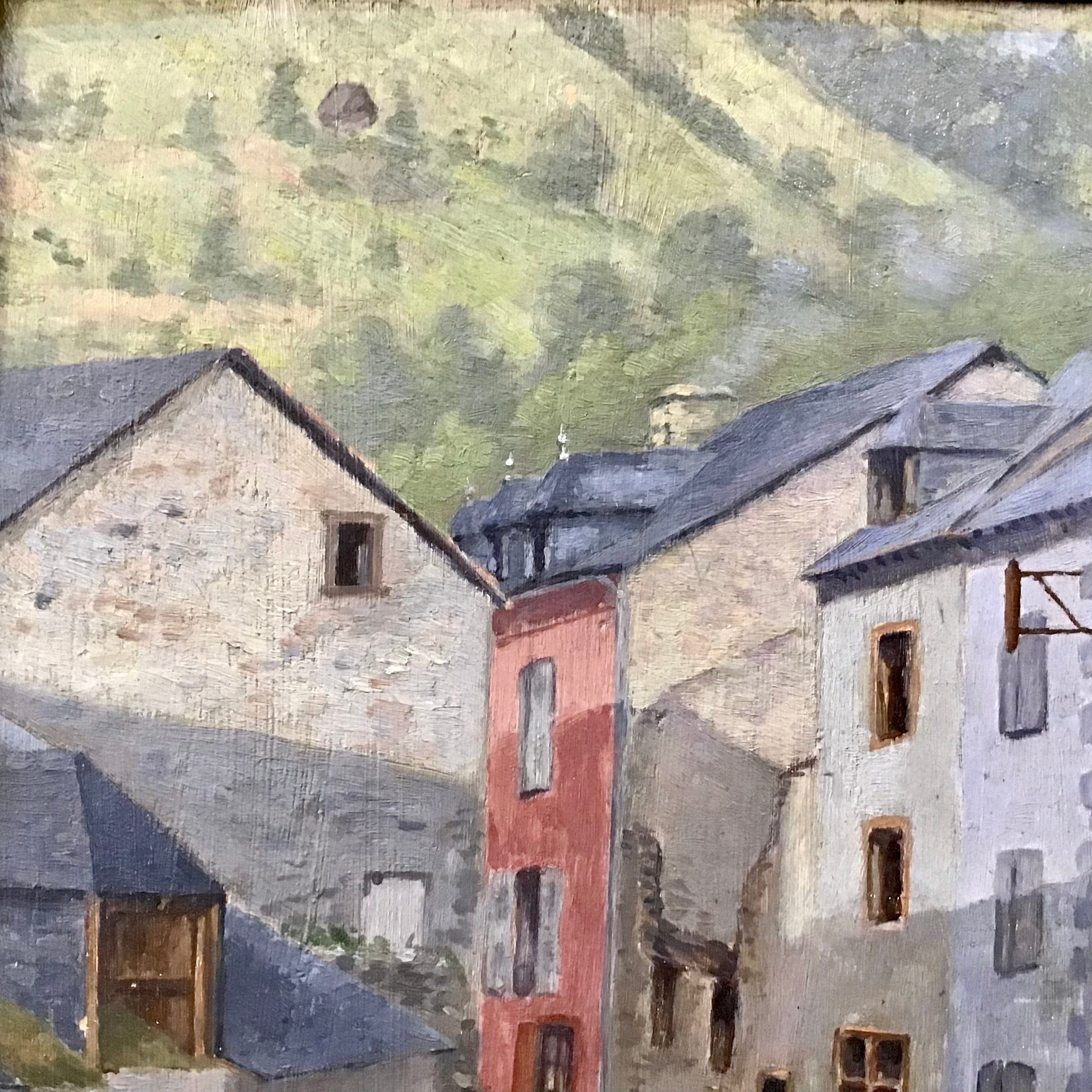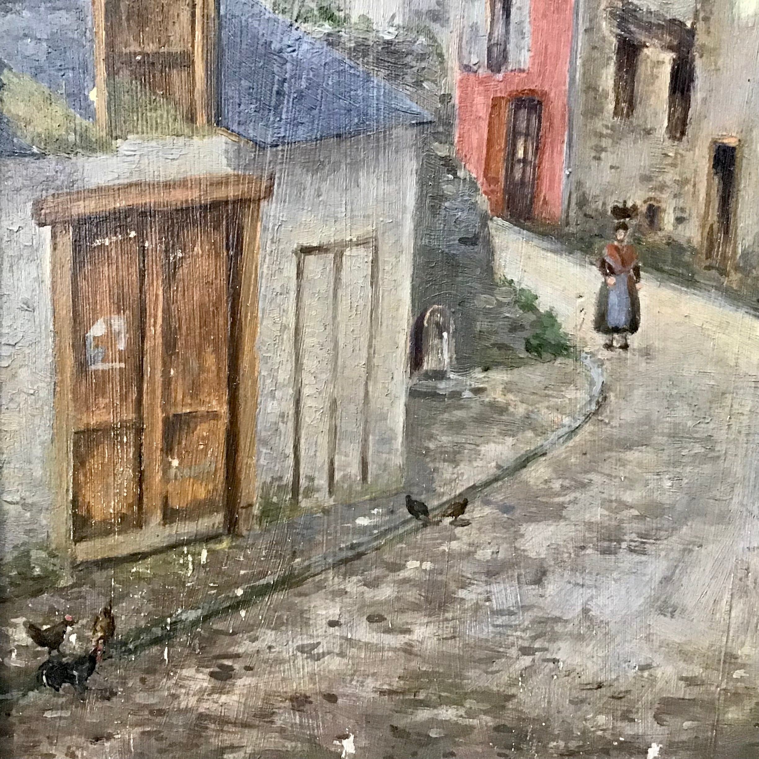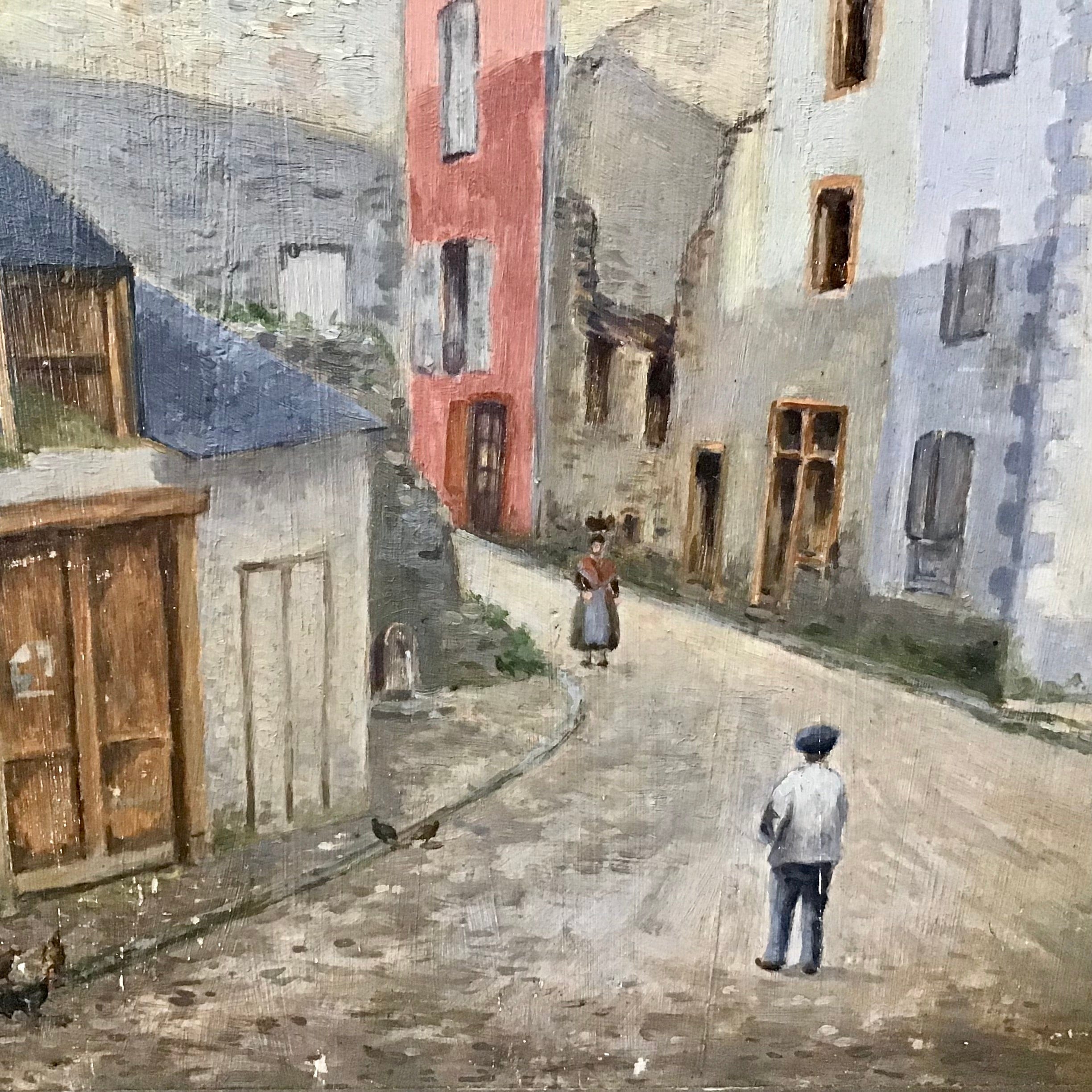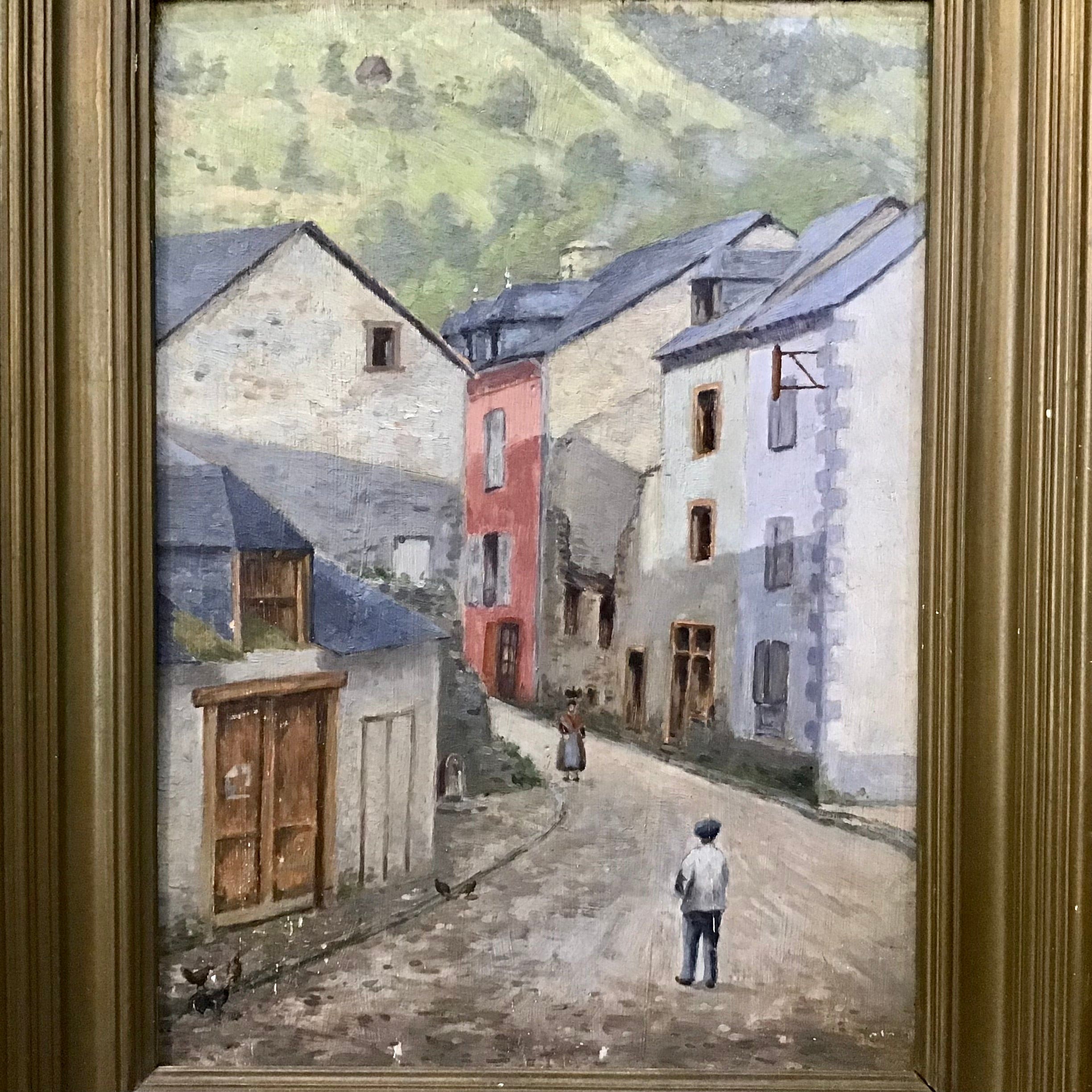 Óleo sobre tela en pequeño formato. En el cuadro se retrata un paisaje urbano en el que destaca la perspectiva entre los edificios y el encuentro de dos caminantes. Sin firma.