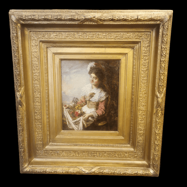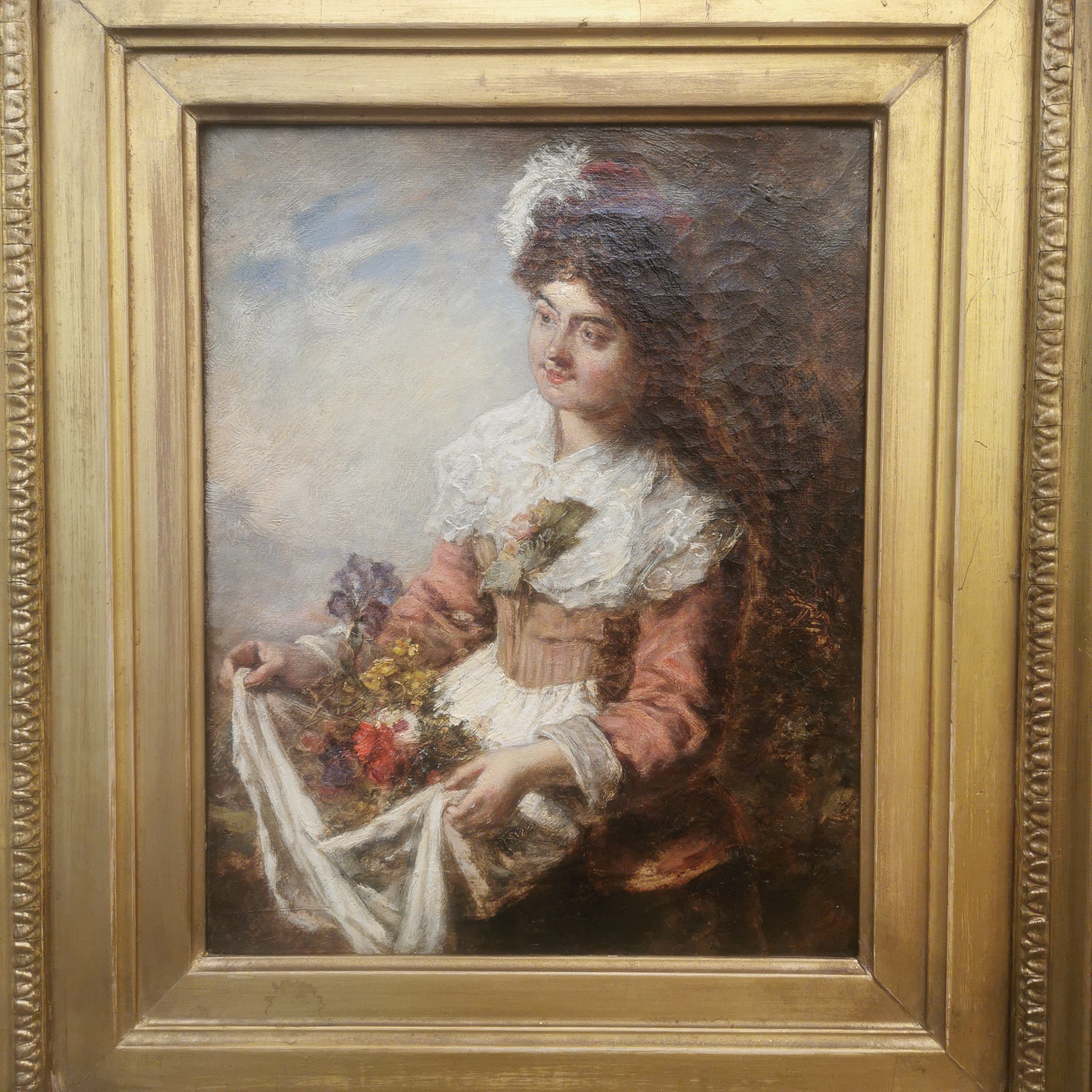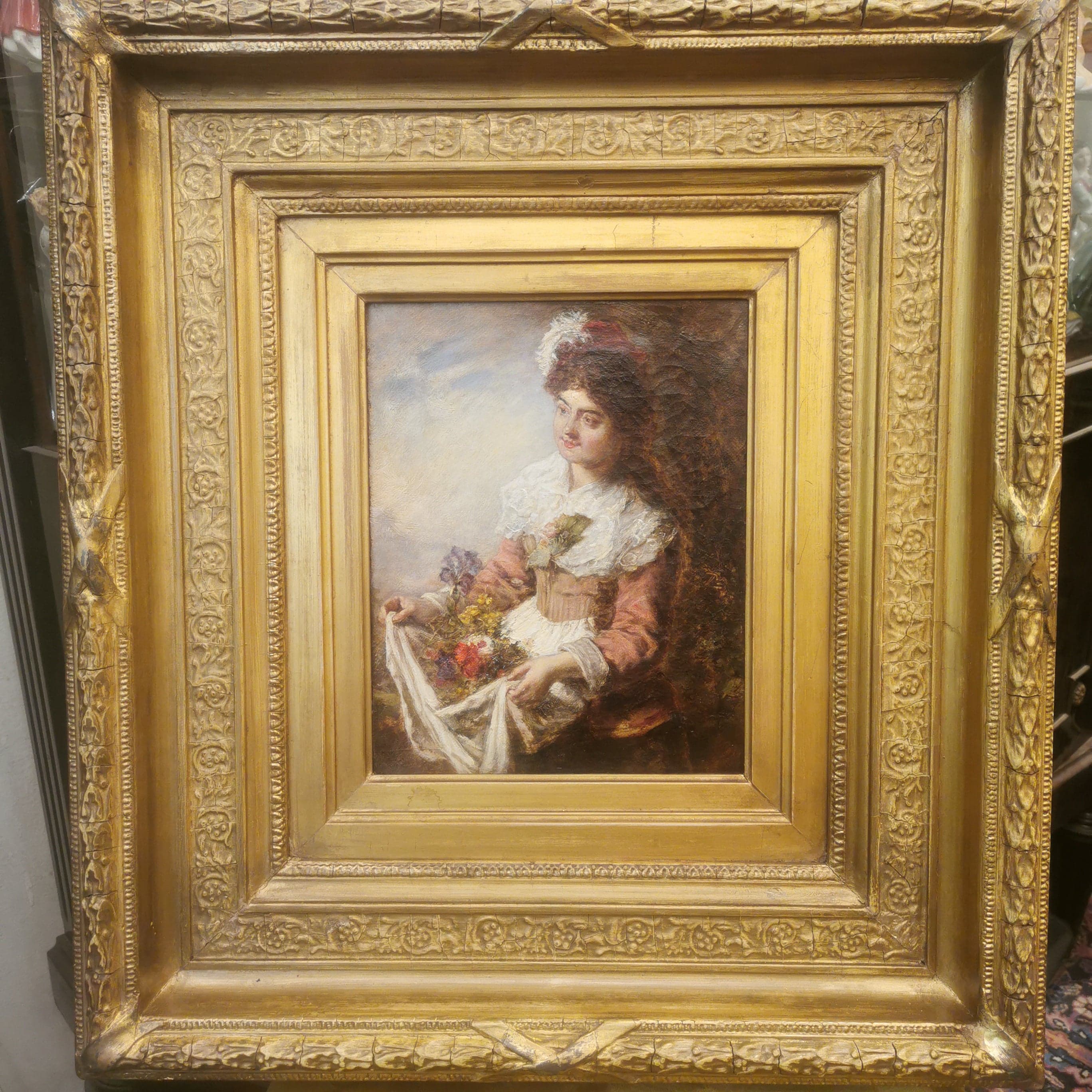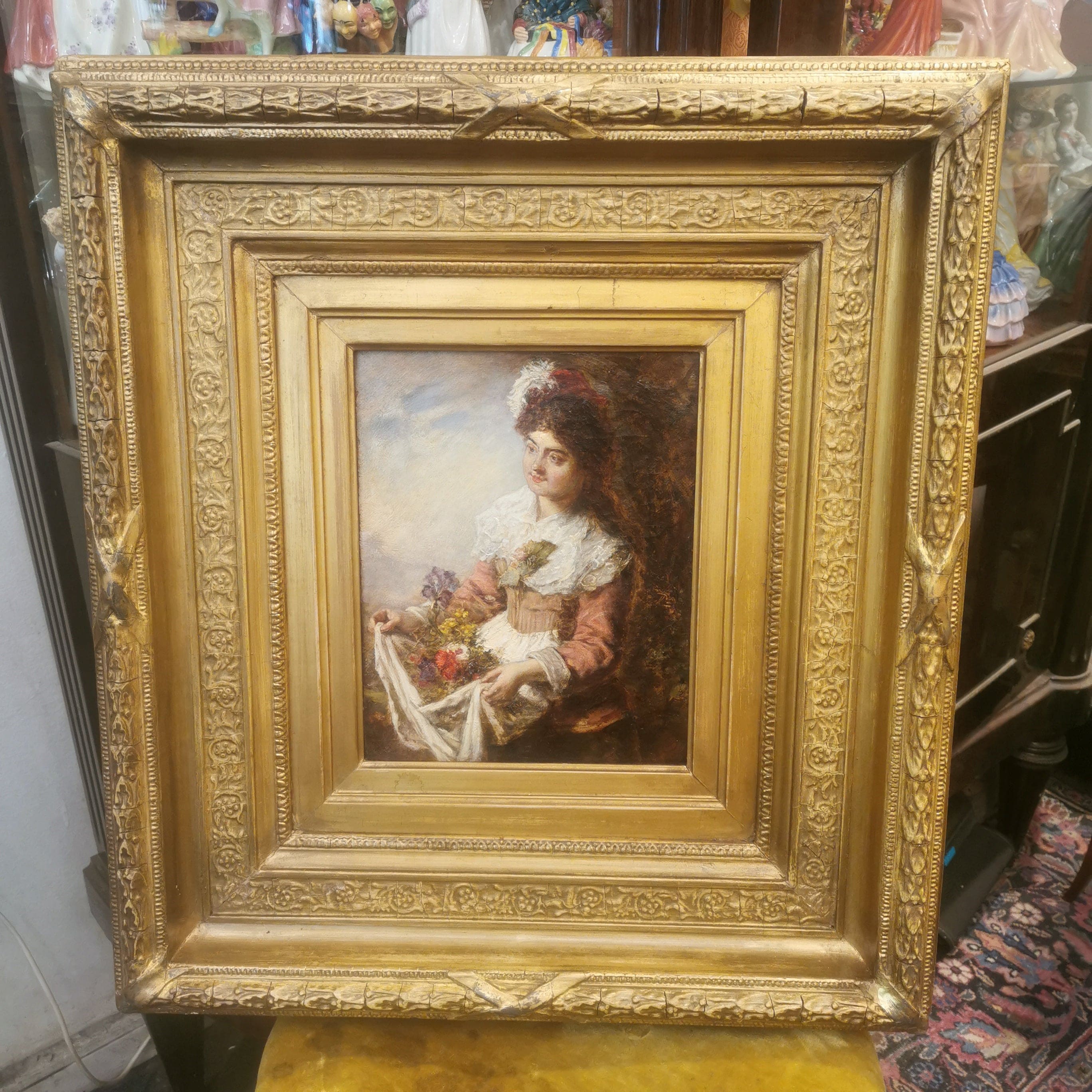Bellísima obra anónima pintada en óleo sobre tela. Una mujer recolectando flores. El cuadro posee un imponente marco dorado y tallado.