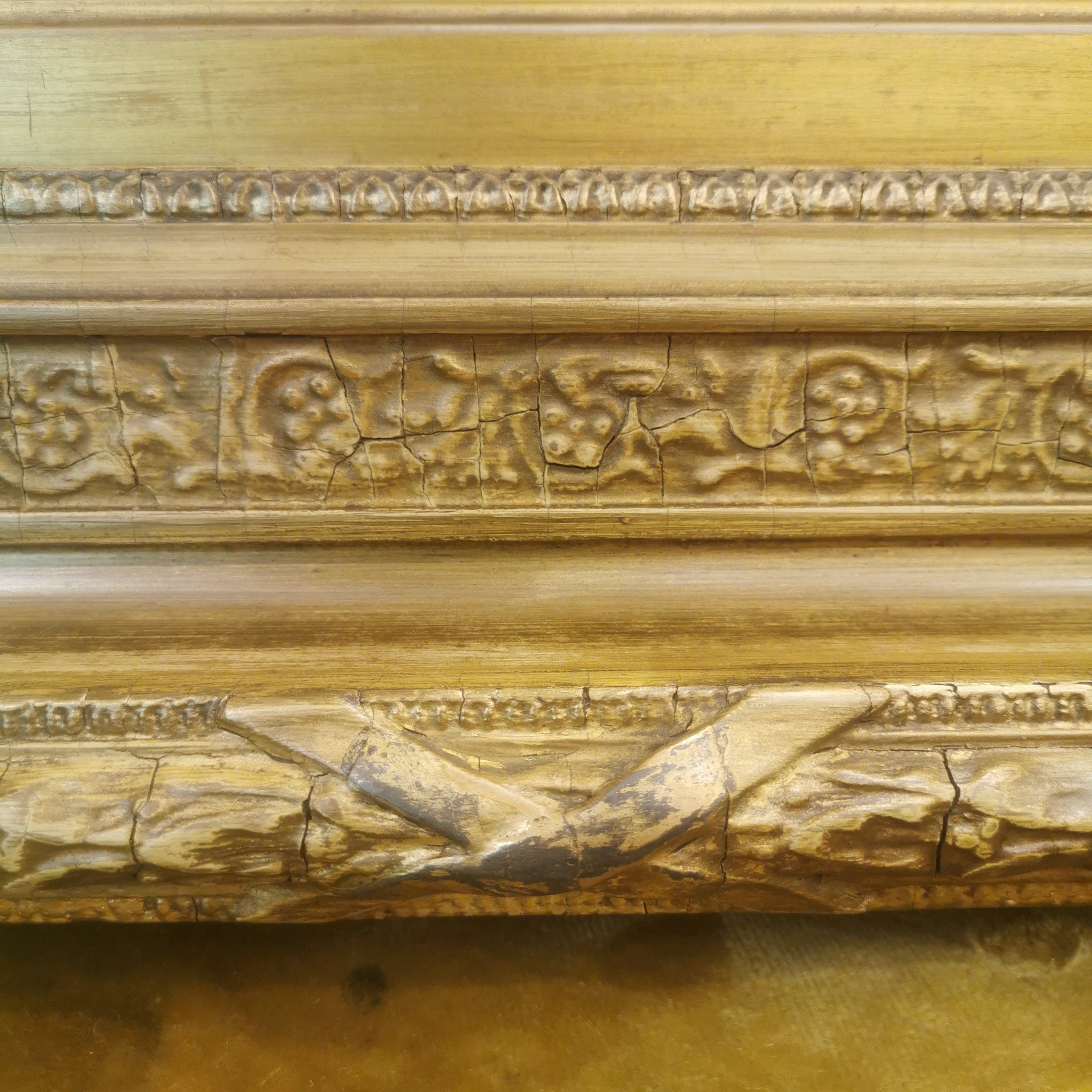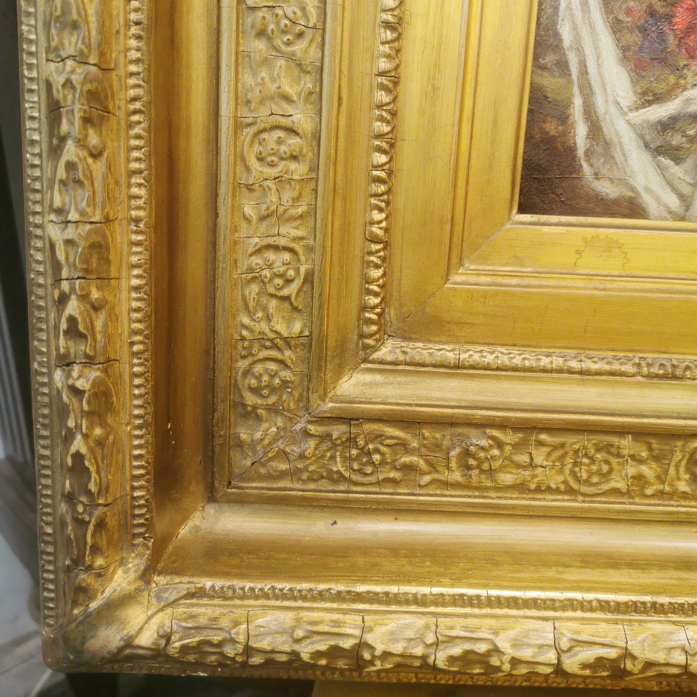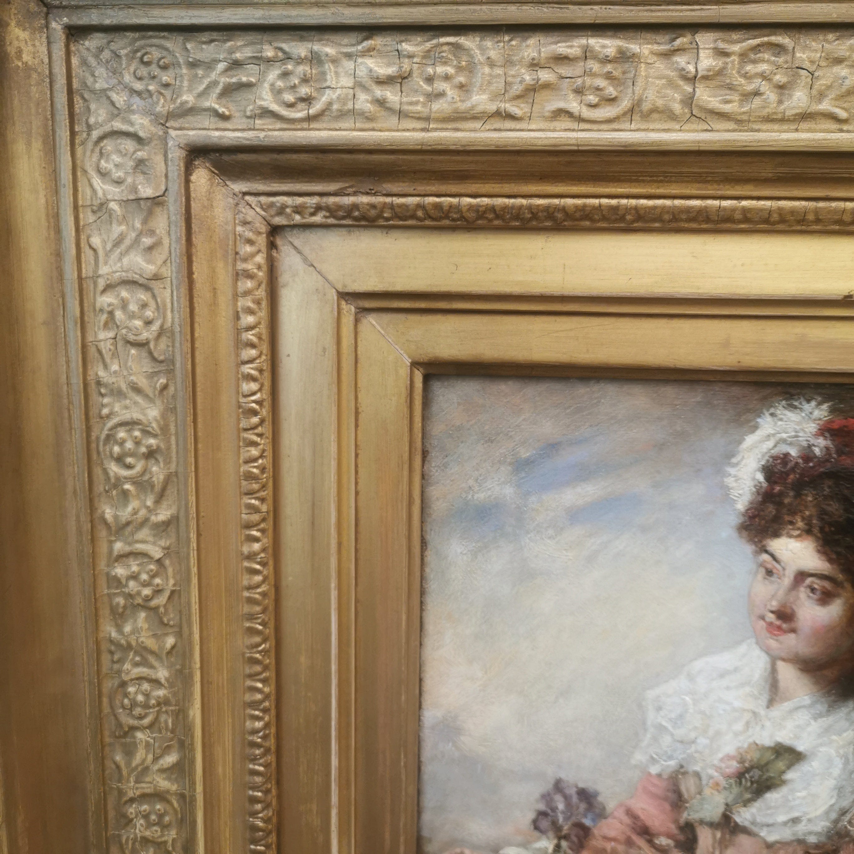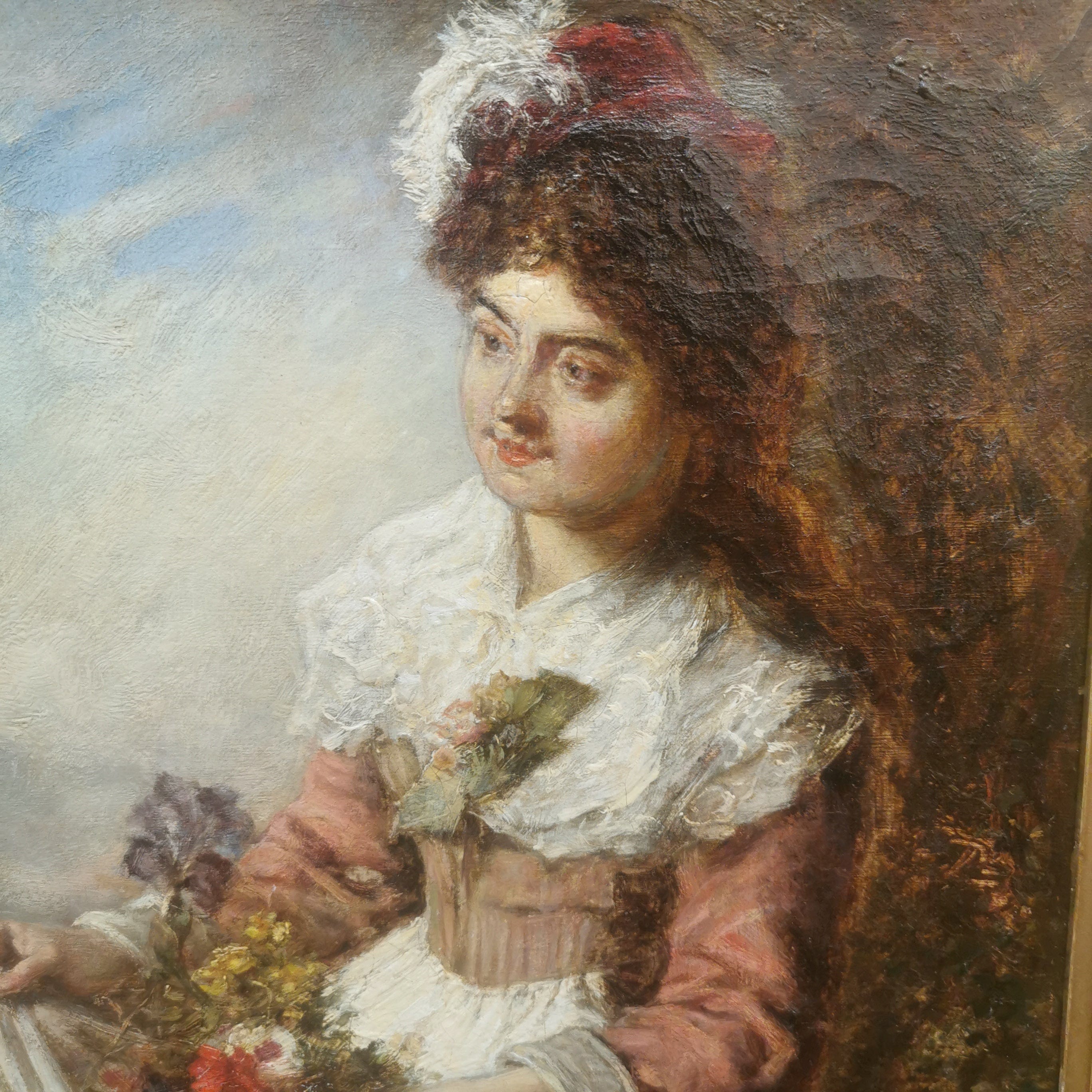 Bellísima obra anónima pintada en óleo sobre tela. Una mujer recolectando flores. El cuadro posee un imponente marco dorado y tallado.