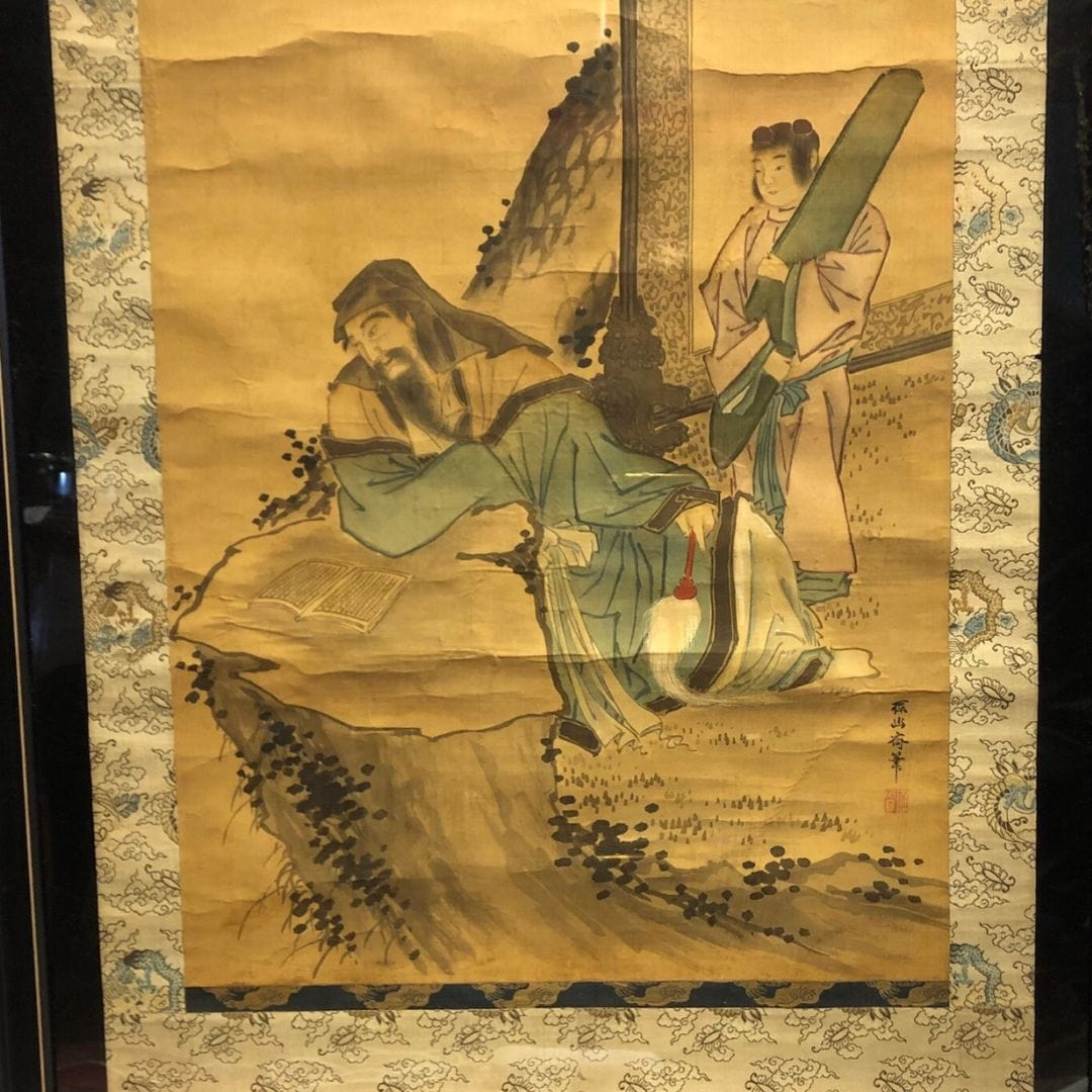 Pintura japonesa sobre papel de arroz. Paspartú de género de seda.