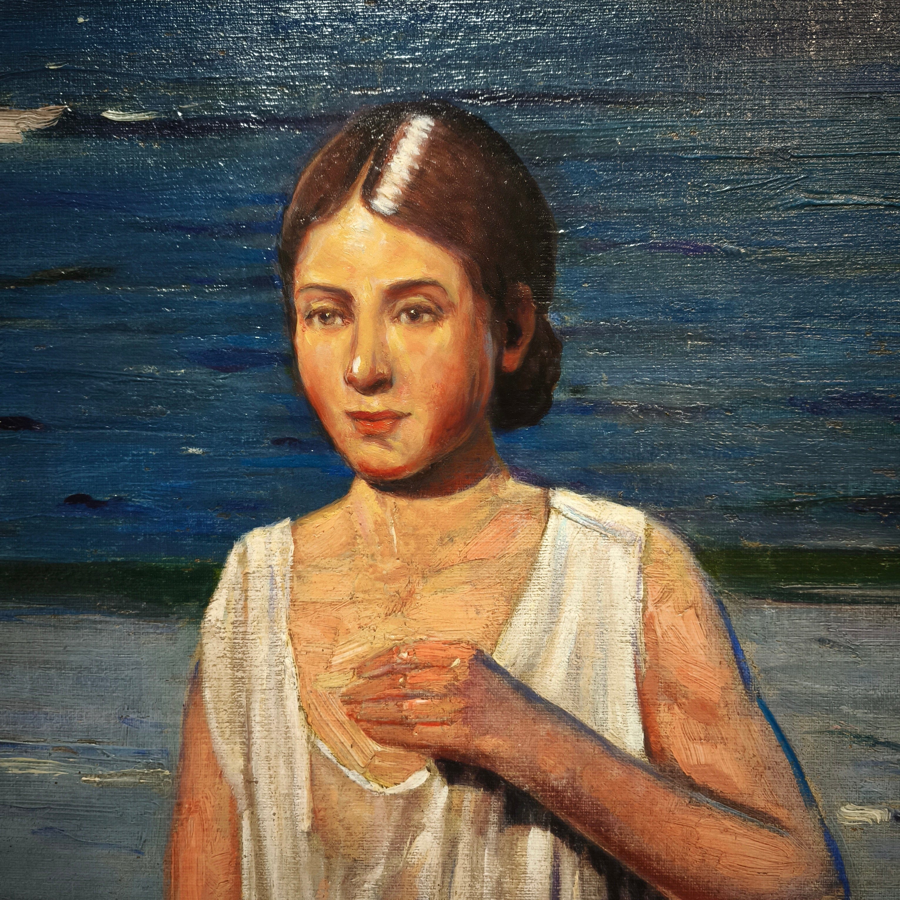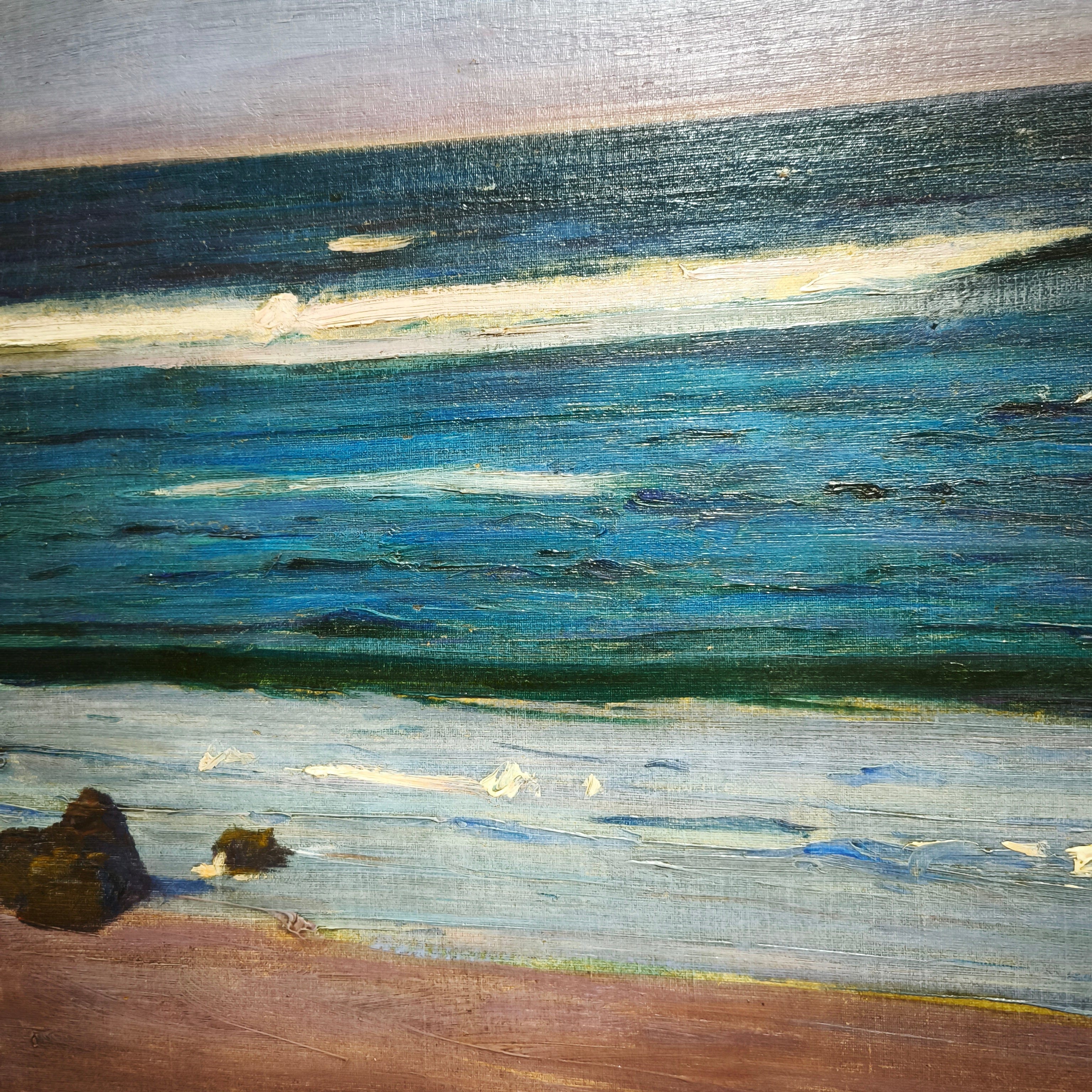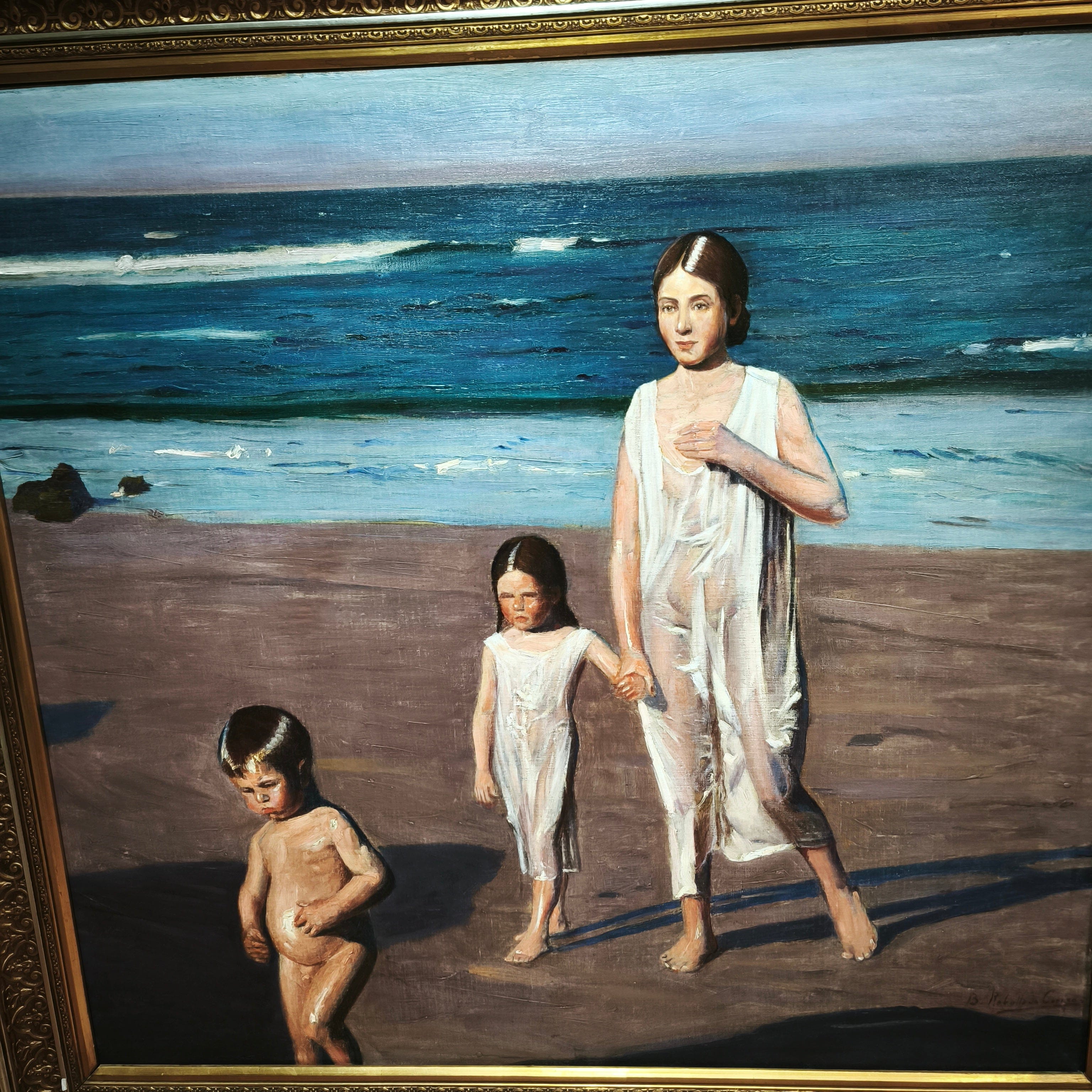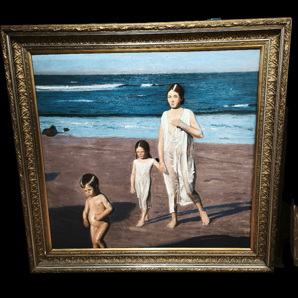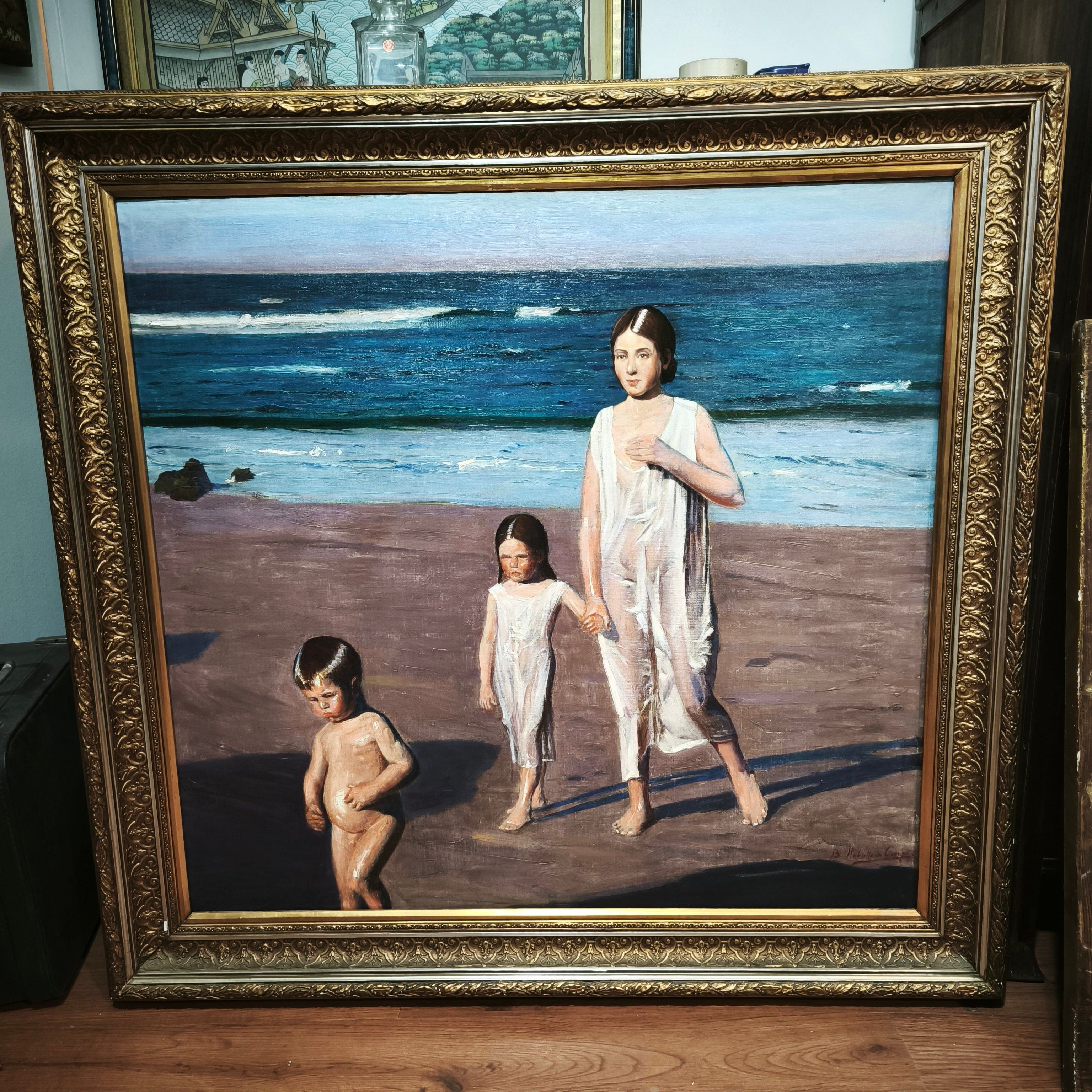 Óleo sobre tela del reconocido artista chileno Benito Rebolledo, representando a una mujer con sus dos hijos pequeños en una playa, saliendo del mar con su ropa interior mojada. La composición tiene algo muy interesante, ya que mezcla un paisaje naturalista con una representación de los sujetos con sus facciones difusas, especialmente los niños, casi distantes o como si estuvieran en movimiento. La pieza está enmarcada en madera tallada en molde y pintada de elegante dorado.
