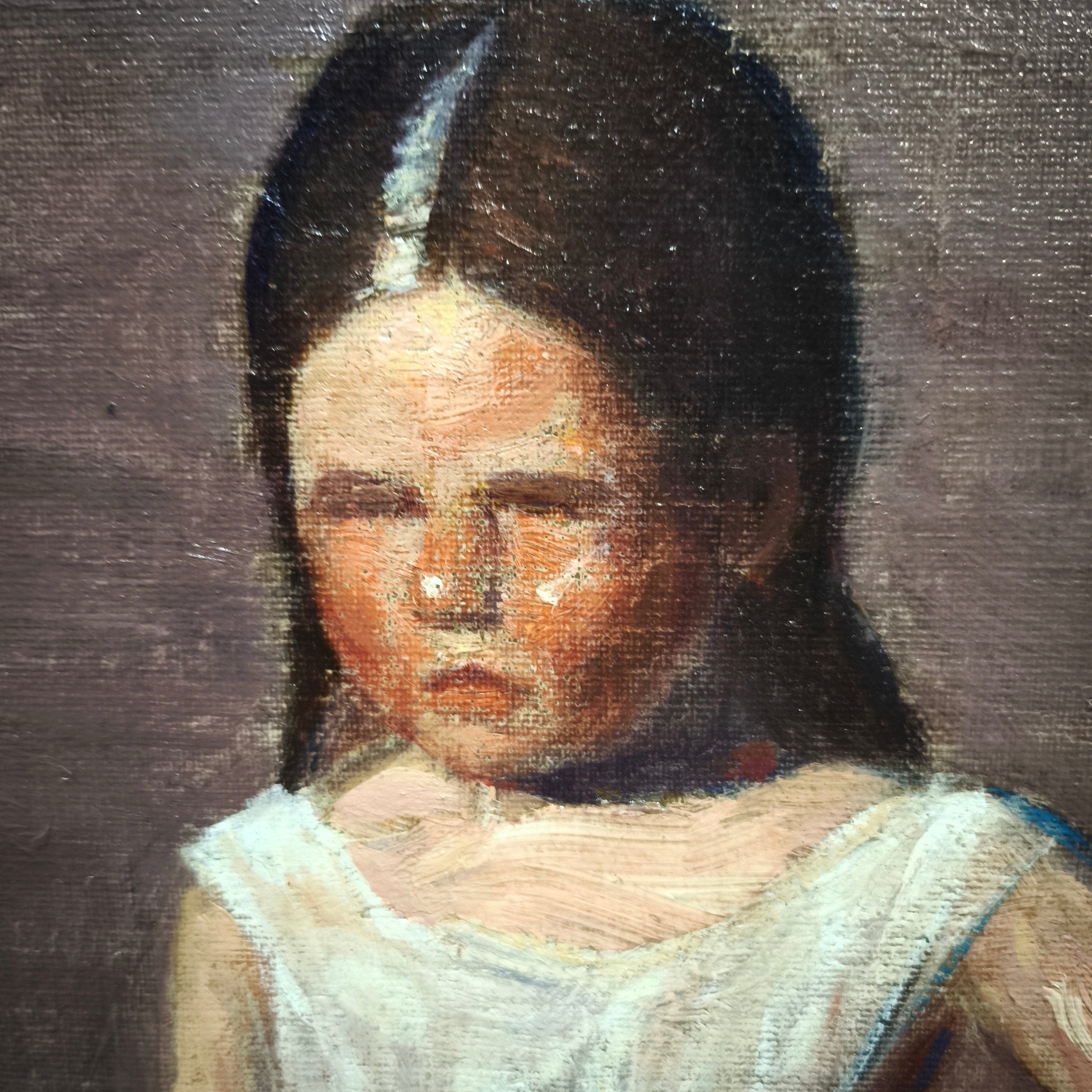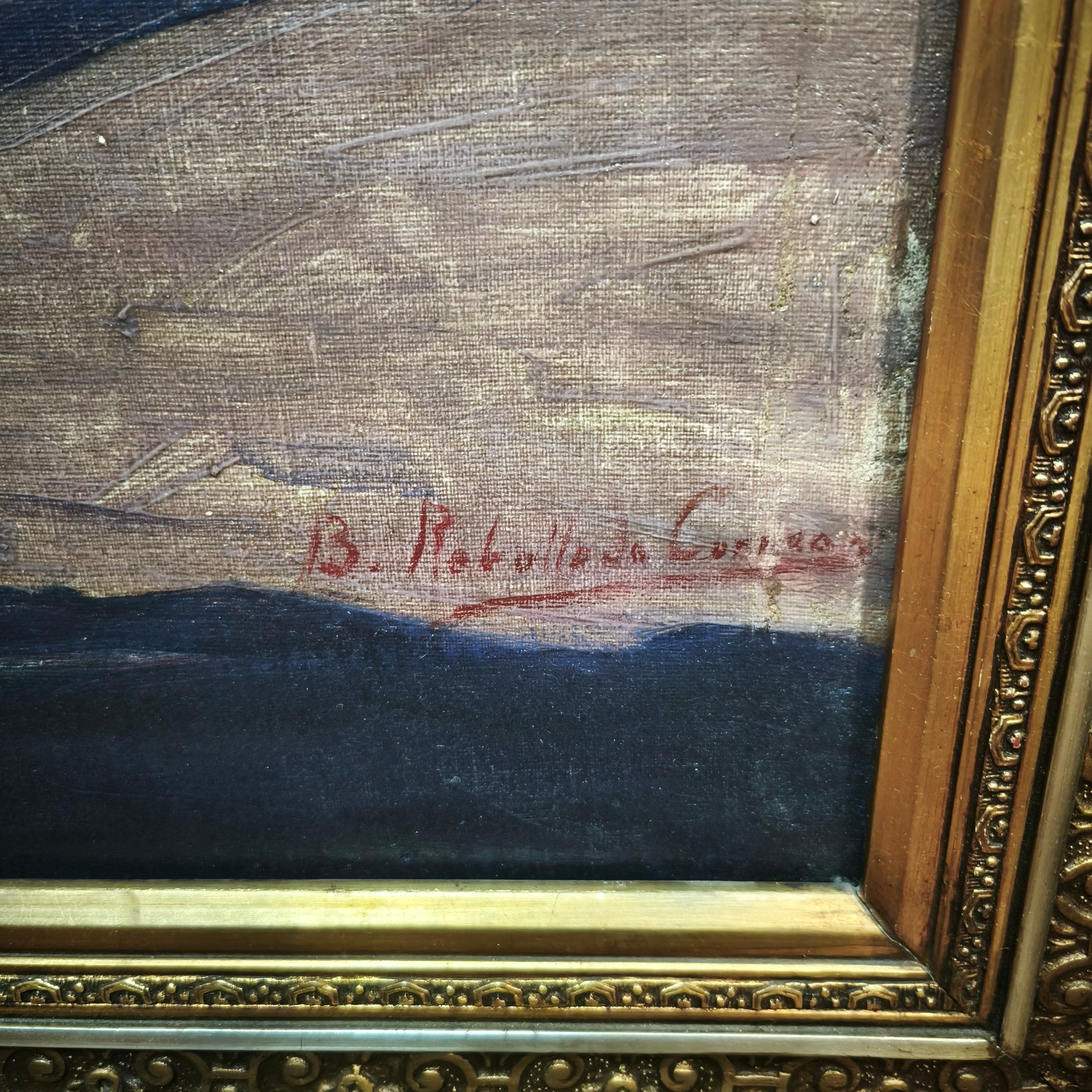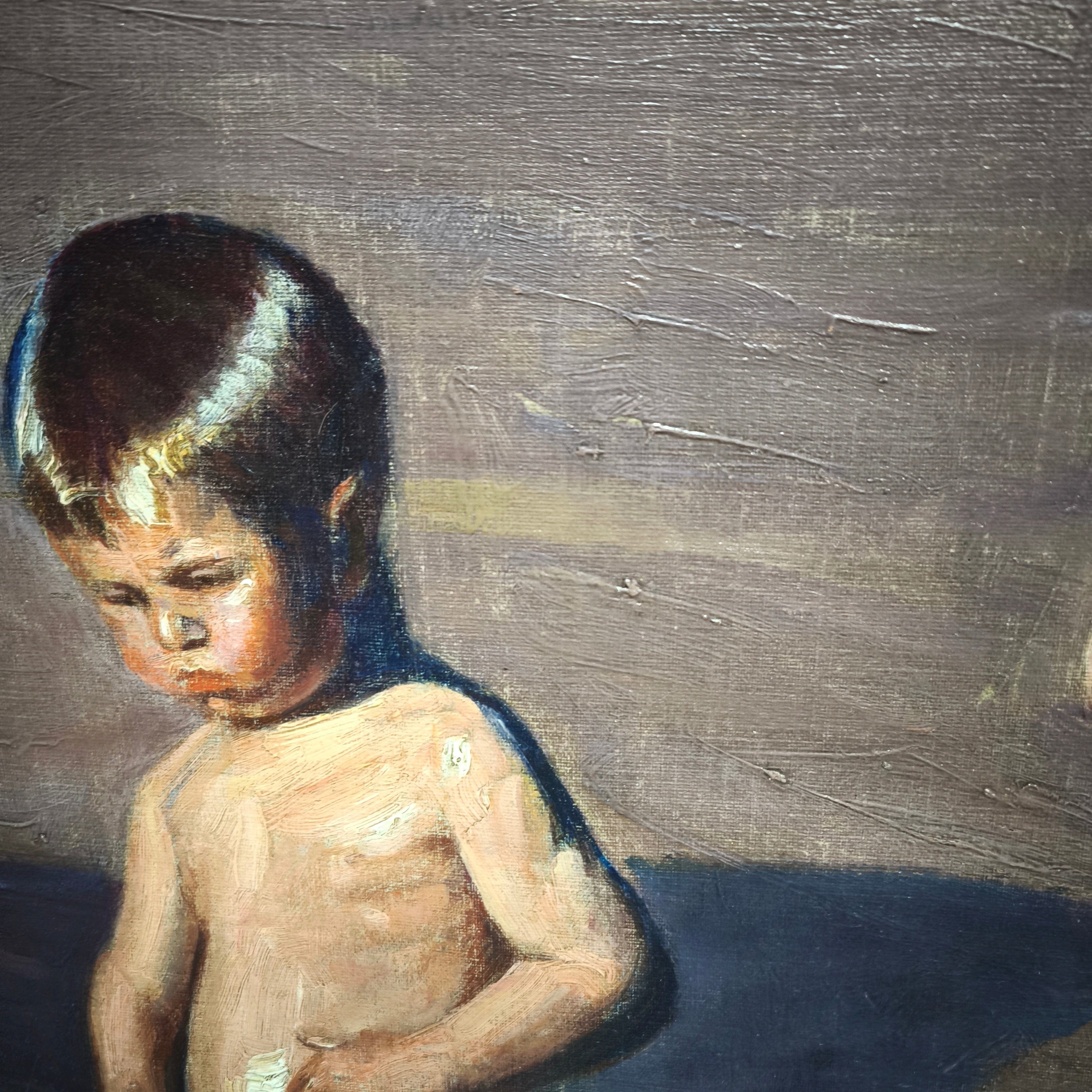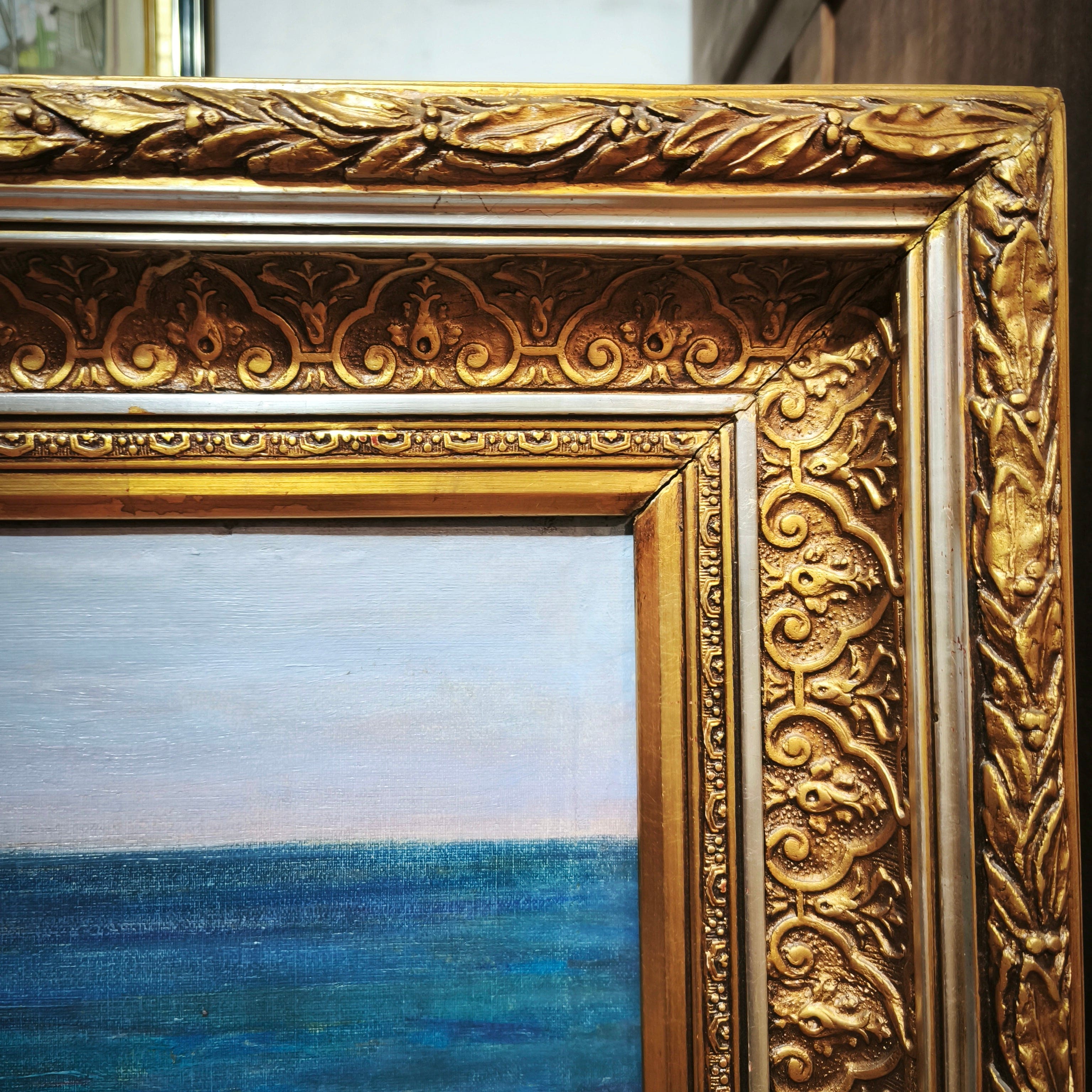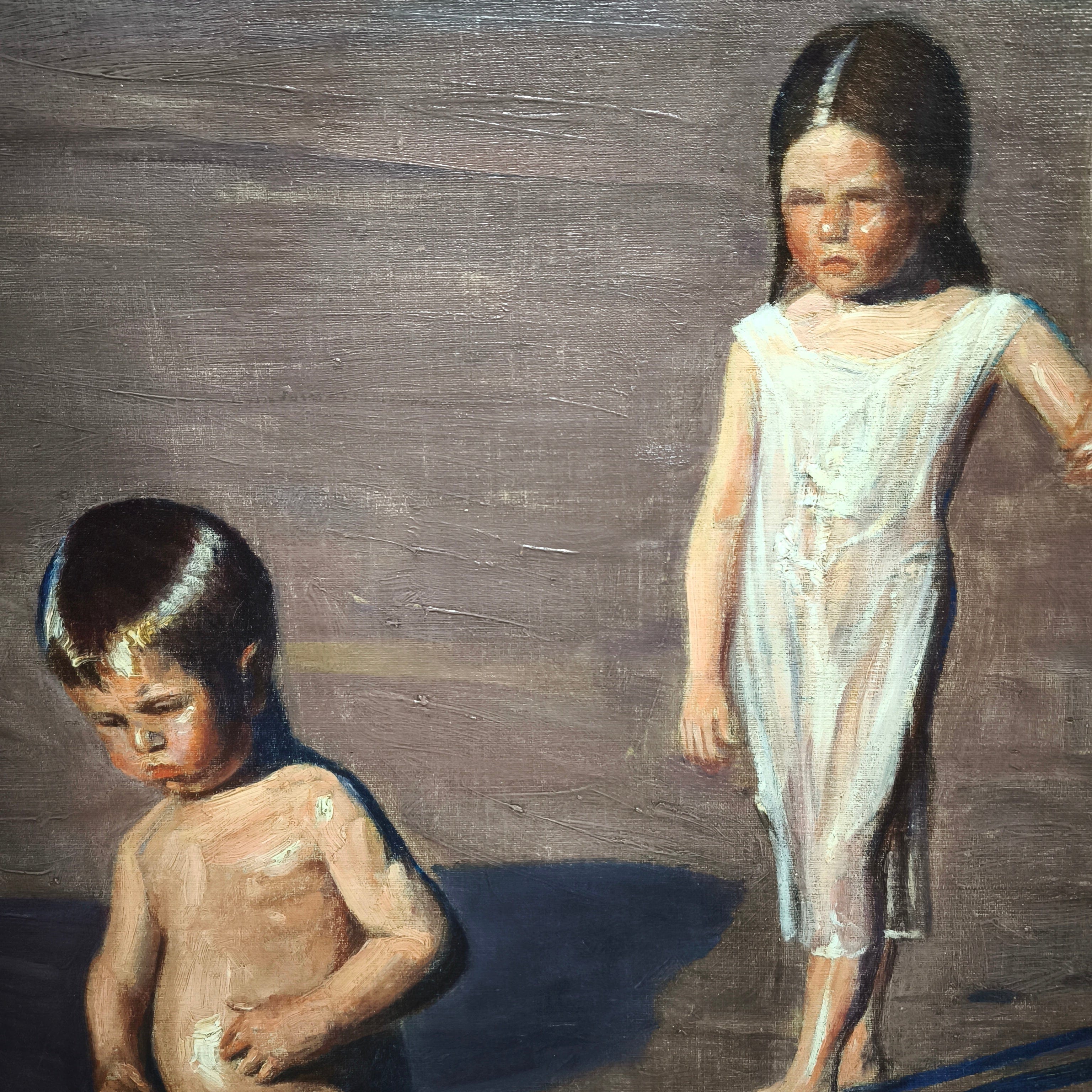 Óleo sobre tela del reconocido artista chileno Benito Rebolledo, representando a una mujer con sus dos hijos pequeños en una playa, saliendo del mar con su ropa interior mojada. La composición tiene algo muy interesante, ya que mezcla un paisaje naturalista con una representación de los sujetos con sus facciones difusas, especialmente los niños, casi distantes o como si estuvieran en movimiento. La pieza está enmarcada en madera tallada en molde y pintada de elegante dorado.