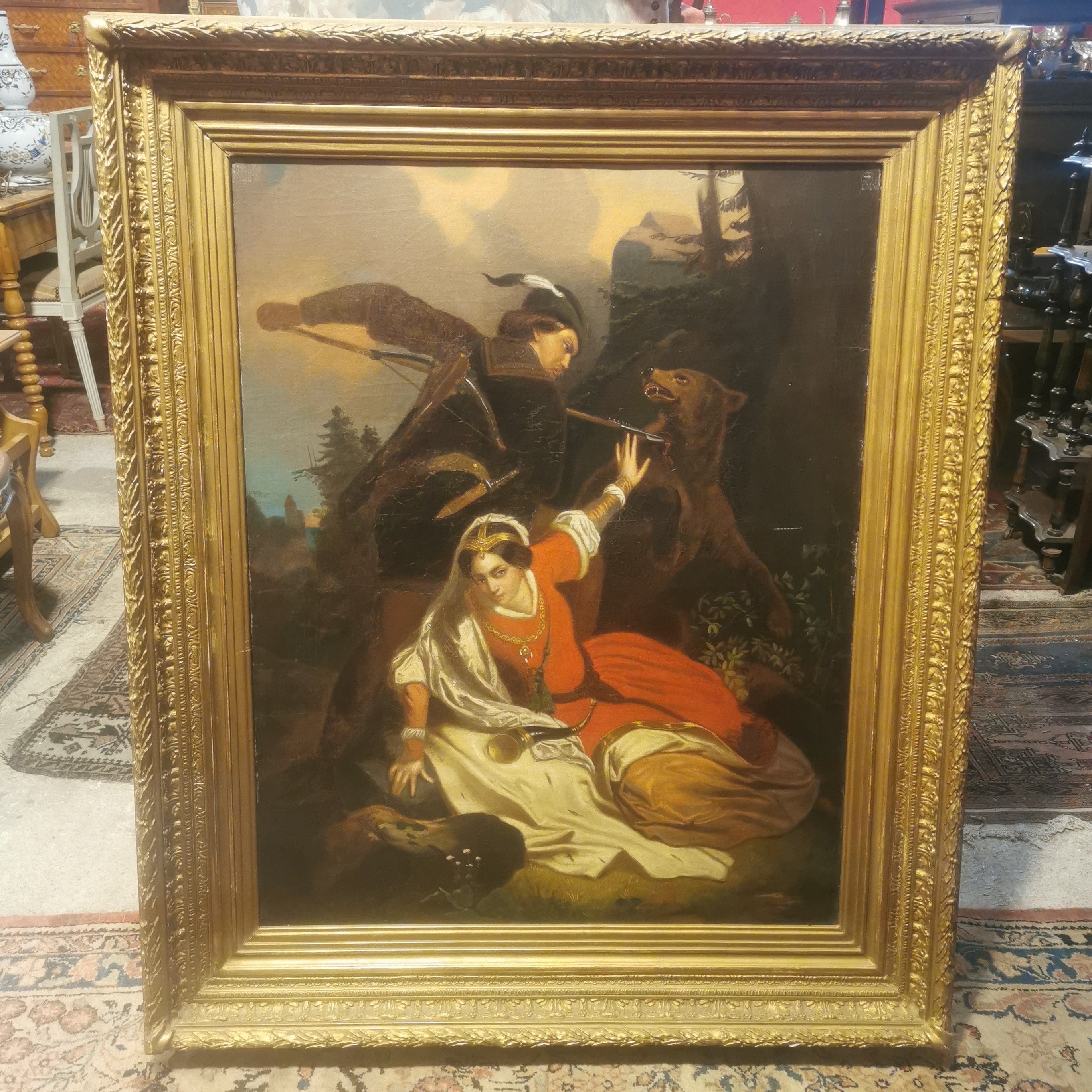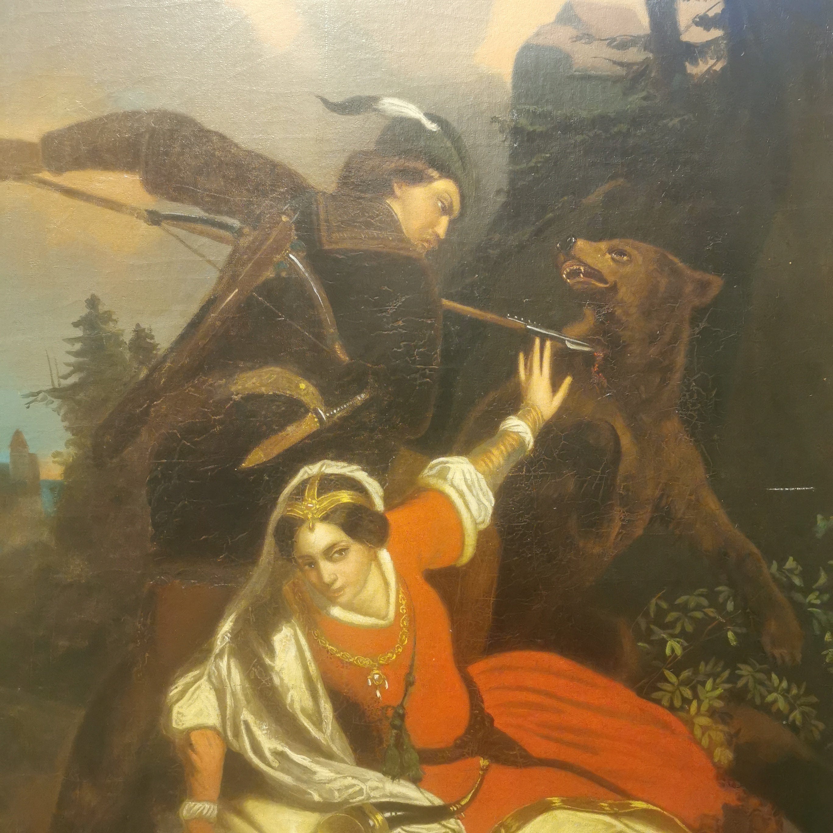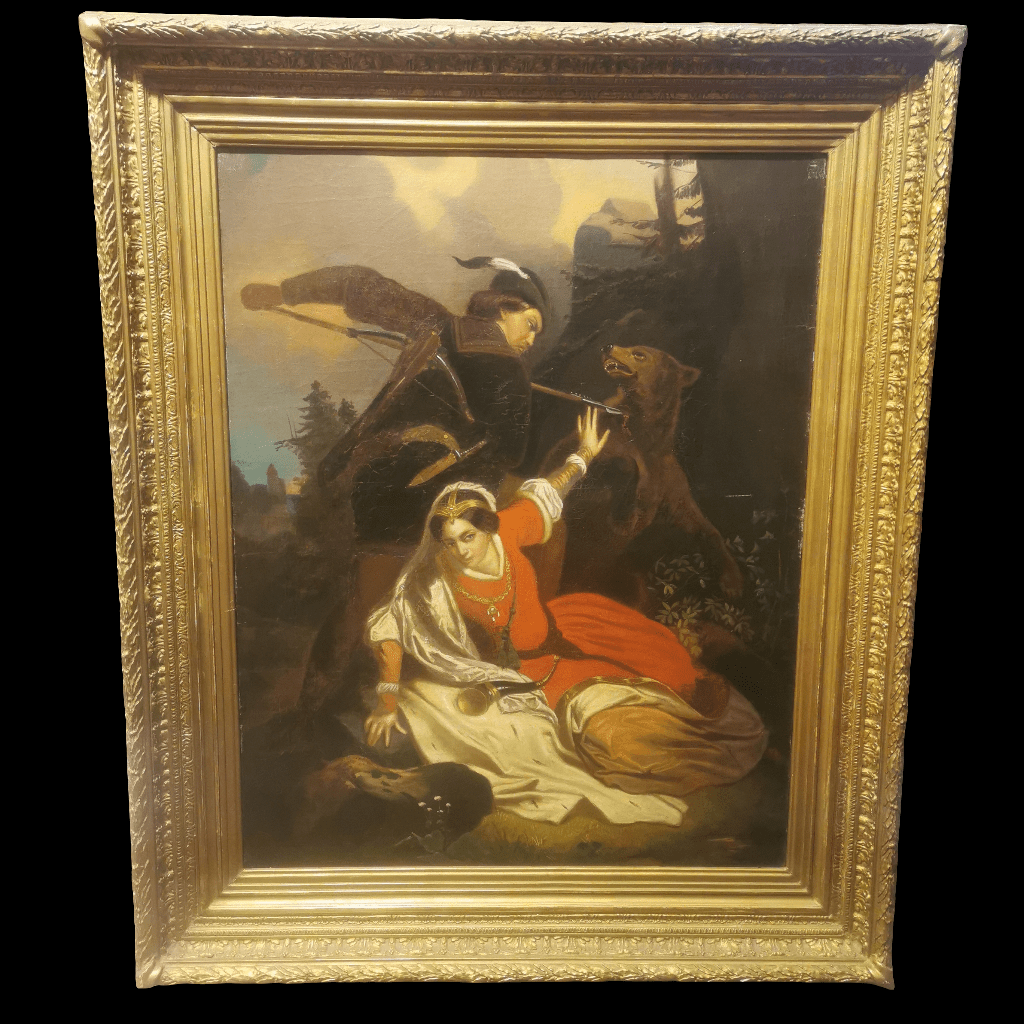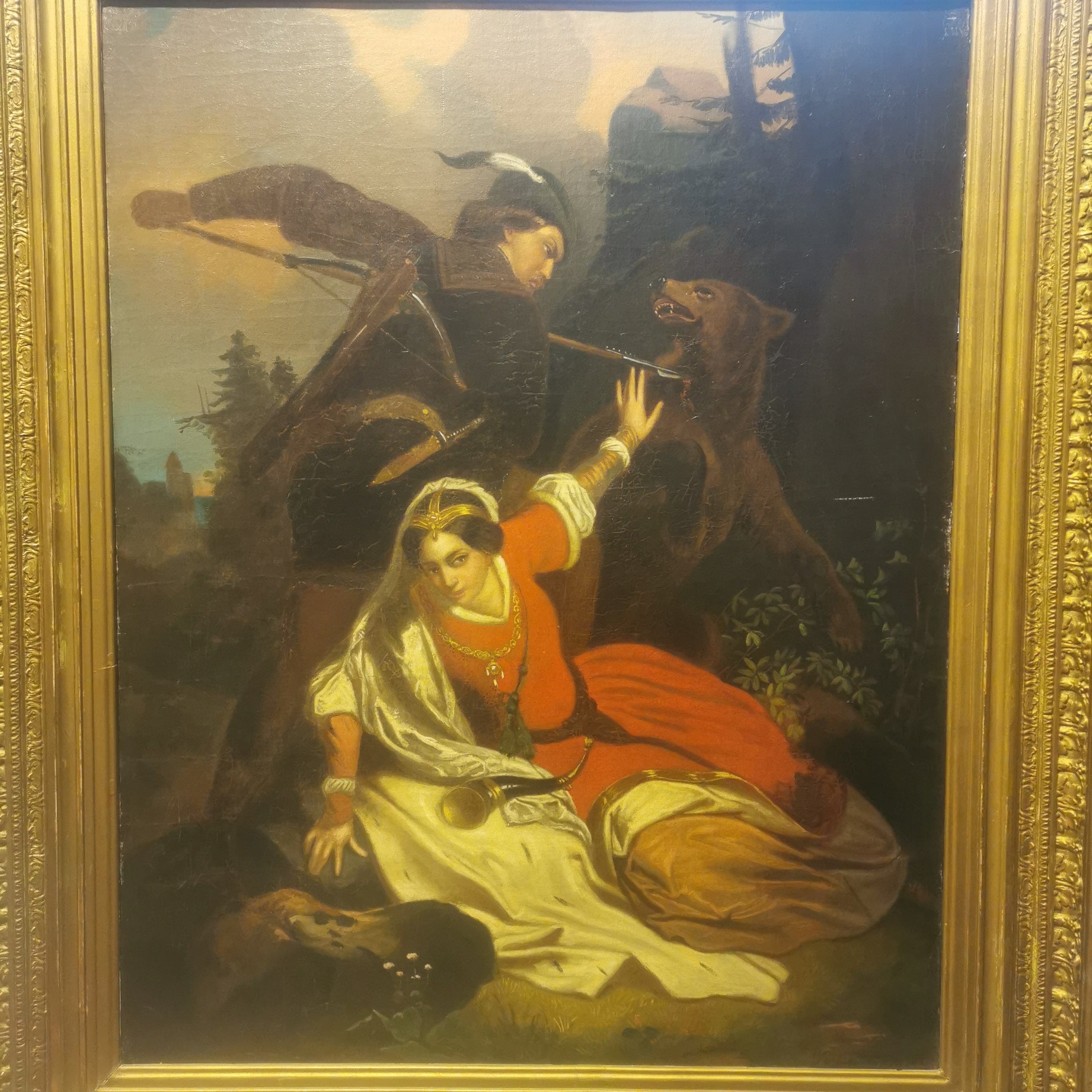Óleo sobre tela de la Escuela alemana, siglo XlX. En la obra se puede apreciar un paisaje dramático en las montañas rocosas, un cazador intentando matar un oso con su lanza y en primer plano, una mujer cayendo.