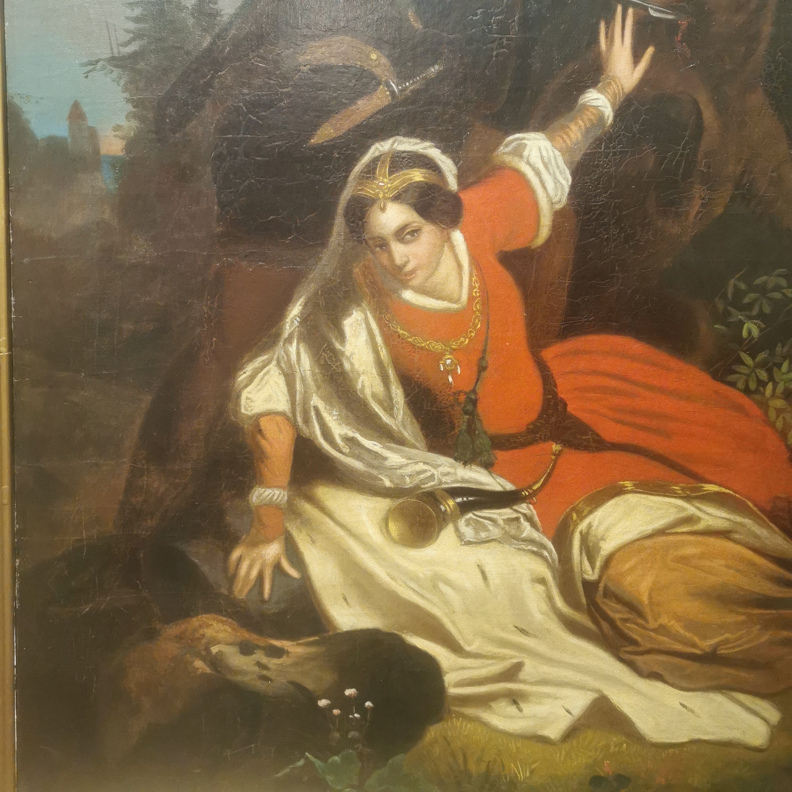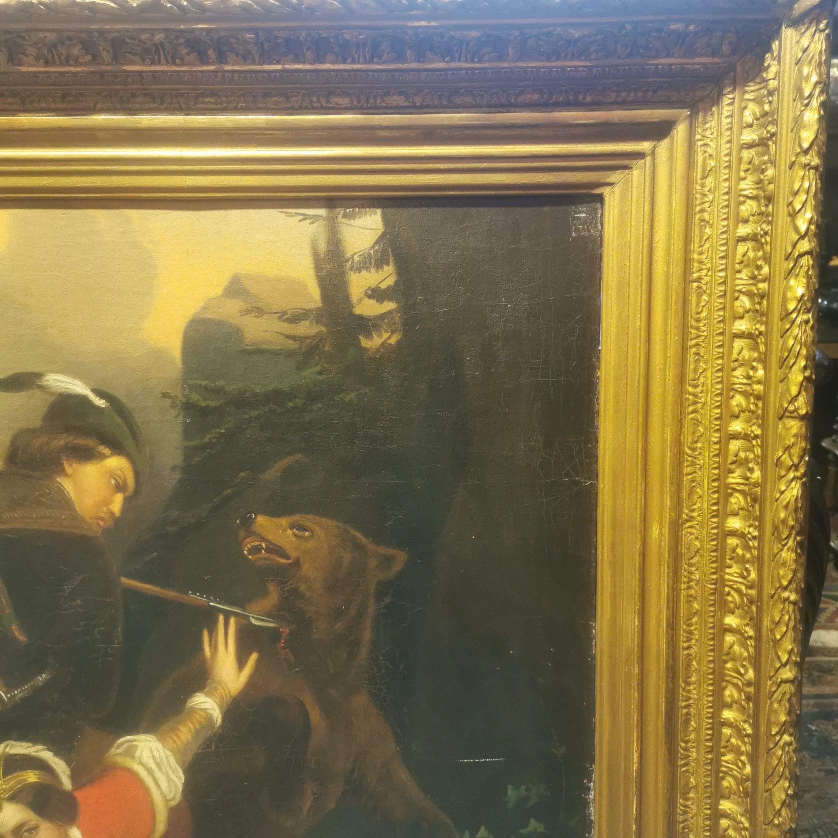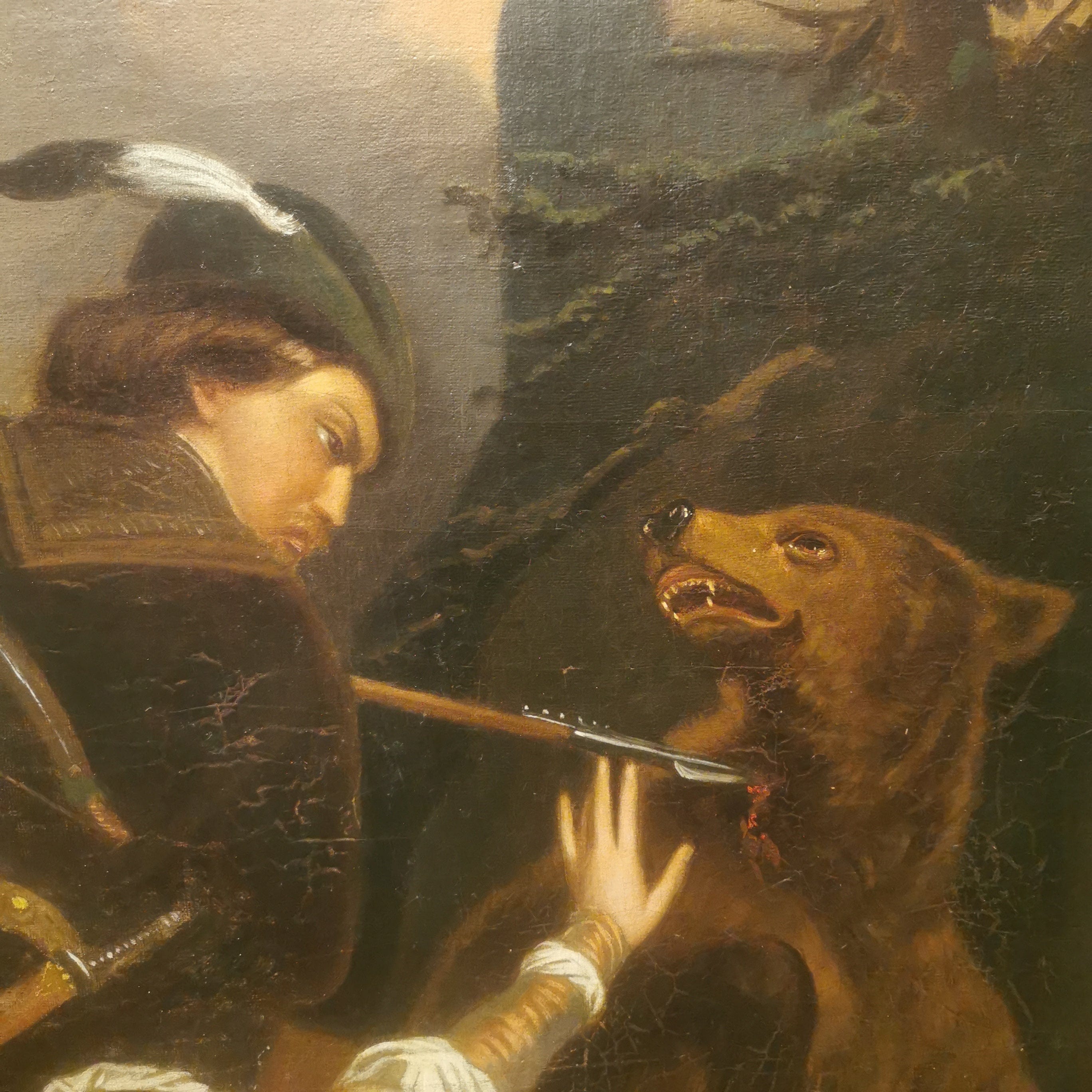 Óleo sobre tela de la Escuela alemana, siglo XlX. En la obra se puede apreciar un paisaje dramático en las montañas rocosas, un cazador intentando matar un oso con su lanza y en primer plano, una mujer cayendo.