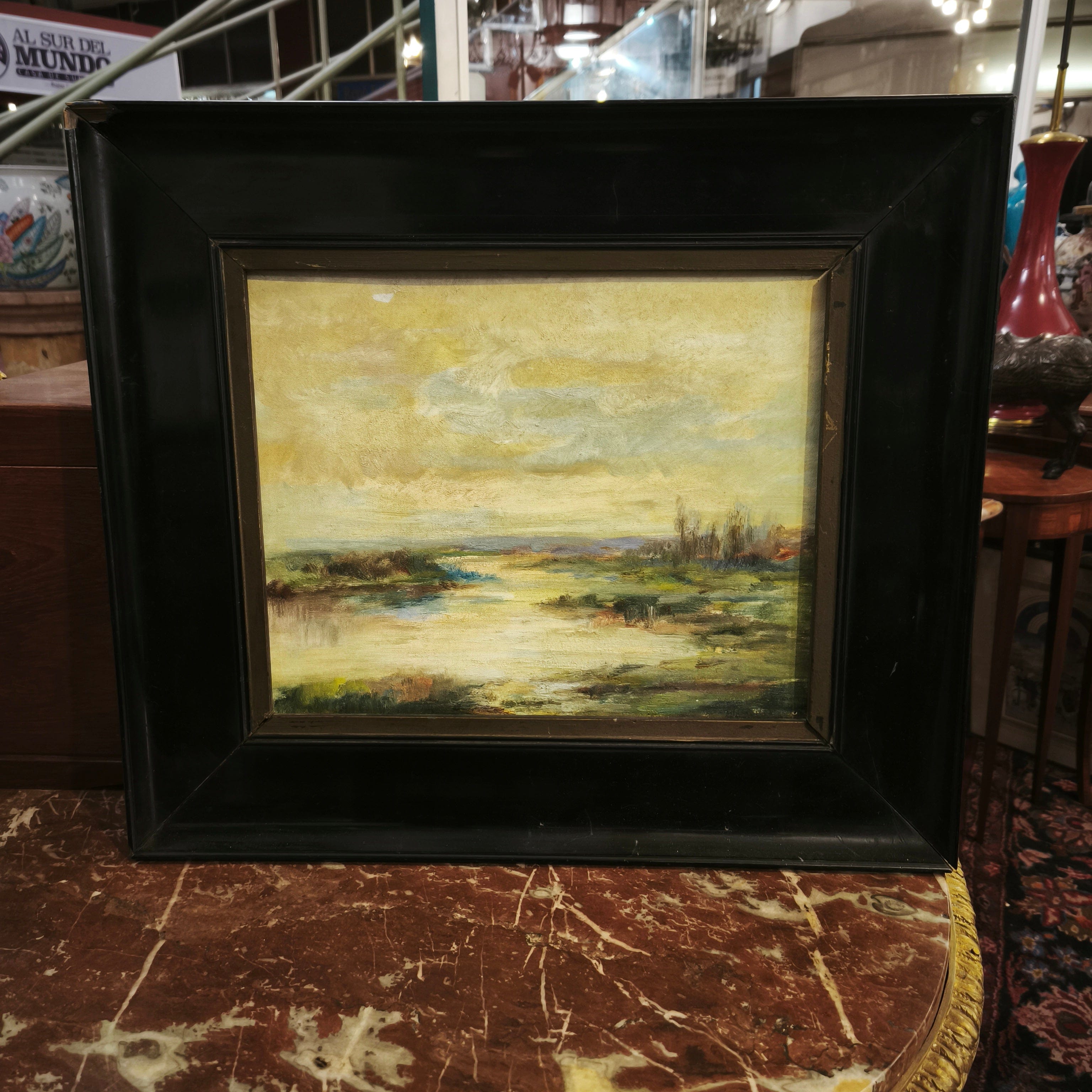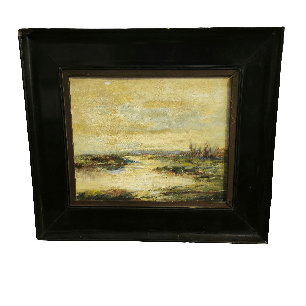Óleo sobre madera entelada, de origen chileno,representando un paisaje de humedal, con un bello y sutil trabajo de luz y texturas, tanto en el cielo como en la vegetación del paisaje. El óleo está enmarcada en madera pintada de negro, haciedo resaltar la obra.