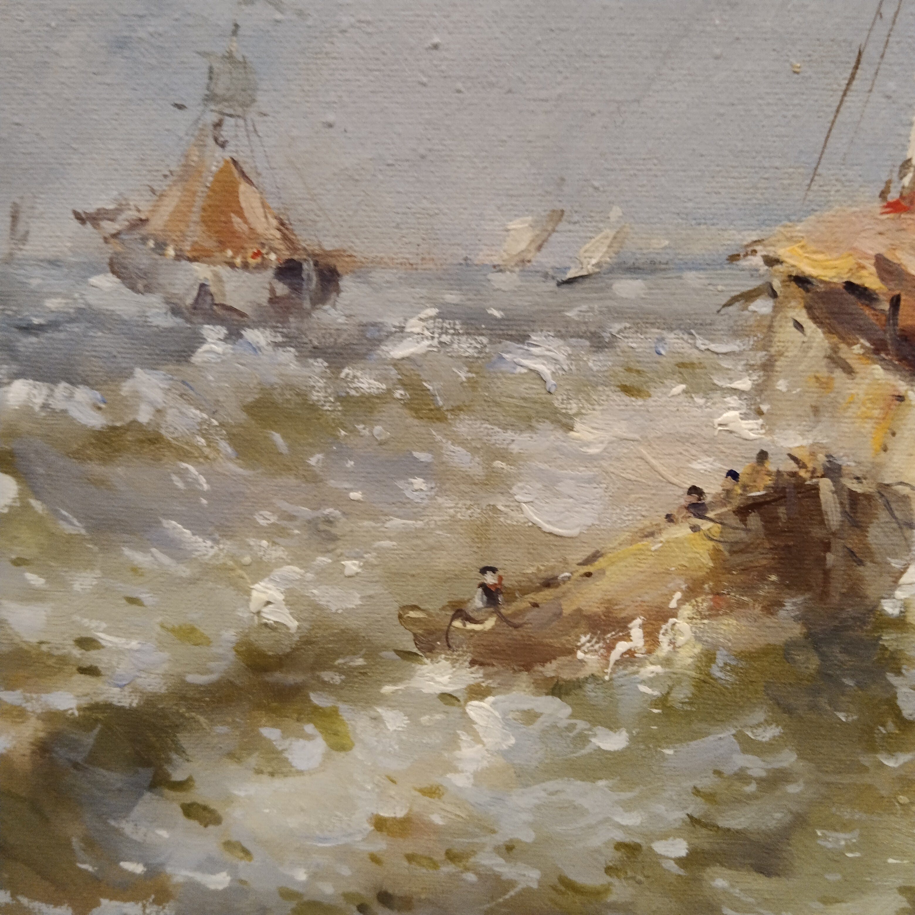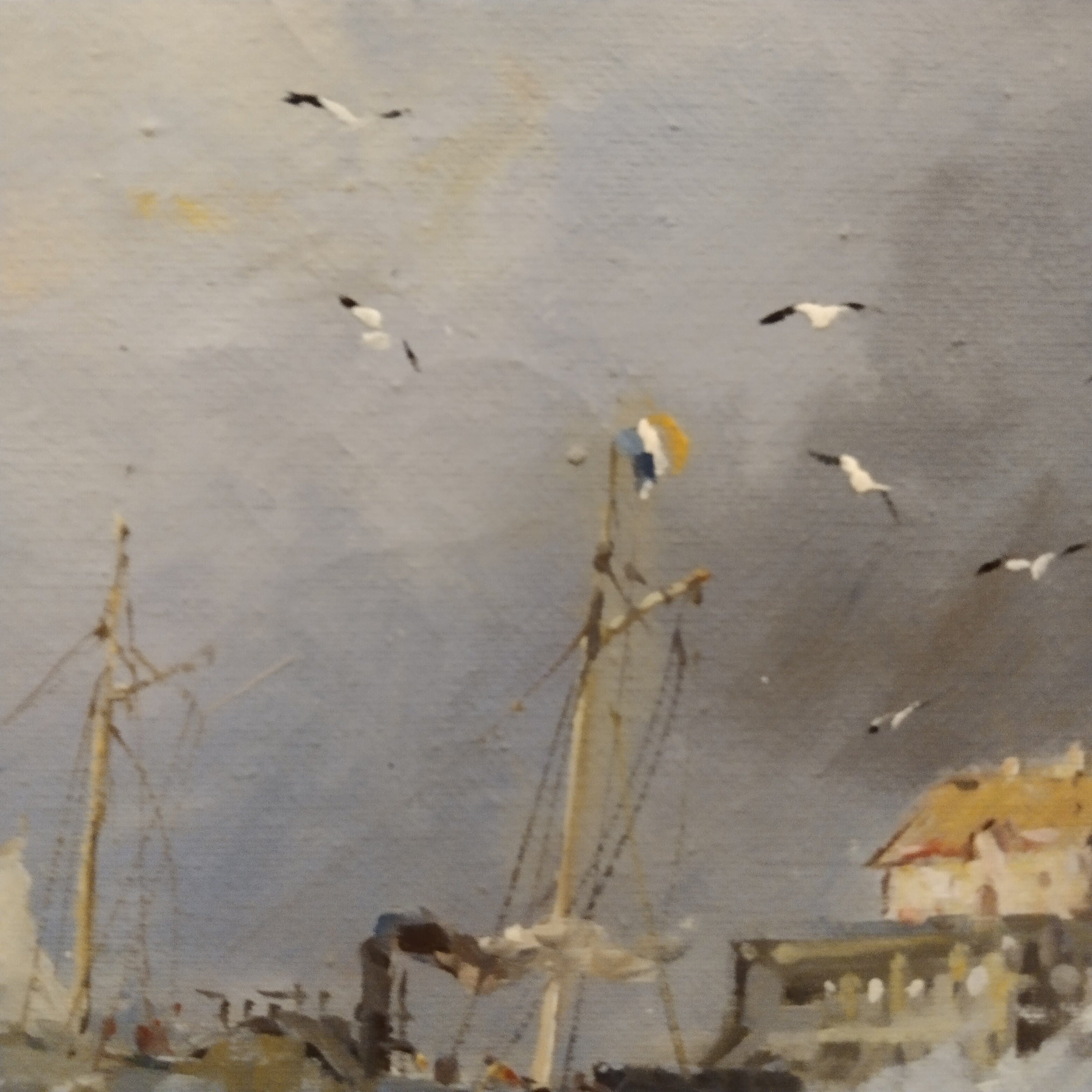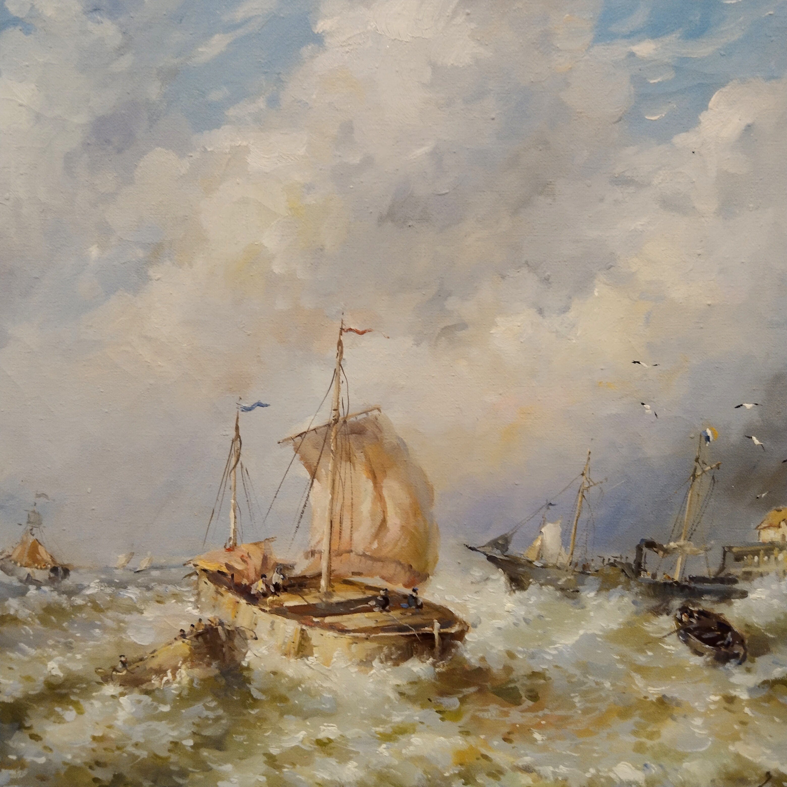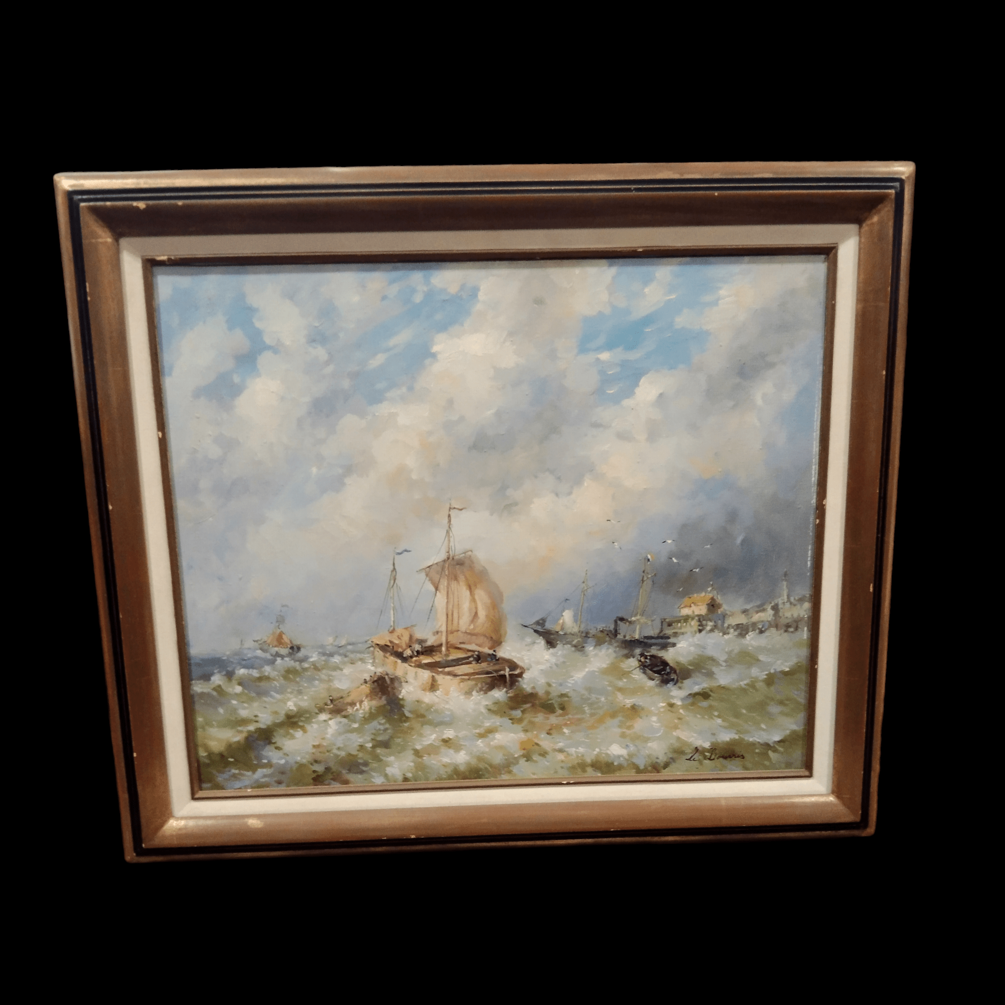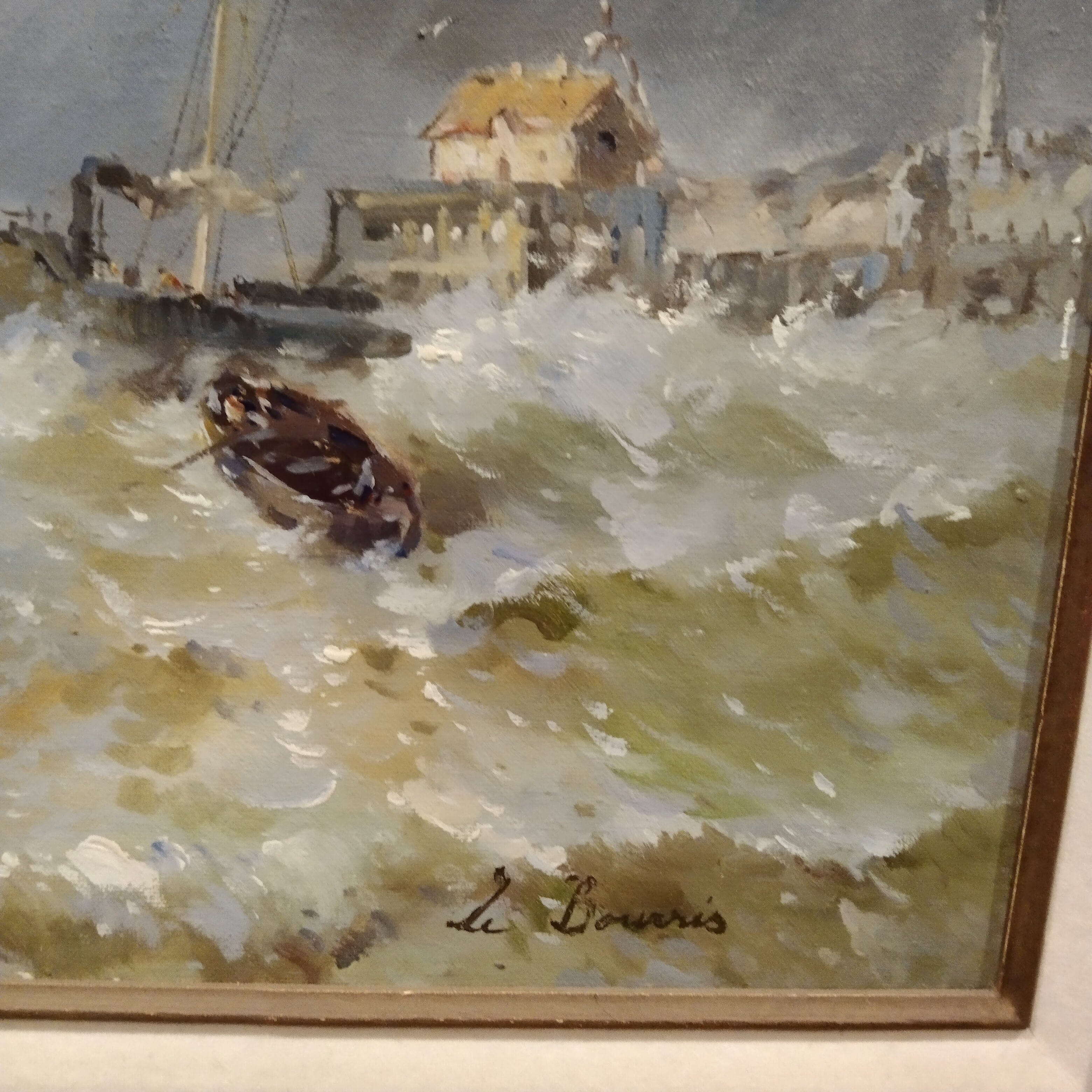Óleo sobre tela del artista L. Bourris, proveniente de Francia. La obra retrata un paisaje costero francés con trazos muy expresivos, que representan barcos pesqueros, la marea, gaviotas y la costa en el fondo.