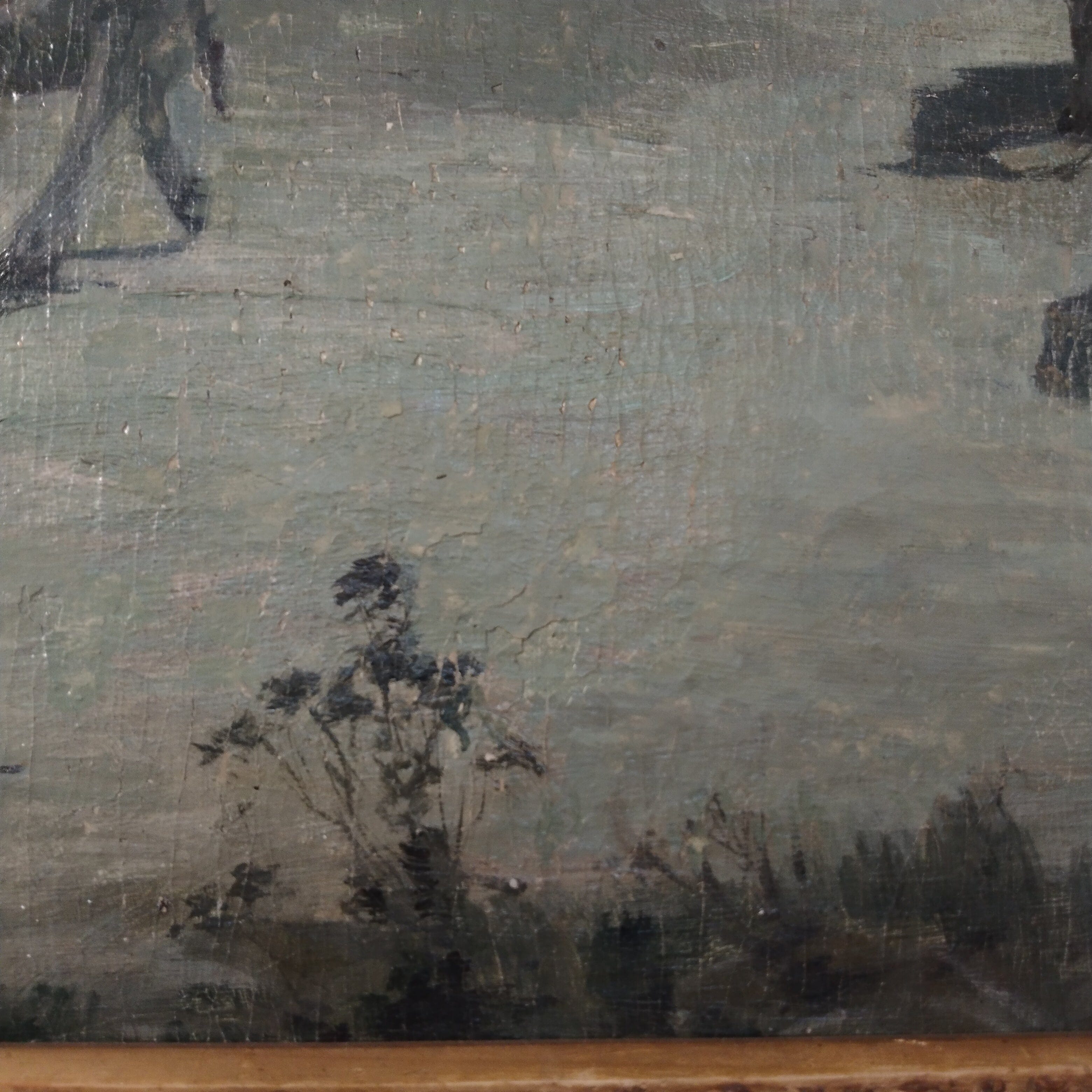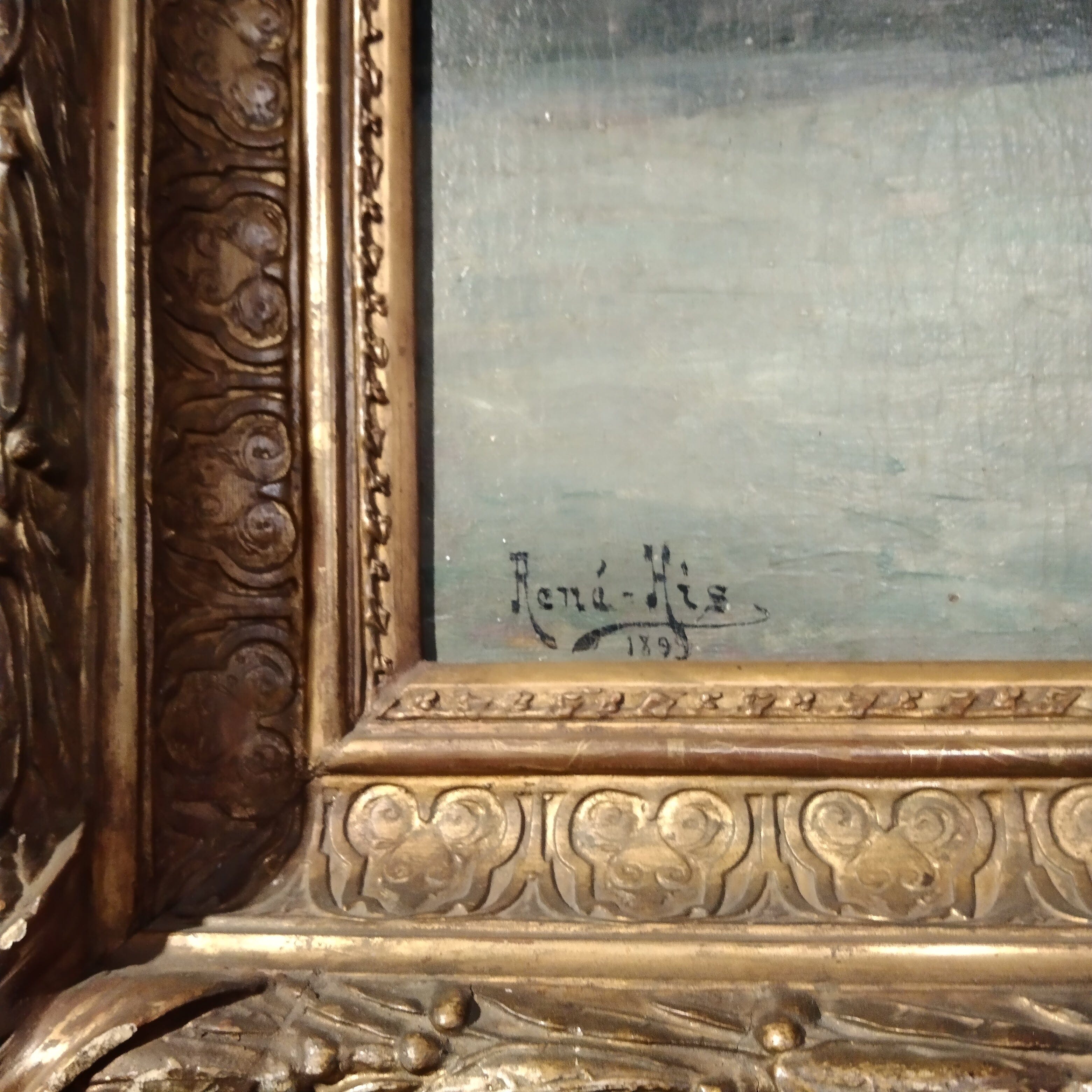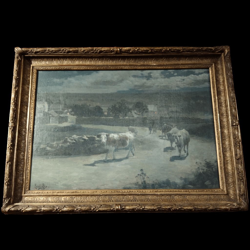 Óleo sobre madera de origen francés, del pintor René His, pintado en 1899. La escena muestra a un rebaño de bacán con su pastor en un camino típico de los paisajes rurales franceses, la escena tiene una luz de de anochecer, indicando que posiblemente el rebaño va en camino de vuelta a su casa. La obra está bellamente enmarcada en un madera antigüa, tallada en relieves y pintada en dorado.