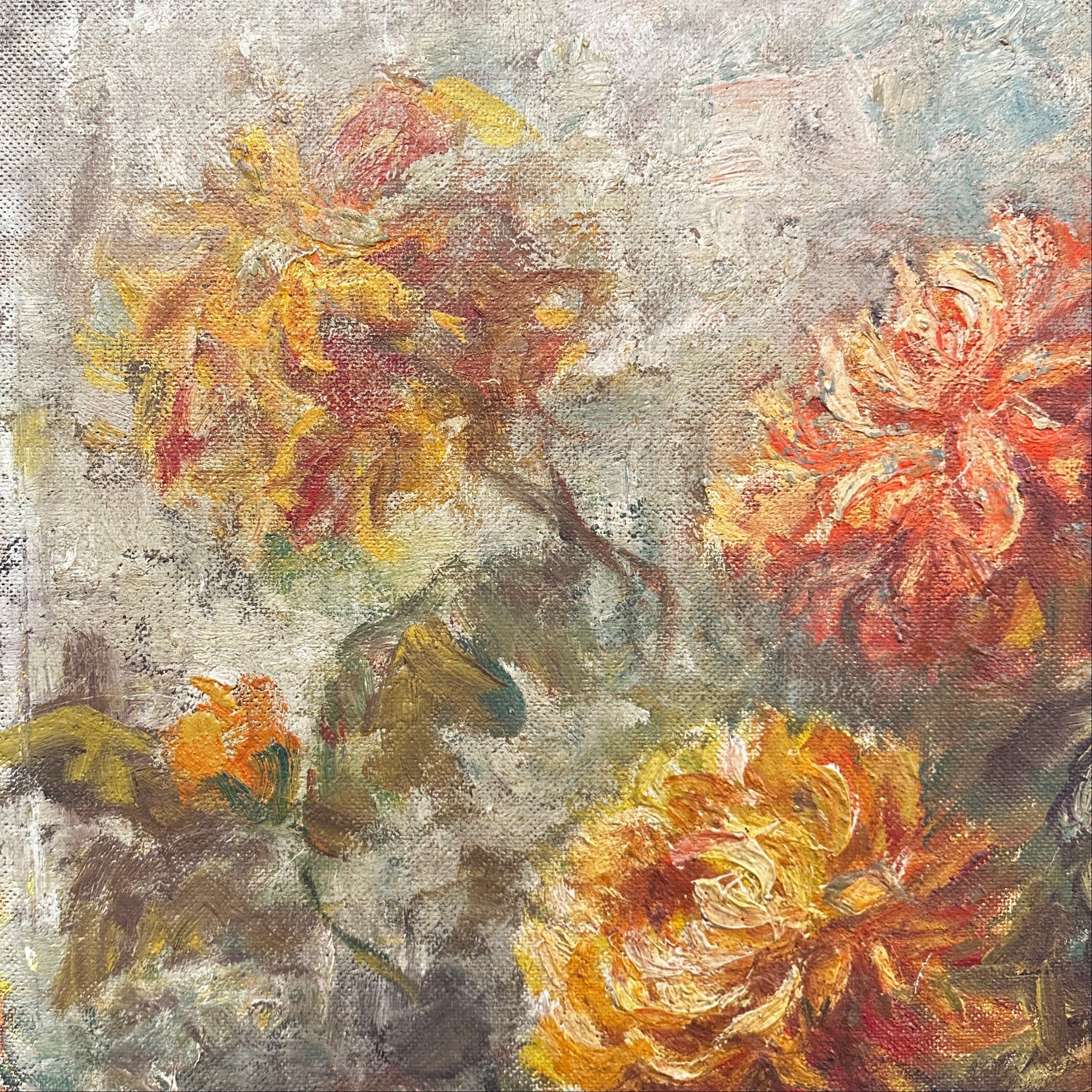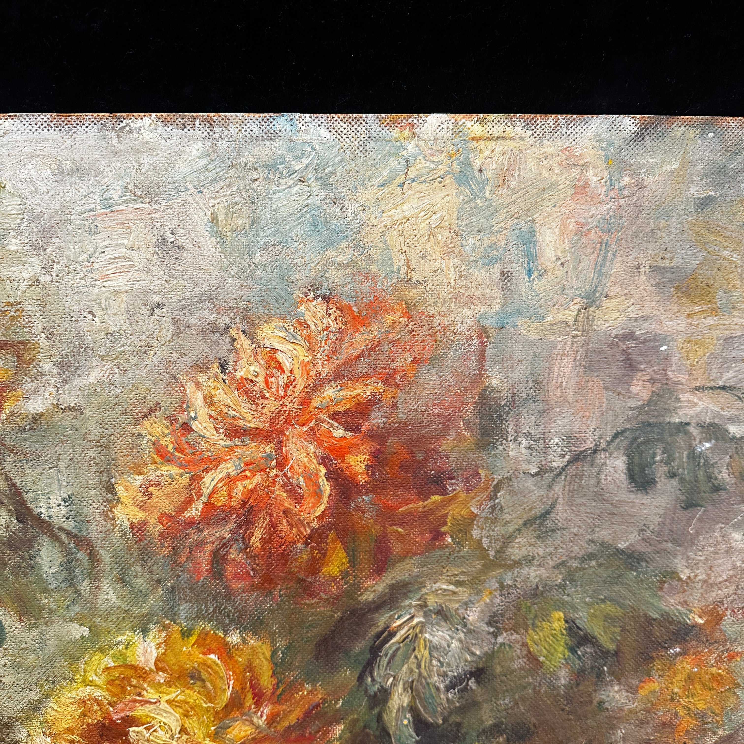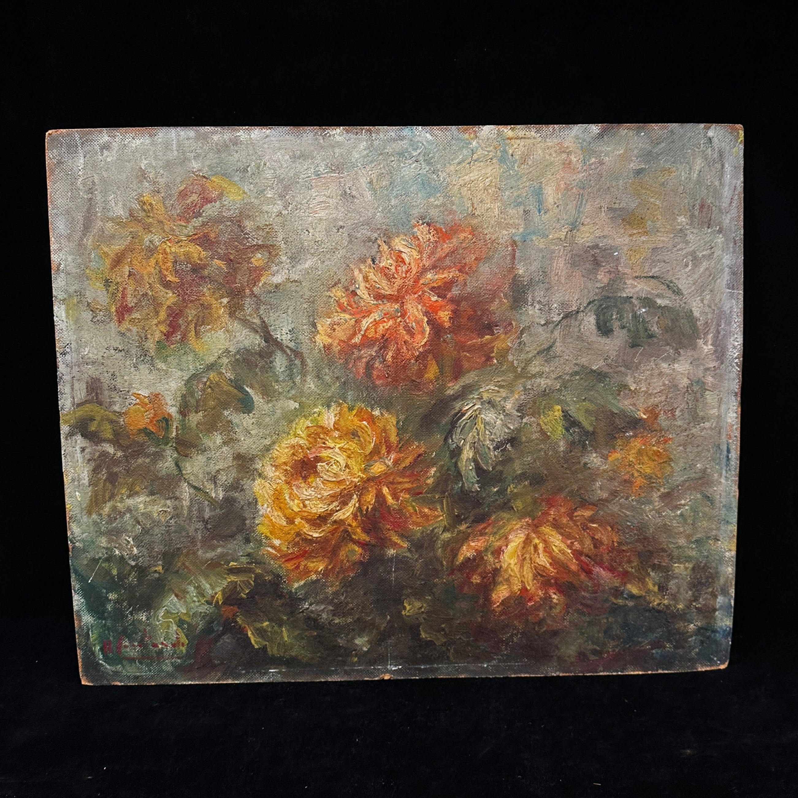 Bello óleo sobre cholguán de la artista chilena Eve Contardi, que representa un arreglo floral en tonos anaranjados y amarillos. La soltura de las pinceladas y el tratamiento de la luz sugieren una clara influencia impresionista. Se encuentra sin marco.