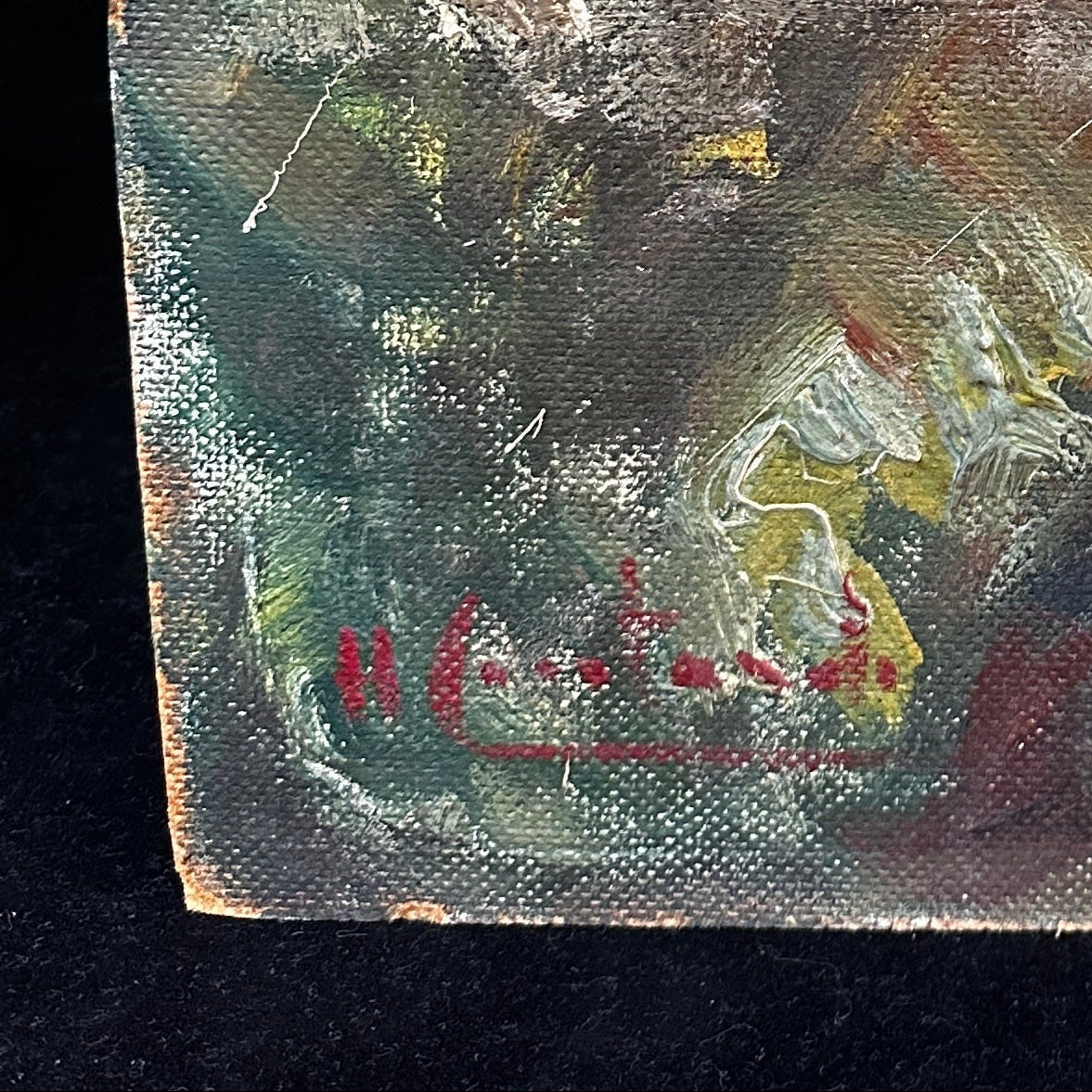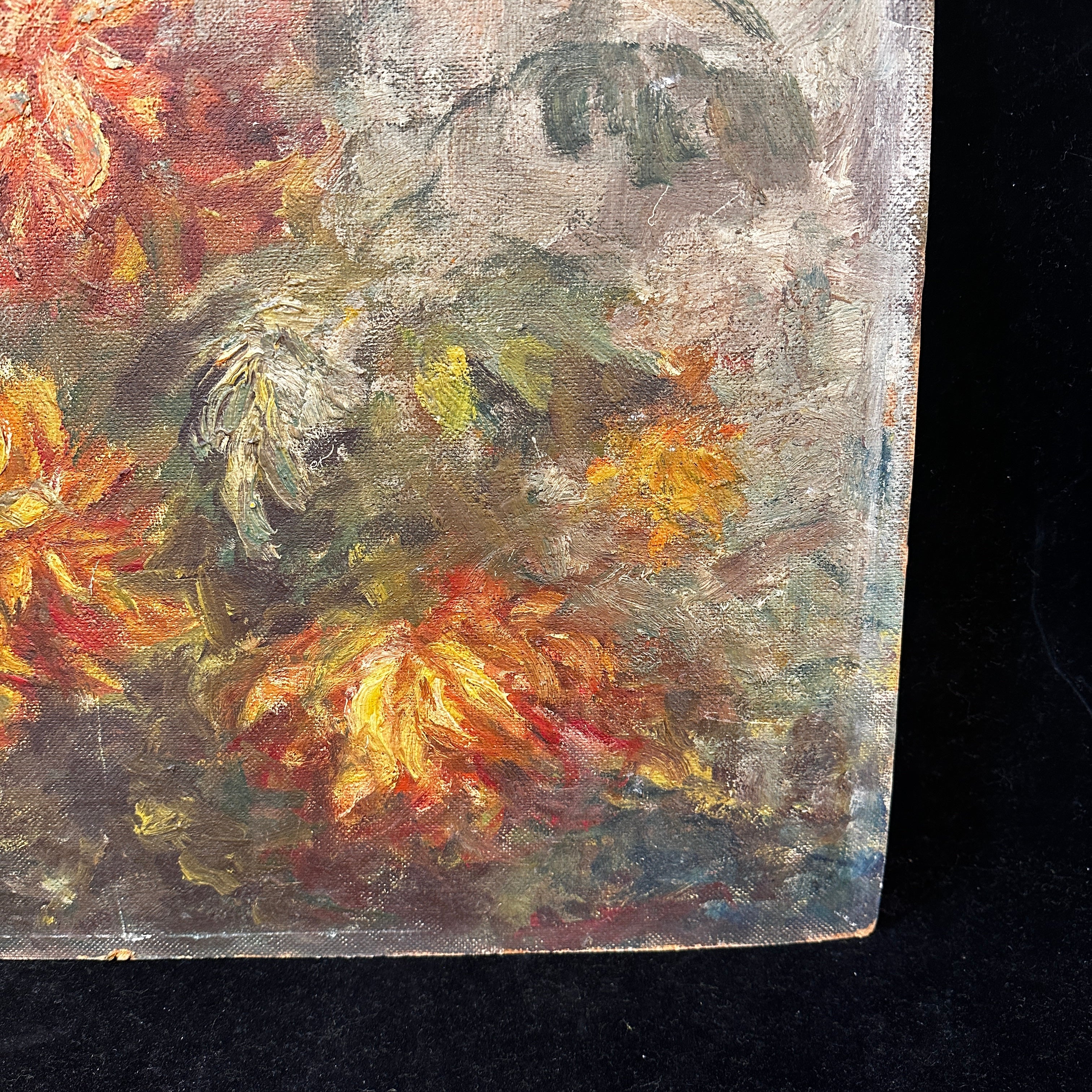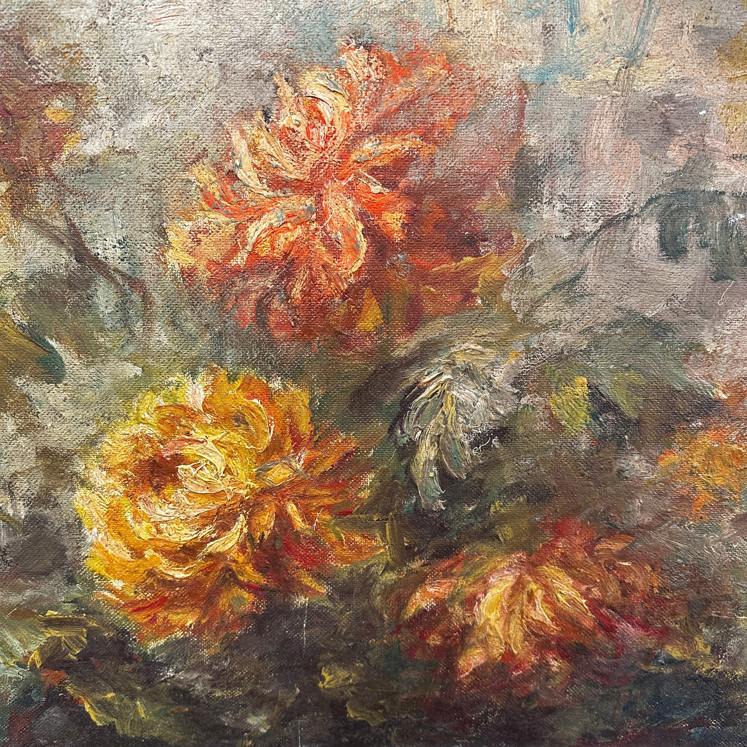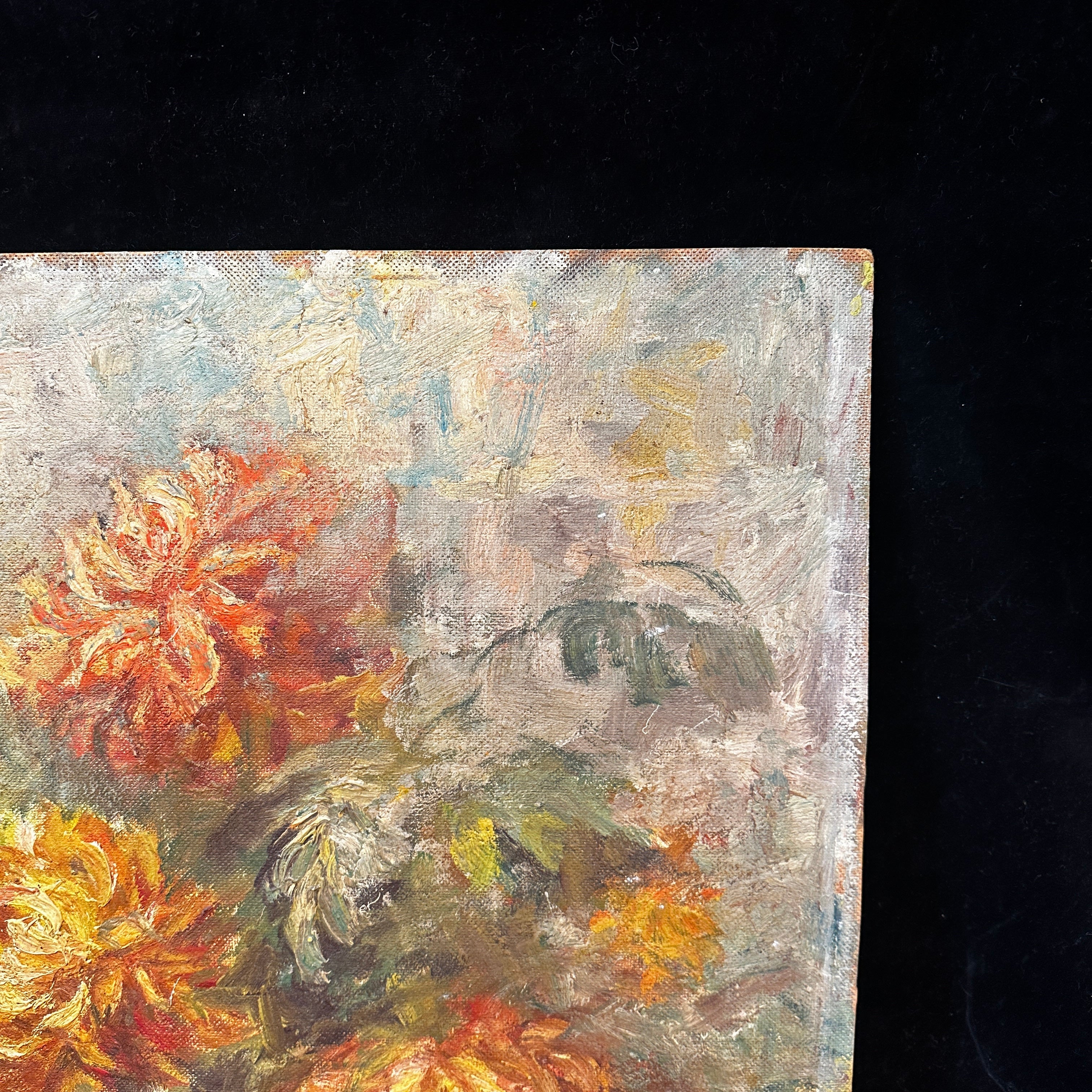 Bello óleo sobre cholguán de la artista chilena Eve Contardi, que representa un arreglo floral en tonos anaranjados y amarillos. La soltura de las pinceladas y el tratamiento de la luz sugieren una clara influencia impresionista. Se encuentra sin marco.