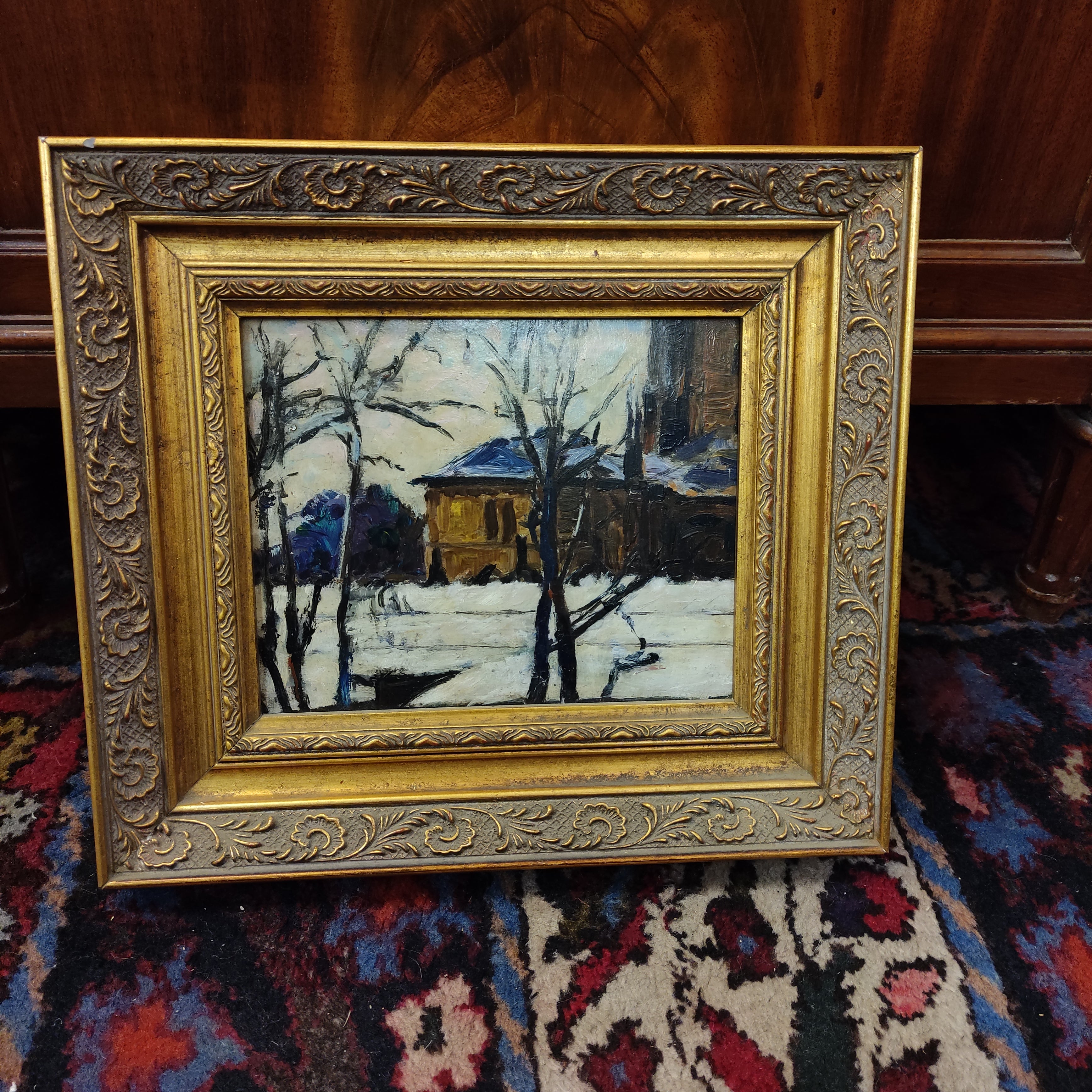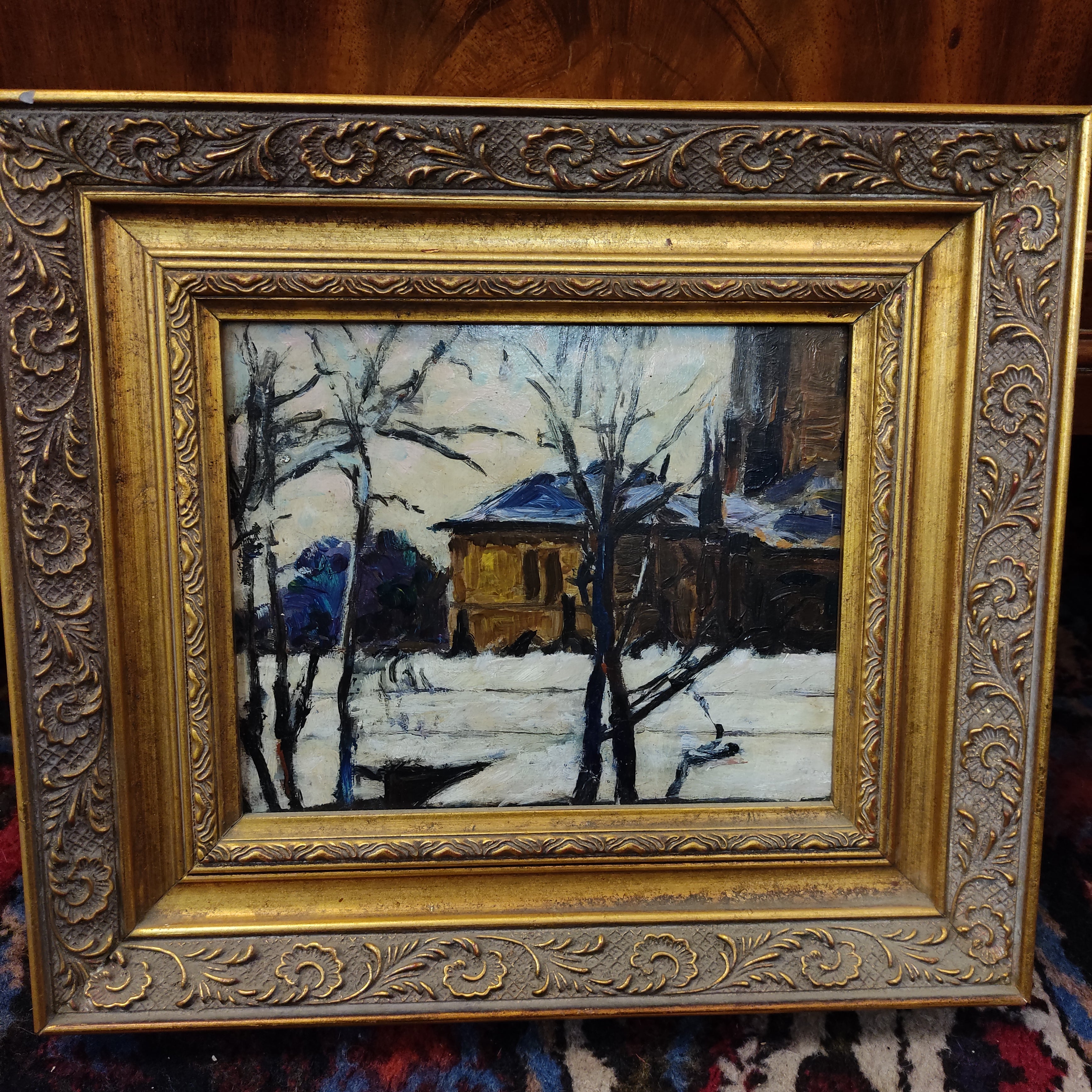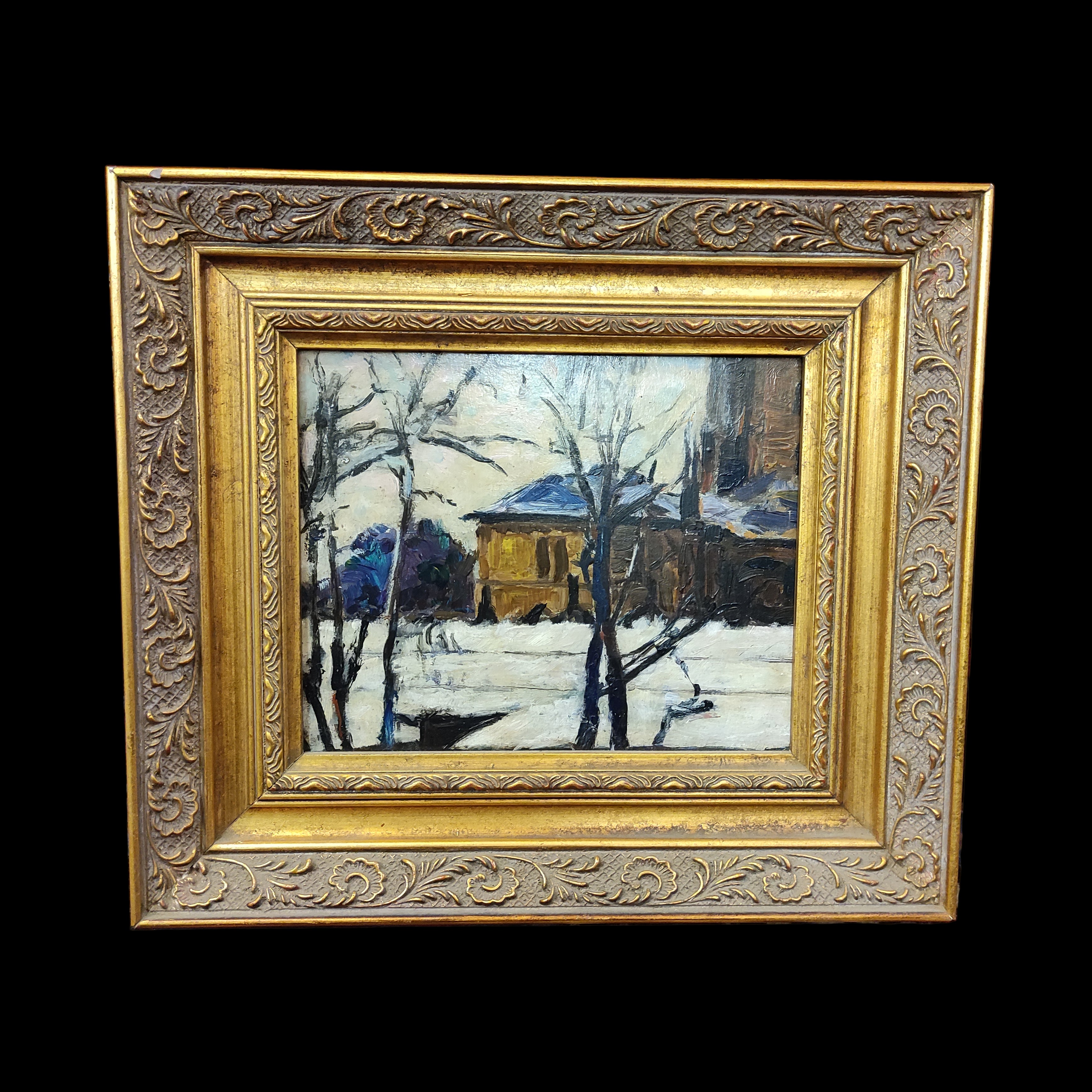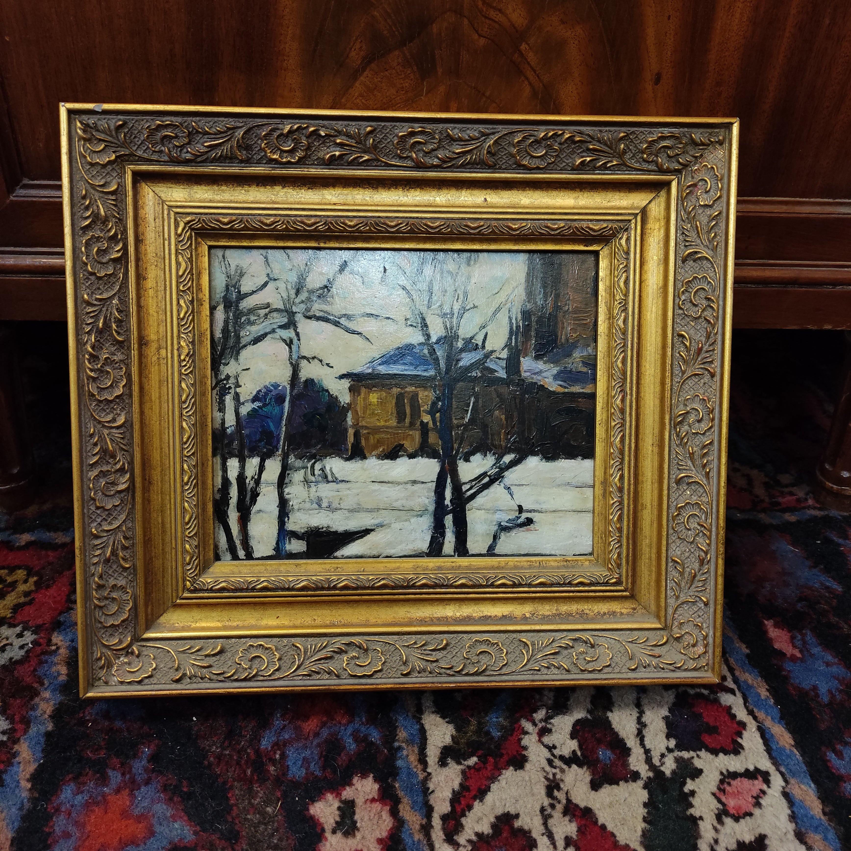 Hermosa obra anónima pintada en óleo sobre madera, que representa una casa sobre un espacio nevado. El cuadro posee un imponente marco dorado y tallado.