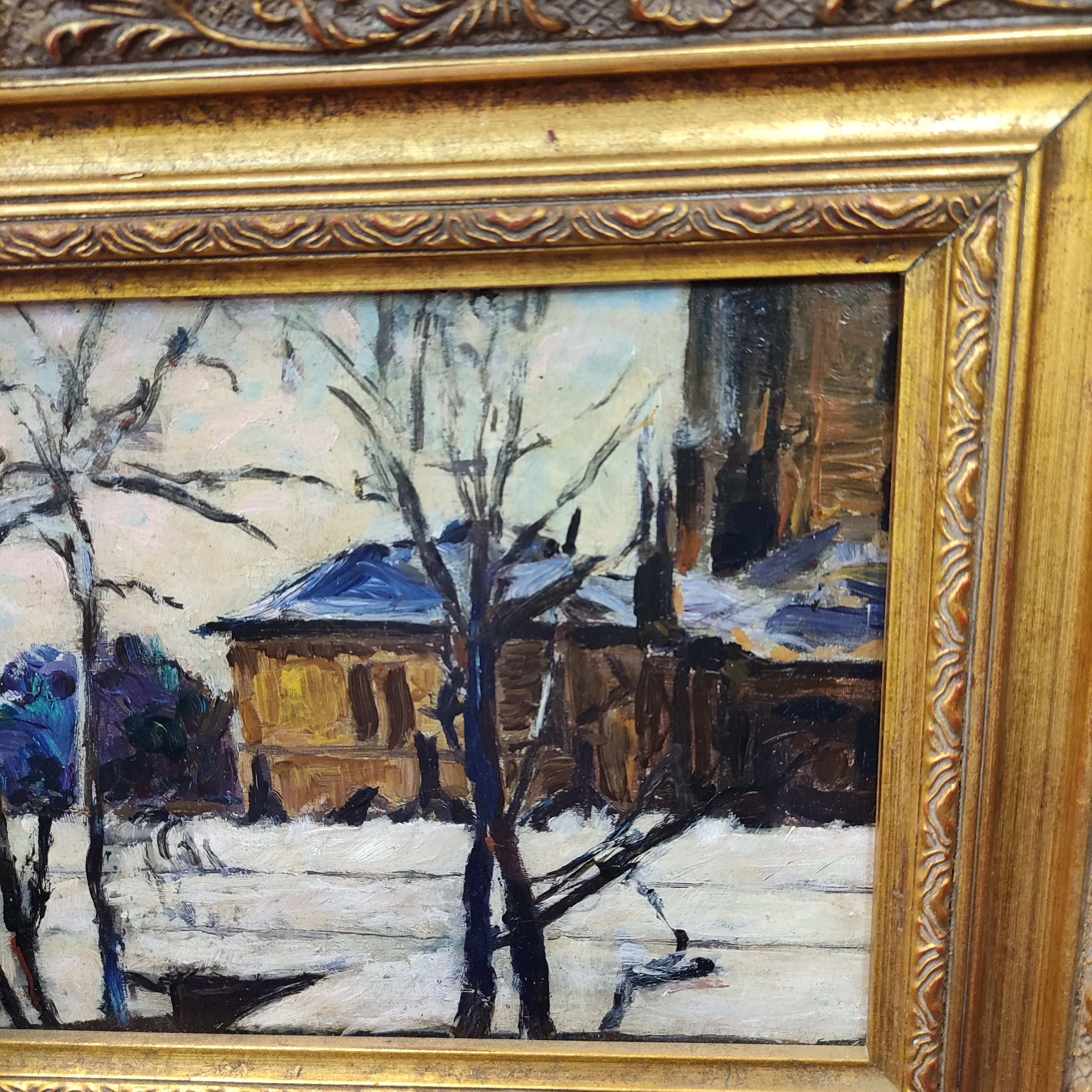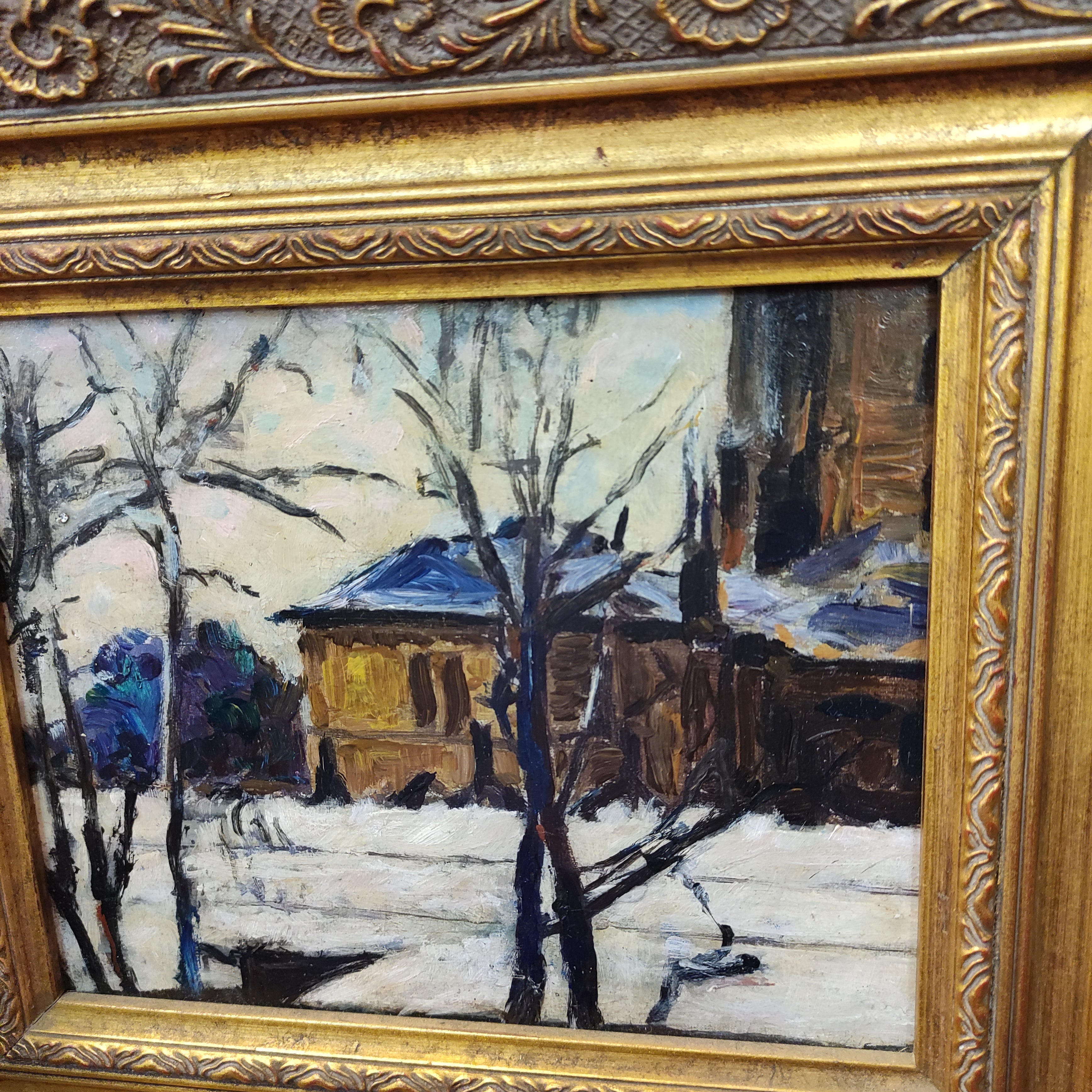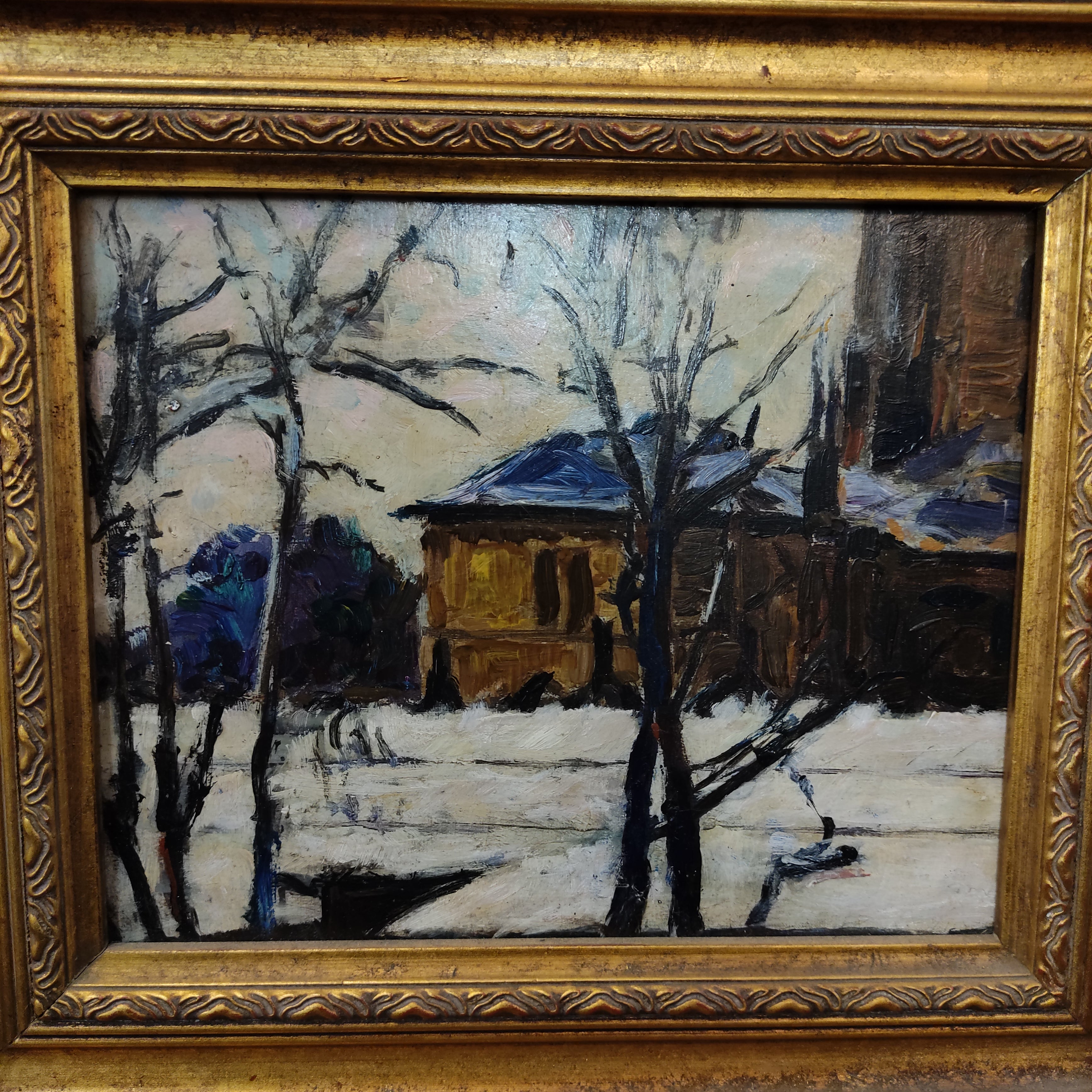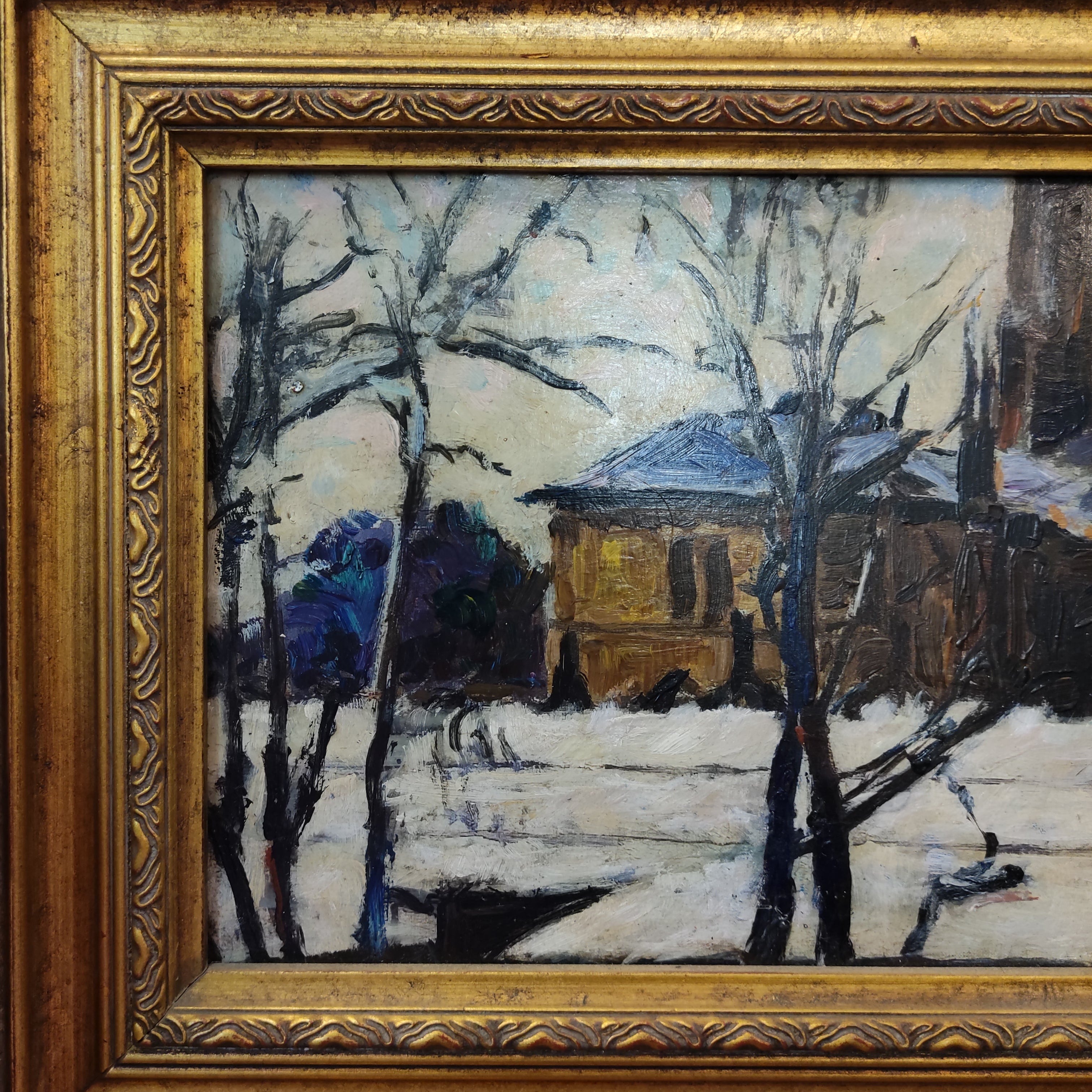 Hermosa obra anónima pintada en óleo sobre madera, que representa una casa sobre un espacio nevado. El cuadro posee un imponente marco dorado y tallado.
