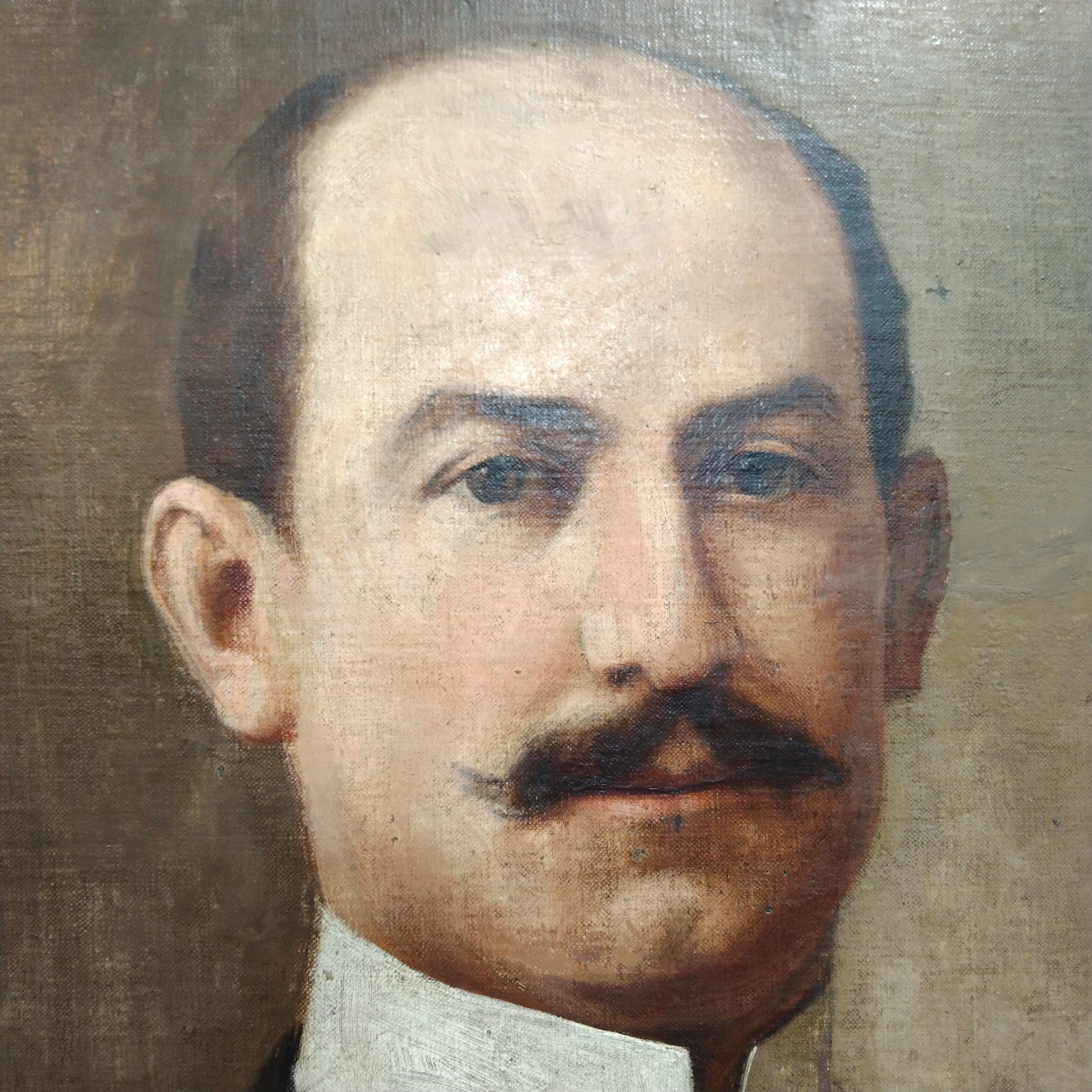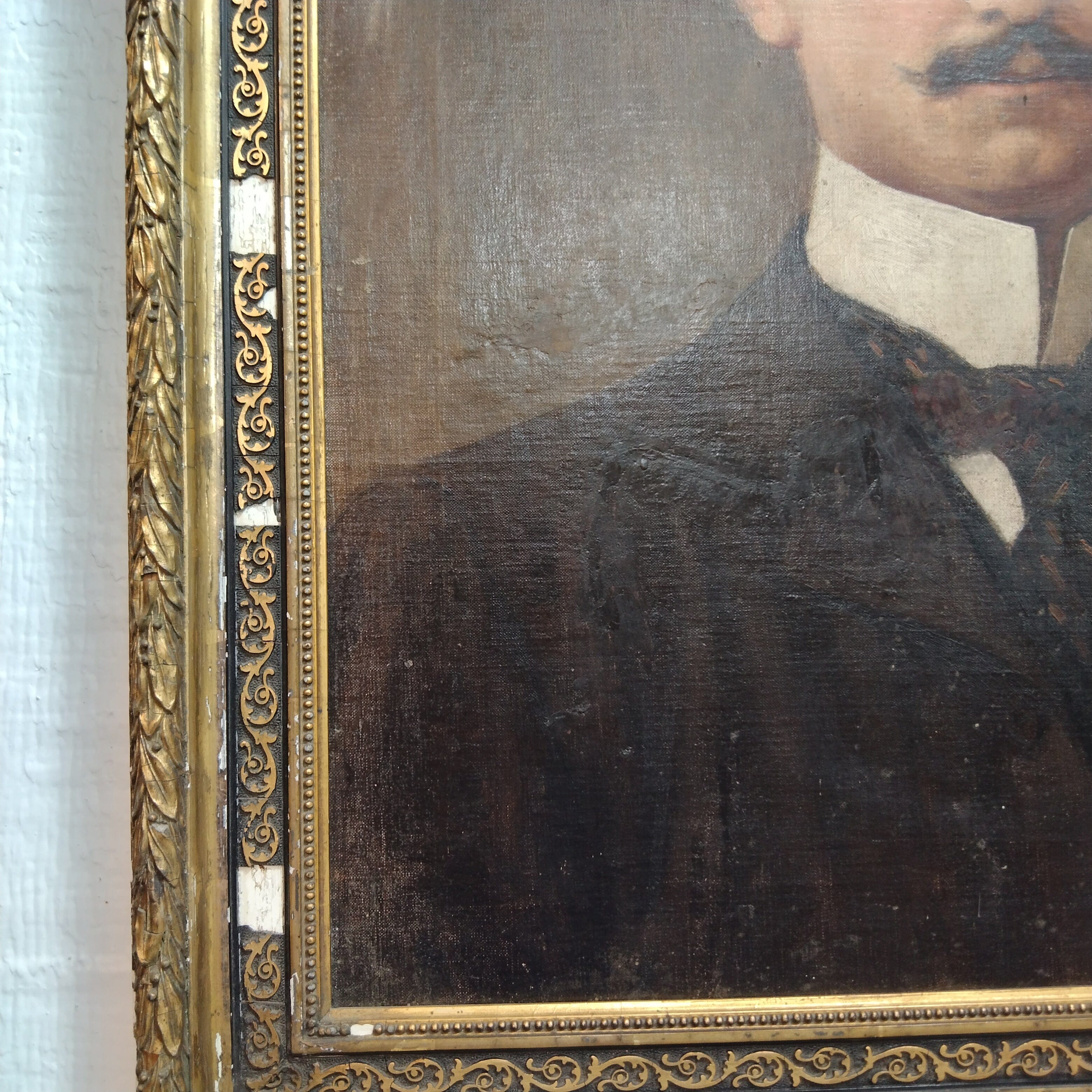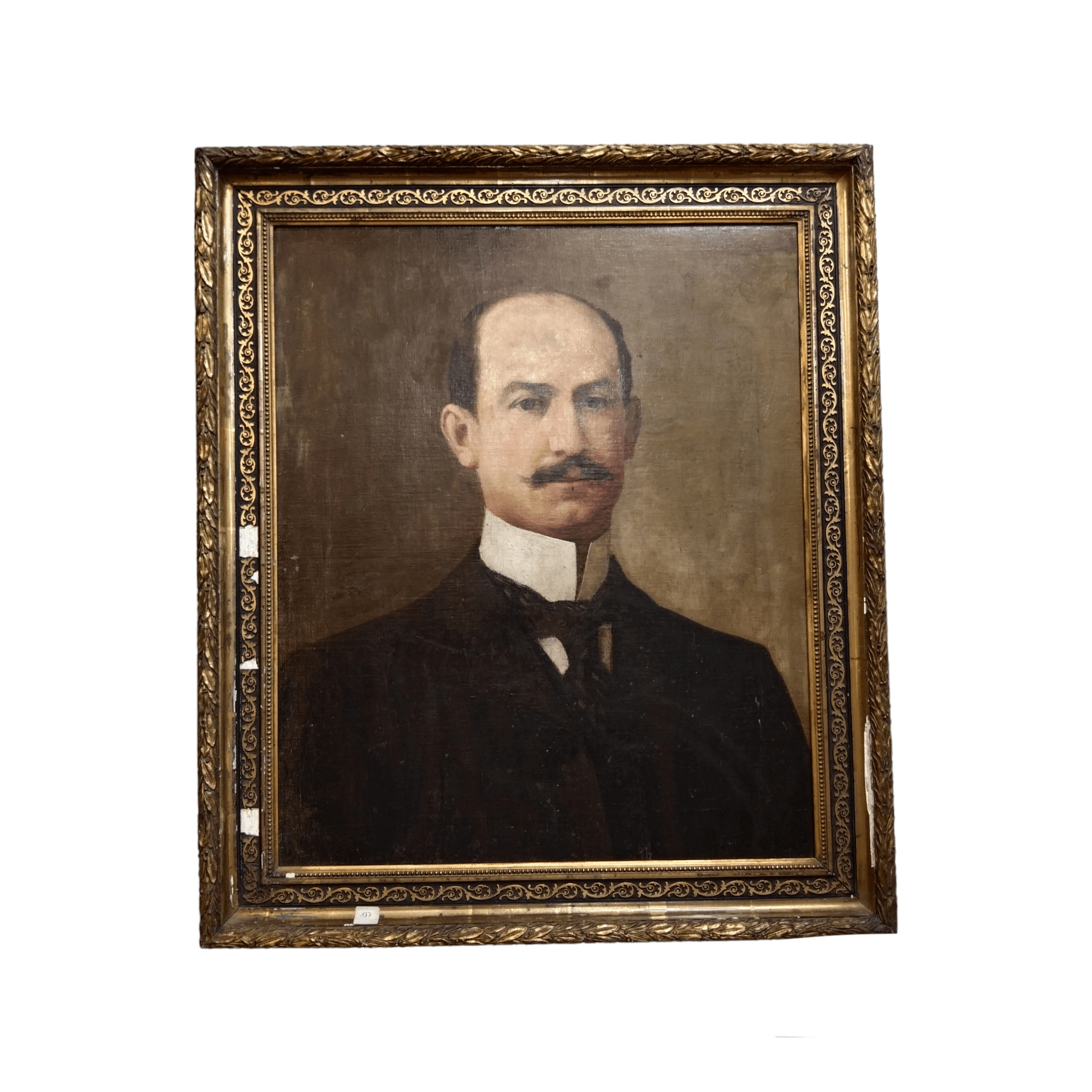 Óleo sobre tela retratando a un caballero con traje mirando hacia el frente. La obra tiene un marco de madera tallada y pintada en dorado.