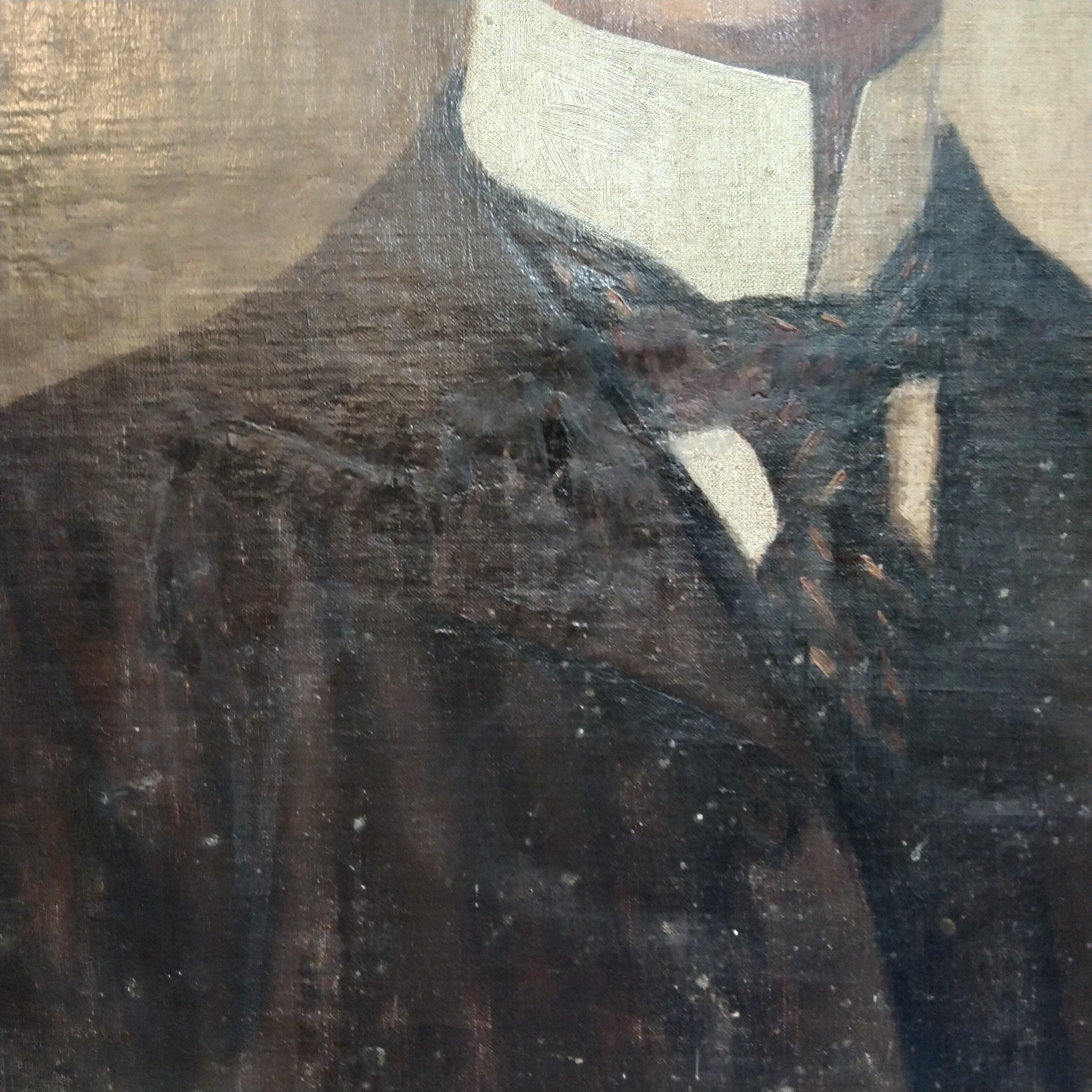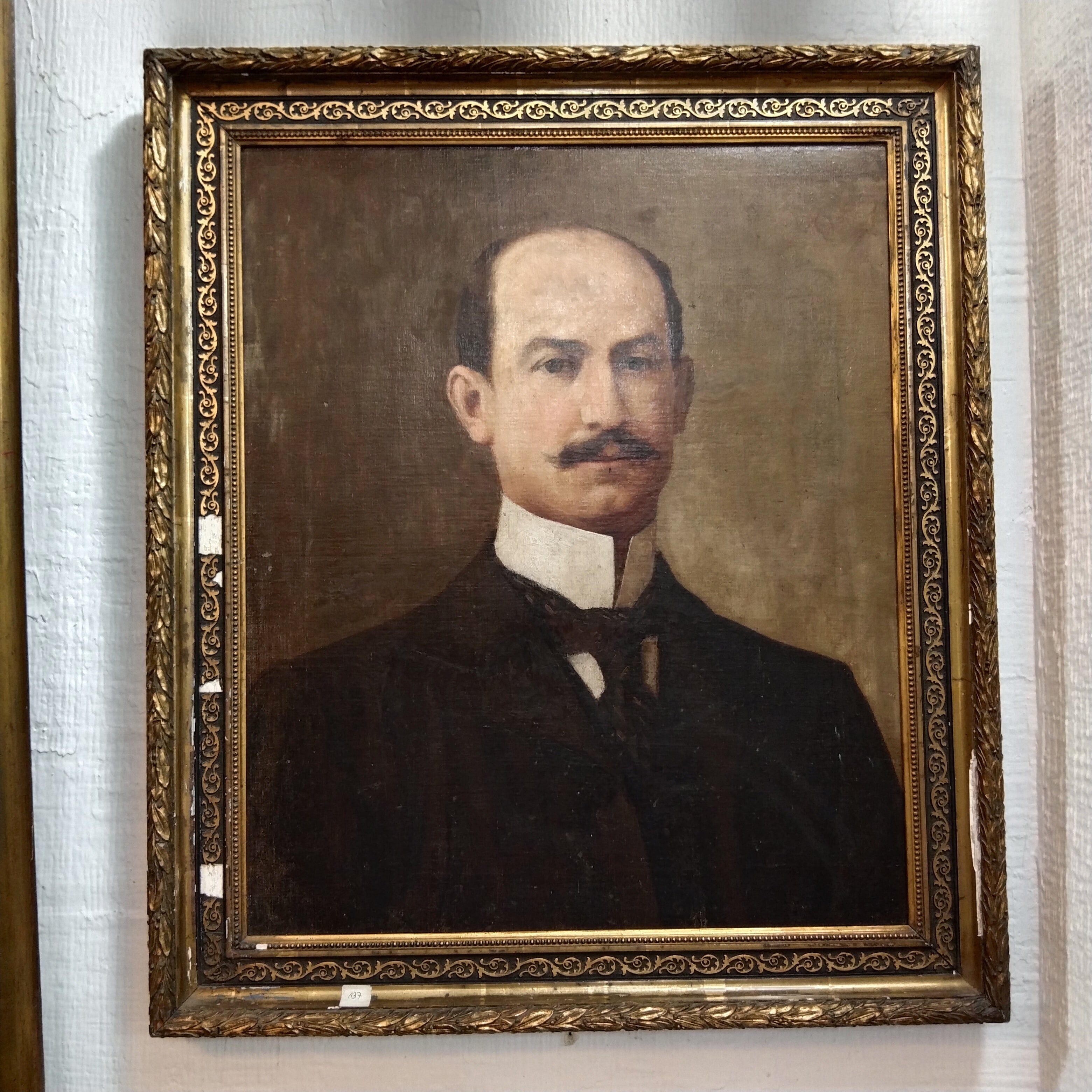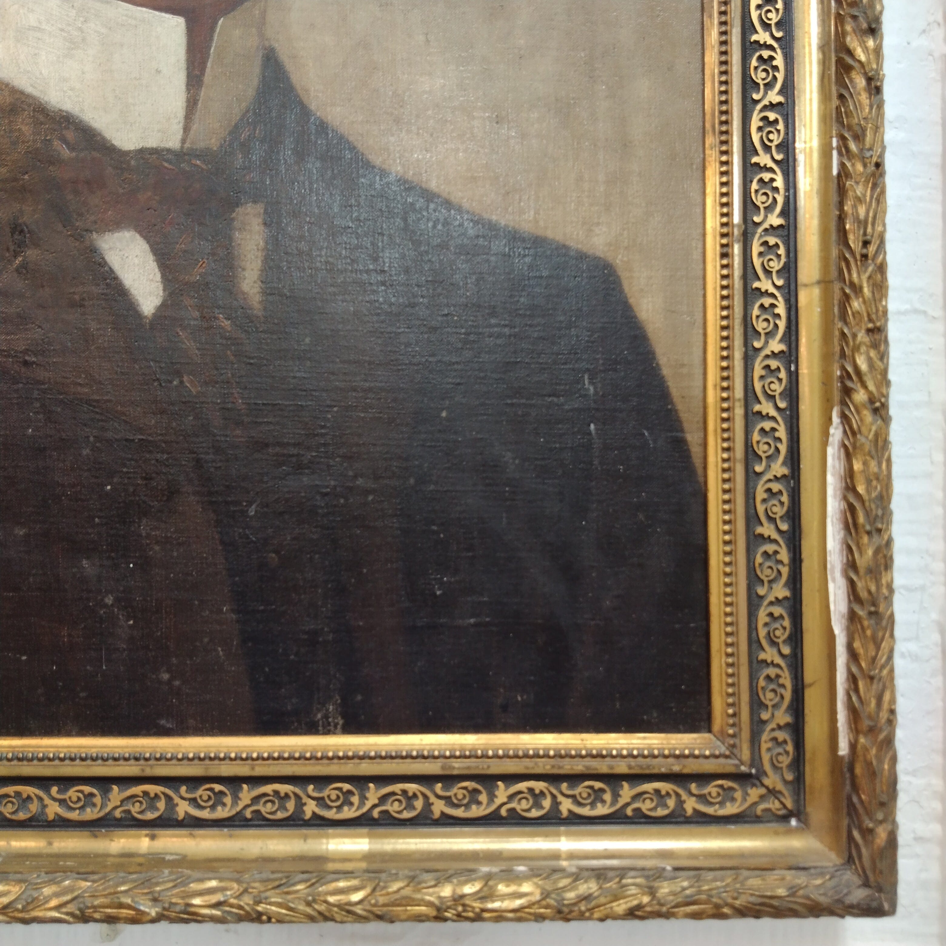 Óleo sobre tela retratando a un caballero con traje mirando hacia el frente. La obra tiene un marco de madera tallada y pintada en dorado.
