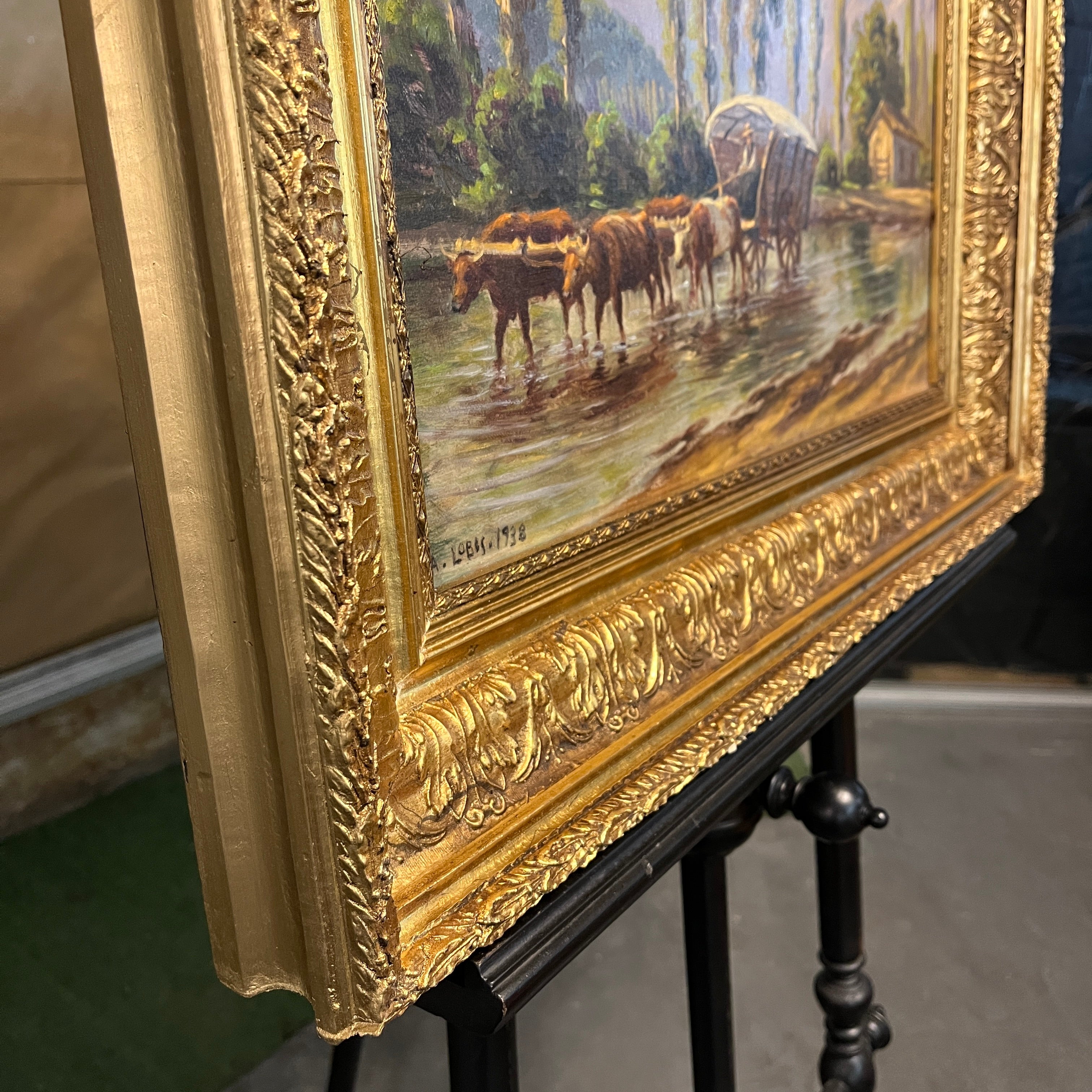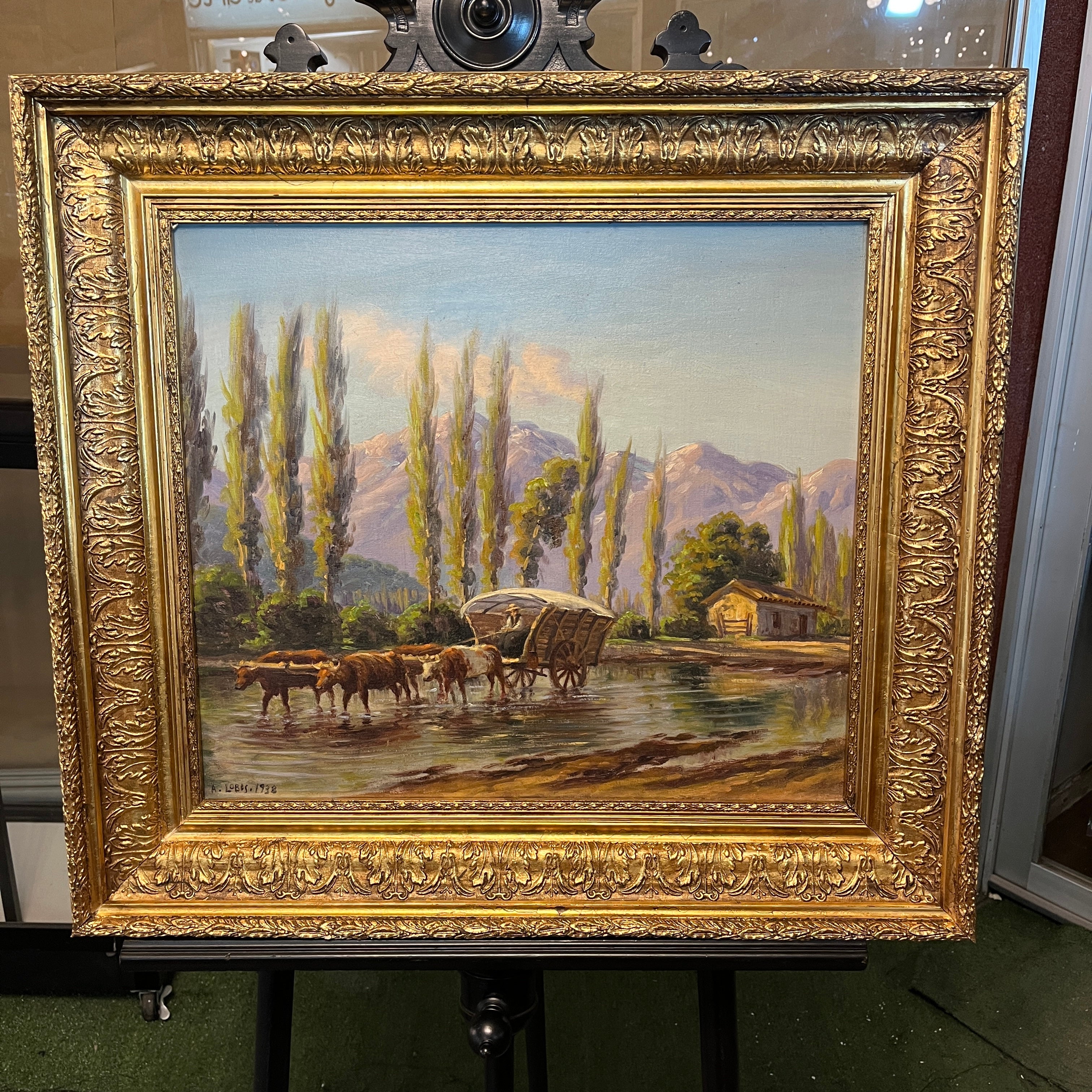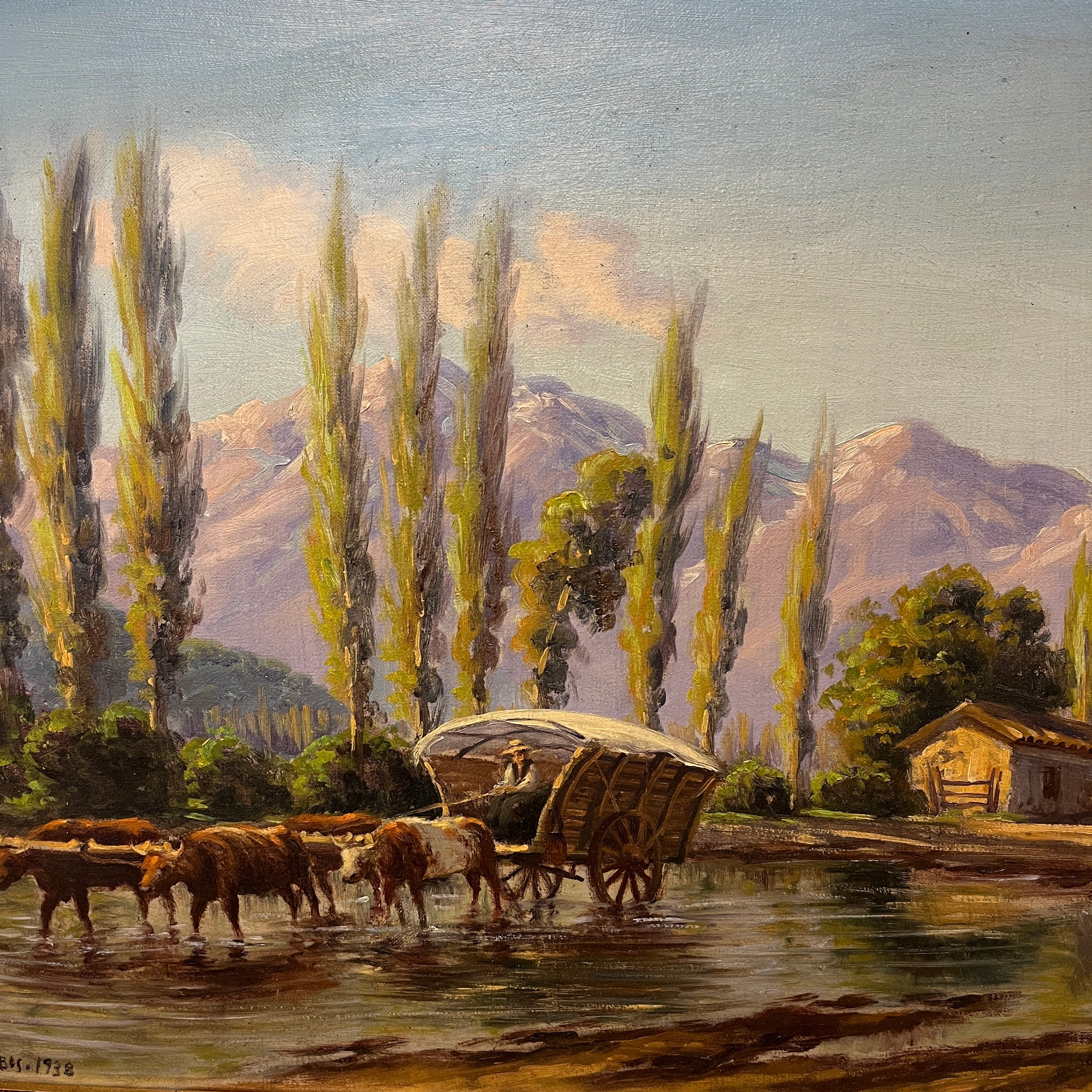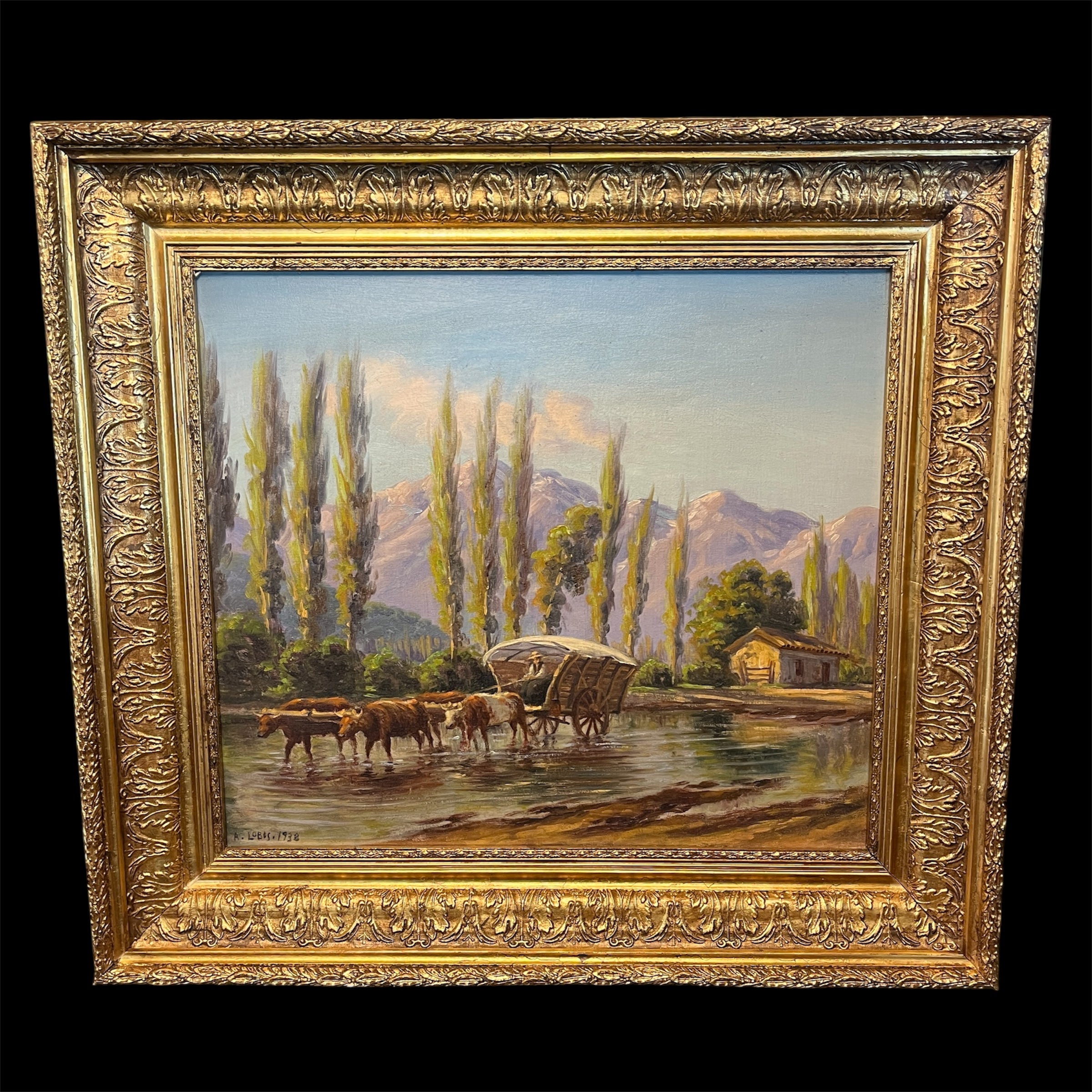 Óleo sobre tela del reconocido artista chileno Alberto Lobos, representando una escena rural, en la que un campesino va en su carreta sobre un pequeño riachuelo, rodeado de árboles, empujado por sus vacas. Al fondo, una tradicional casa de adobe y la imponente cordillera. La obra está enmarcada en madera tallada en finos relieves y pintada de dorado.