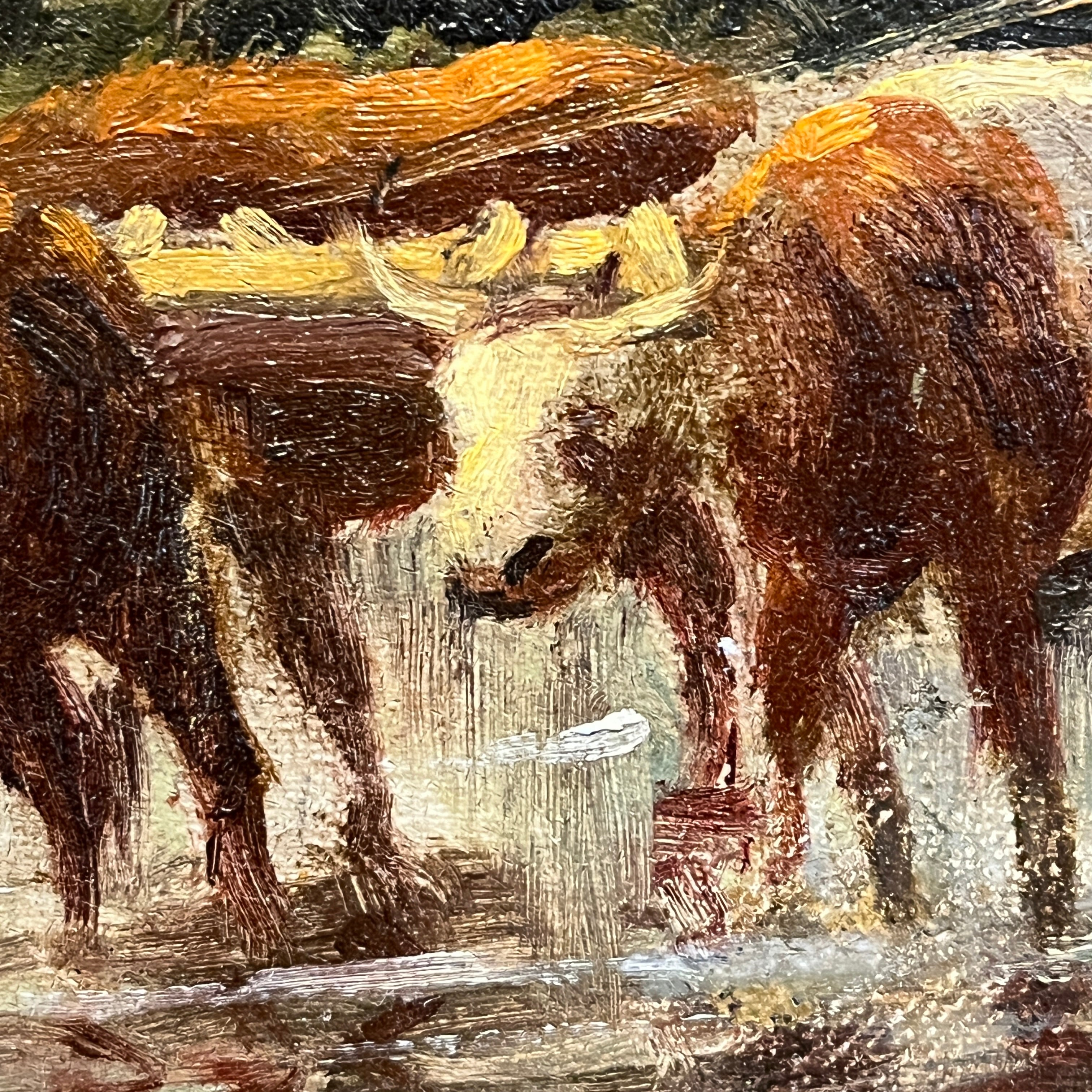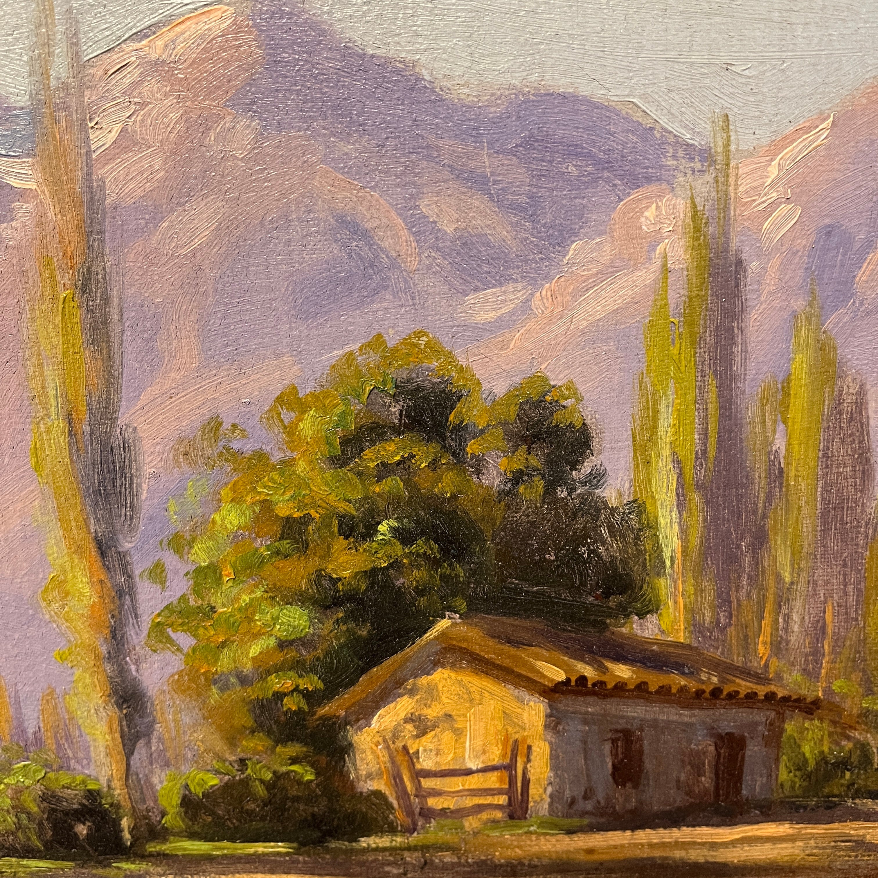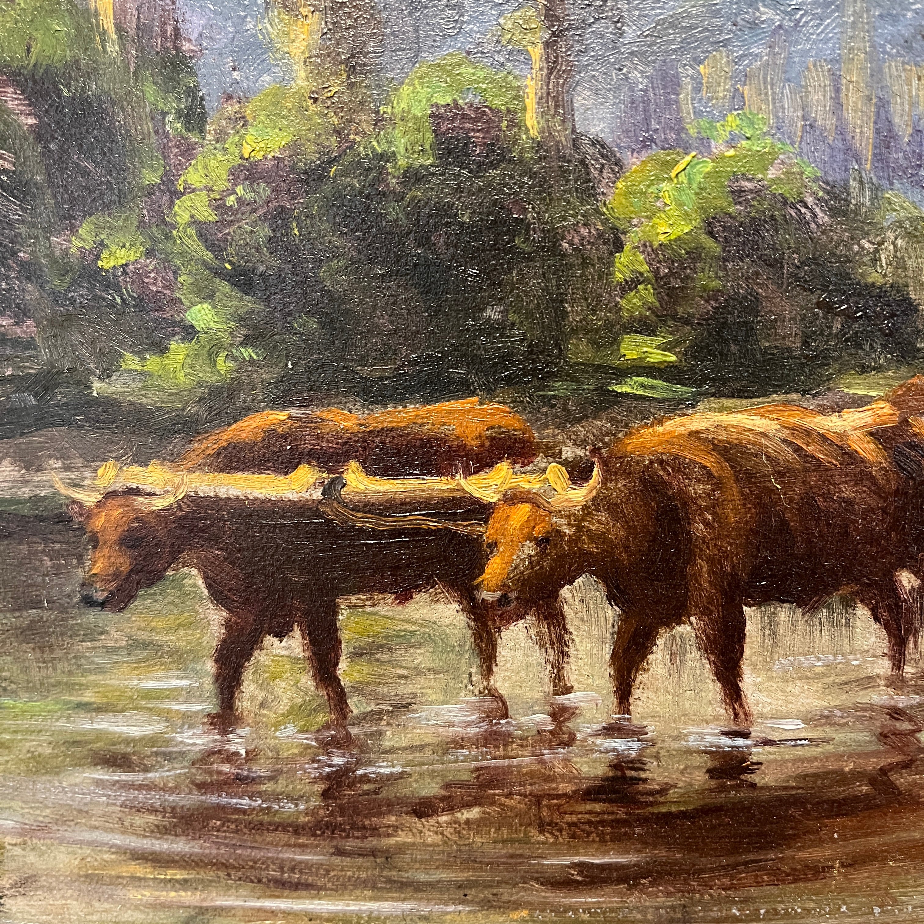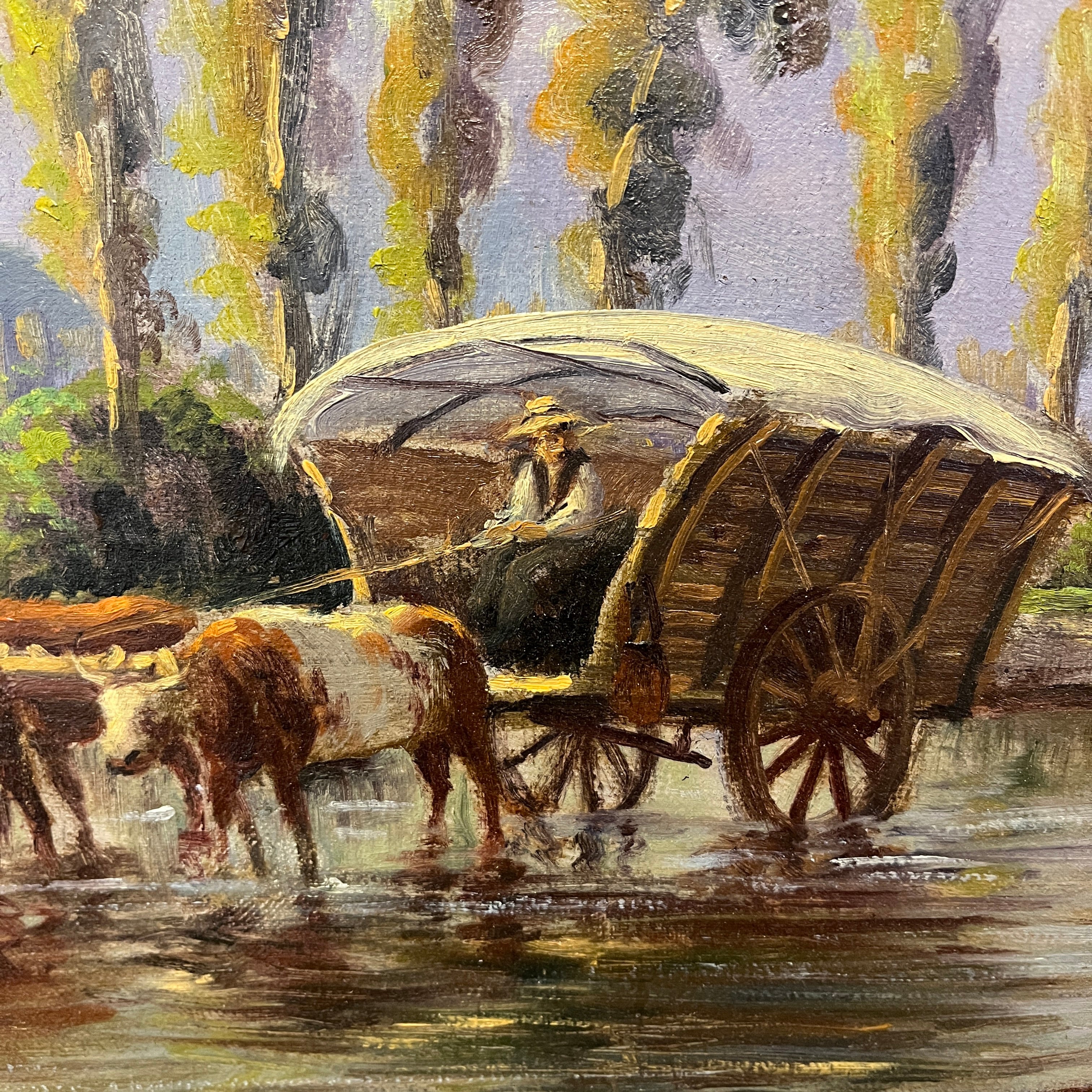 Óleo sobre tela del reconocido artista chileno Alberto Lobos, representando una escena rural, en la que un campesino va en su carreta sobre un pequeño riachuelo, rodeado de árboles, empujado por sus vacas. Al fondo, una tradicional casa de adobe y la imponente cordillera. La obra está enmarcada en madera tallada en finos relieves y pintada de dorado.