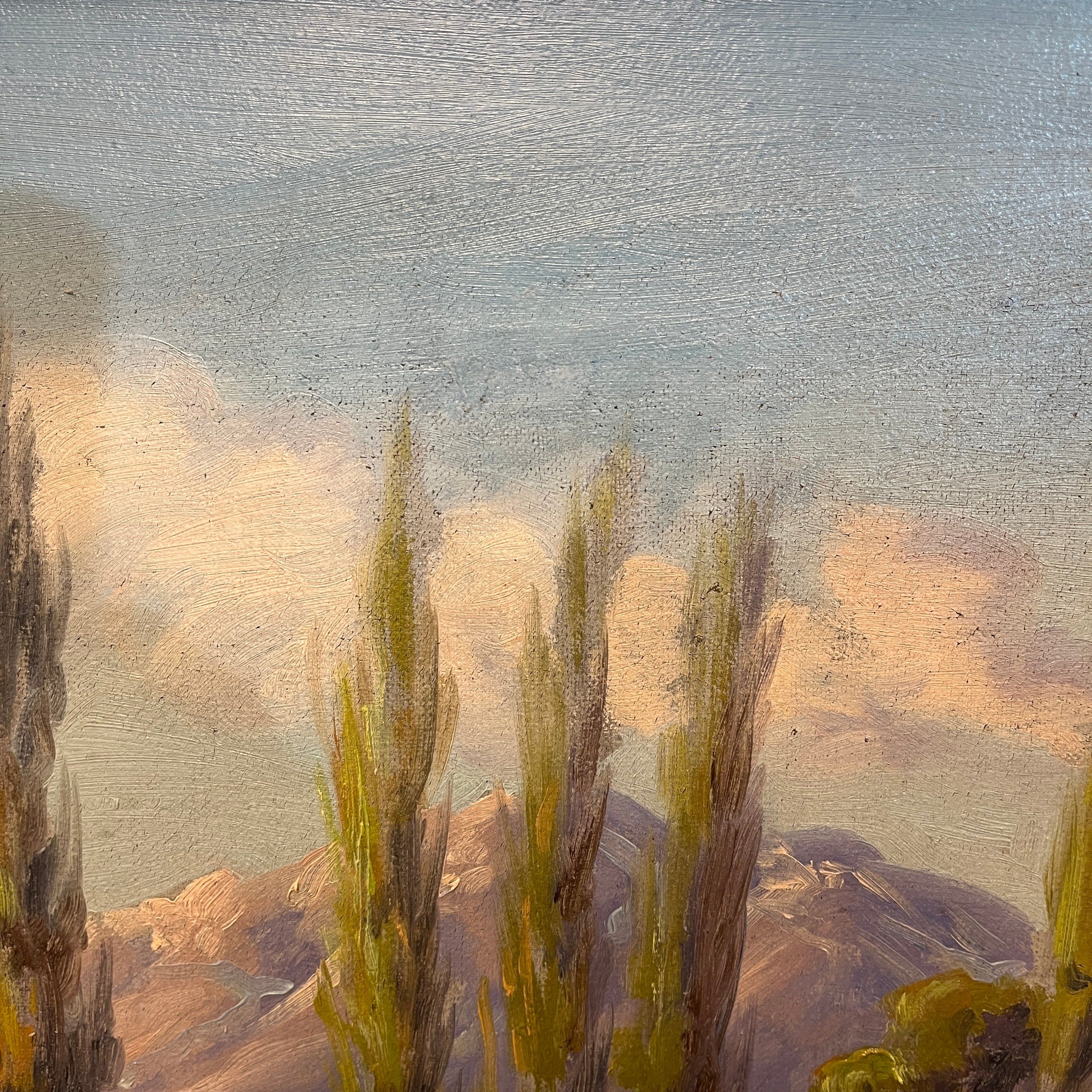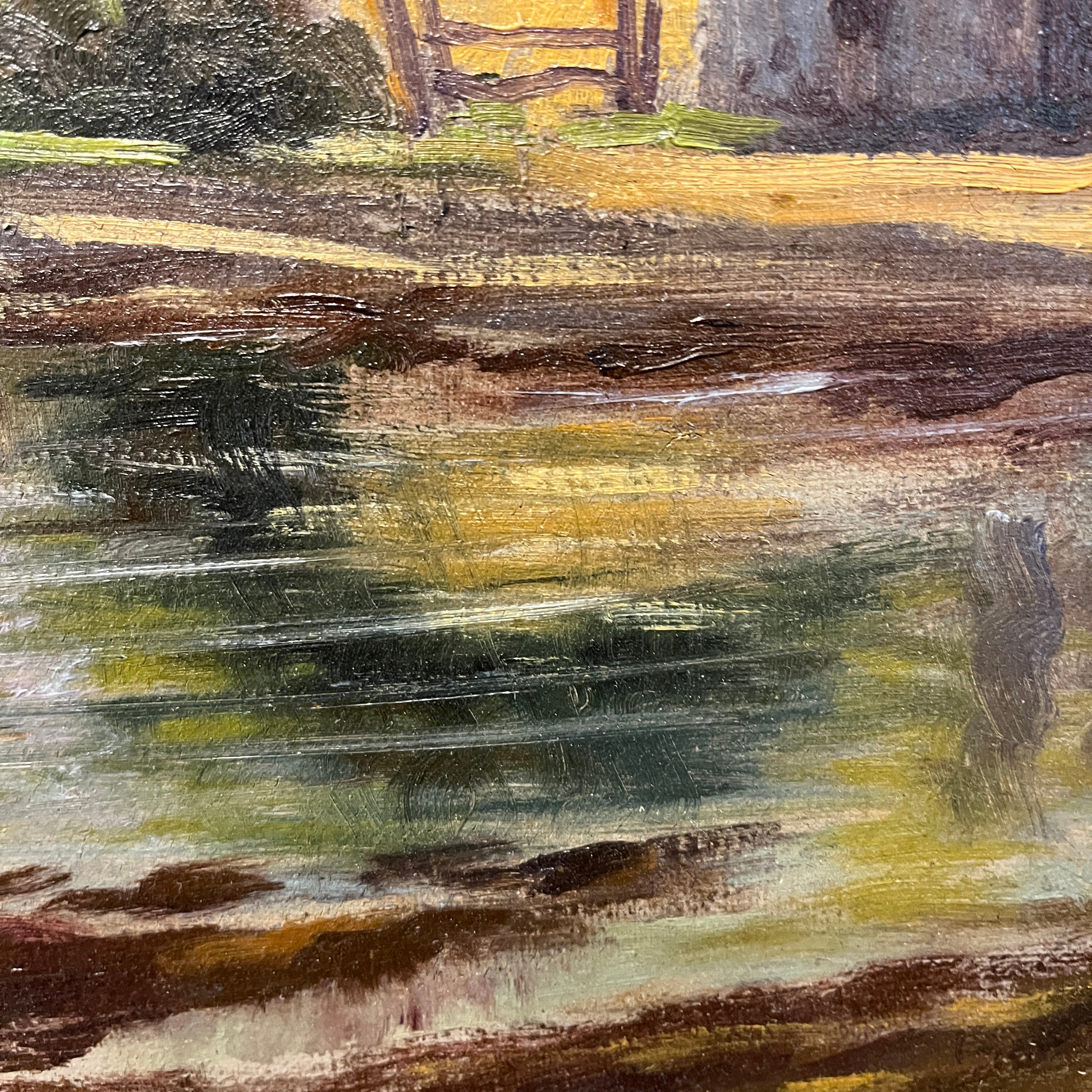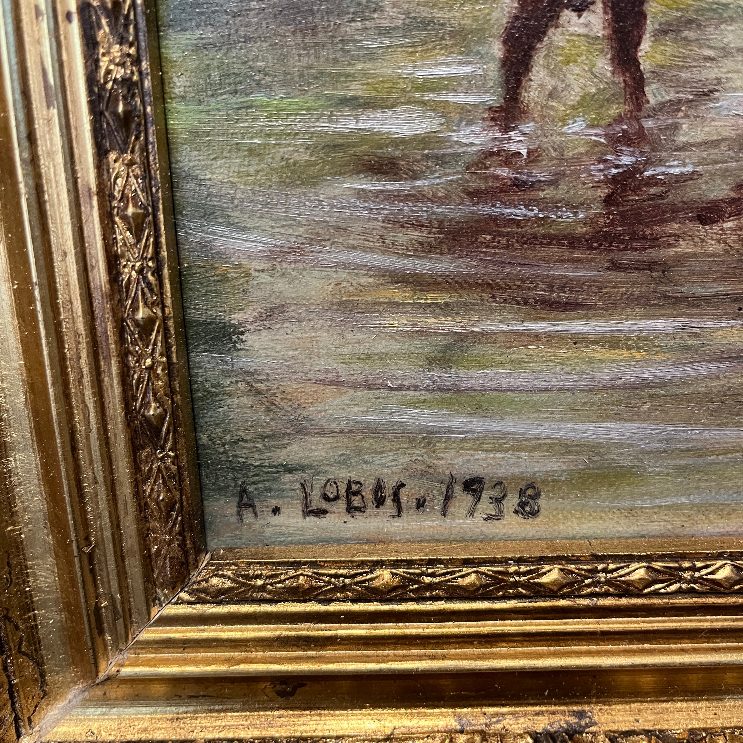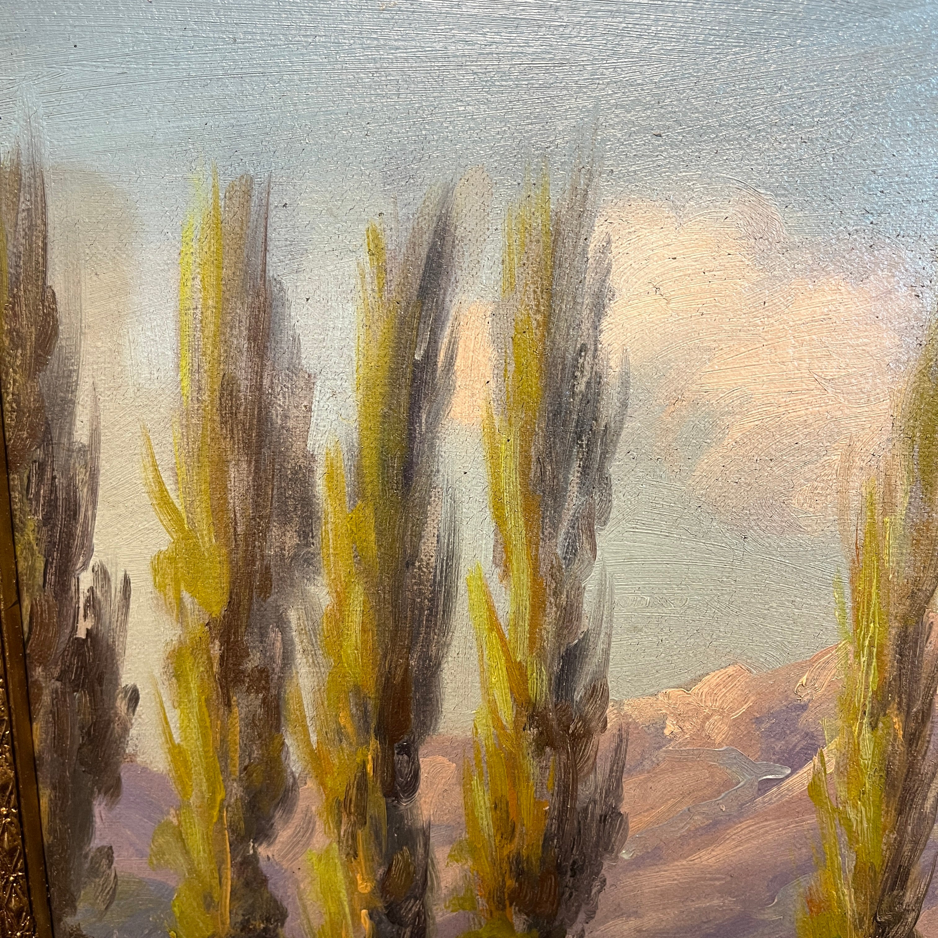 Óleo sobre tela del reconocido artista chileno Alberto Lobos, representando una escena rural, en la que un campesino va en su carreta sobre un pequeño riachuelo, rodeado de árboles, empujado por sus vacas. Al fondo, una tradicional casa de adobe y la imponente cordillera. La obra está enmarcada en madera tallada en finos relieves y pintada de dorado.