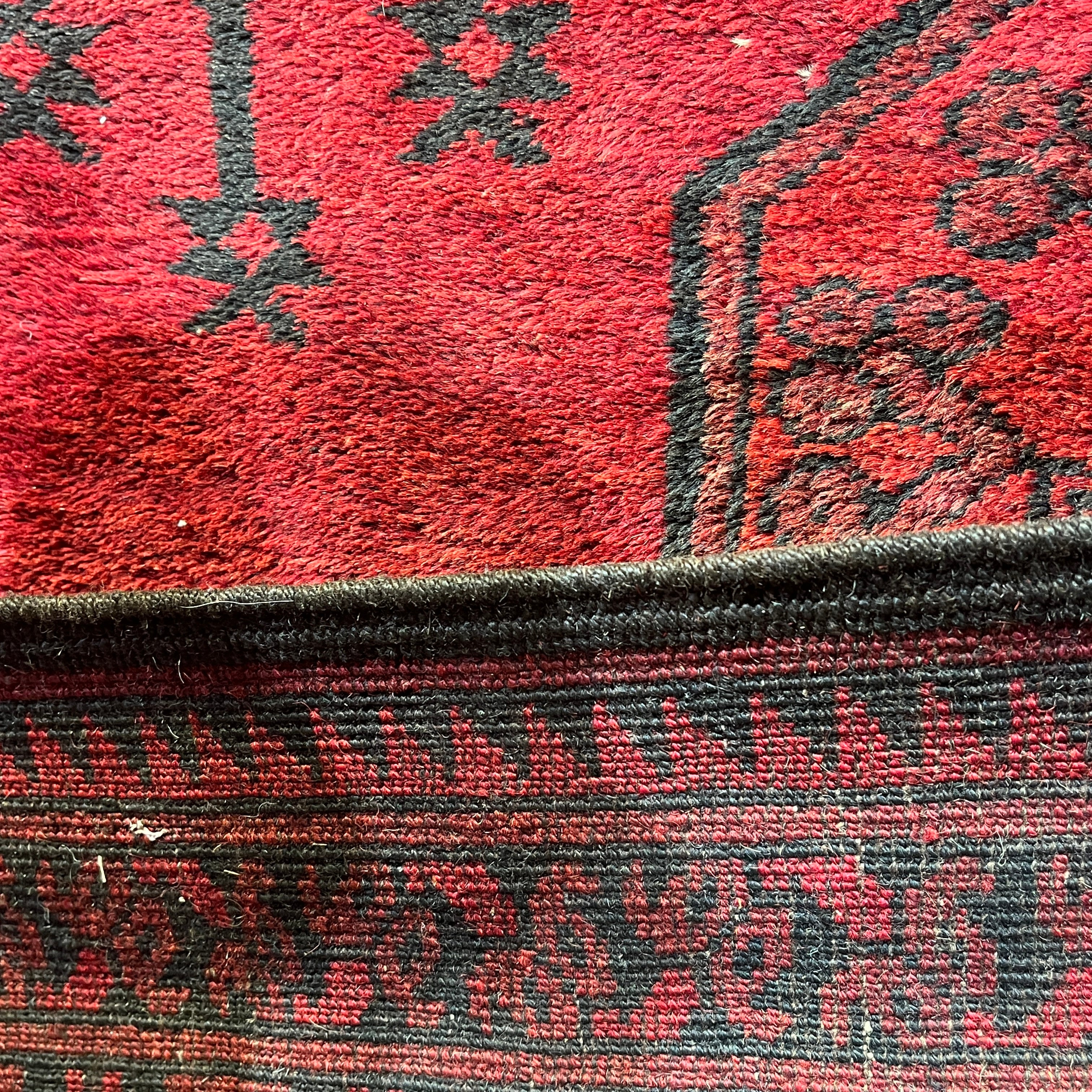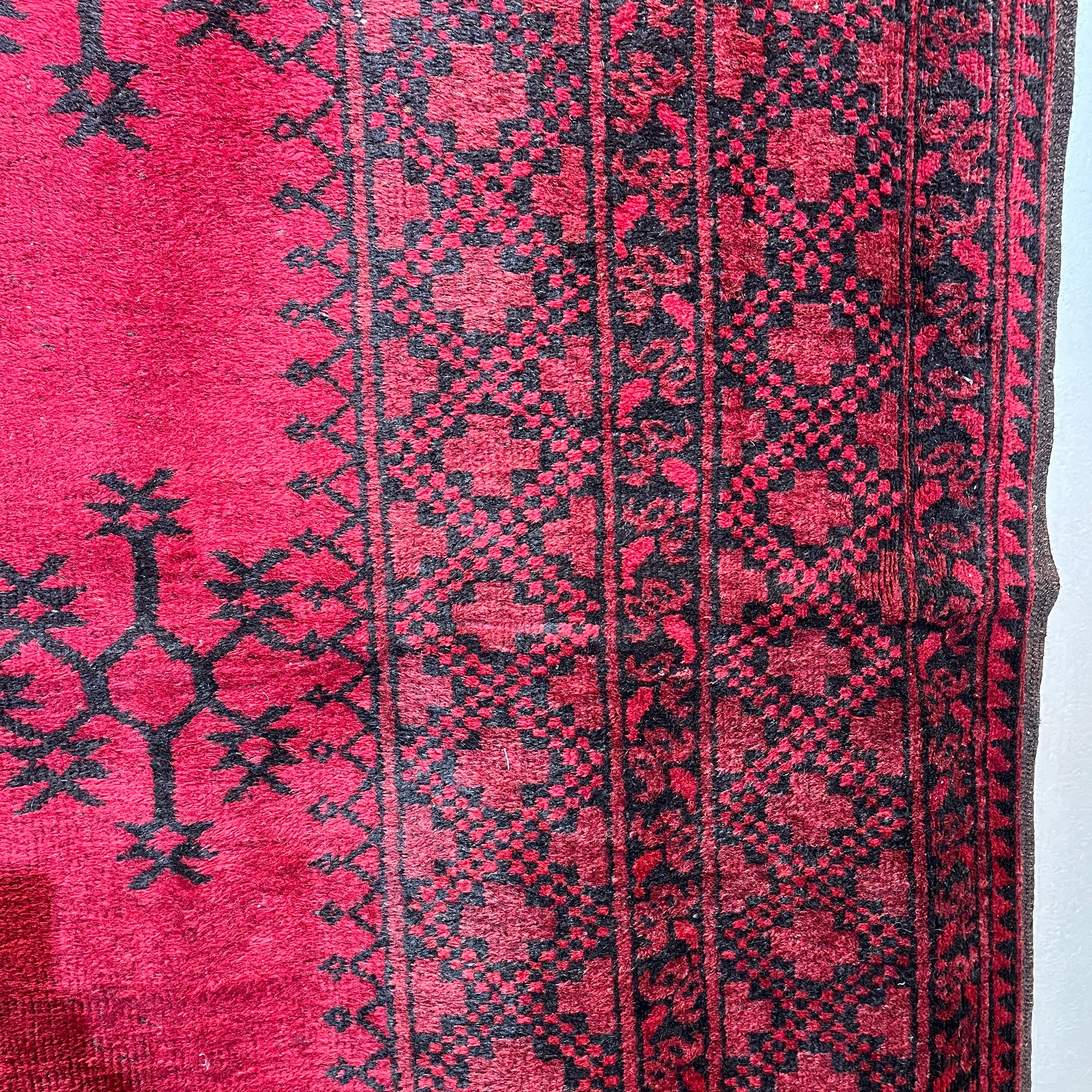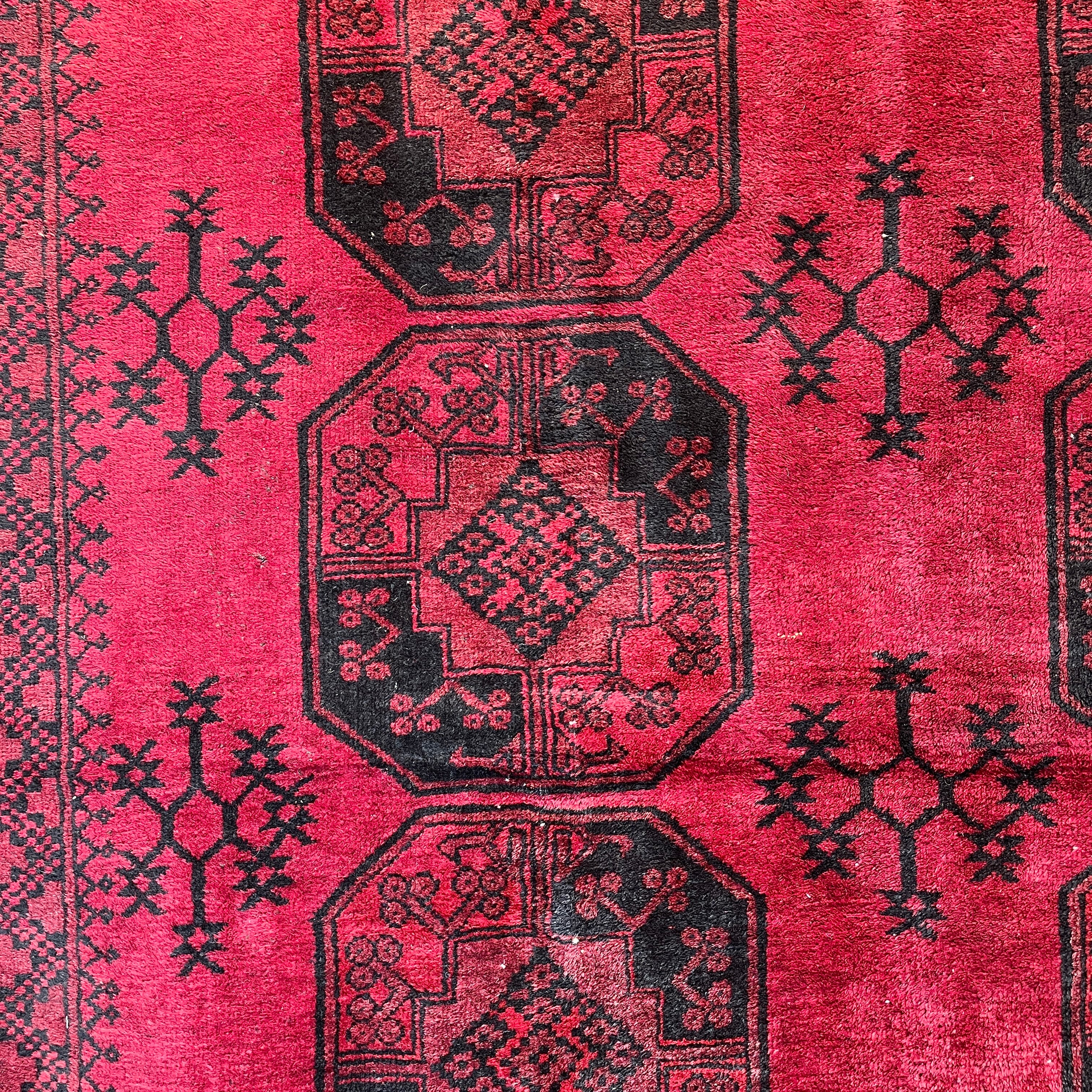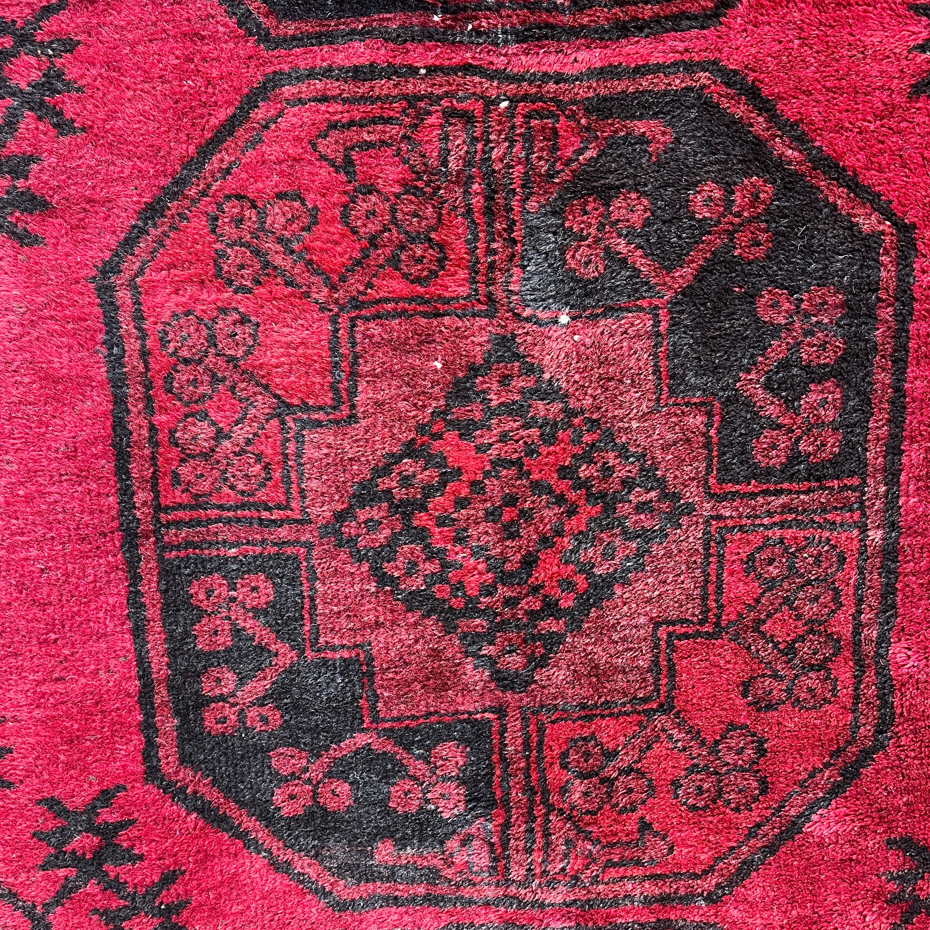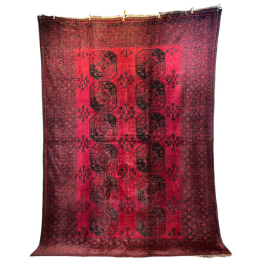 Gran alfombra persa, de origen afgano, hecha de lana tejida y teñida a mano. La alfombra tiene un llamativo diseño de doce medallones centrales y diseños geométricos, tanto en su jardín central como en sus cintillos exteriores, todo tejido en fibras negras, contrastando con el intenso rojo que predomina en la superficie.