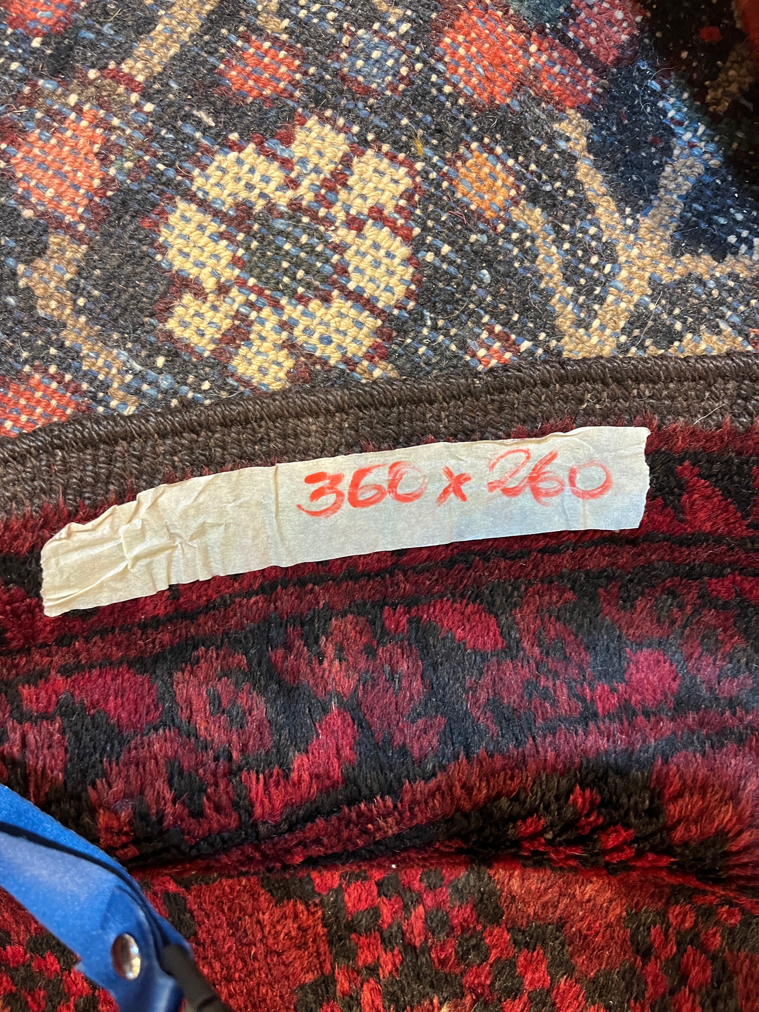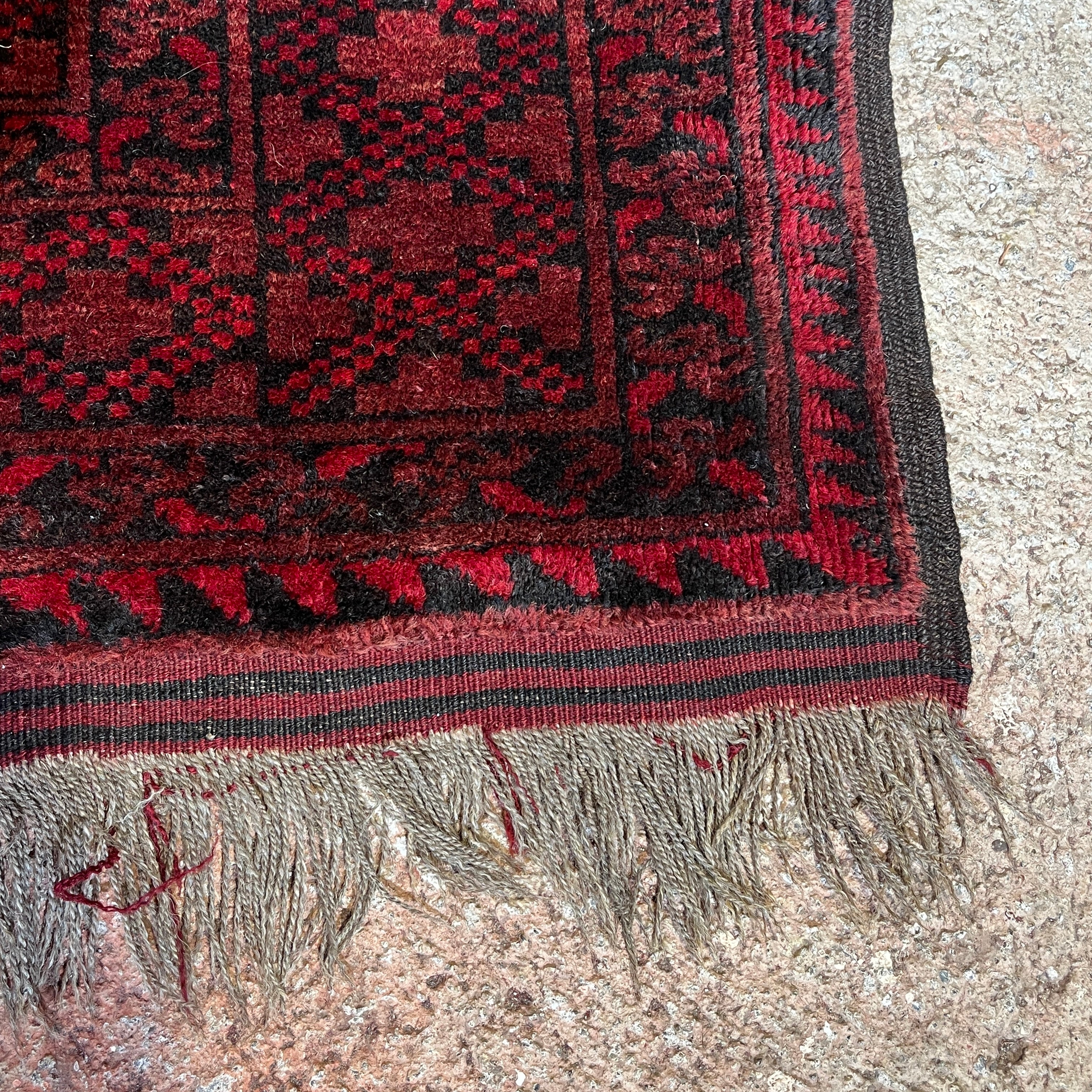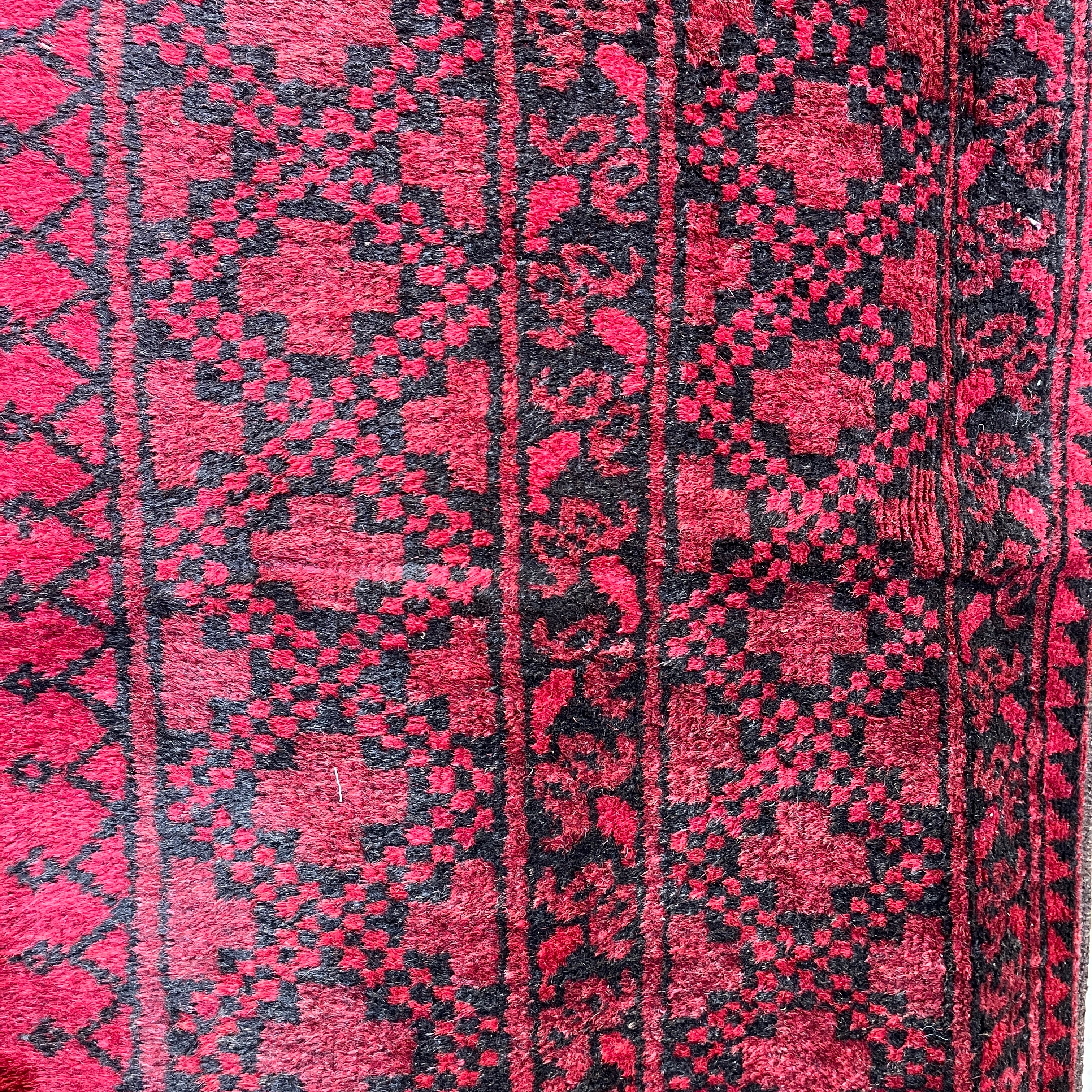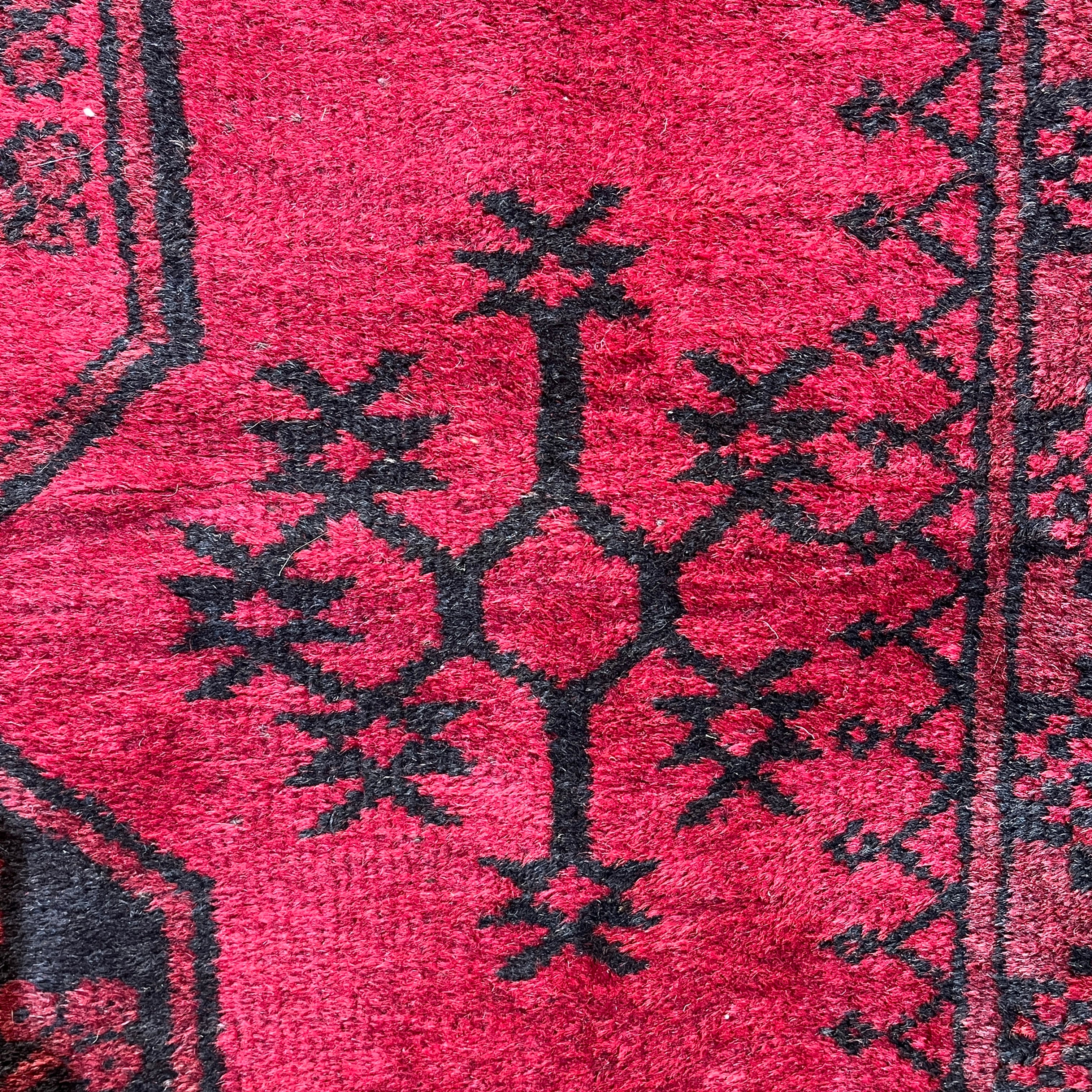 Gran alfombra persa, de origen afgano, hecha de lana tejida y teñida a mano. La alfombra tiene un llamativo diseño de doce medallones centrales y diseños geométricos, tanto en su jardín central como en sus cintillos exteriores, todo tejido en fibras negras, contrastando con el intenso rojo que predomina en la superficie.