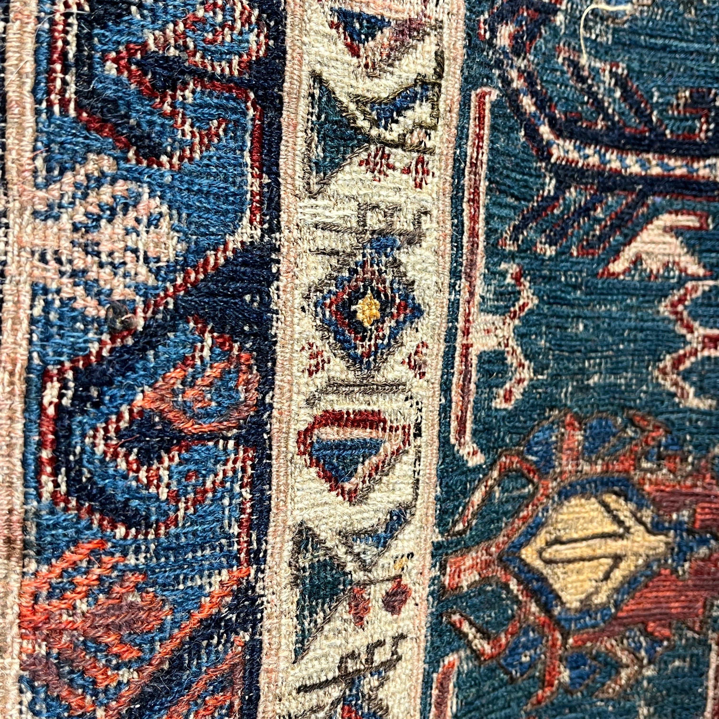 Antiquísima alfombra Kelim Sumak Kasak, hecha de lana tejida y teñida a mano con tintes de origen vegetal. Creadas originalmente por aldeanos en el oeste de Azerbaiyán, al norte de Armenia y al sur de Georgia, las alfombras Kazak surgieron a principios del siglo XVIII. Los mejores ejemplares de sumak también provienen del Cáucaso, el noroeste de Irán y Asia Central. Su diseño se distingue por su combinación de motivos geométricos, con cuatro medallones en forma de diamantes, octágonos con decorados abstractos, rosetas y rombos. La alfombra está teñida con detalles en azul, verde y amarillos pálidos, sobre un fondo rojo. Sus cenefas tienen patrones geométricos, principalmente en azul e índigo.