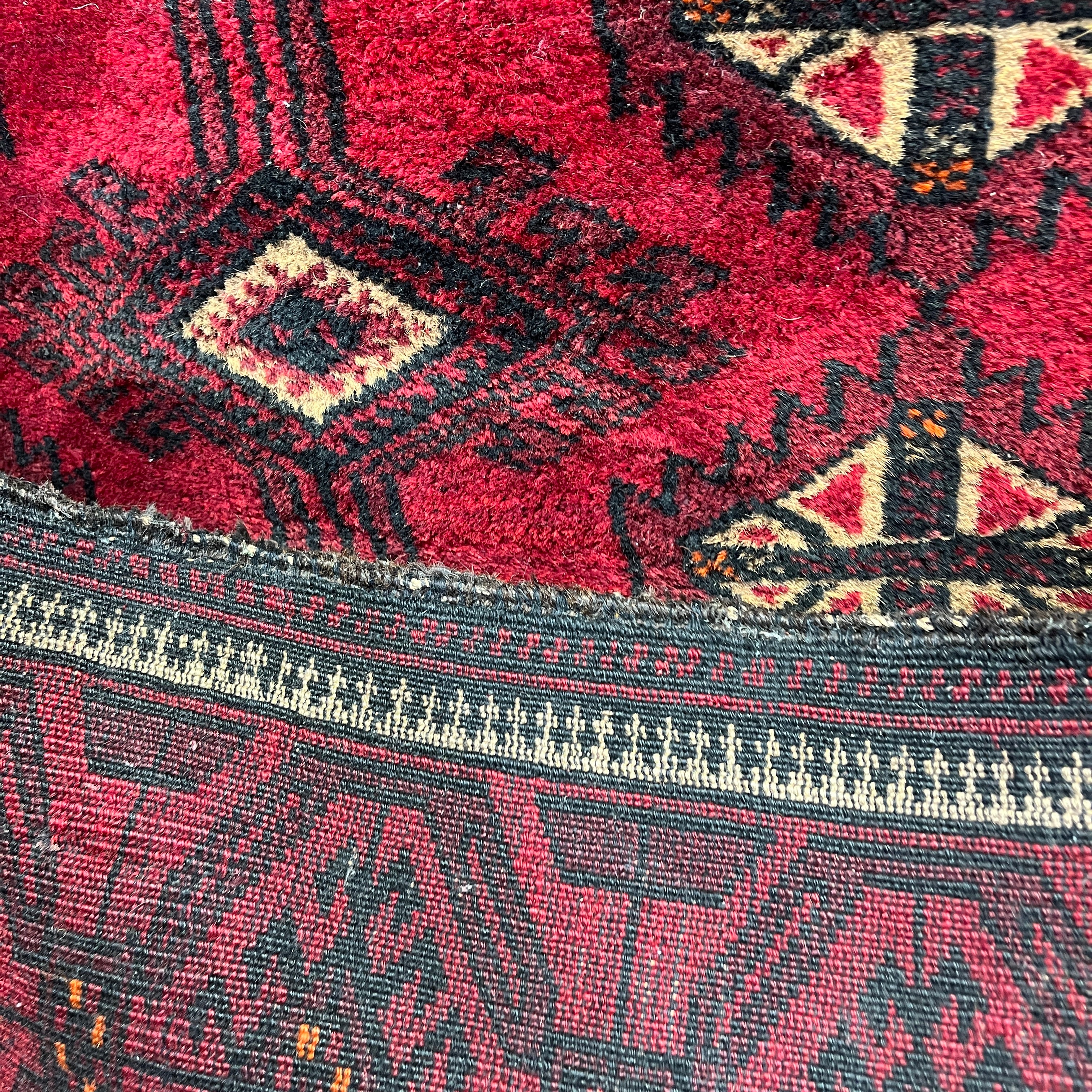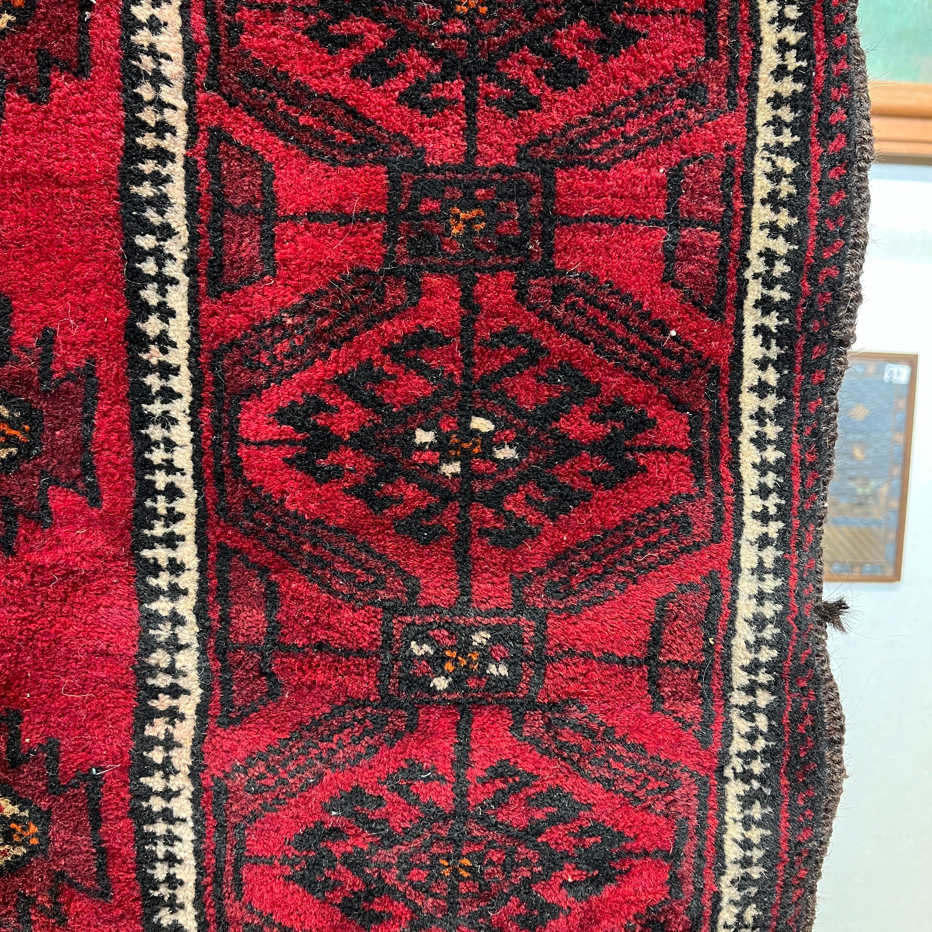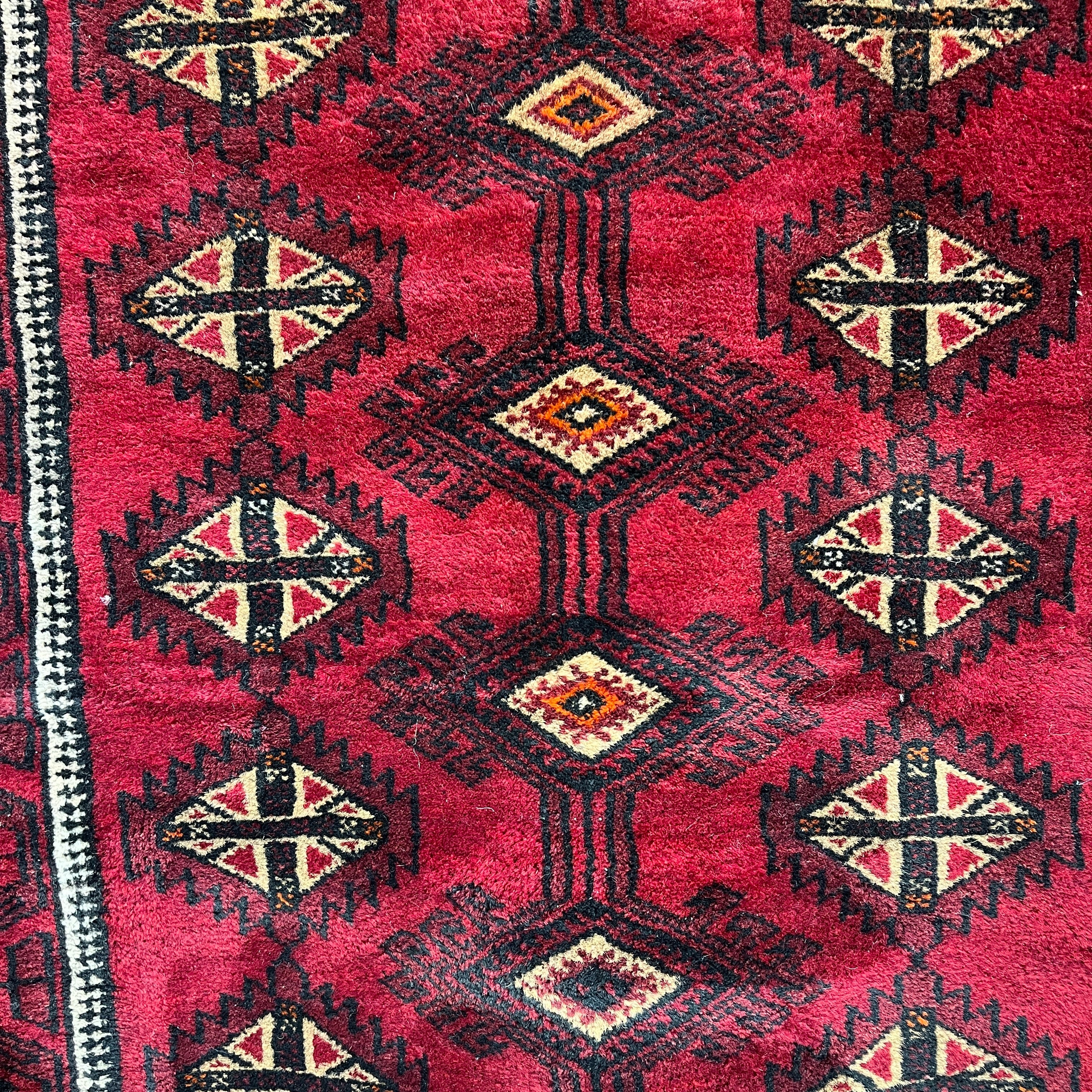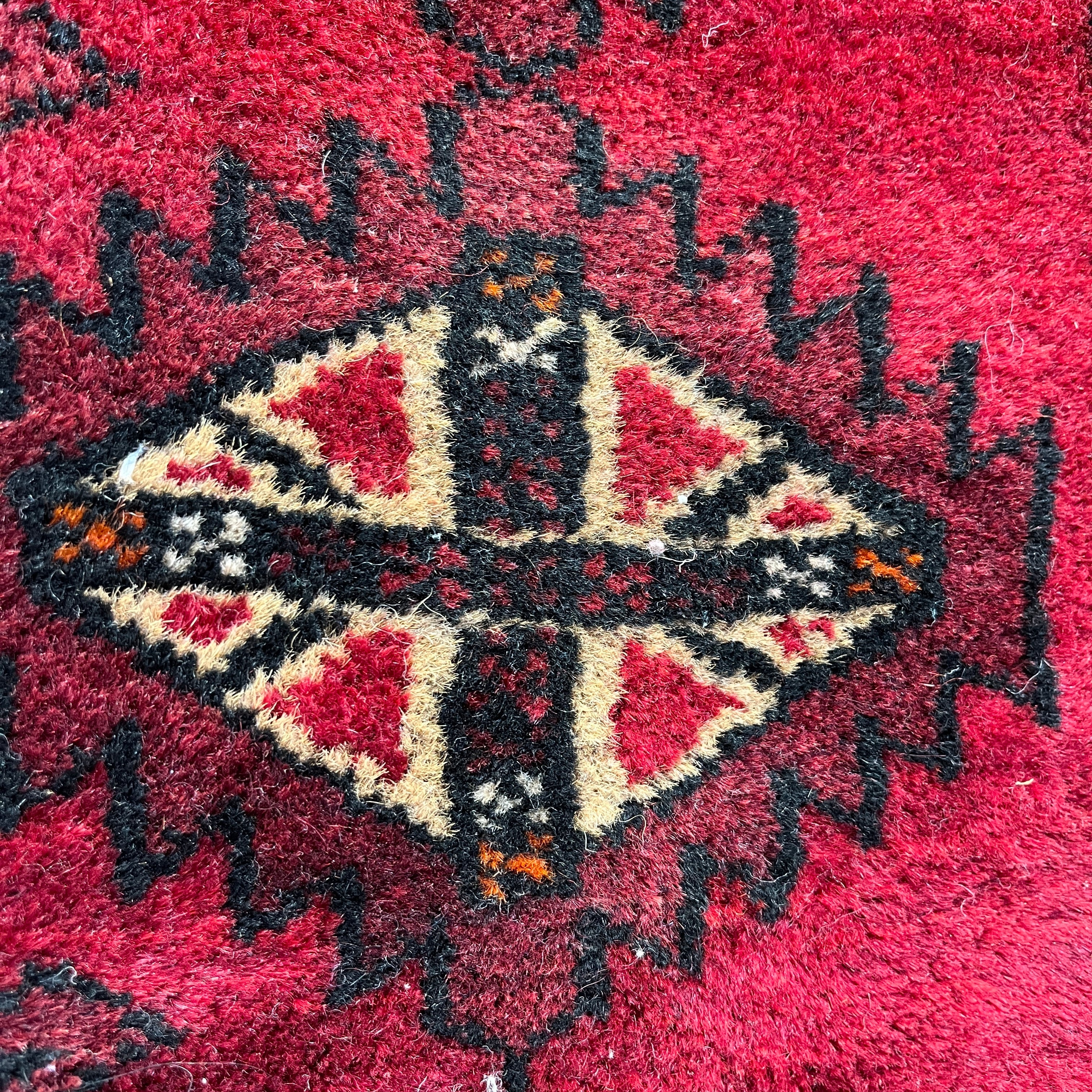 Bella alfombra, de origen pakistaní Buckhara. El nombre proviene de la antigua ciudad de Bujará en Uzbekistán, que era un centro cultural y comercial en la Ruta de la Seda. Las alfombras originales estaban vinculadas a los turcomanos que habitaban la región. Hoy en día esta tradición de alfombras se mantiene en Pakistán y Afganistán, manteniendo el trabajo artesanal del tejido a mano y el teñido con tintes vegetales. Esta pieza presenta un diseño distintivo con motivos repetitivos, a menudo llamados "pata de elefante", en una disposición geométrica. Predomina el rojo, blanco y negro.