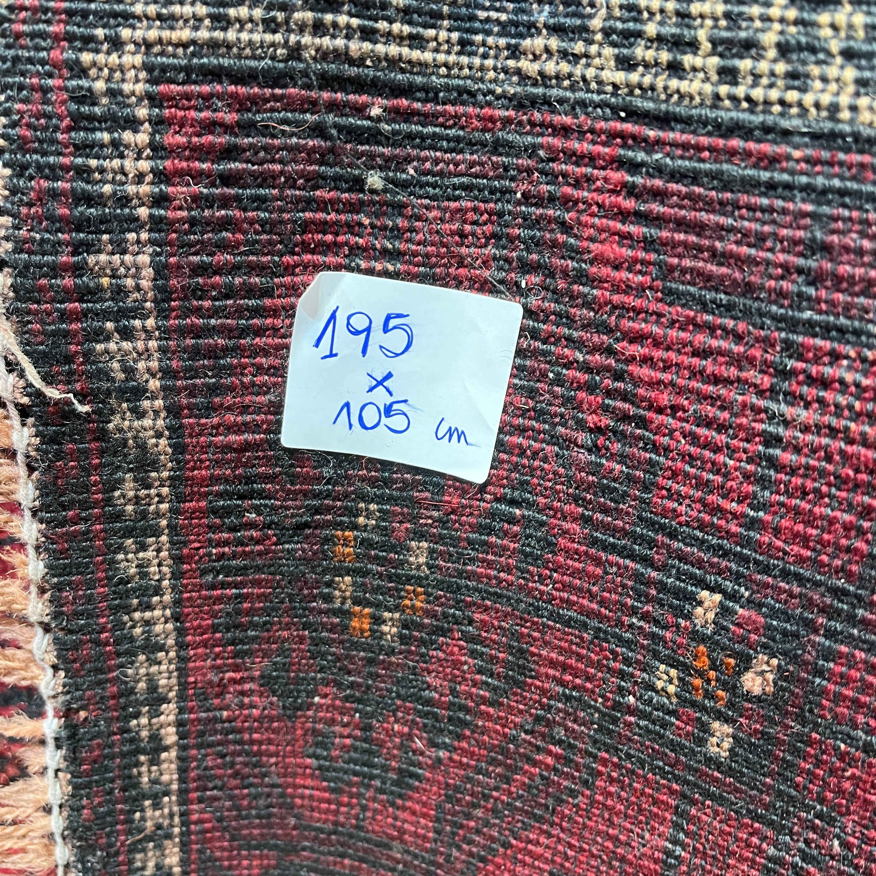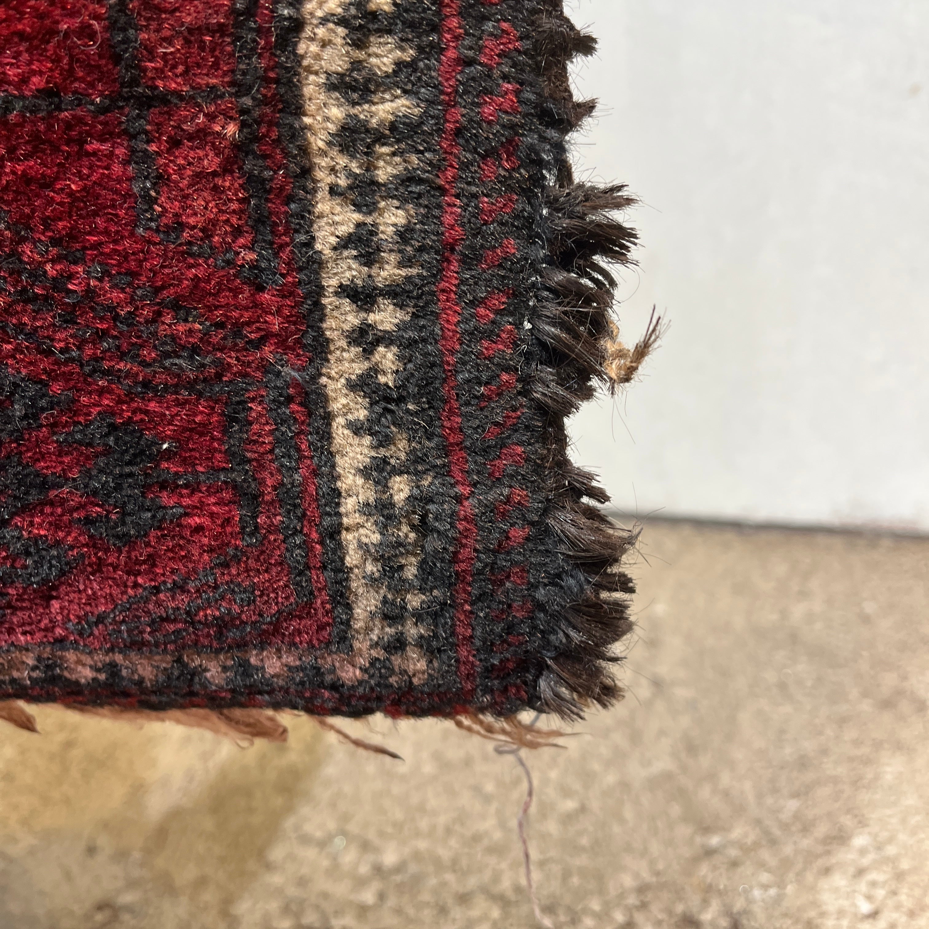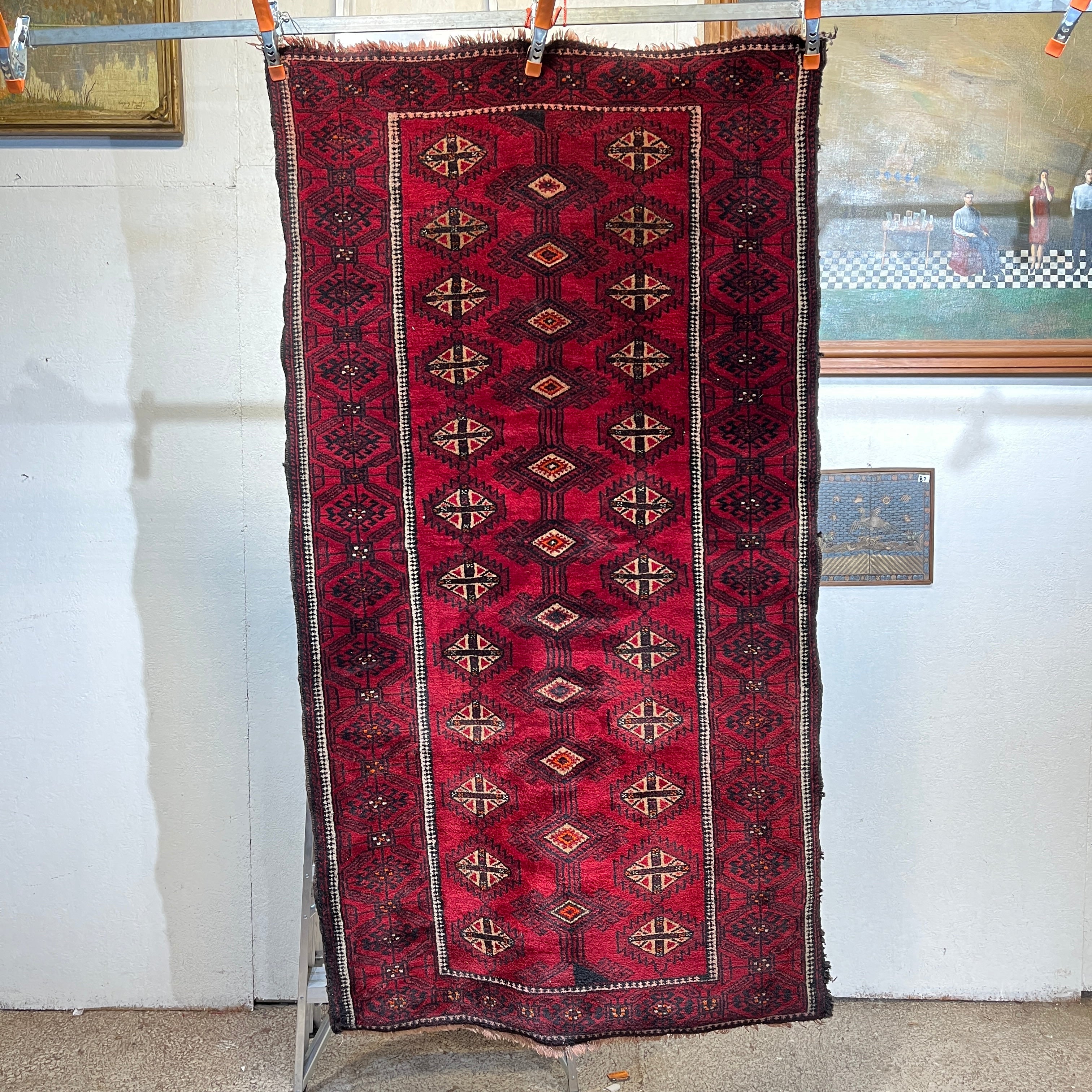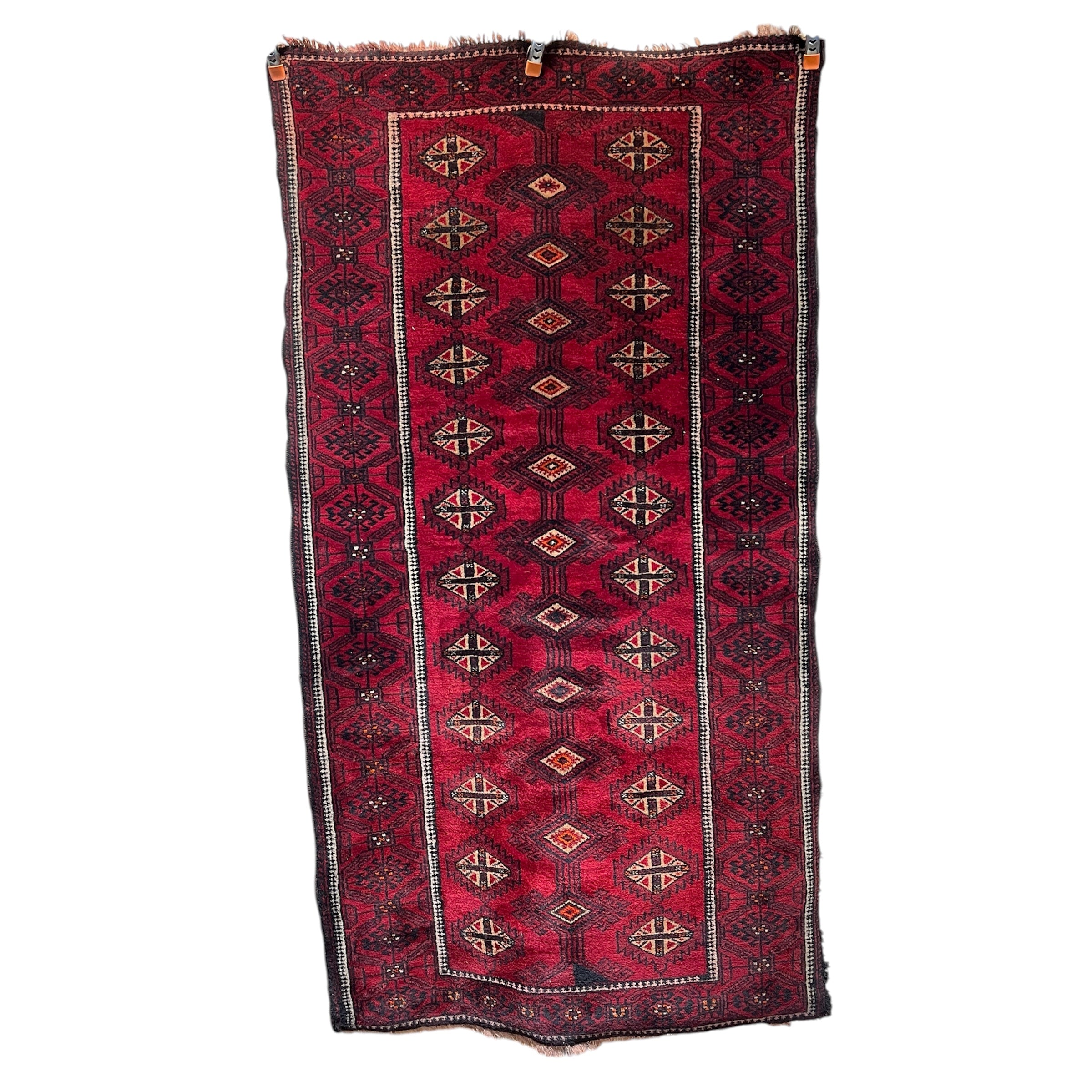 Bella alfombra, de origen pakistaní Buckhara. El nombre proviene de la antigua ciudad de Bujará en Uzbekistán, que era un centro cultural y comercial en la Ruta de la Seda. Las alfombras originales estaban vinculadas a los turcomanos que habitaban la región. Hoy en día esta tradición de alfombras se mantiene en Pakistán y Afganistán, manteniendo el trabajo artesanal del tejido a mano y el teñido con tintes vegetales. Esta pieza presenta un diseño distintivo con motivos repetitivos, a menudo llamados "pata de elefante", en una disposición geométrica. Predomina el rojo, blanco y negro.