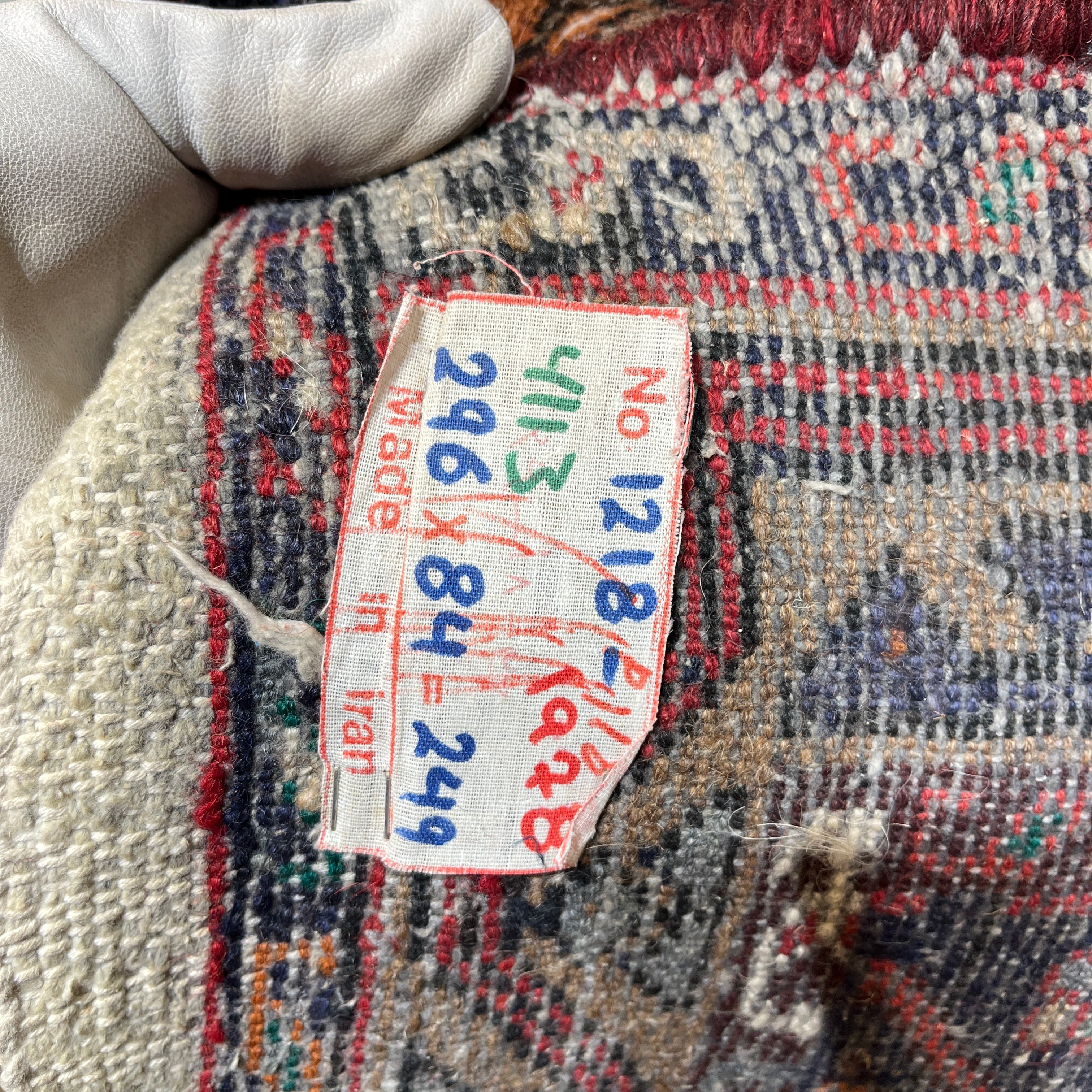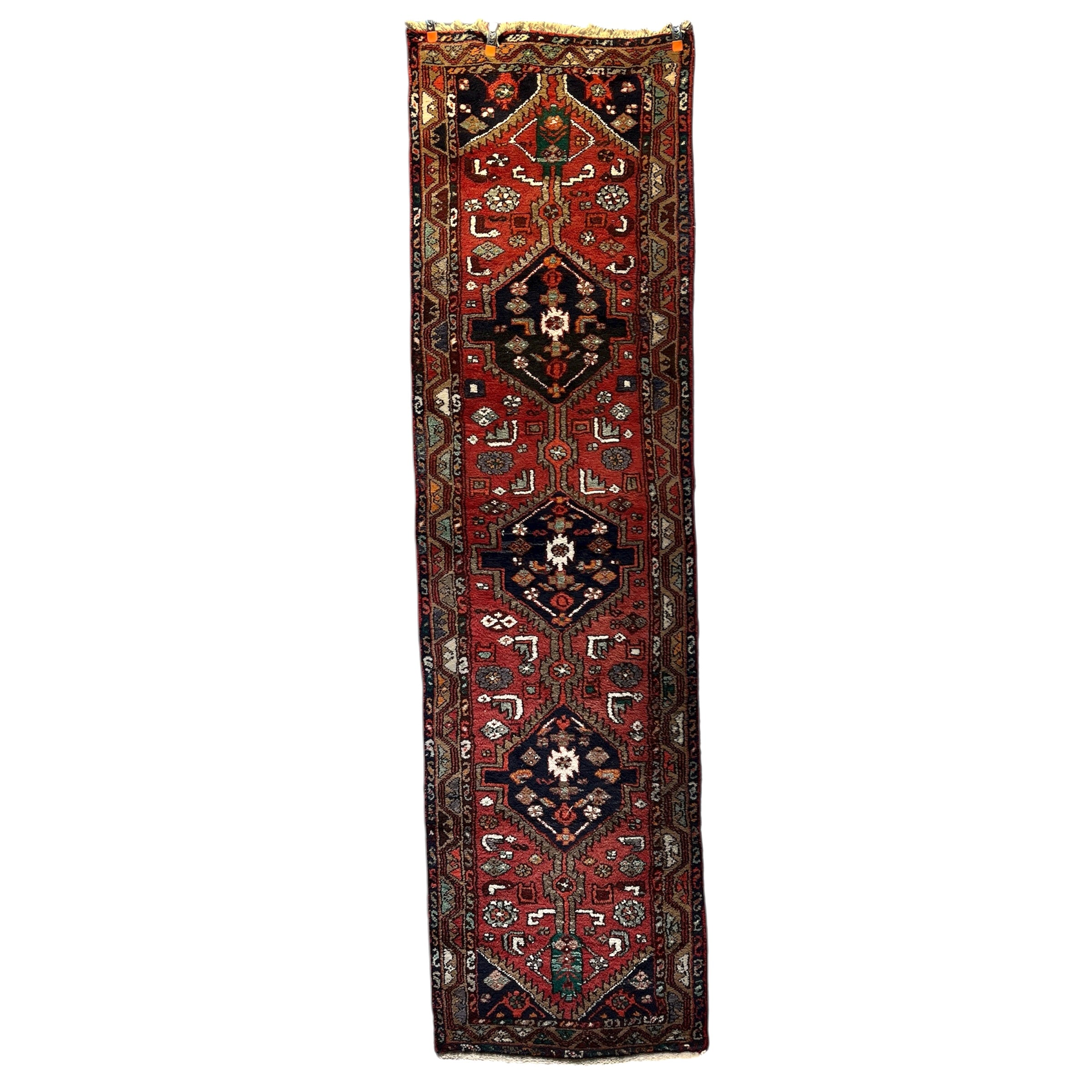 Preciosa alfombra pasillo de origen Iraní, hecha de lana anudada a mano, con diseños tribales. Esta pieza, en tonos rojos y azules, con detalles en blanco y amarillo, tiene un intrincado diseño geométrico que juega con la repetición de motivos, haciendo que se genere una trenza de medallones y decoraciones en su zona central. Esta pieza mezcla tanto figuras geométricas como motivos florales en su zona interior, mientras que sus cenefas, e las que el amarillo está más presente, hacen contrapunto al rojo y enmarcan el tejido.