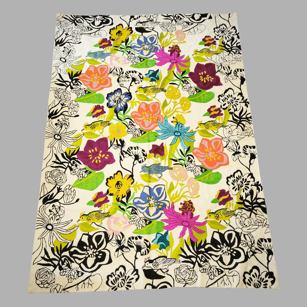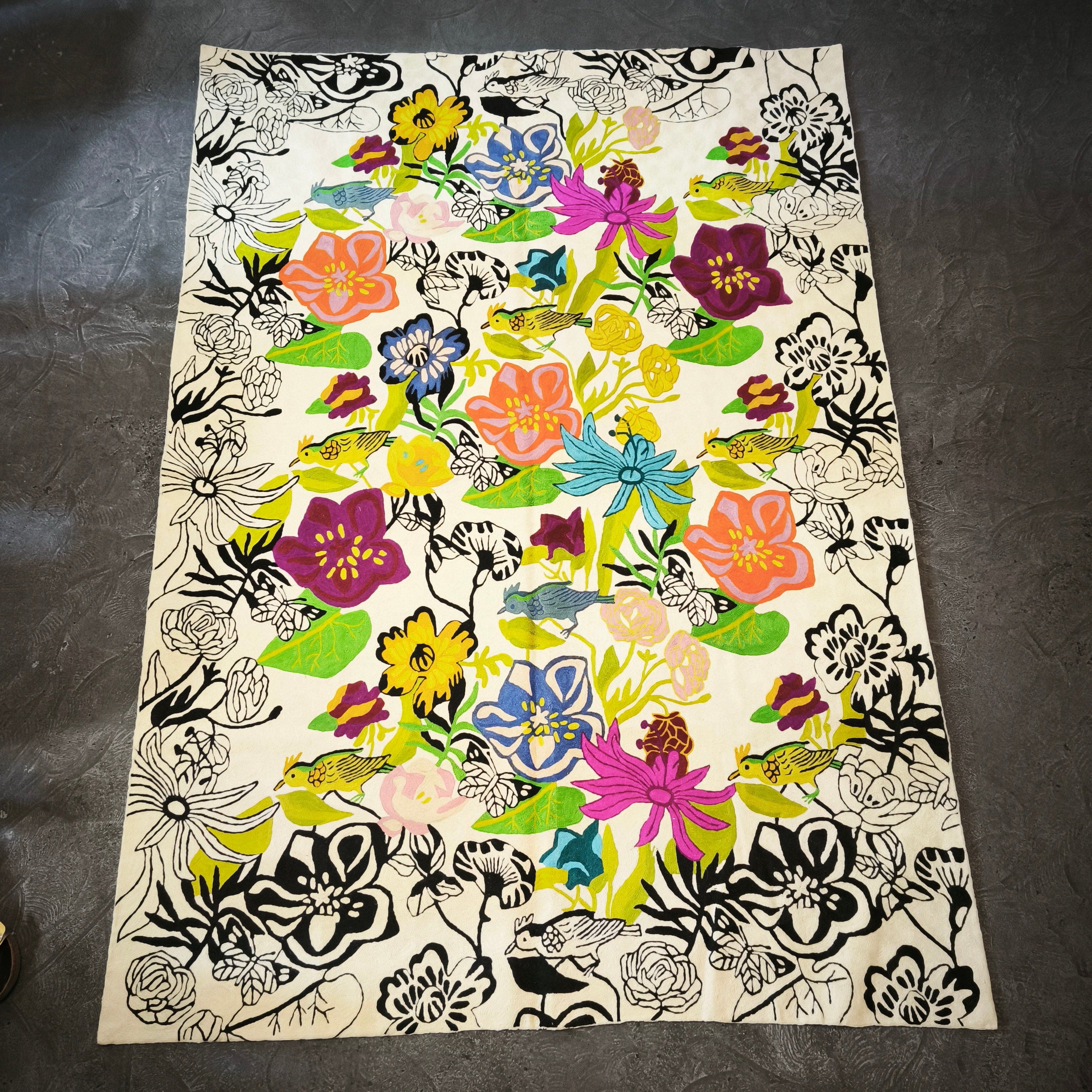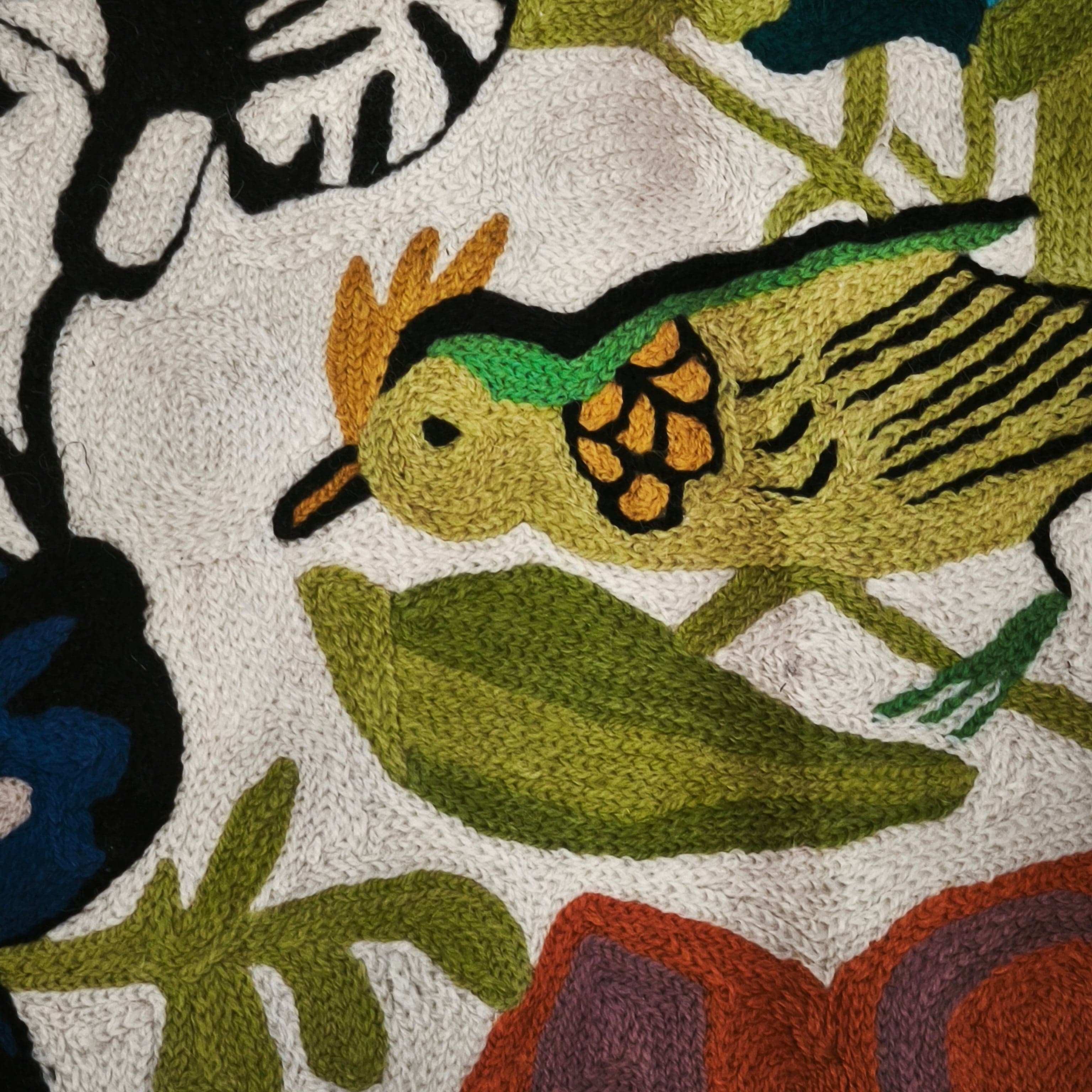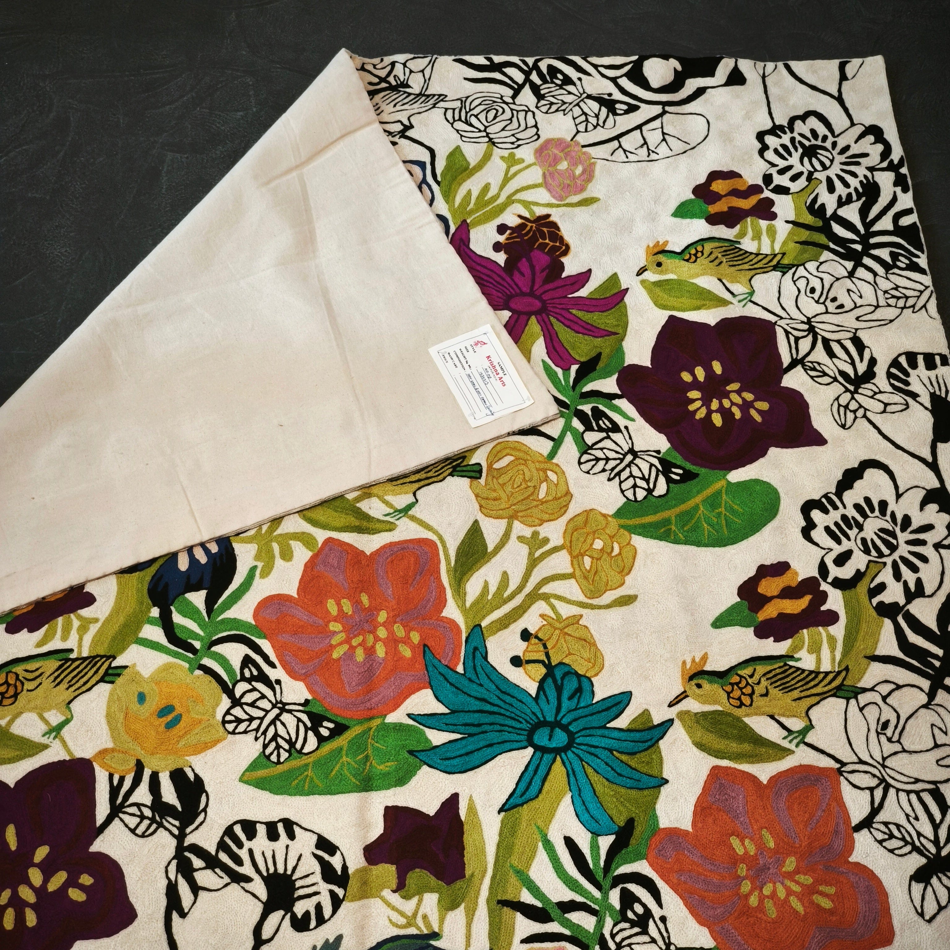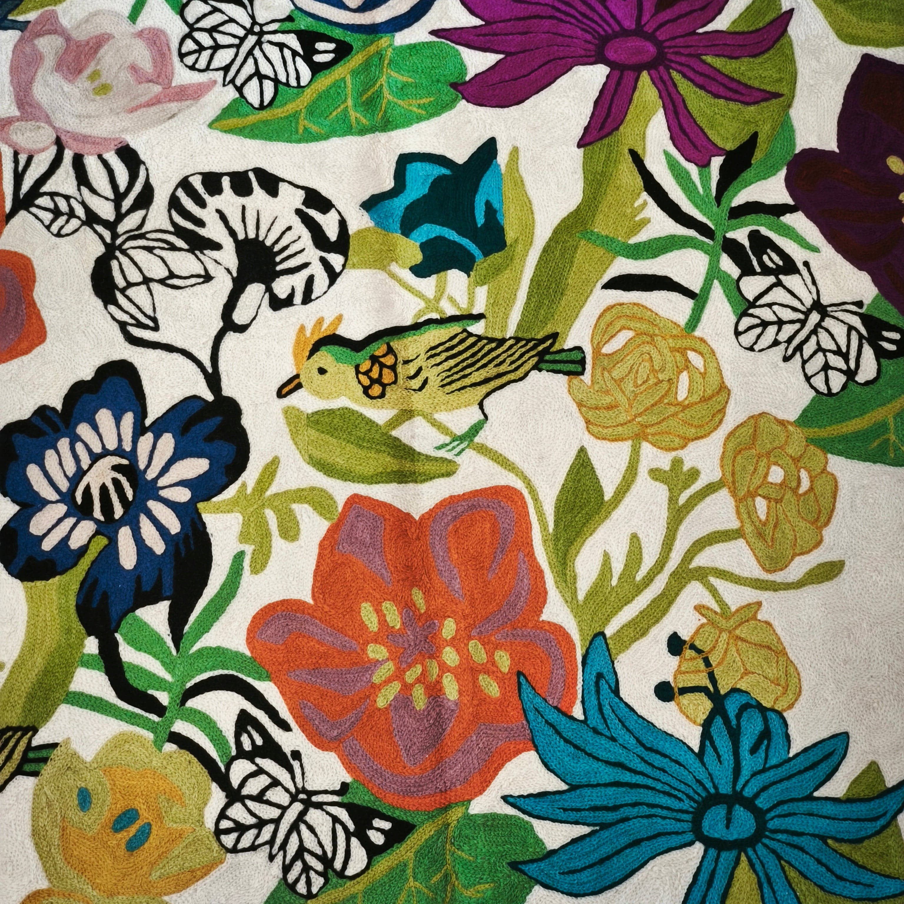 Bellísima tapicería de cachemira bordada a mano con llamativos diseños florales y de pajaritos. La pieza tiene un patrón que mezcla el bordado en blanco y negro, con bordados en colores vibrantes, generando un contraste muy interesante.