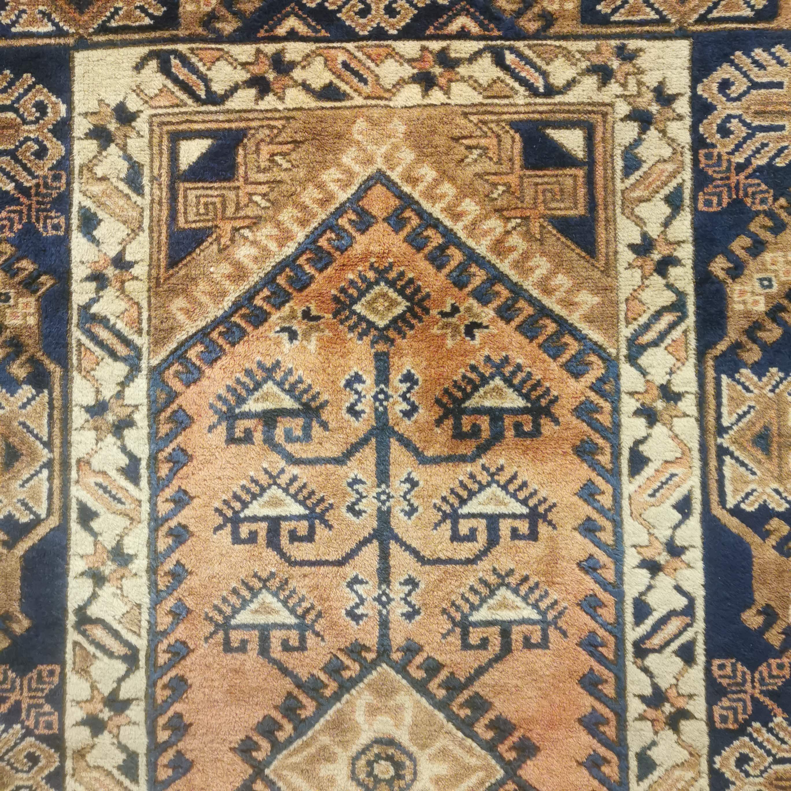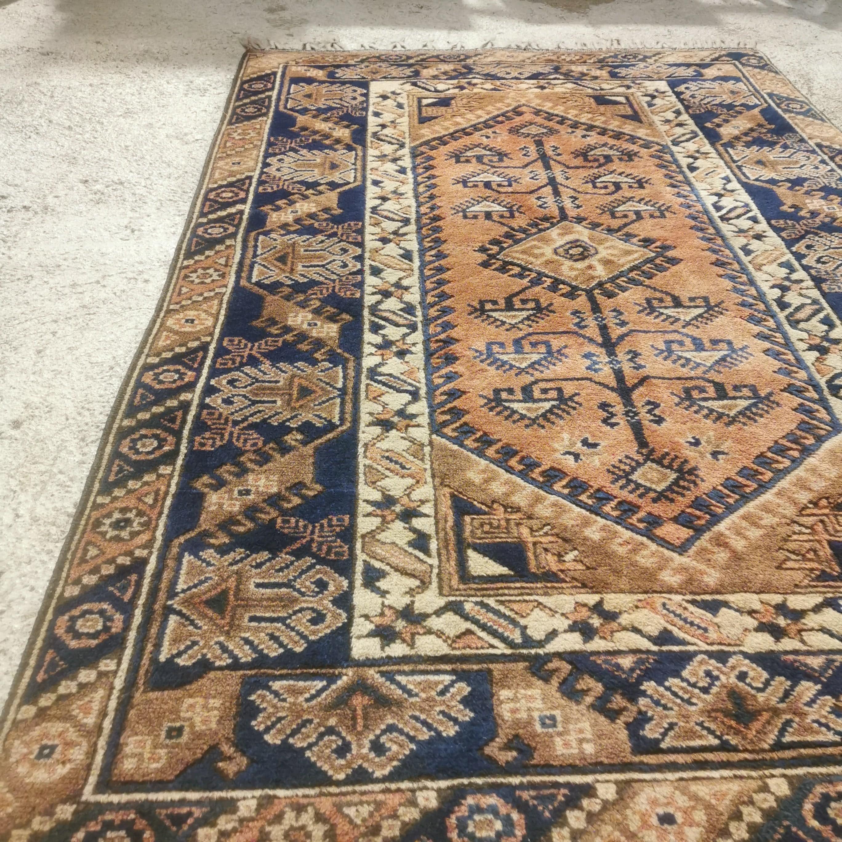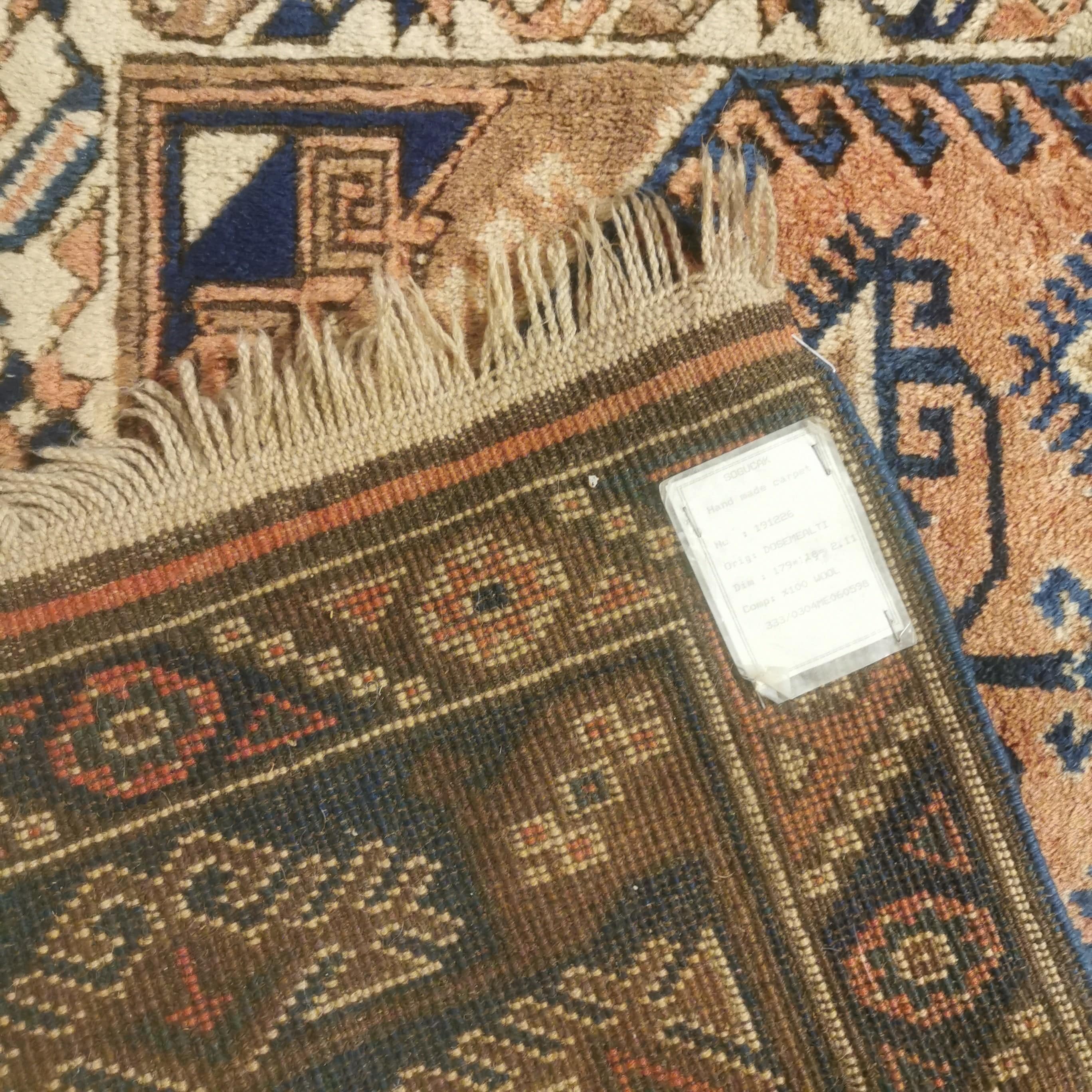Preciosa Alfombra Turca Dosemealti hecha completamente de lana. Estas alfombras son conocidas por ser de lana anudadas a mano por las tribu seminómadas Yoruk. Se caracterizan por sus figuras geométricas y símbolos propios de estas tribus.