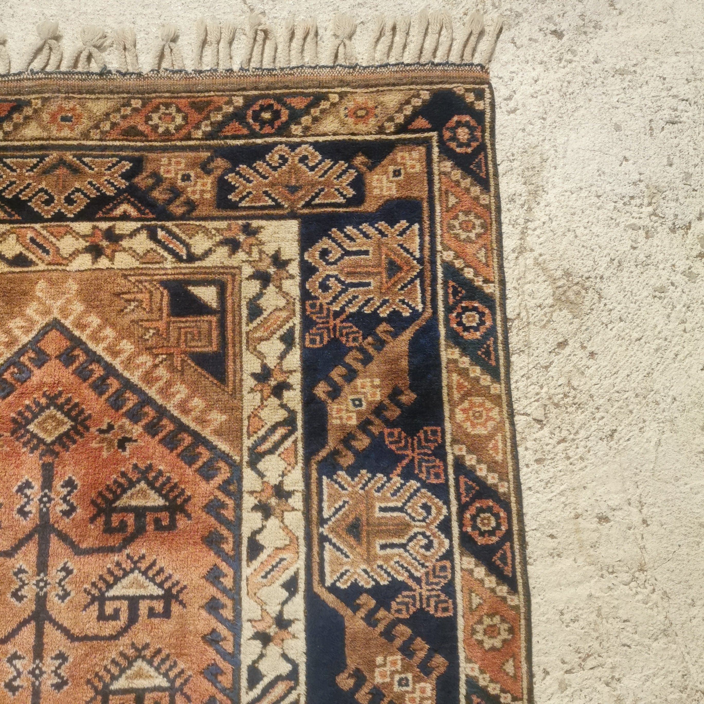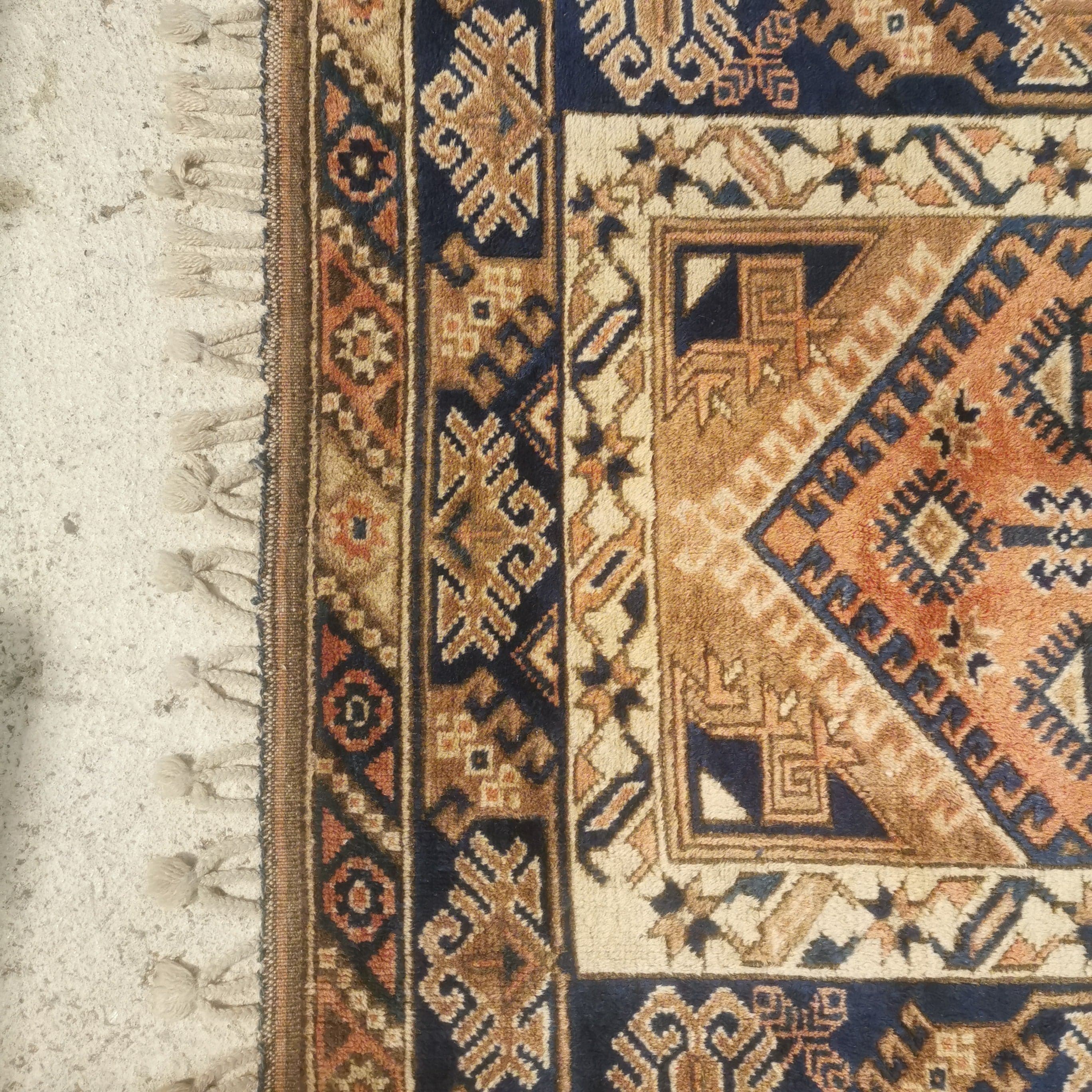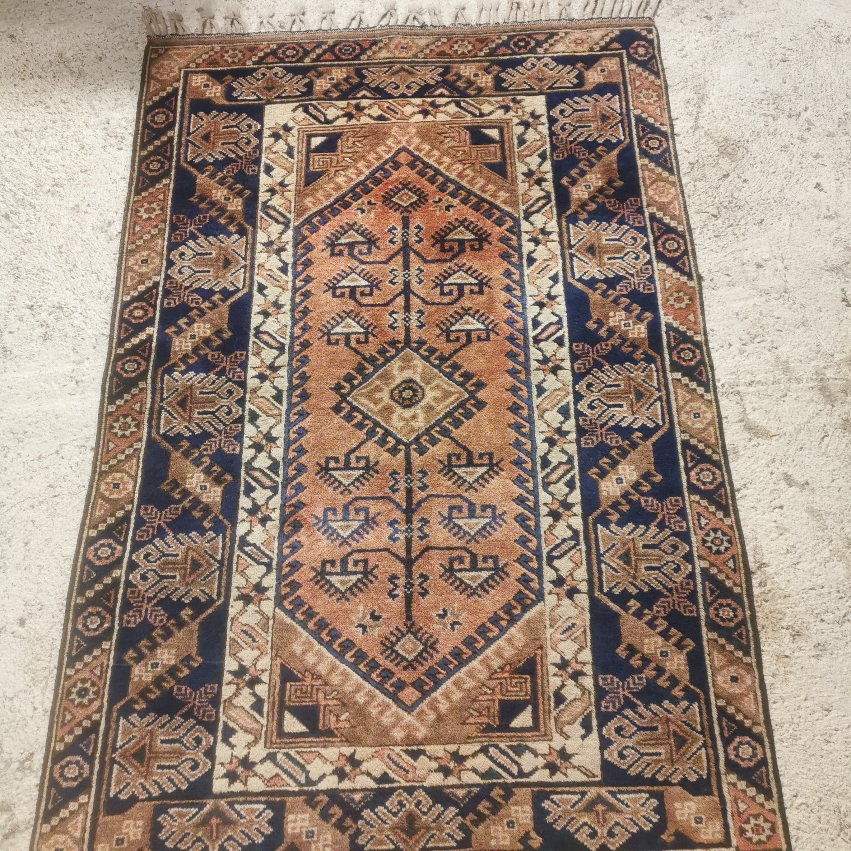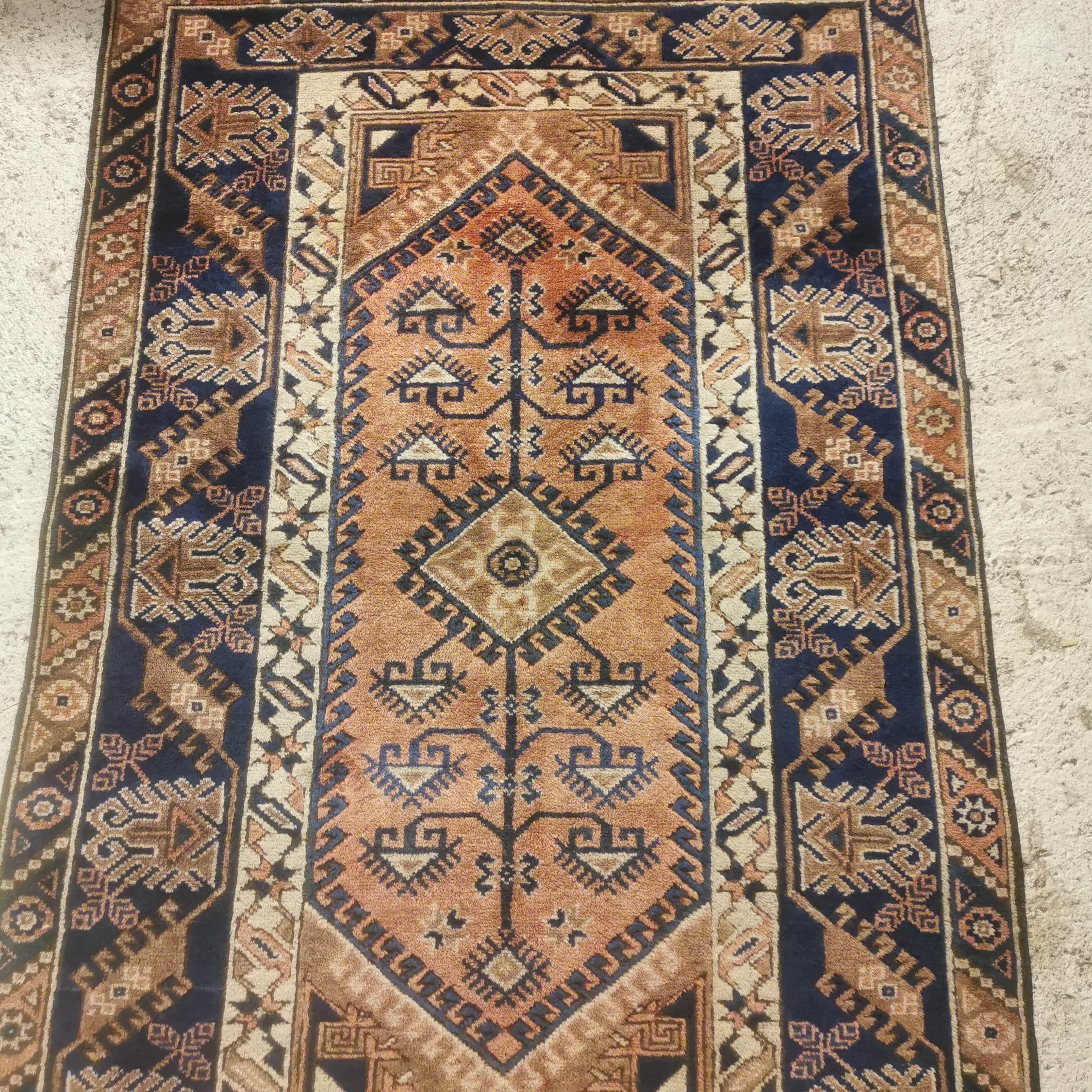 Preciosa Alfombra Turca Dosemealti hecha completamente de lana. Estas alfombras son conocidas por ser de lana anudadas a mano por las tribu seminómadas Yoruk. Se caracterizan por sus figuras geométricas y símbolos propios de estas tribus.