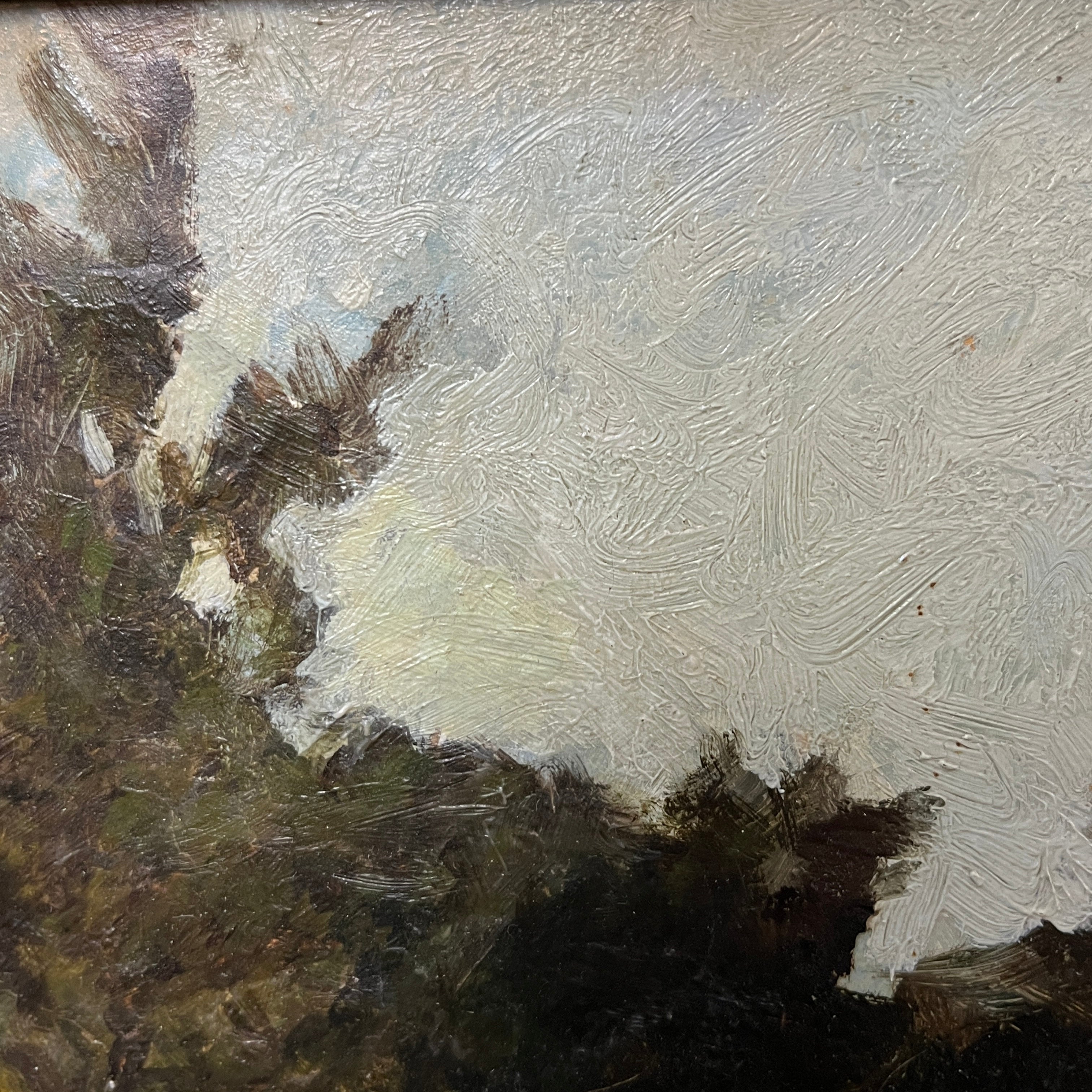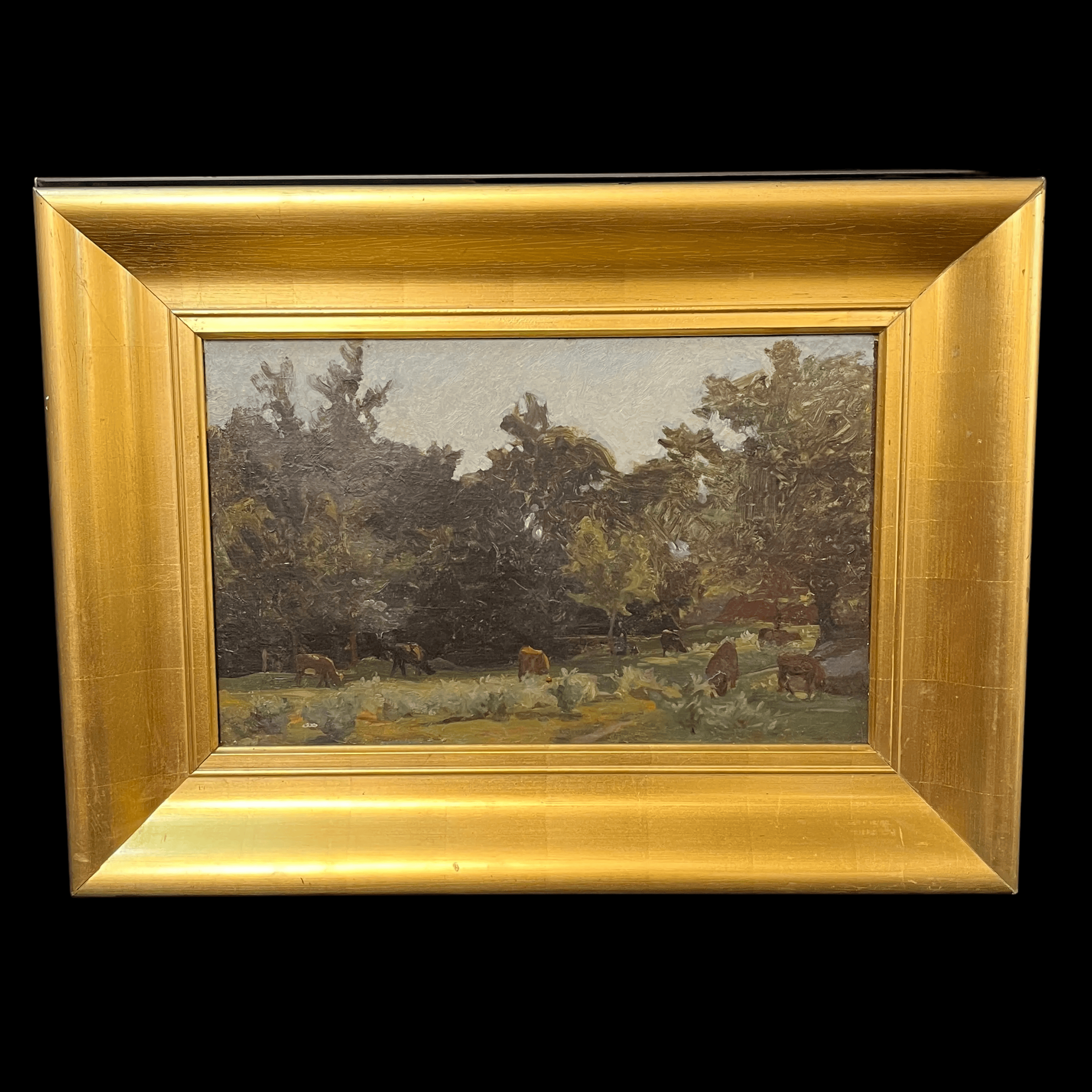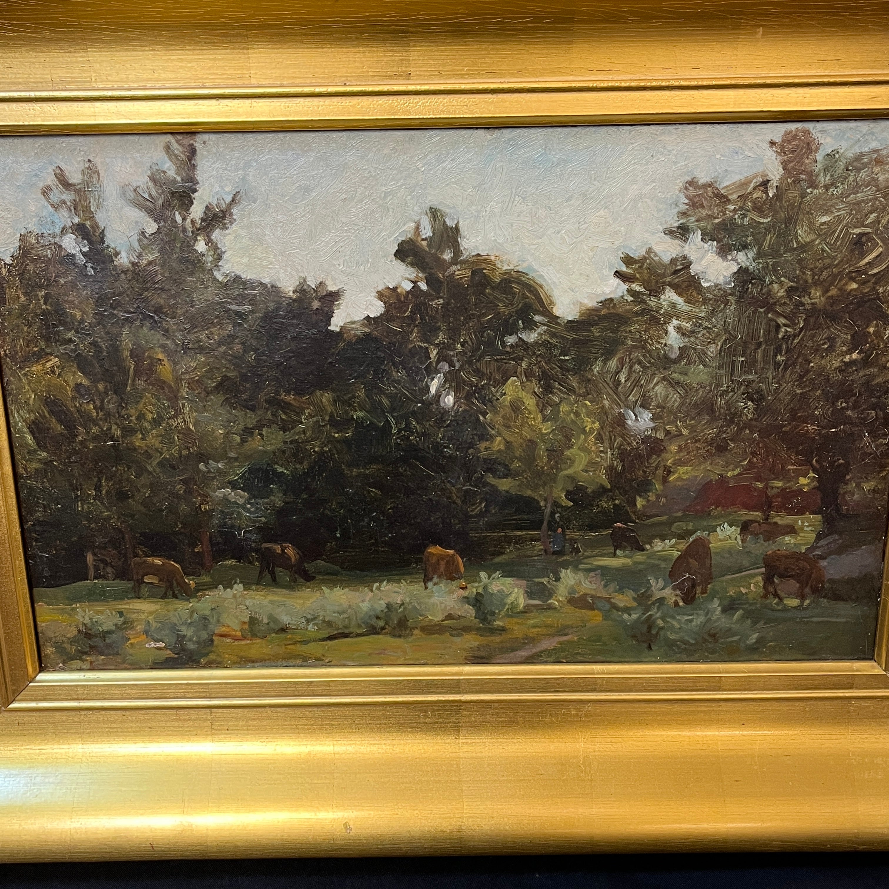 Óleo sobre tela anónimo, de posible origen europeo, representando un paisaje en el que un rebaño de vacas están pastando, en medio del claro de un bosque. Entre ellas se puede ver a su pastor acompañándolas a los lejos. Se trata de una obra de fuerte carga atmosférica, que utiliza la materia y los trazos expresivos para capturar las texturas del bosque, más que buscar una representación realista. La obra tiene un marco de madera dorada, que le entrega mucha luz a la obra.