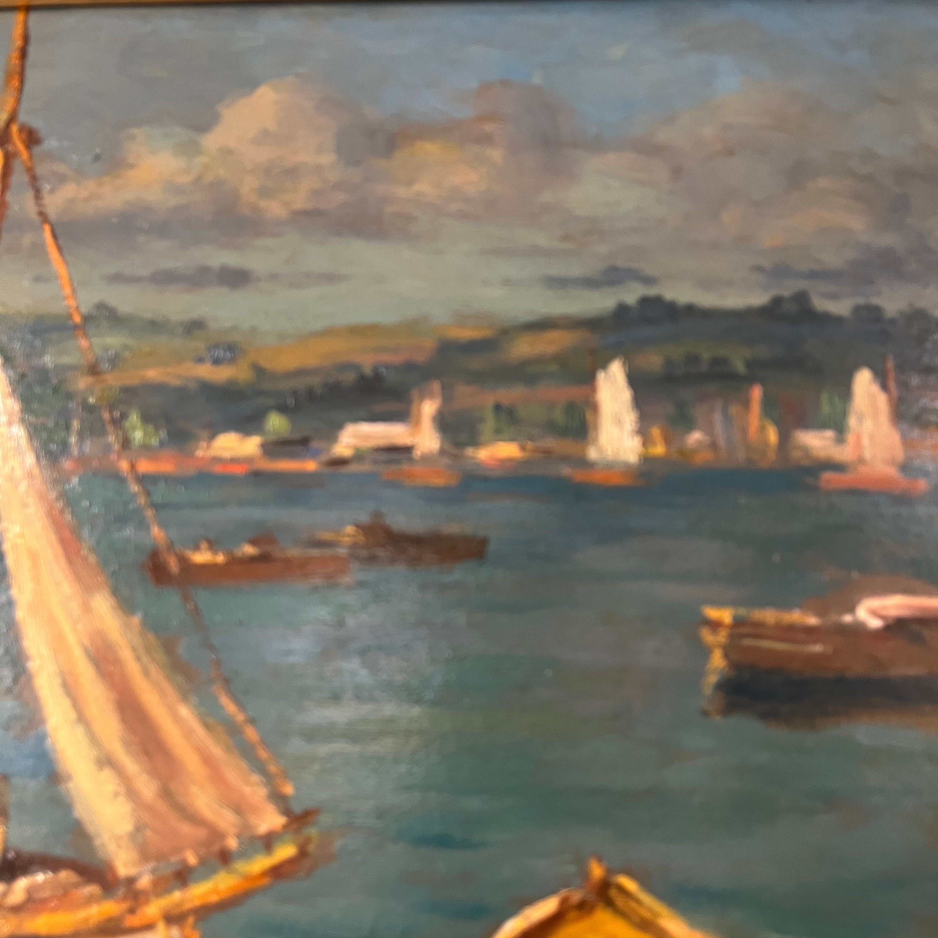 Hermoso óleo del talentoso pintor chileno Pacheco Altamirano (1905-1978) nos presenta tres veleros y dos botes aparcados en el mar, algunos con tripulantes y otros vacíos. En el horizonte se aprecia una ciudad. La obra destaca por sus colores y el característico trazo marcado de Altamirano.