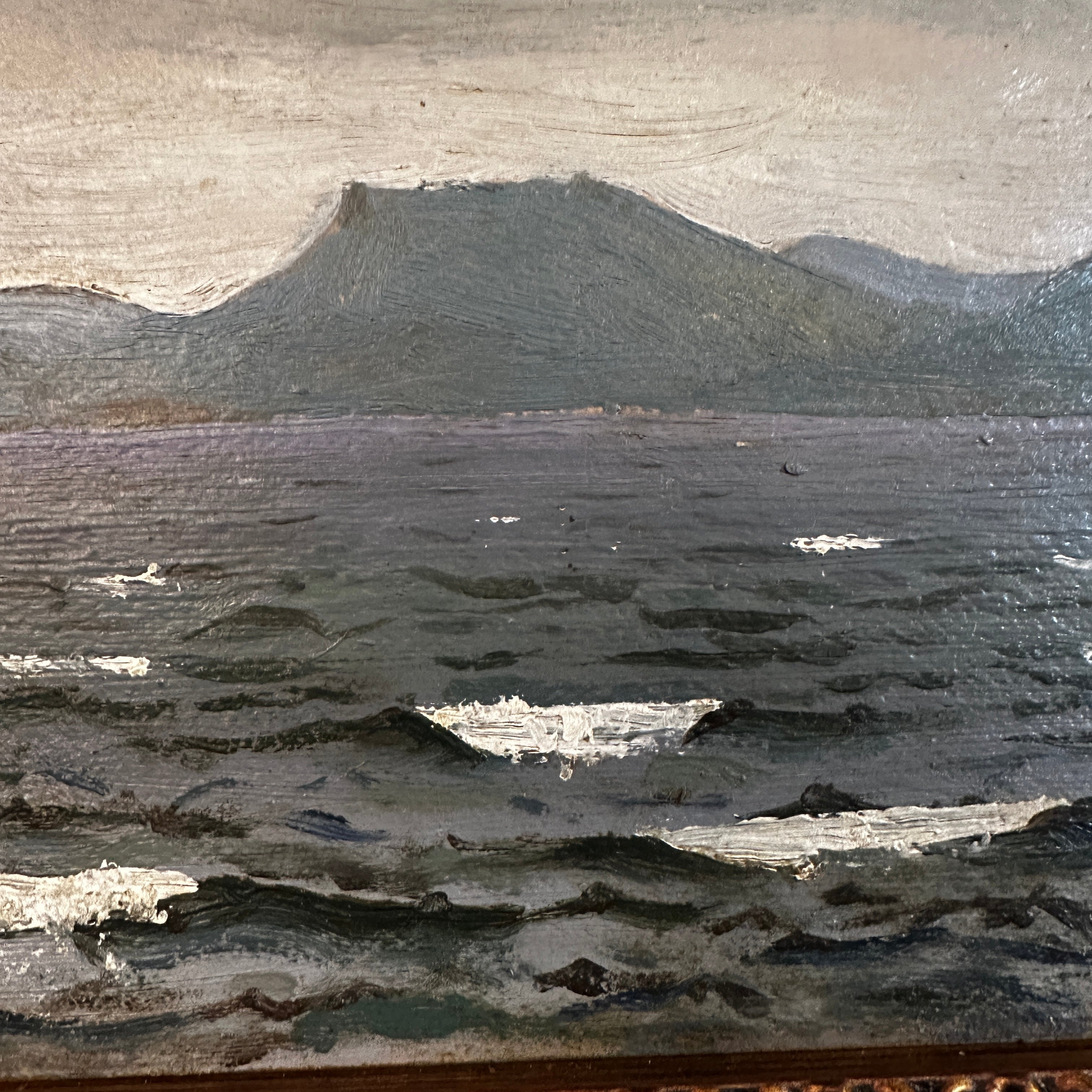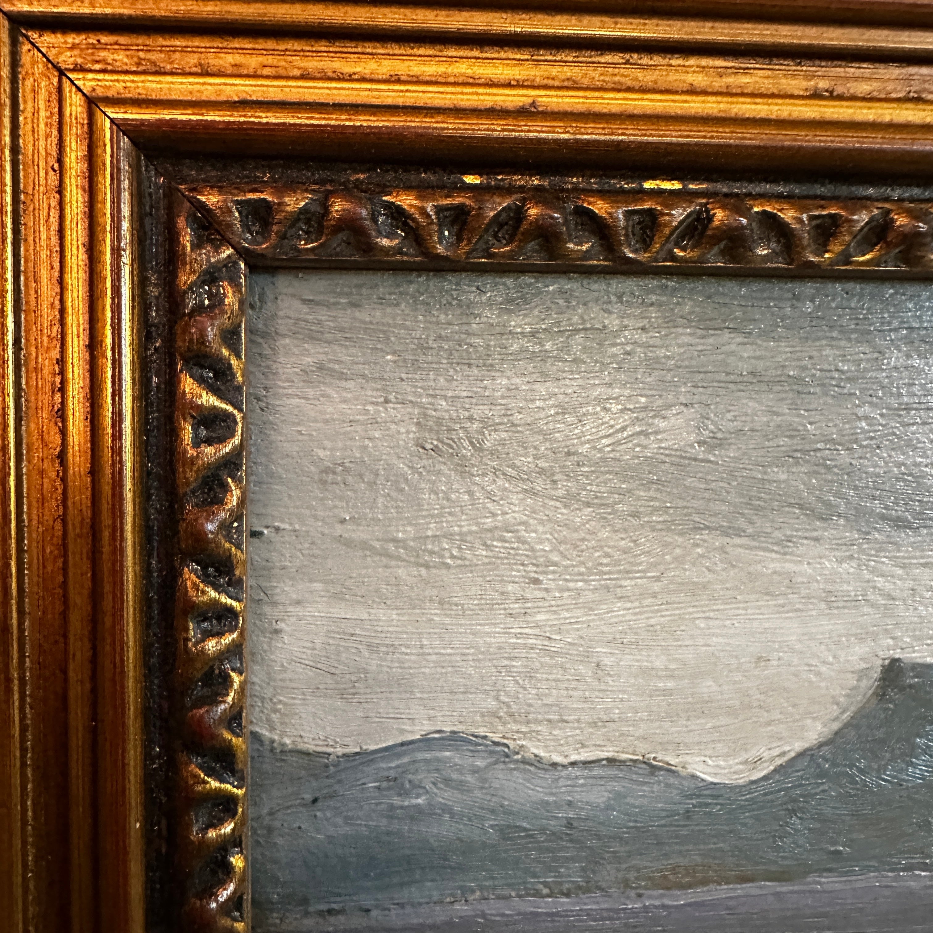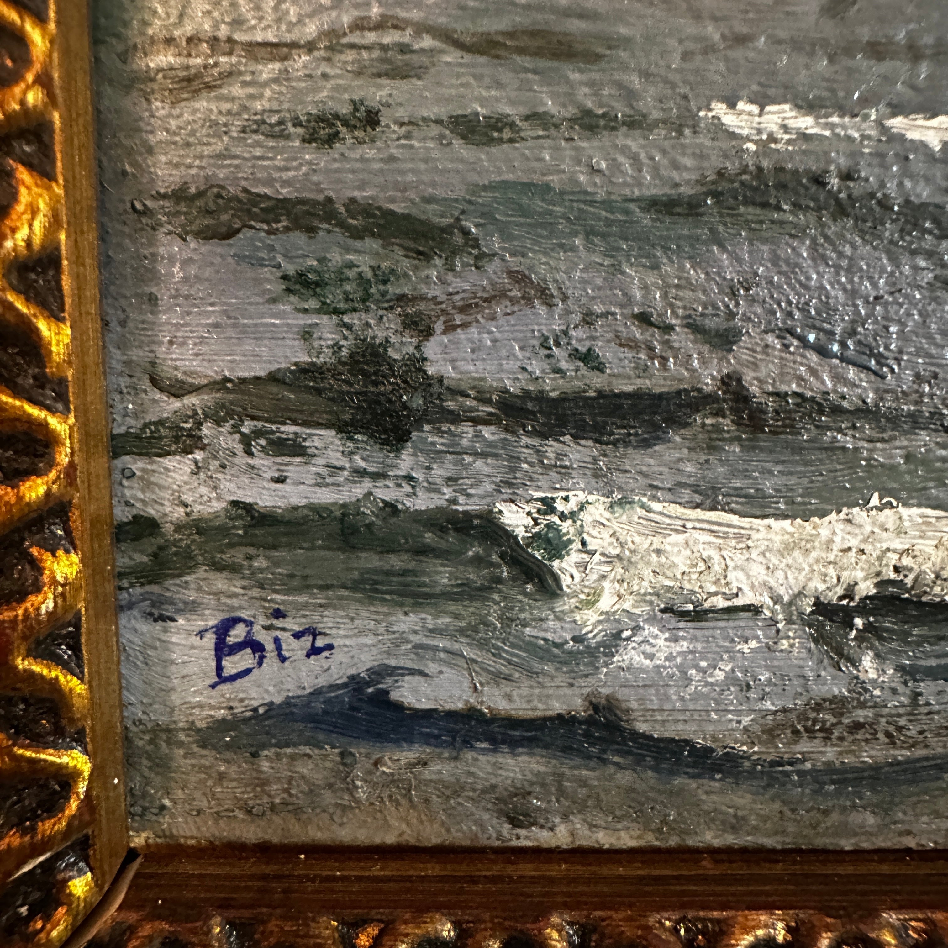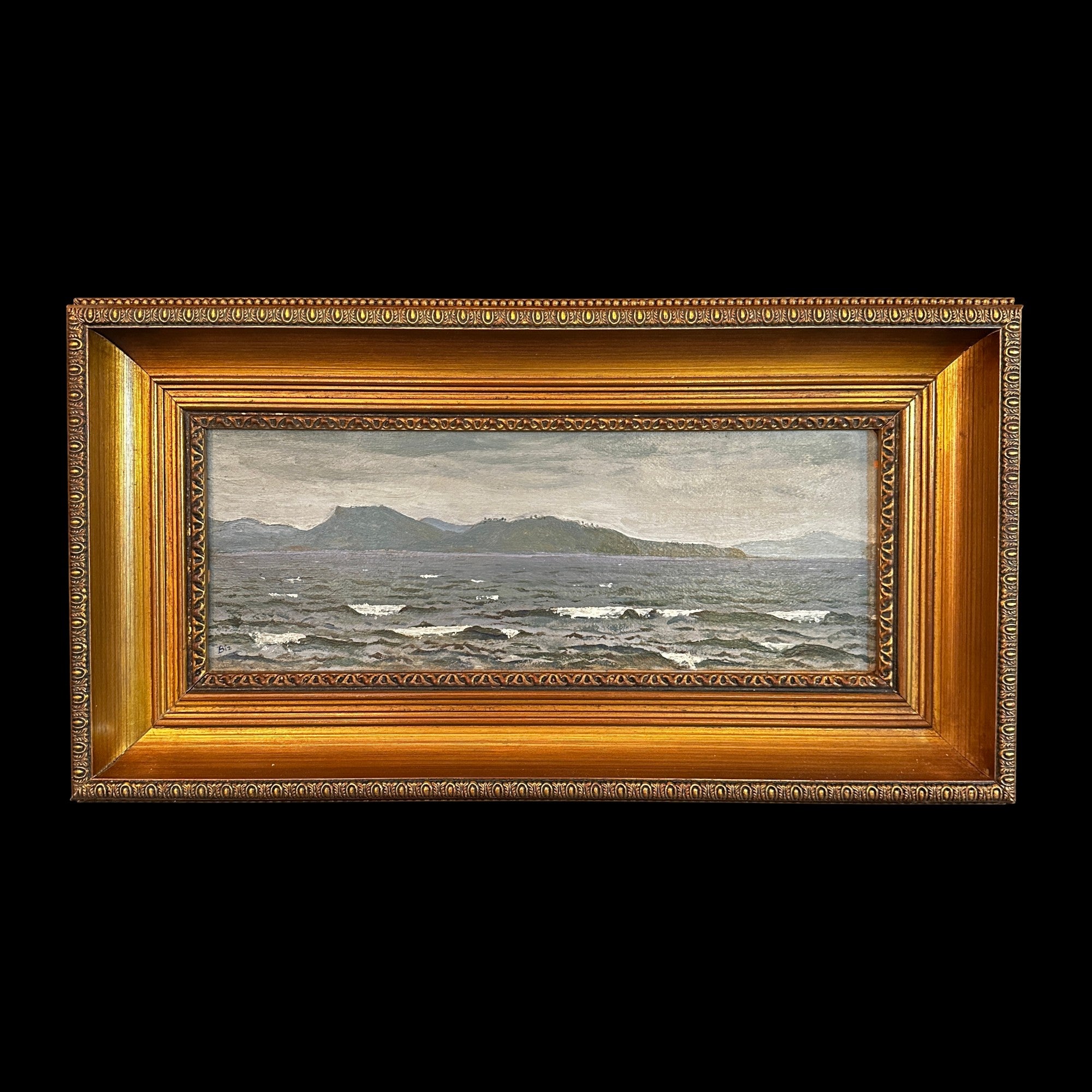 Hermosa marina firmada por 'Biz', utilizando una paleta fría para el cielo, el oleaje y los cerros al fondo. Cuenta con un marco de madera y yeso pintado de dorado.