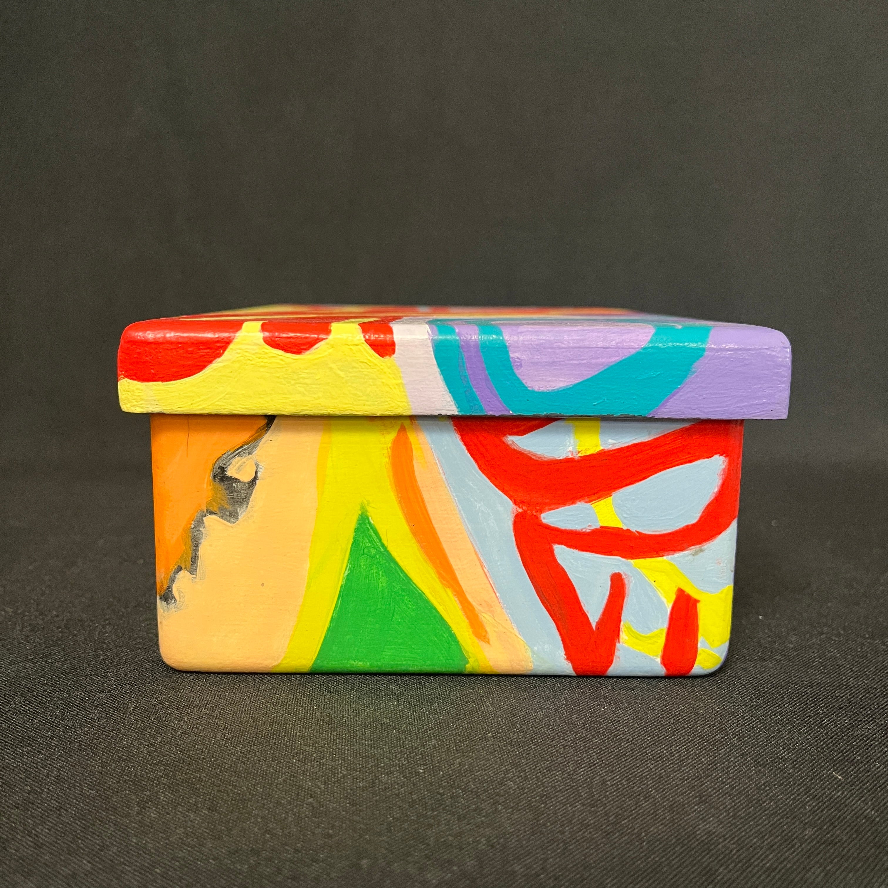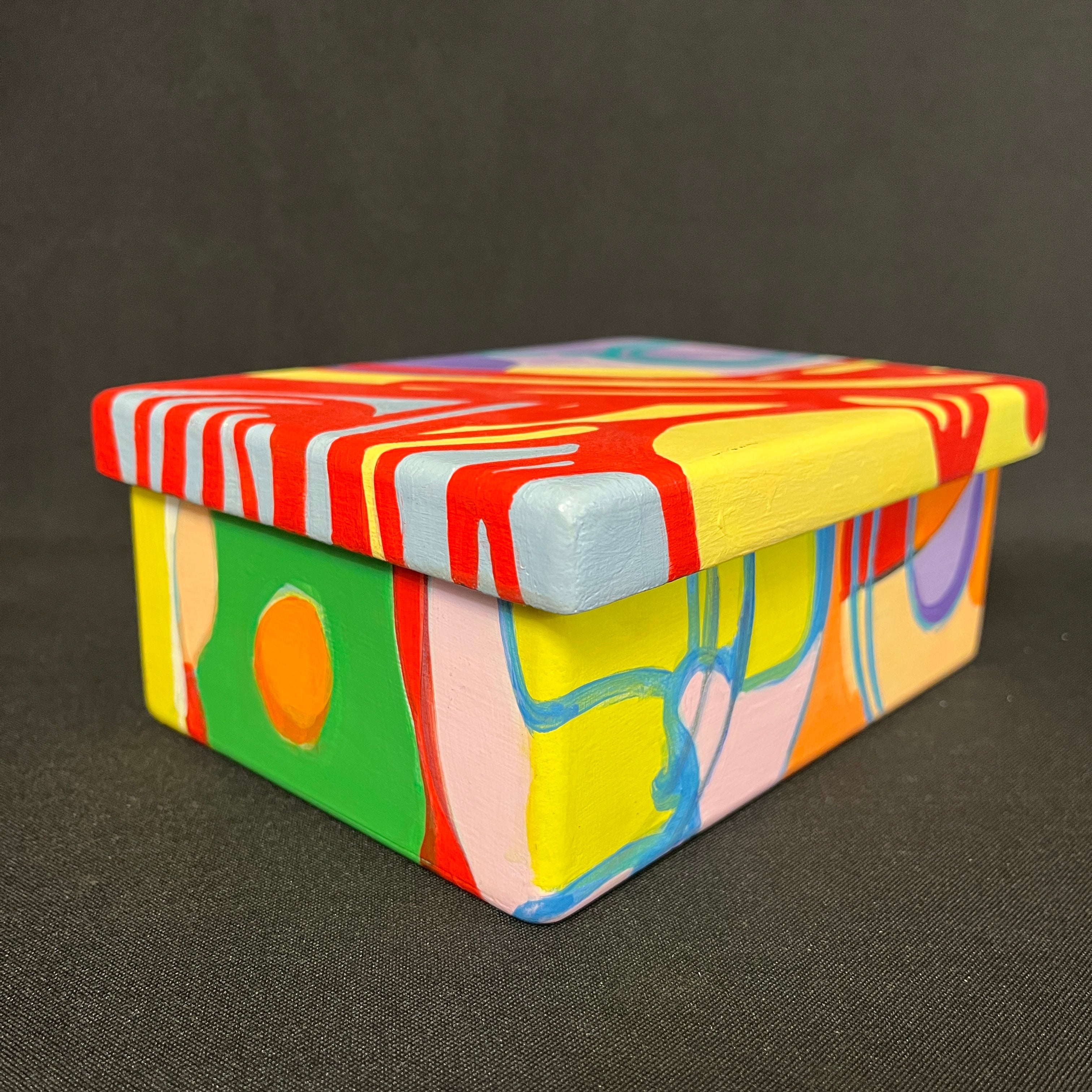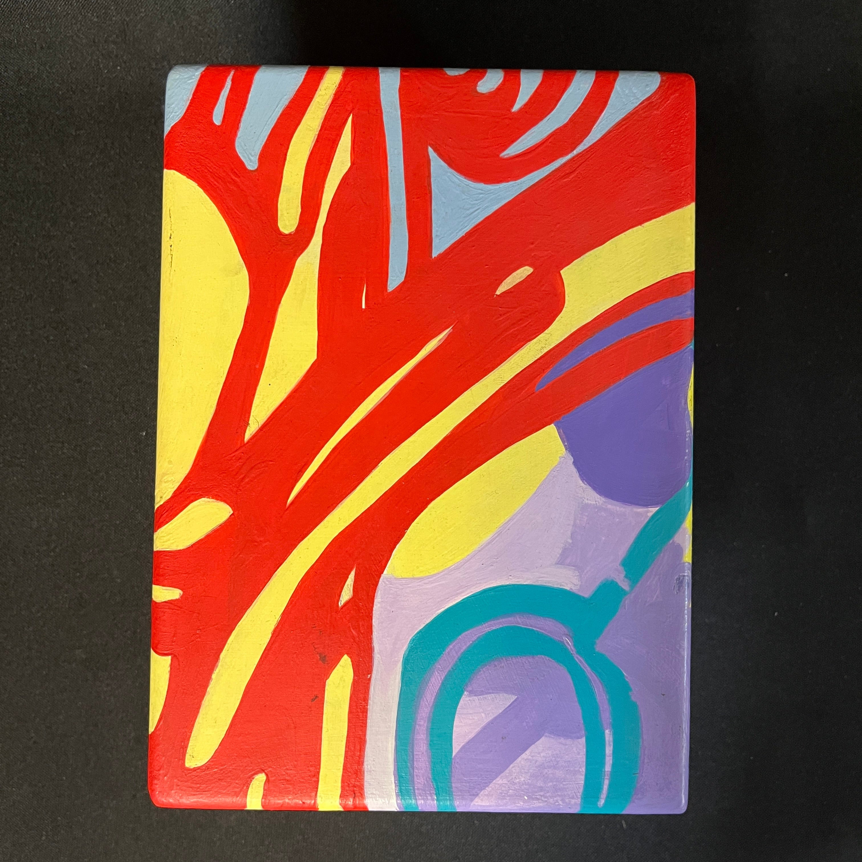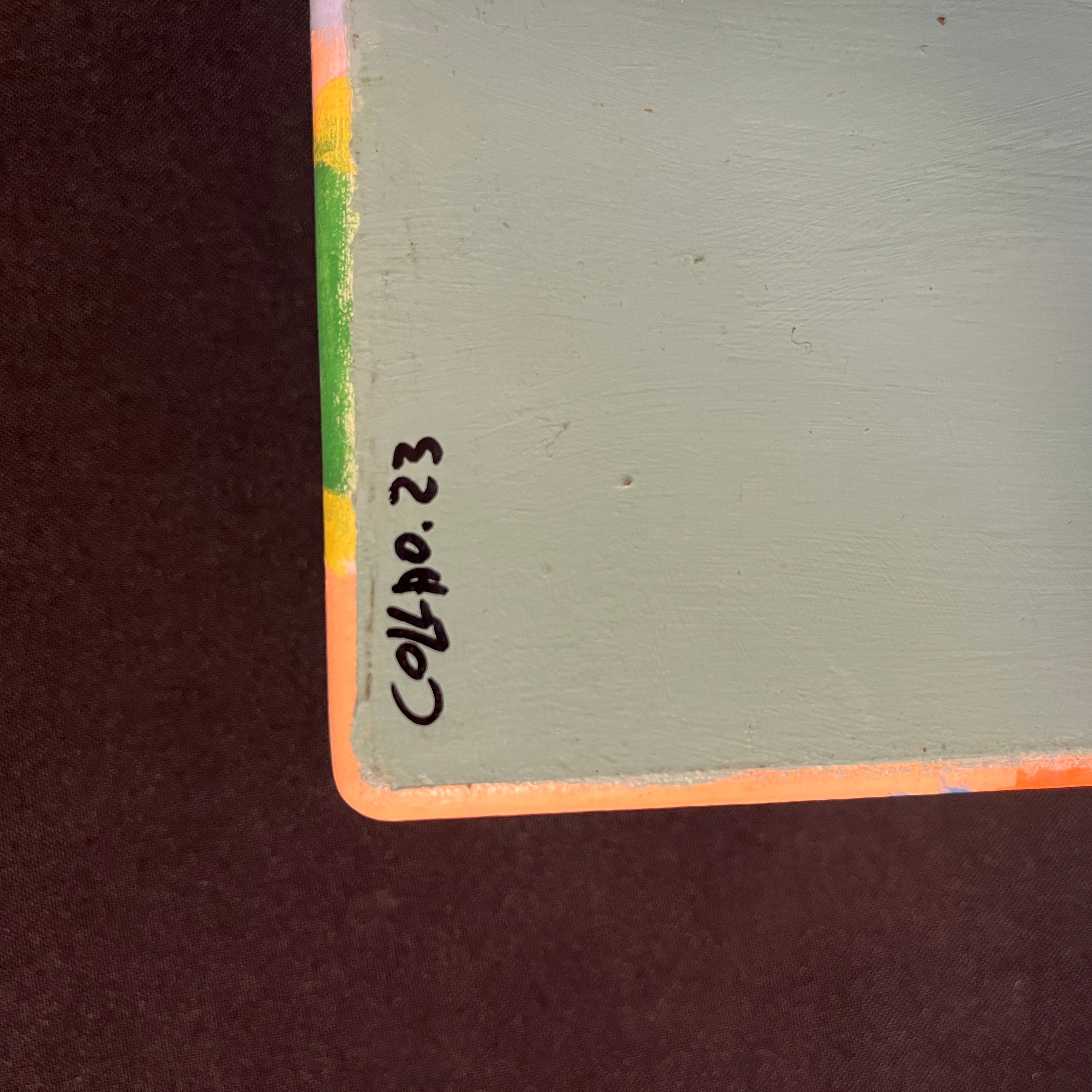 Esta colorida pieza de la artista chilena Claudia Collao, es una caja de madera pintada con acrílico, parte de su colección en pequeño formato. Su trabajo es reconocible por la preponderancia del color y el uso de elementos como el grafiti y el cómic en sus obras, generando una tensión entre la abstracción y la figuración.