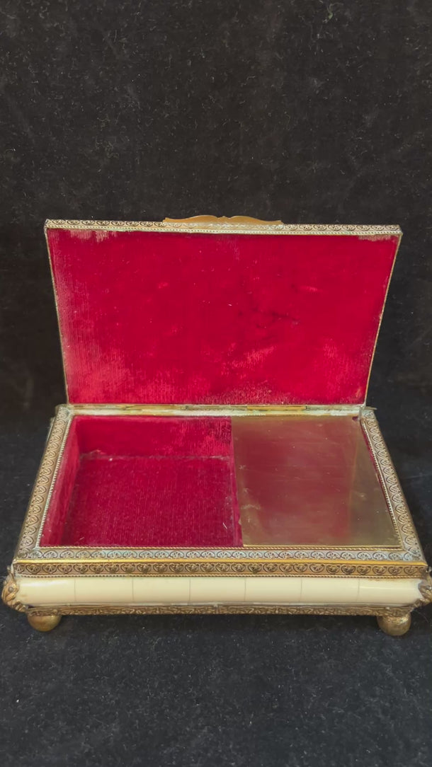 Enternecedora caja musical de bronce y baquelita con terciopelo rojo carmín en su interior. En la superficie se puede apreciar un muy delicado tallado en bronce con motivos tribales dejando la baquelita segmentada y un hermoso rosetón nuclear. Se presume que es de principios del 1900.