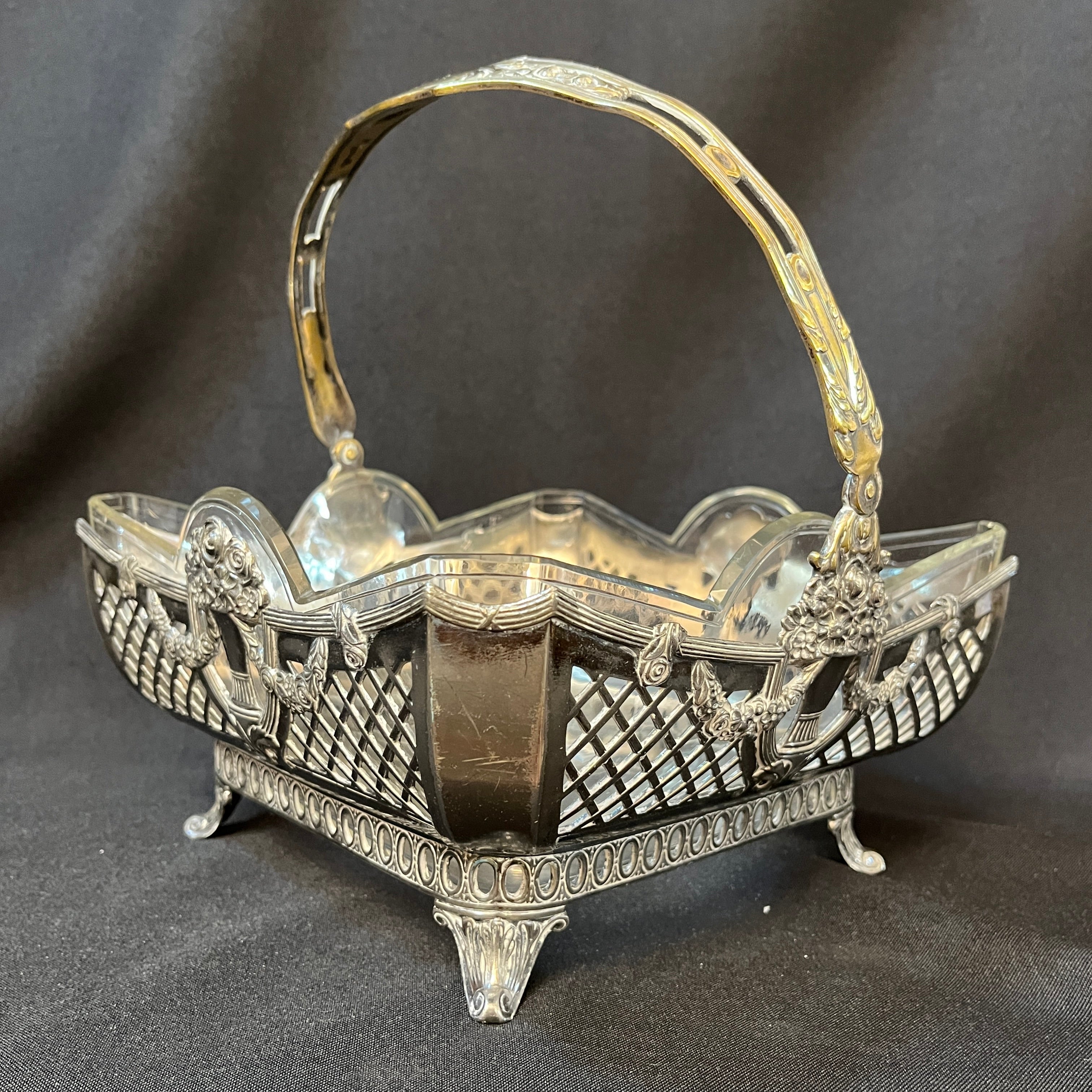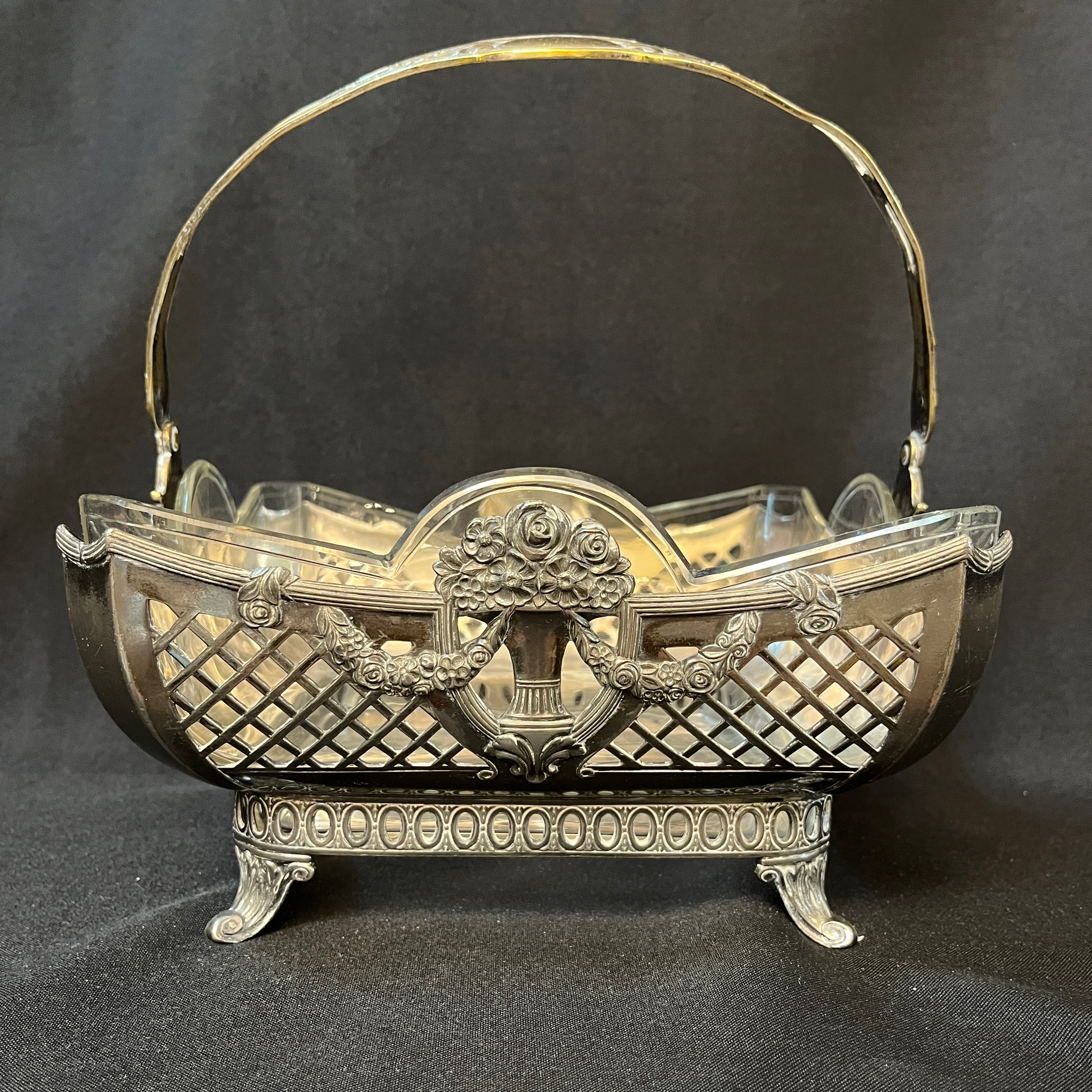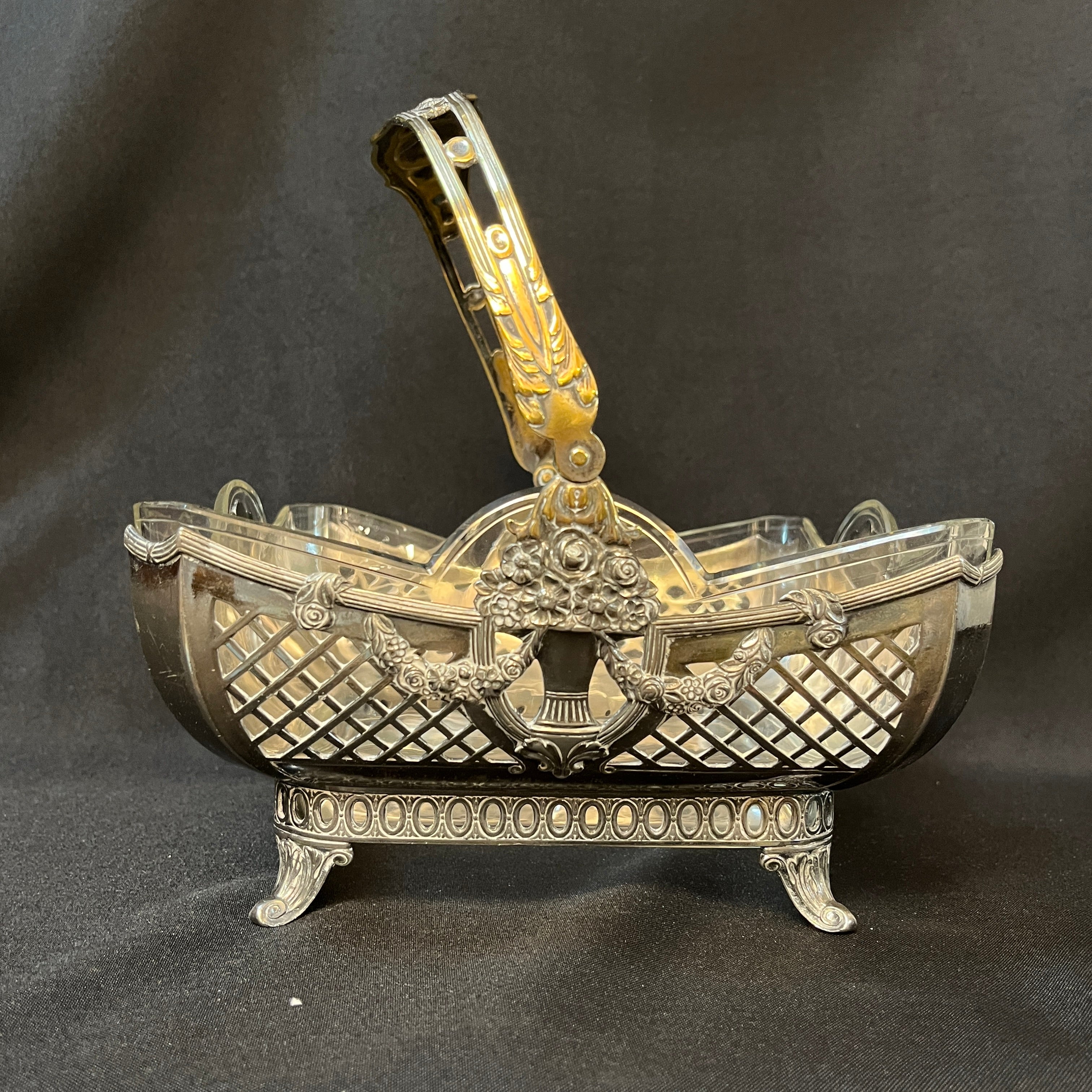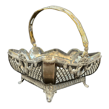 Esta pieza es un centro de mesa de origen francés estilo Art Nouveau de la marca Christofle. Cuenta con una base de plaqué tallada con motivos florales y una fuente de vidrio extraíble. La pieza era utilizada como centro de mesa para poner frutas o arreglos florales durante finales del siglo XIX en Alemania.