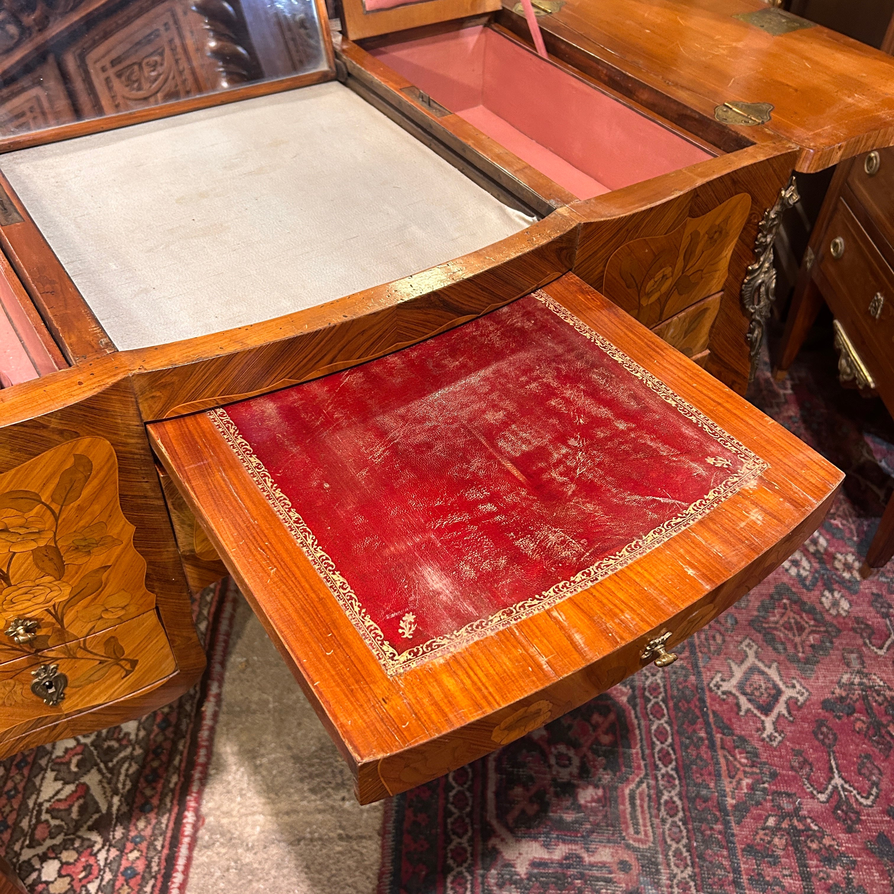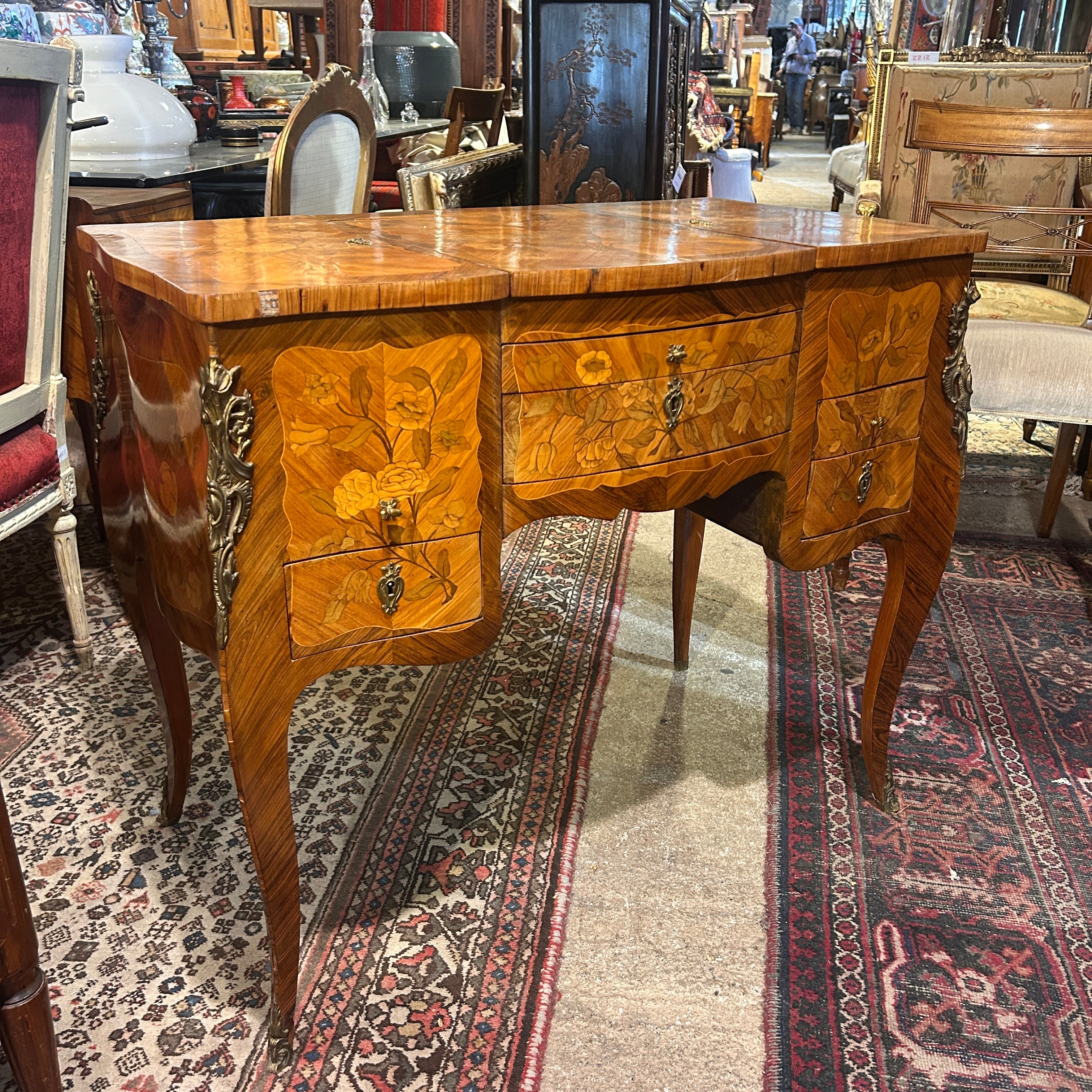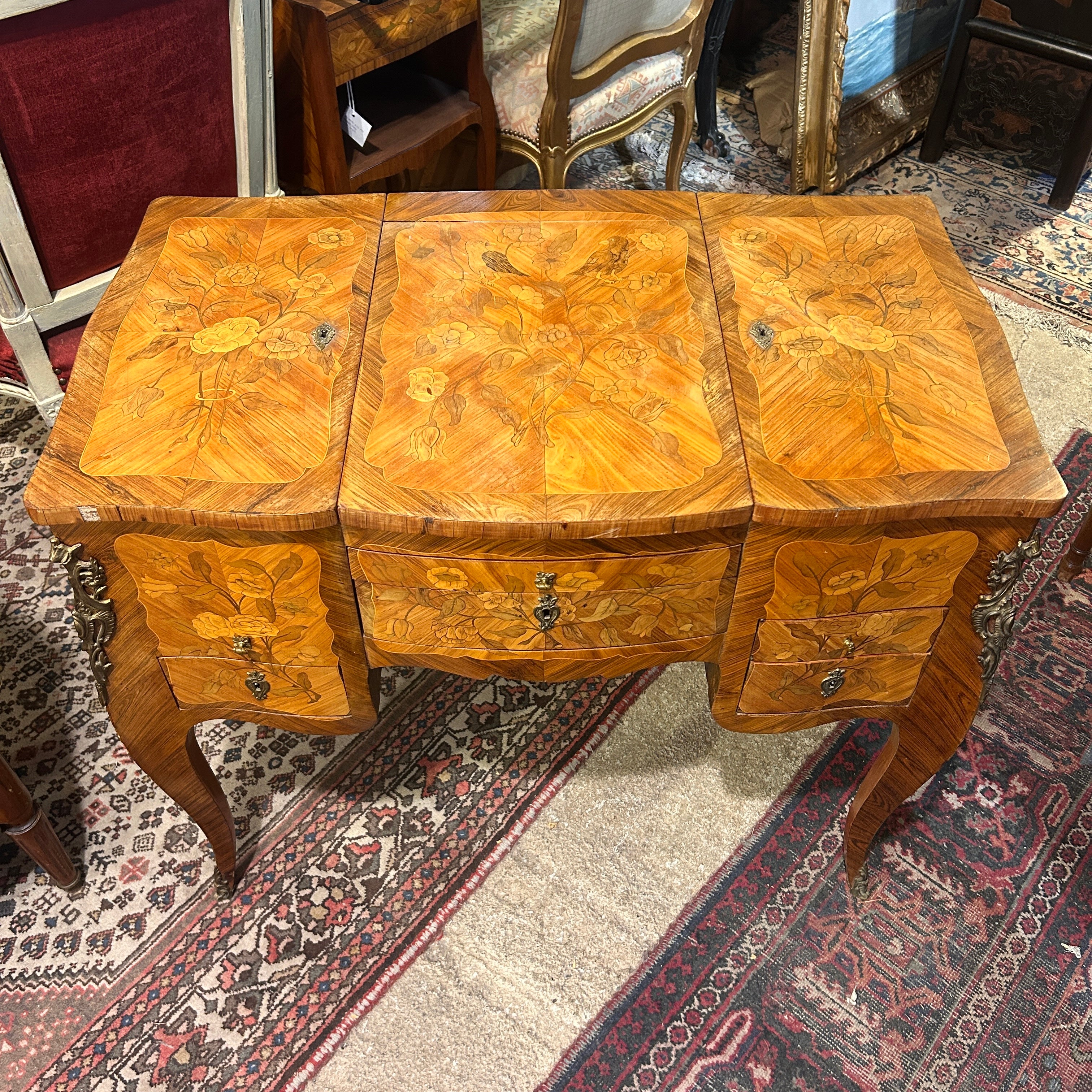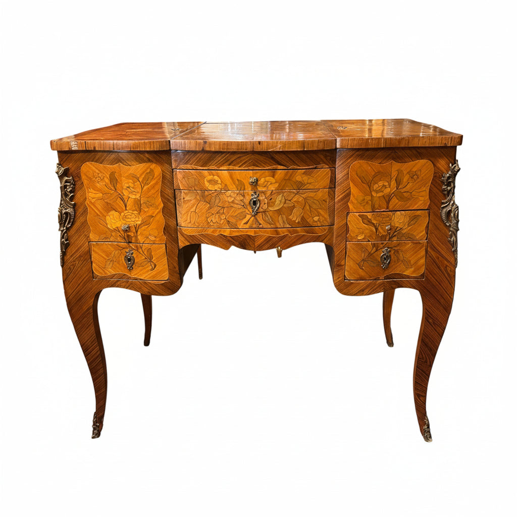 Coiffeuse Luis XV marquetería floral y geométrica inicio s.XX