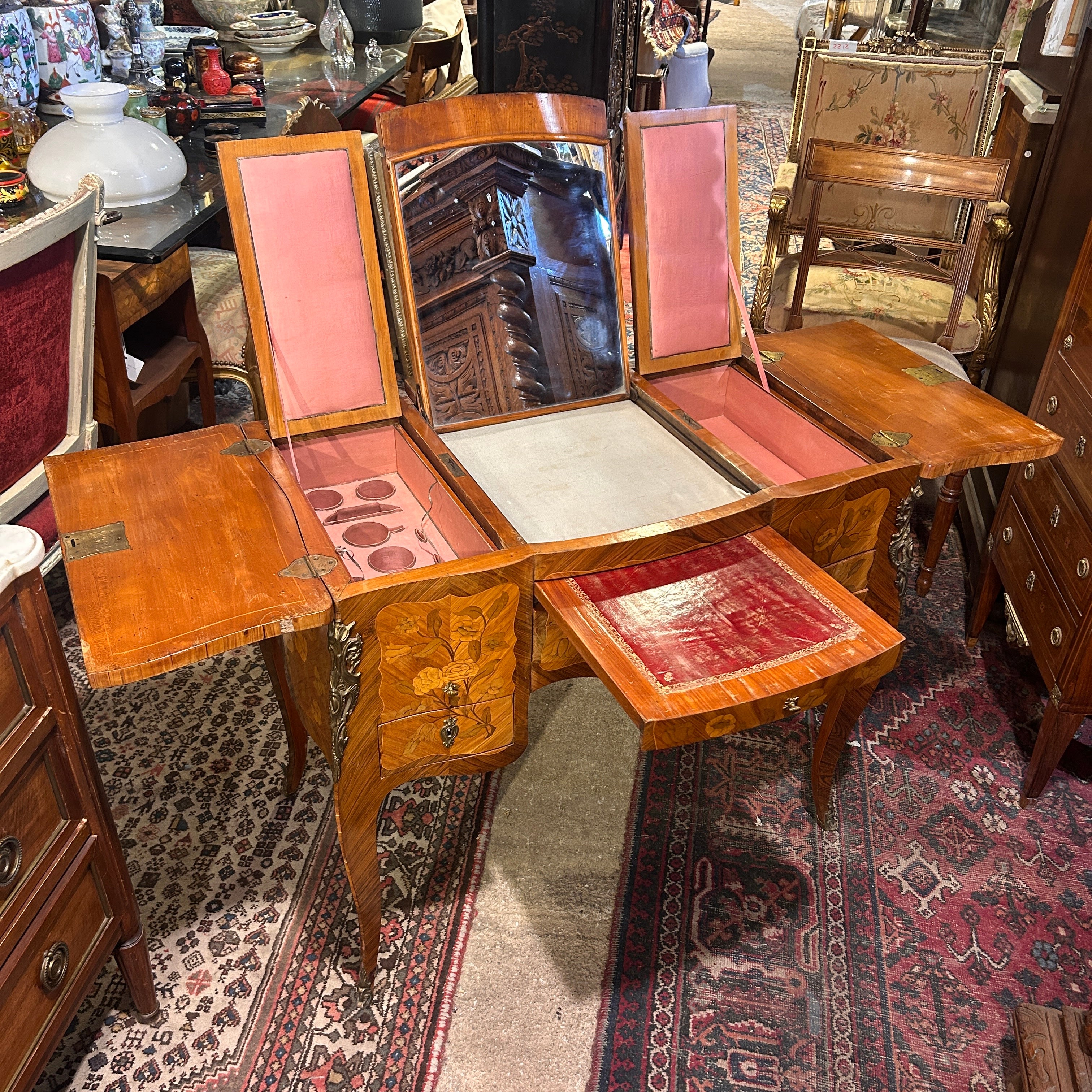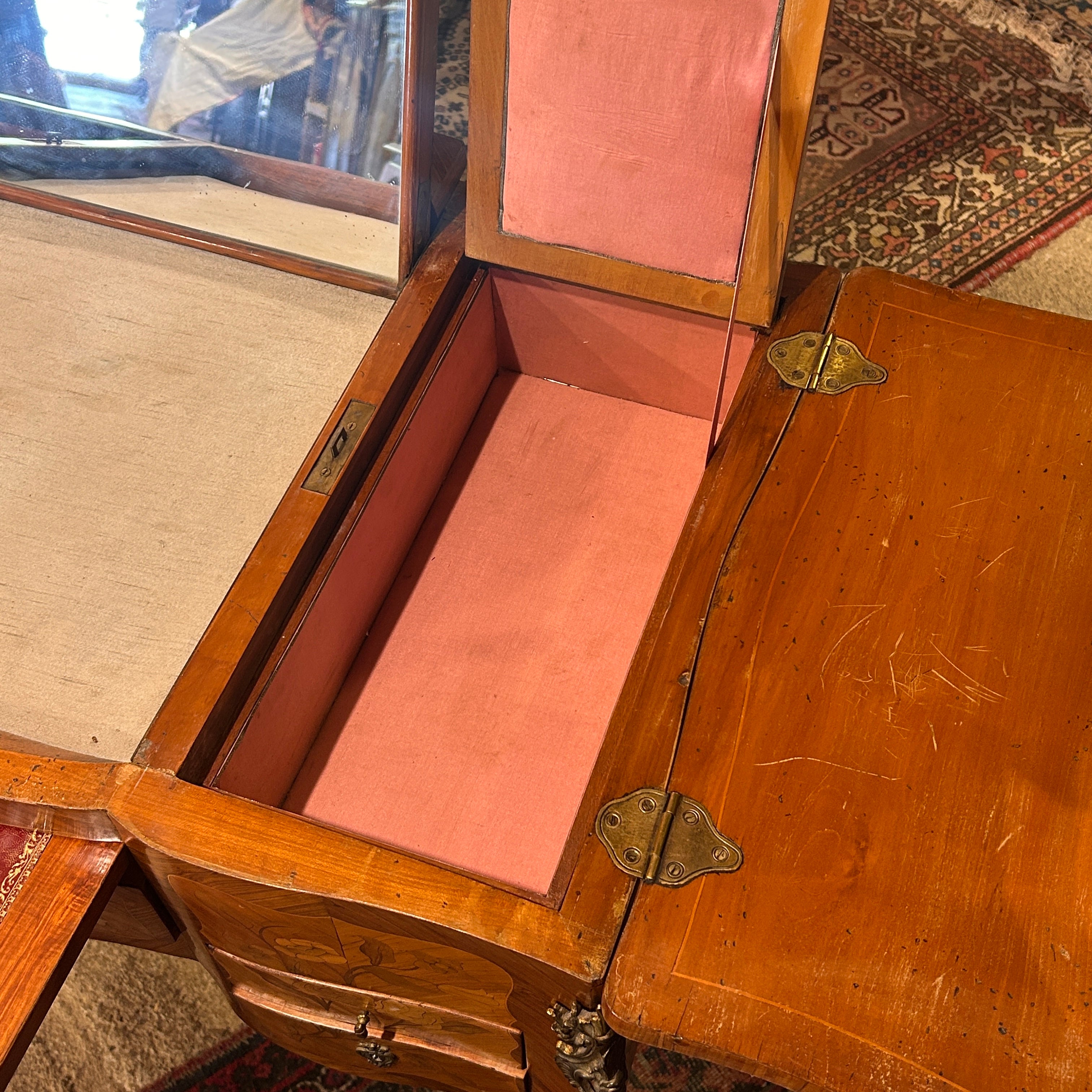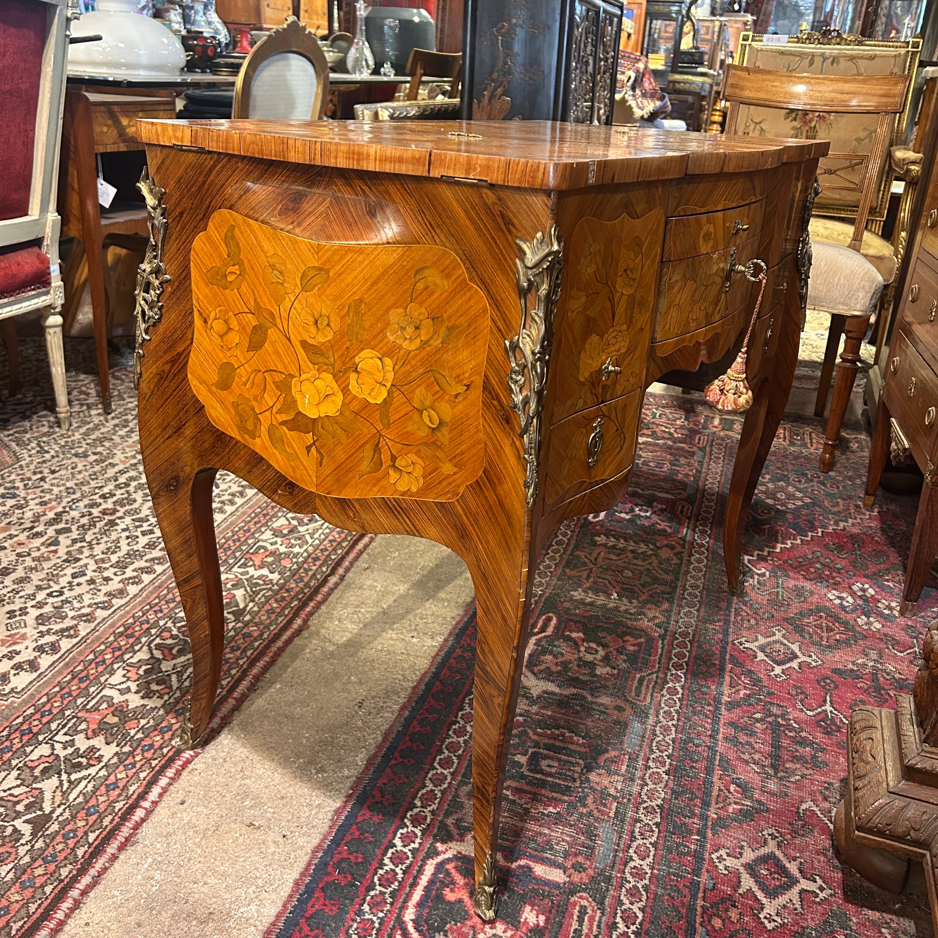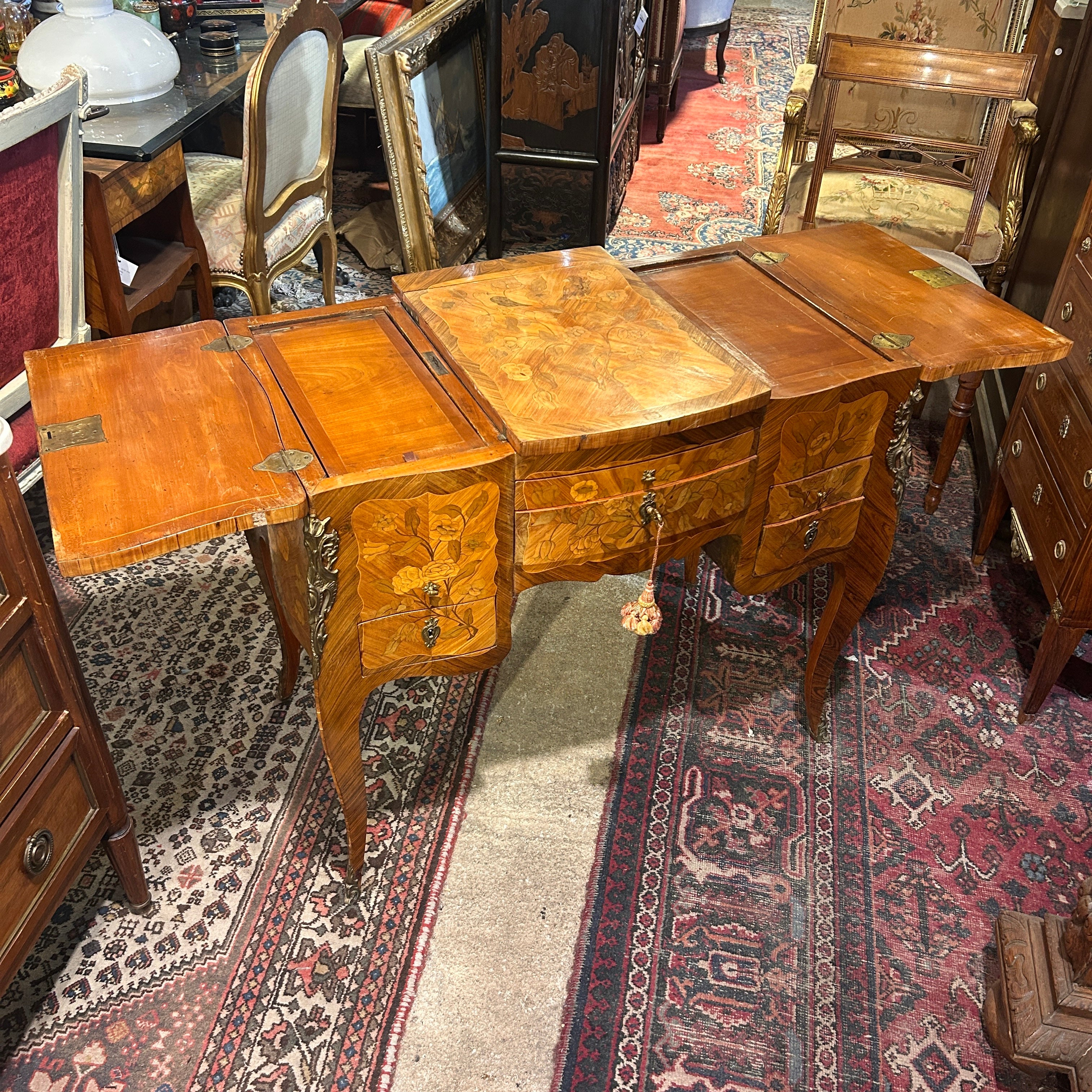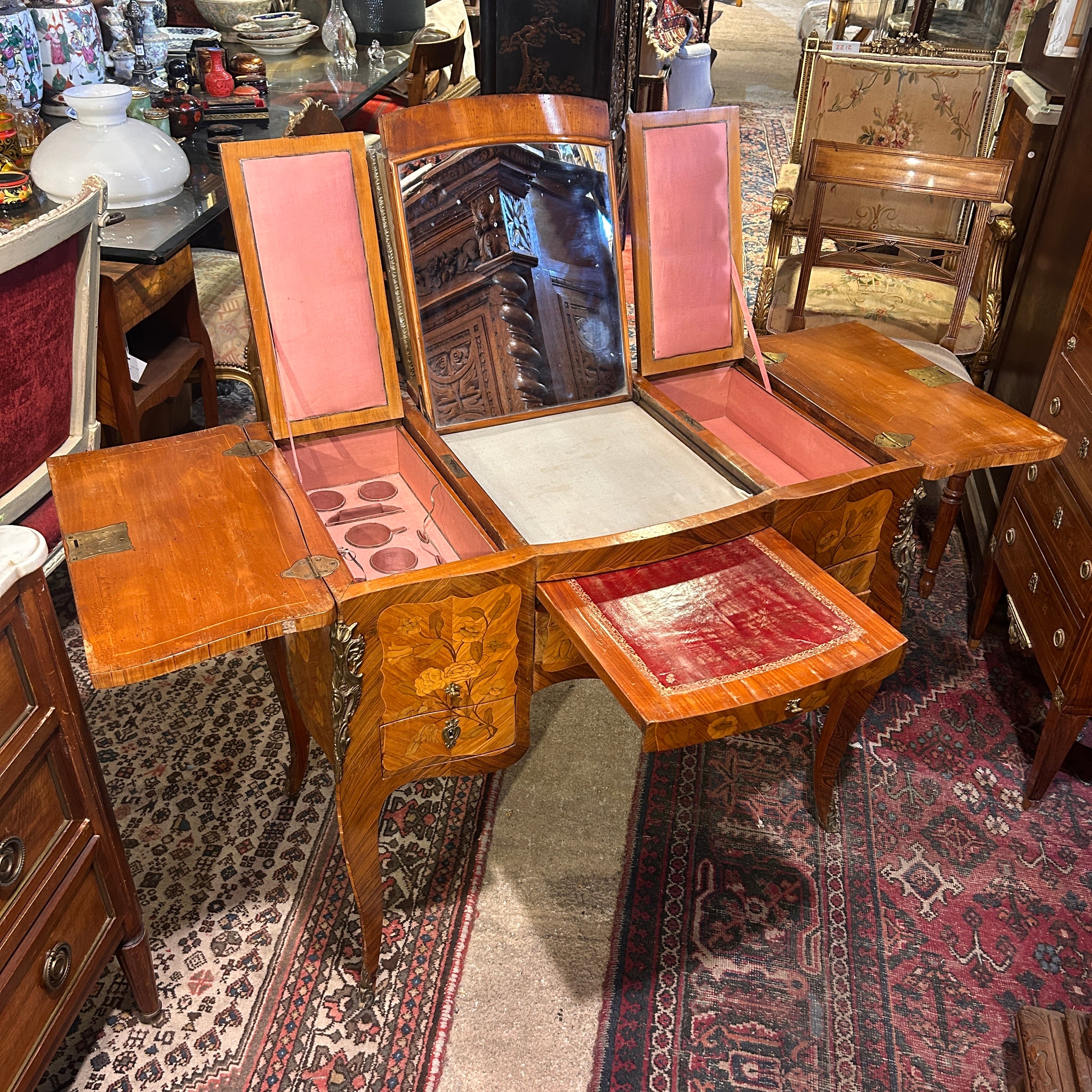 Coiffeuse Luis XV marquetería floral y geométrica inicio s.XX