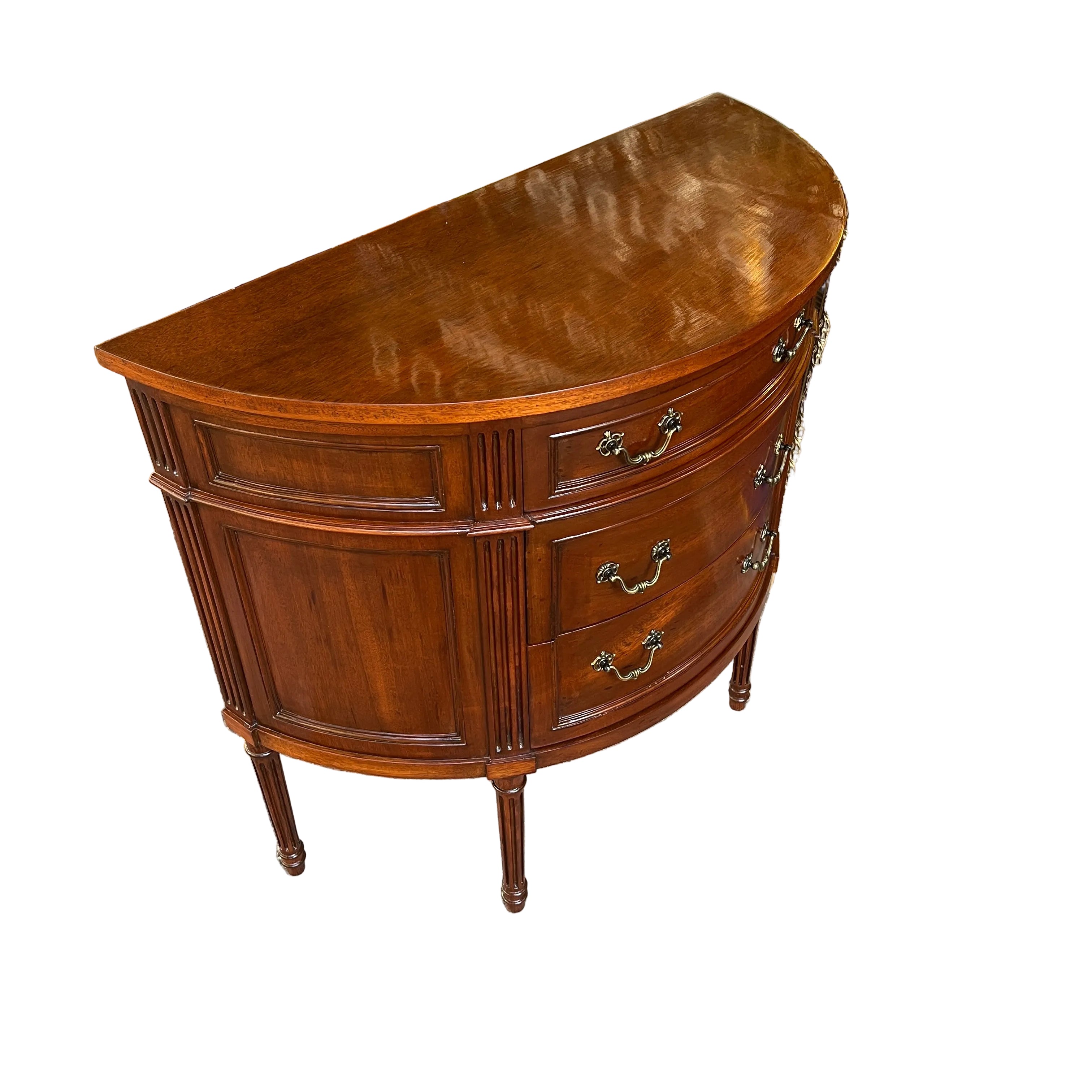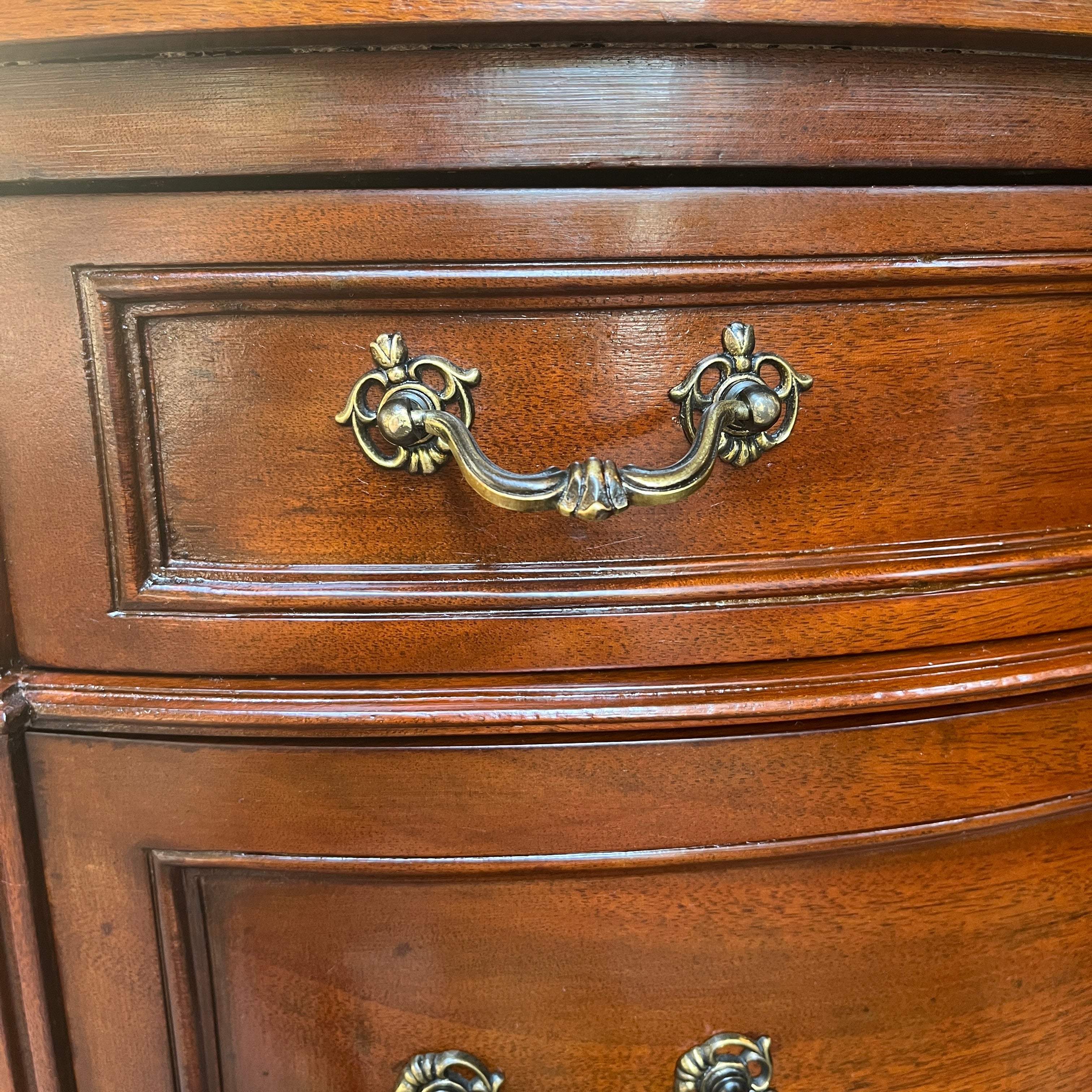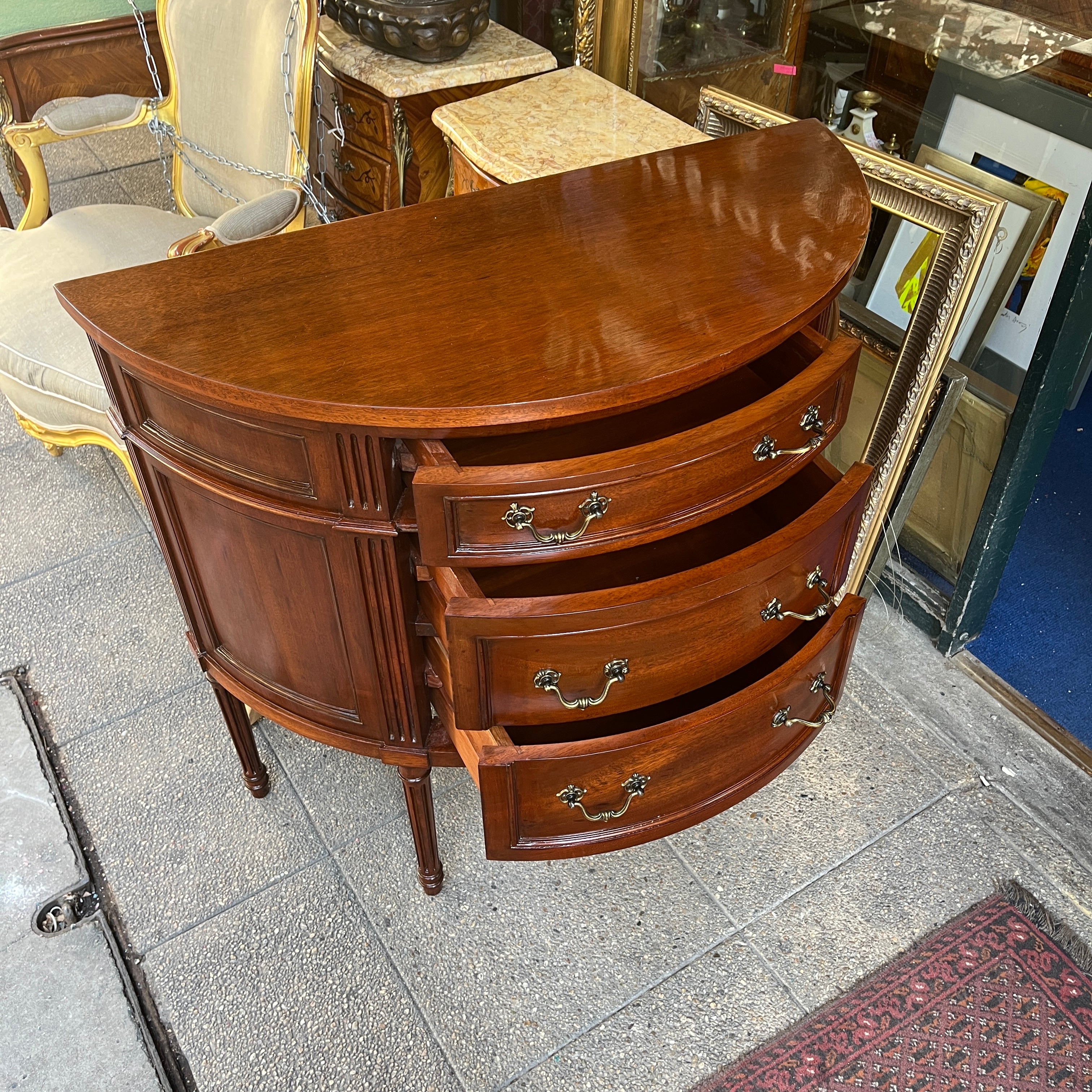 Elegante cómoda de medio punto de origen estadounidense estilo Sheraton años 50s. La pieza está hecha en madera de caoba y tiene tres cajones amplios con tiradores metálicos. En buen estado.