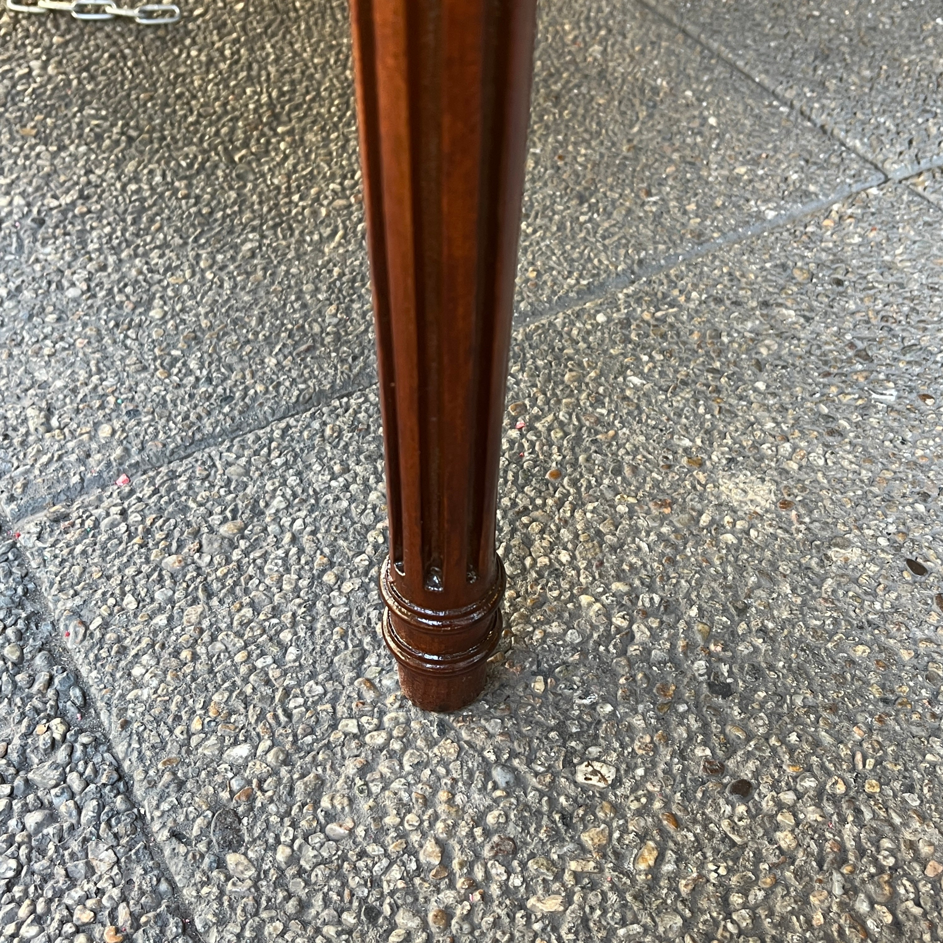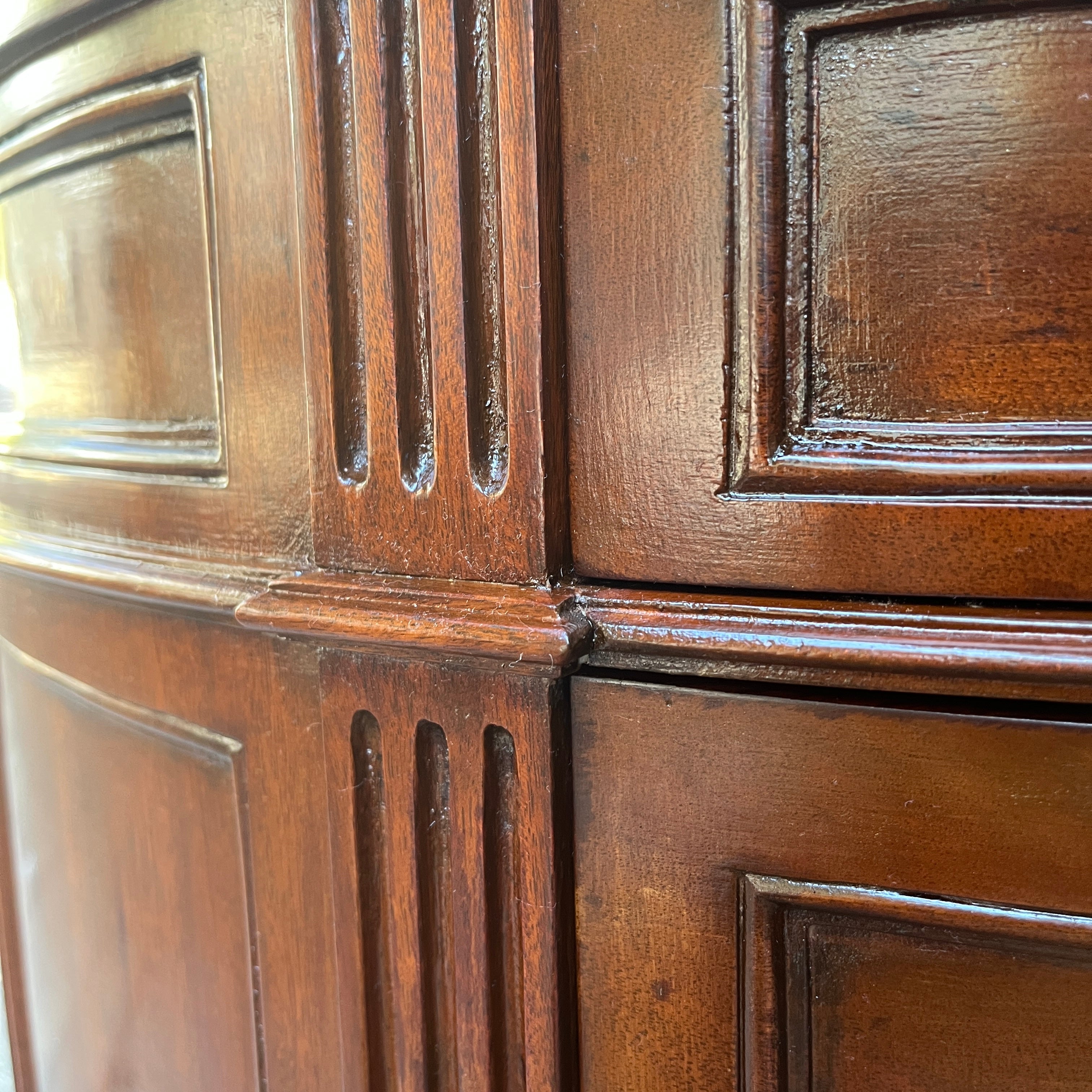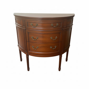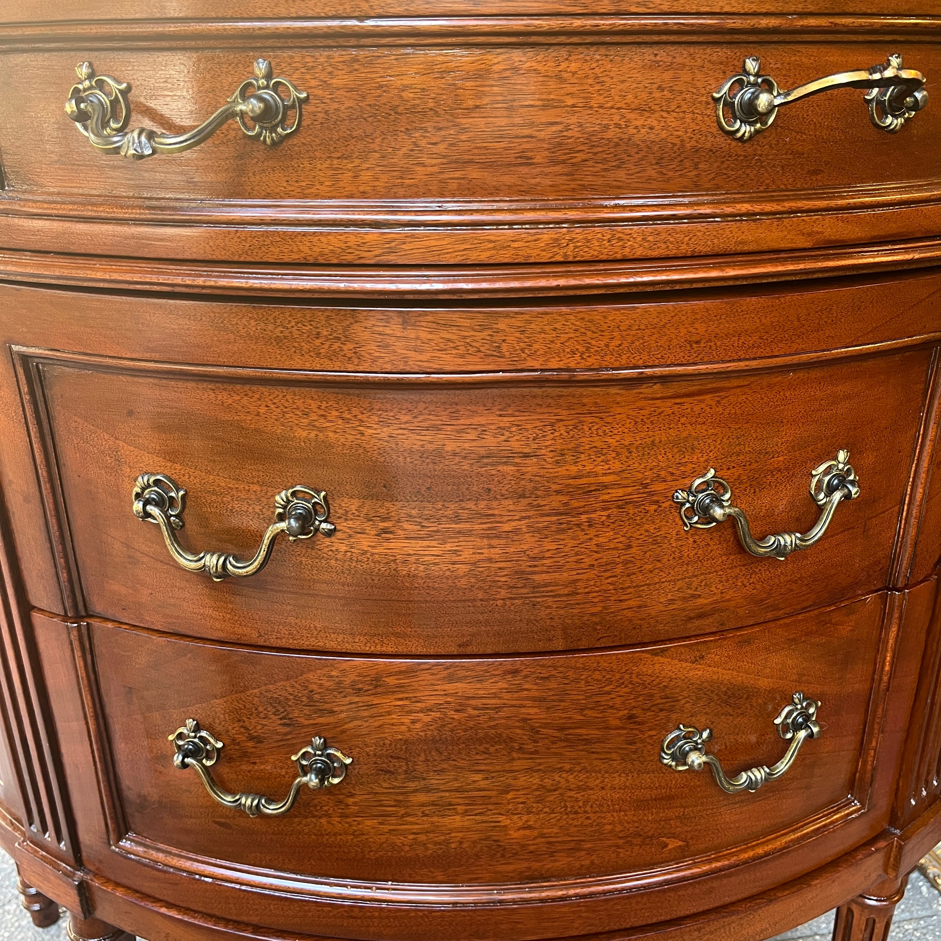 Elegante cómoda de medio punto de origen estadounidense estilo Sheraton años 50s. La pieza está hecha en madera de caoba y tiene tres cajones amplios con tiradores metálicos. En buen estado.