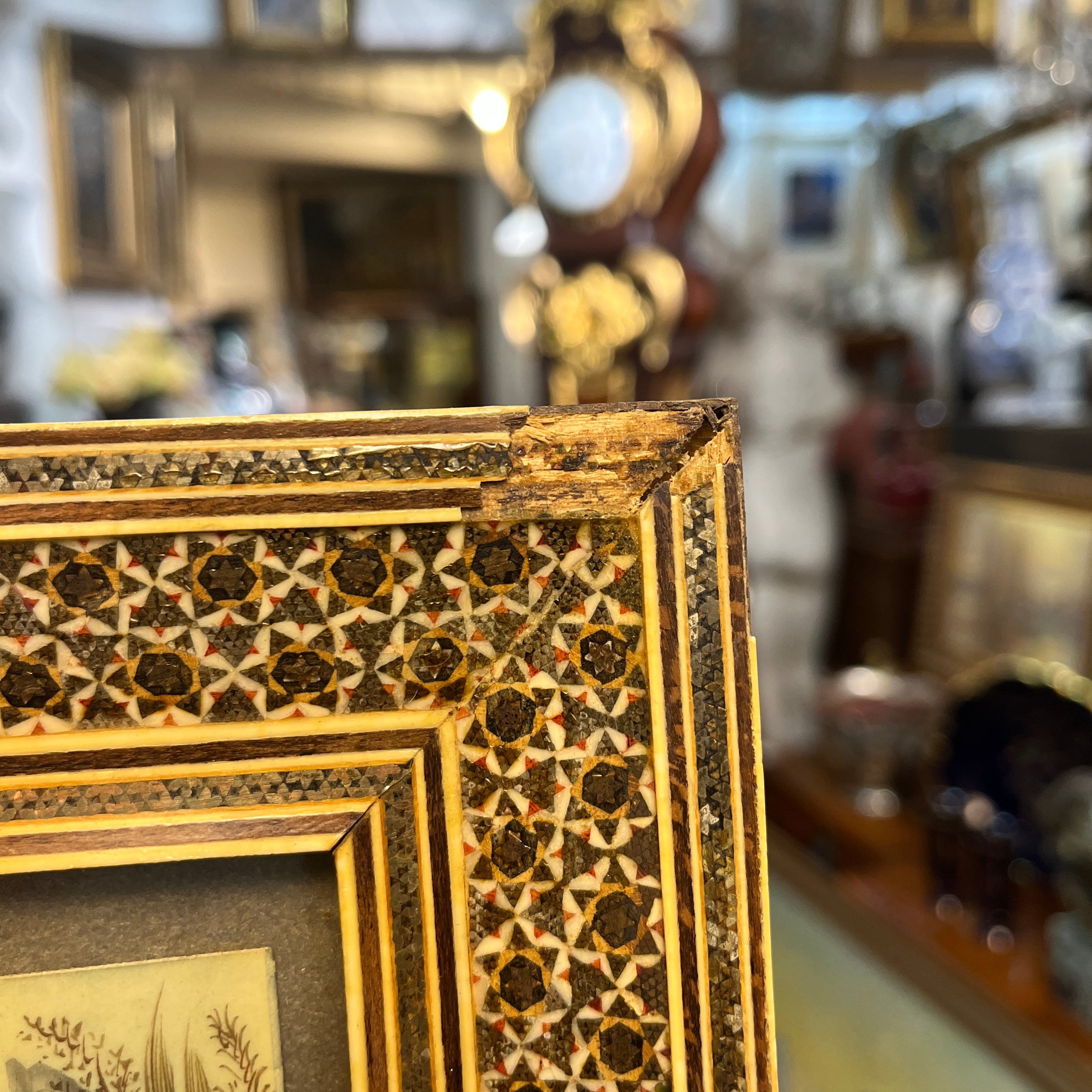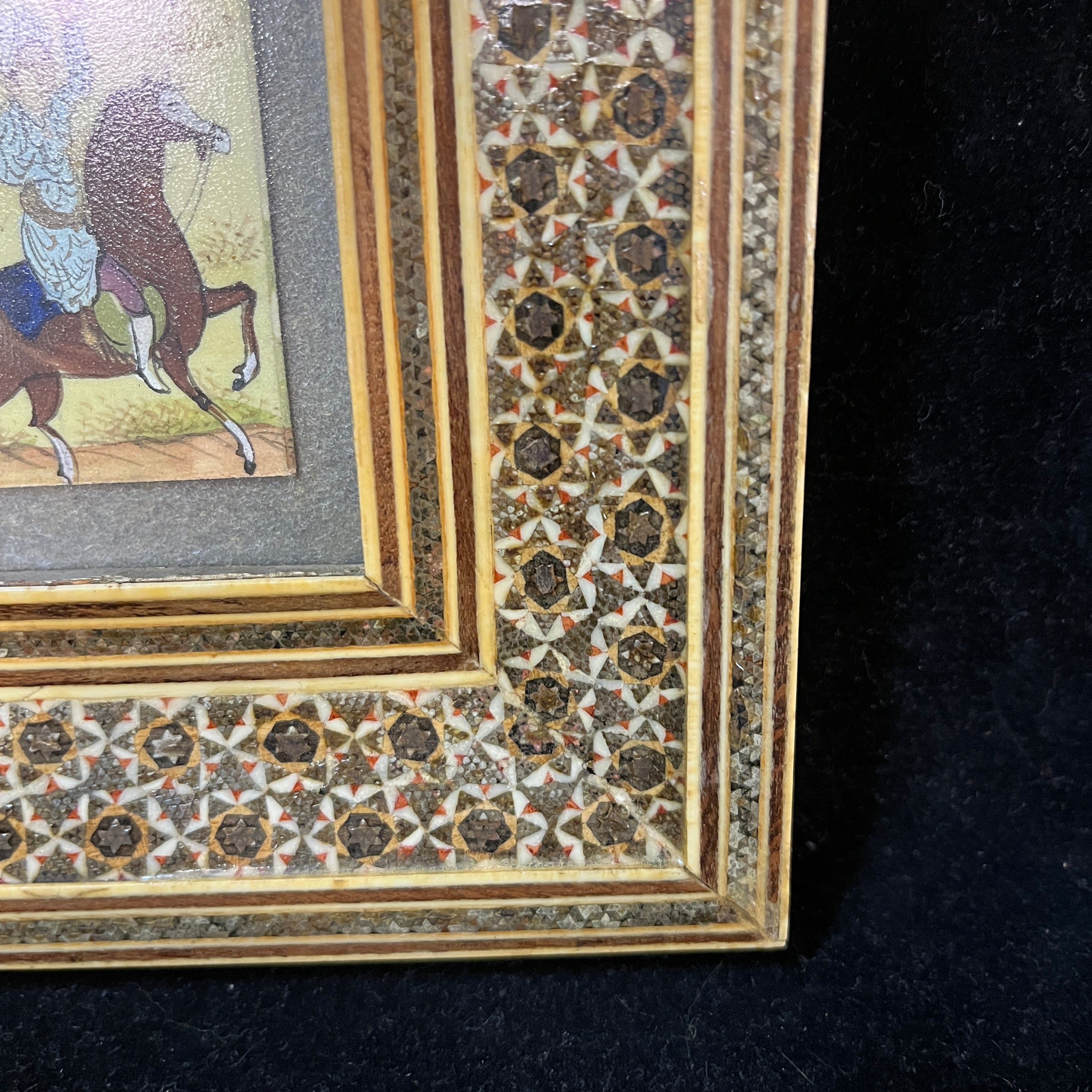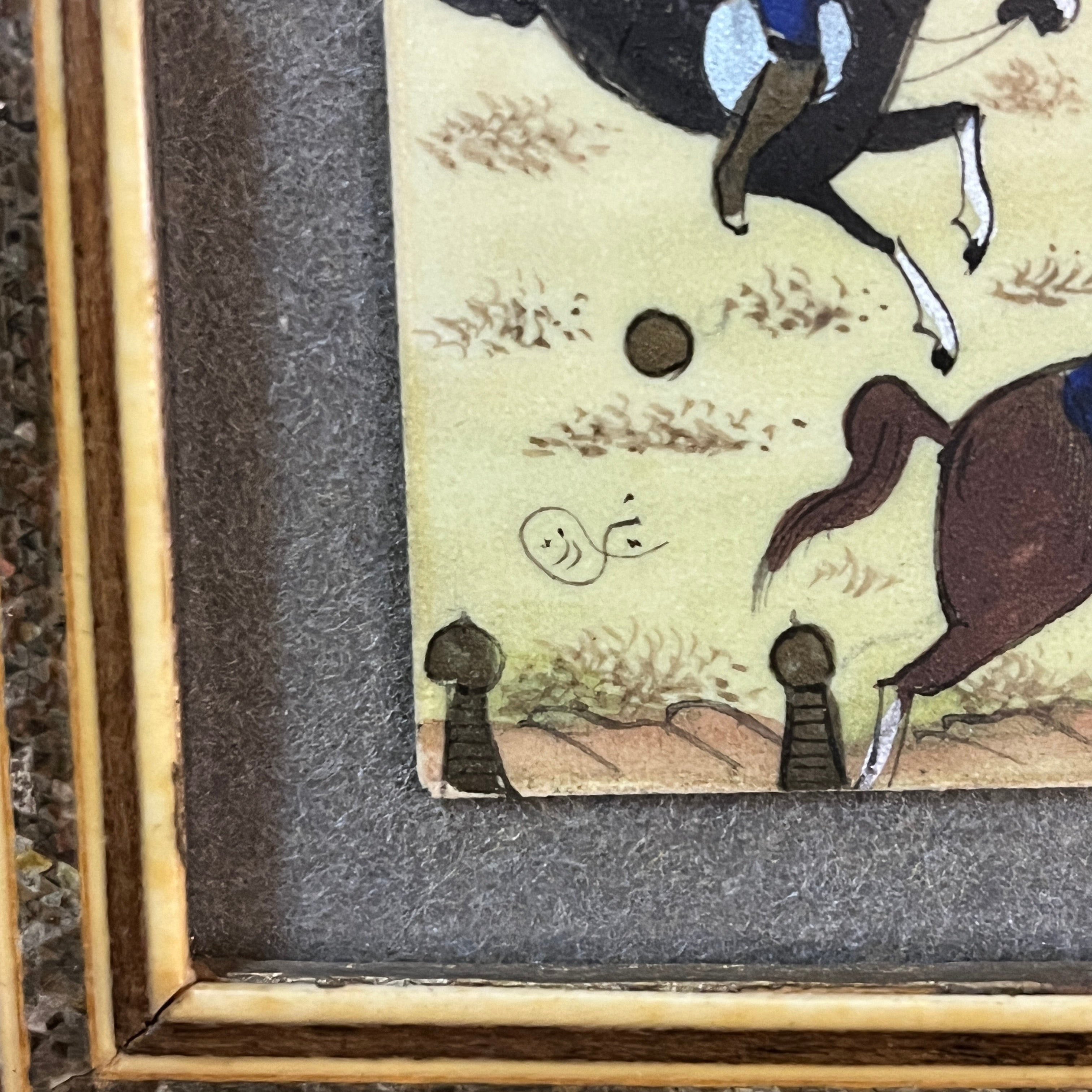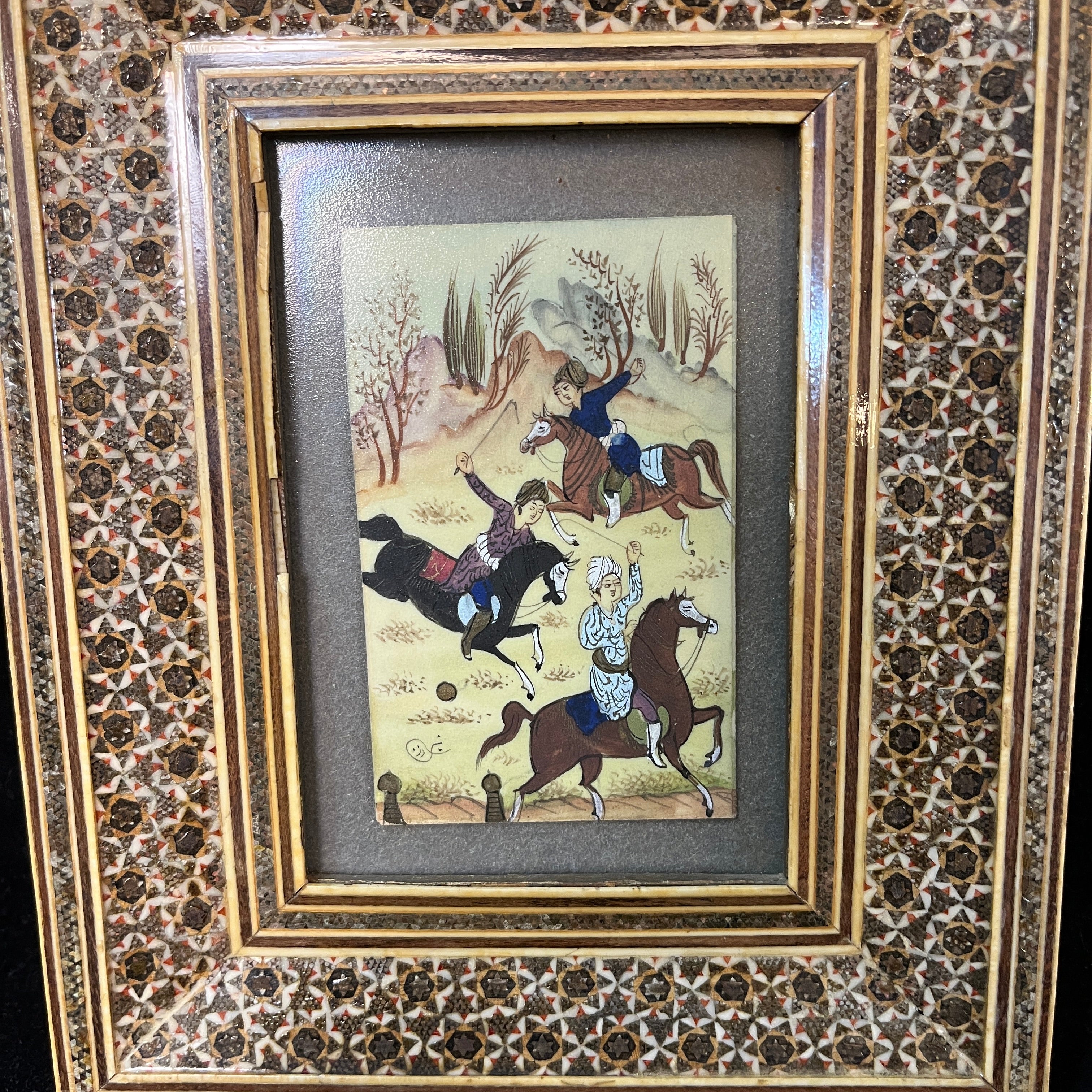 Bello cuadro de origen persa de mediados siglo XX, hecho de marfilina pintada a mano, representando una escena de tres jinetes cabalgando sobre un valle mientras juegan polo. Tanto la vegetación como el vestuario de cada jinete está terminado con detalle y delicadeza. Se trata de una obra de pequeño formato y trazo fino, complementado por un llamativo marco de madera con diseños de marquetería en micromosaicos.