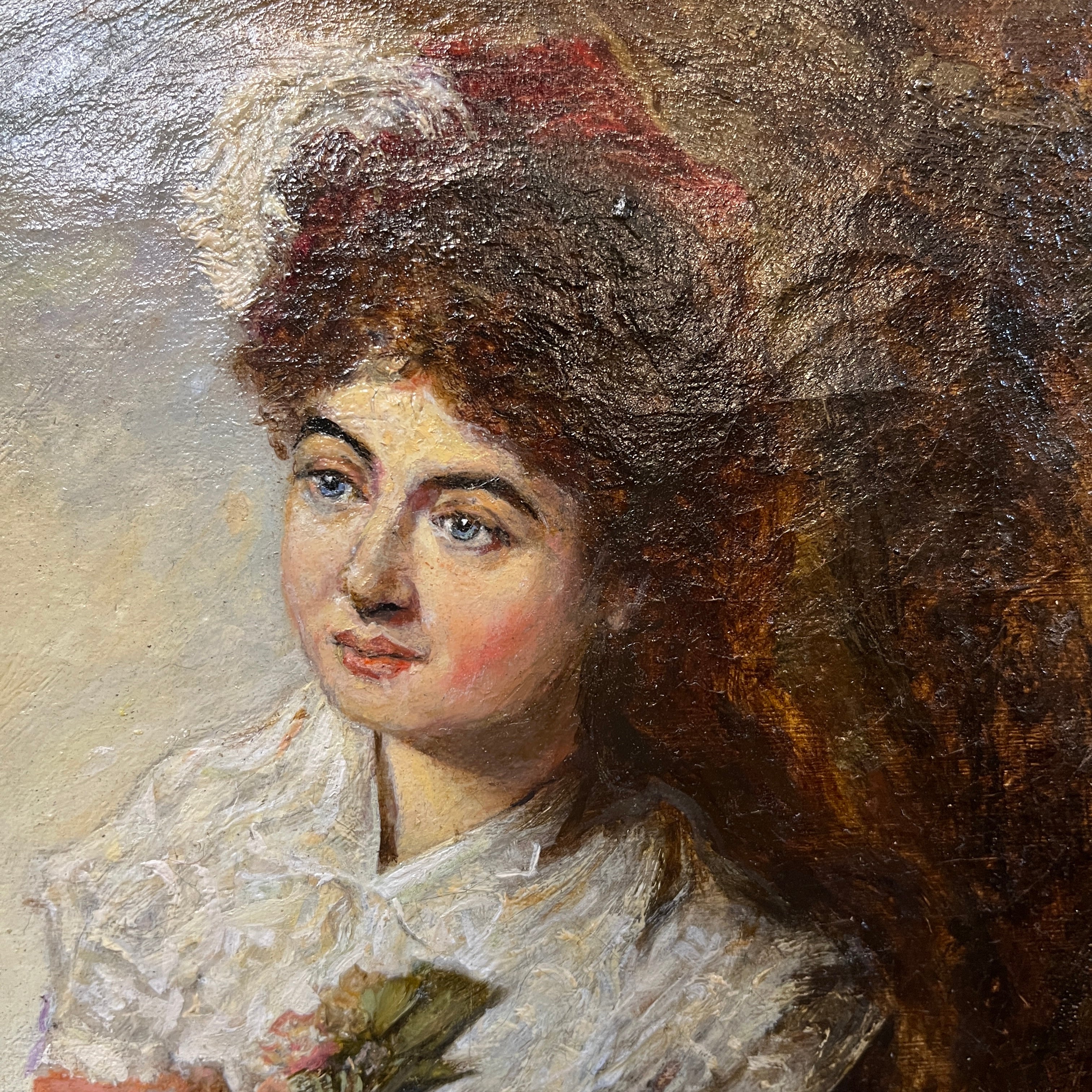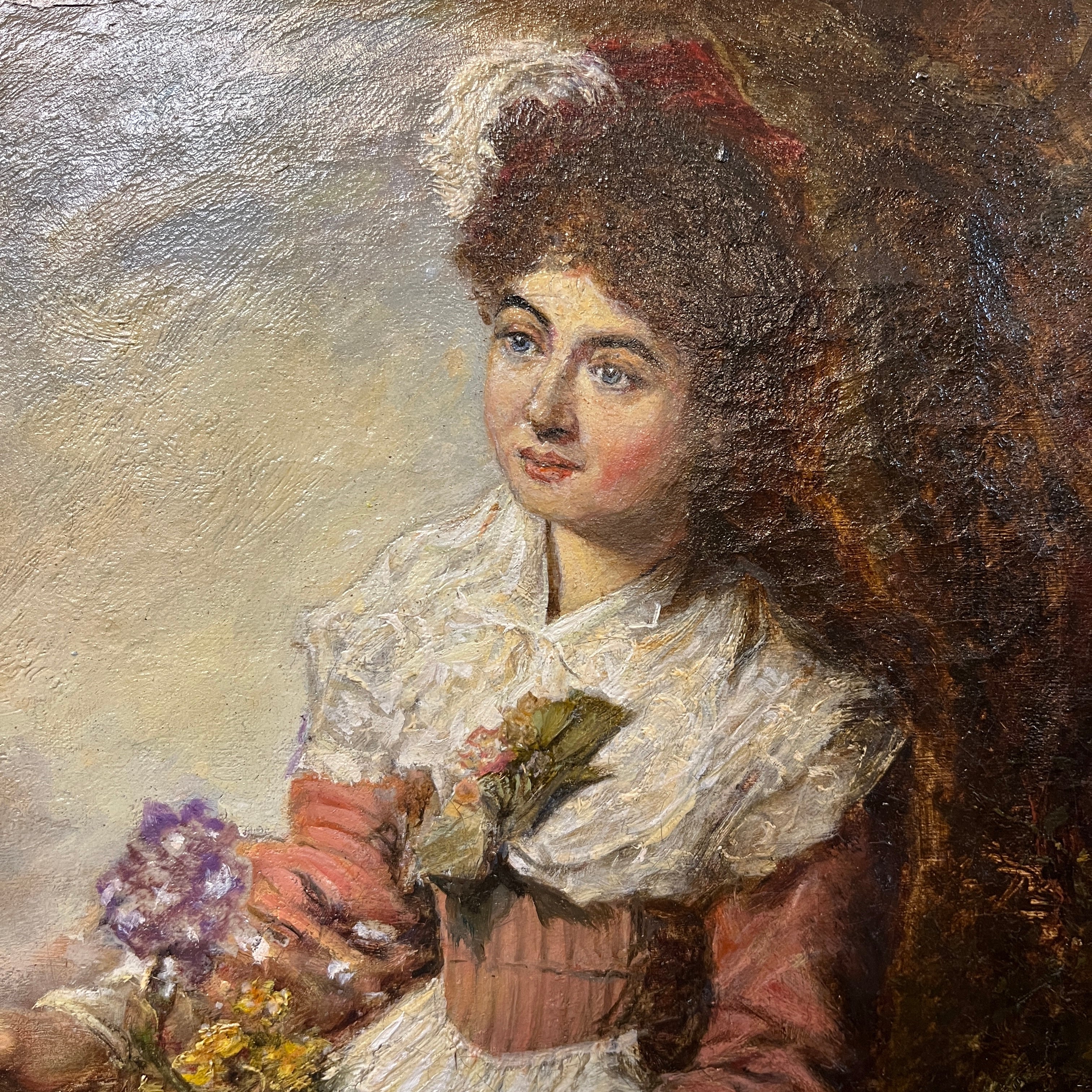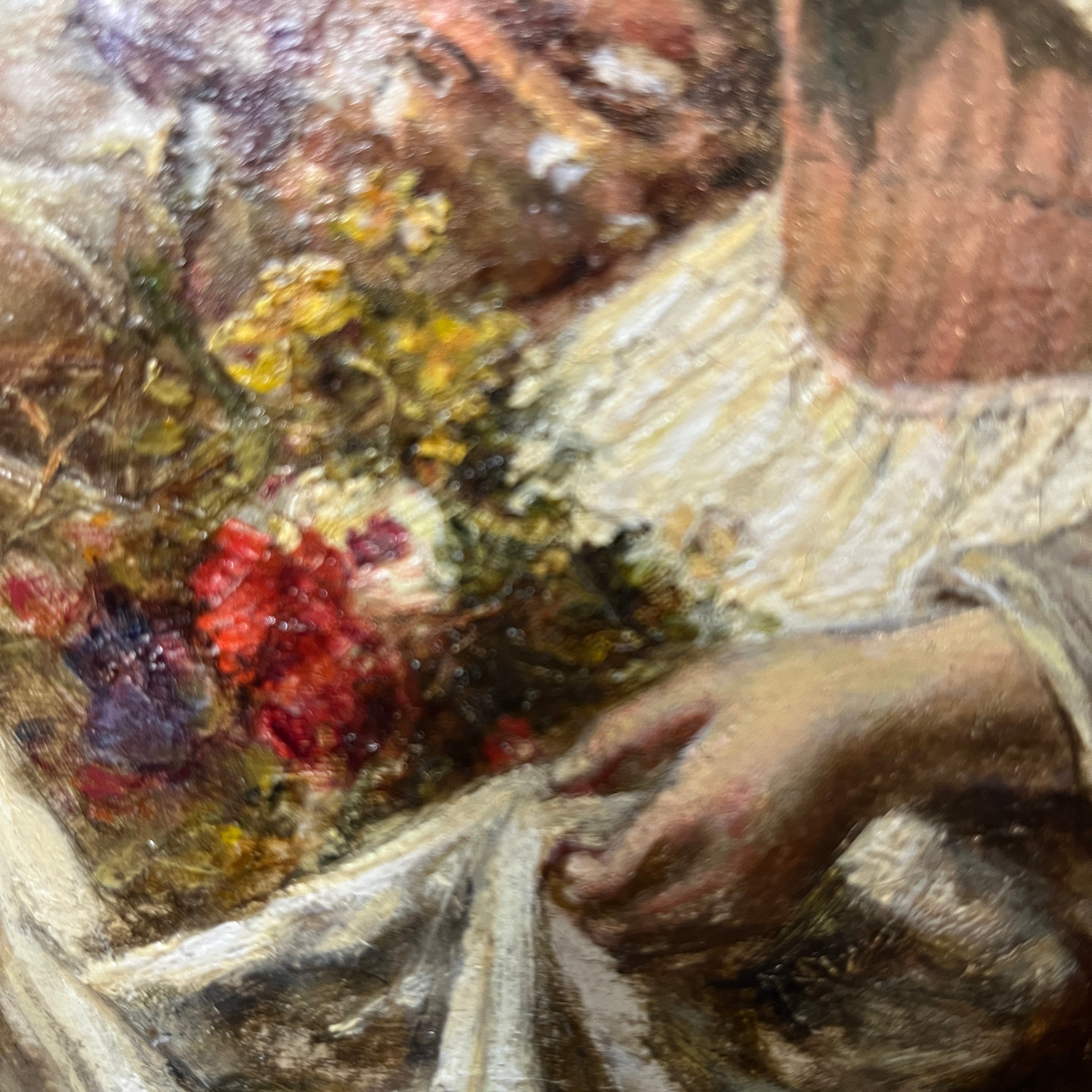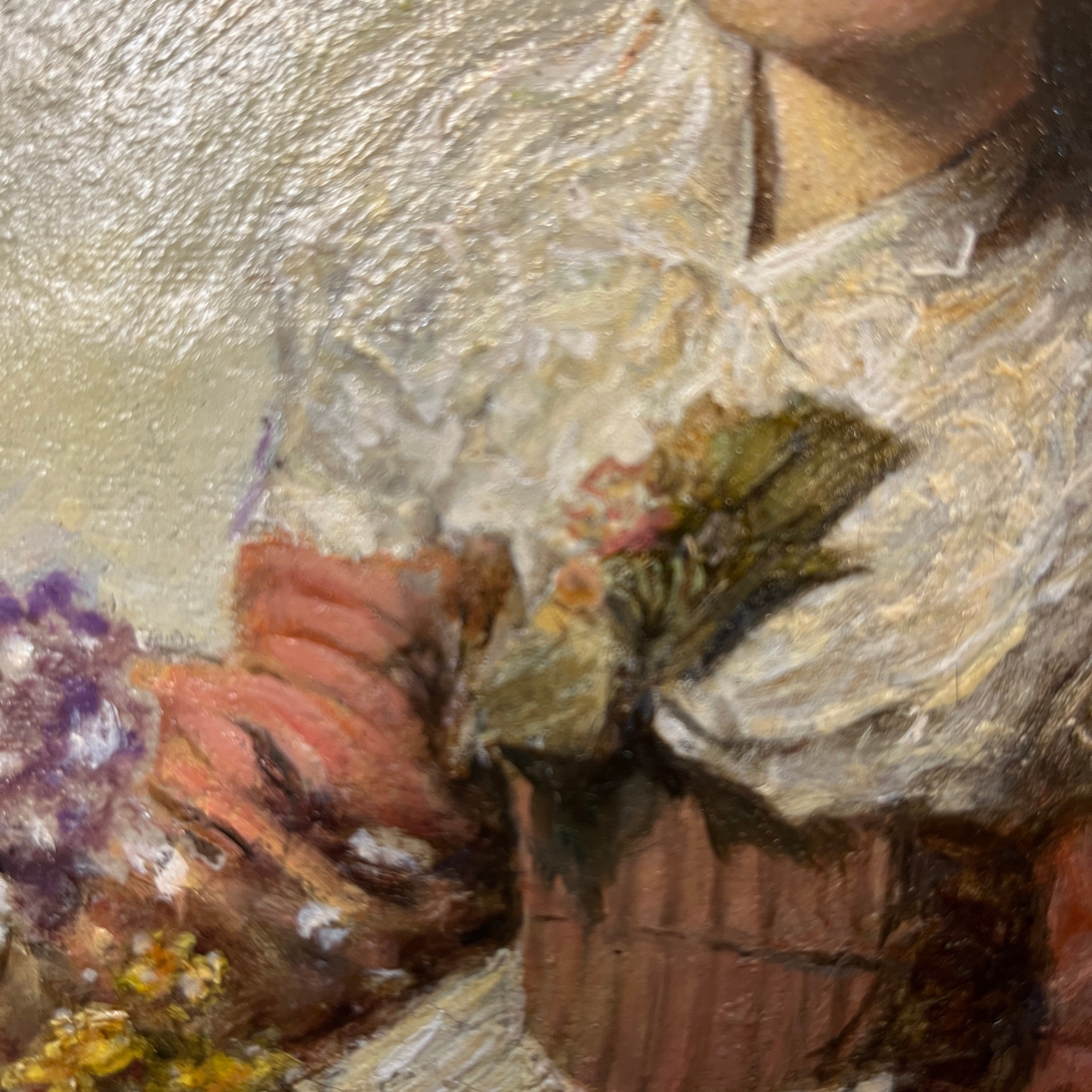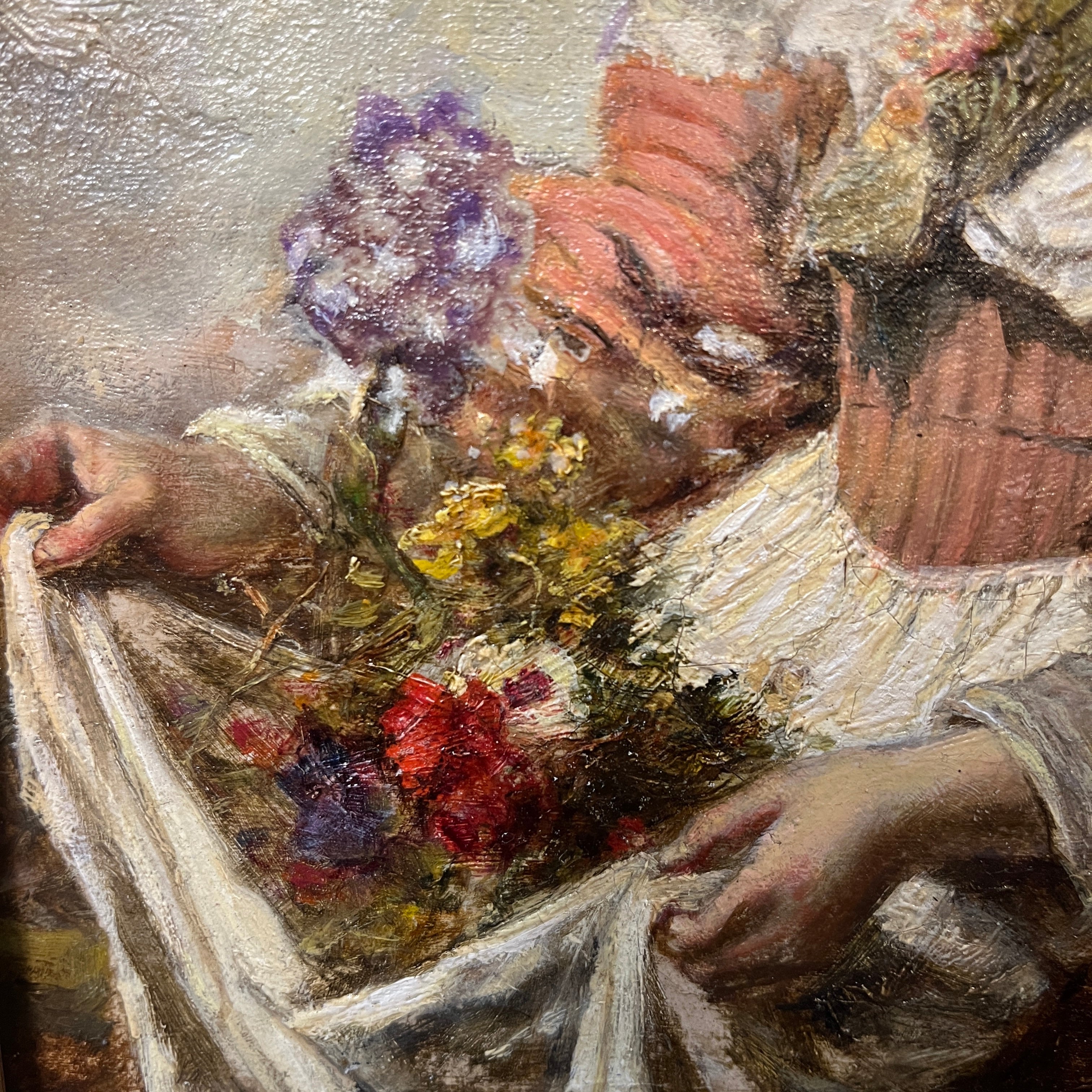Bellísima obra del pintor español Eduardo León Garrido (1856-1949) pintada en óleo sobre tela. Una mujer recolectando flores. El cuadro posee un imponente marco dorado y tallado.