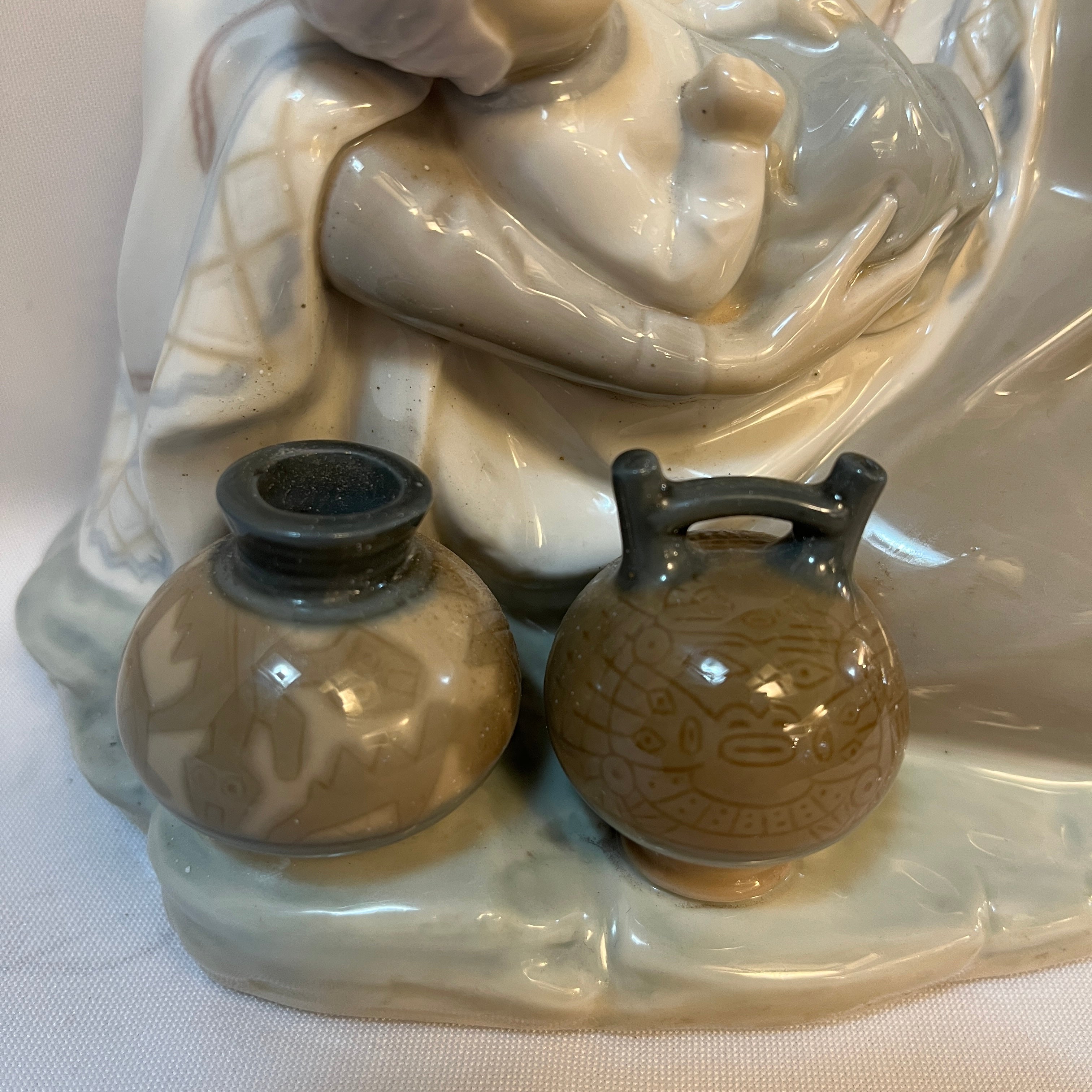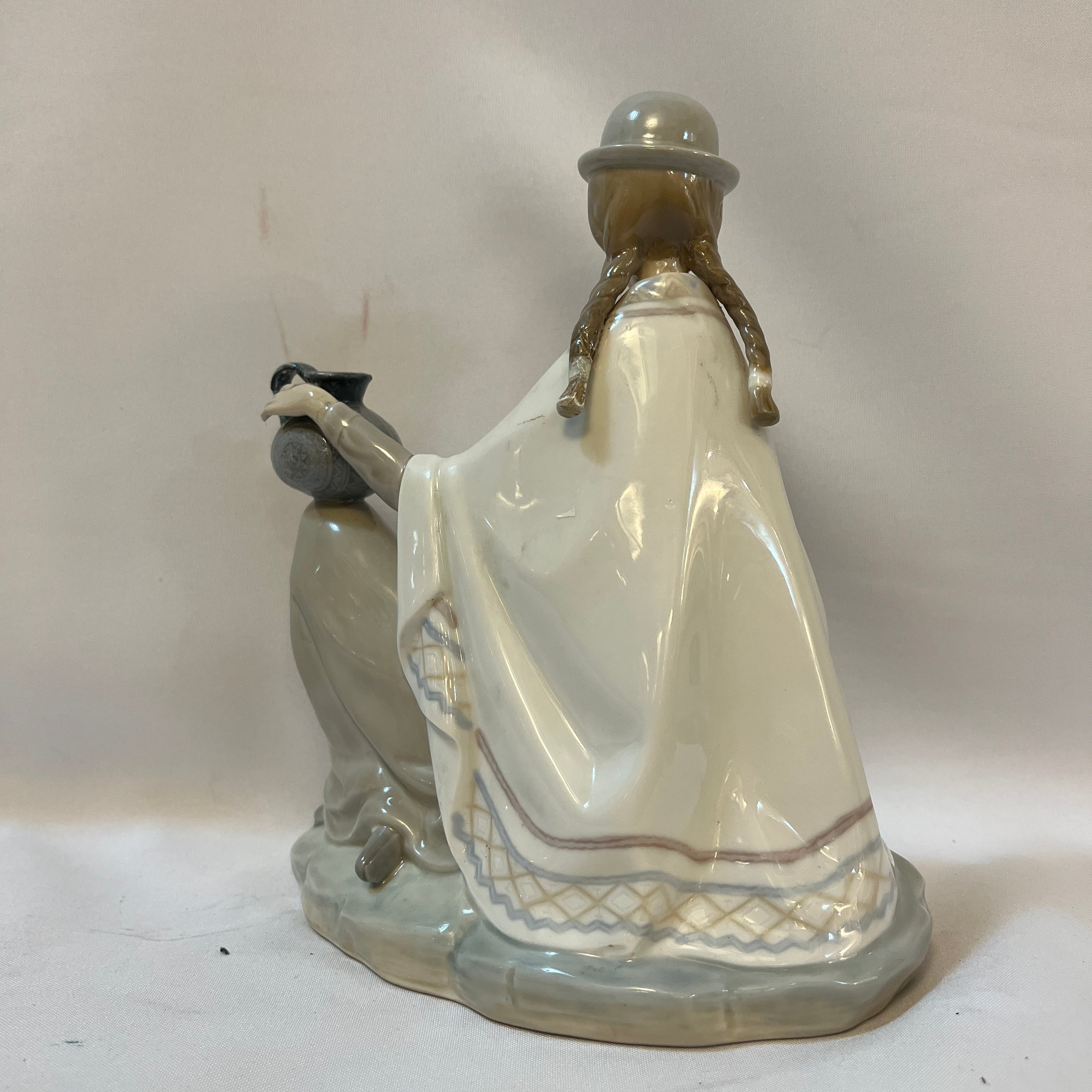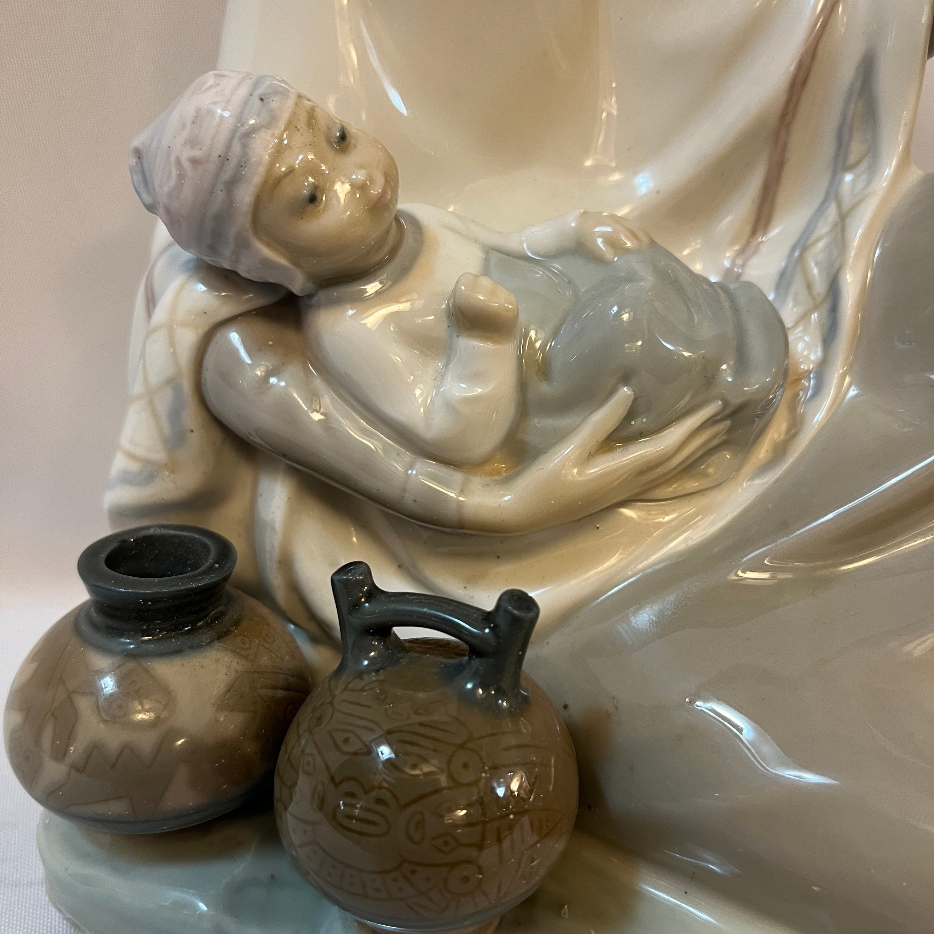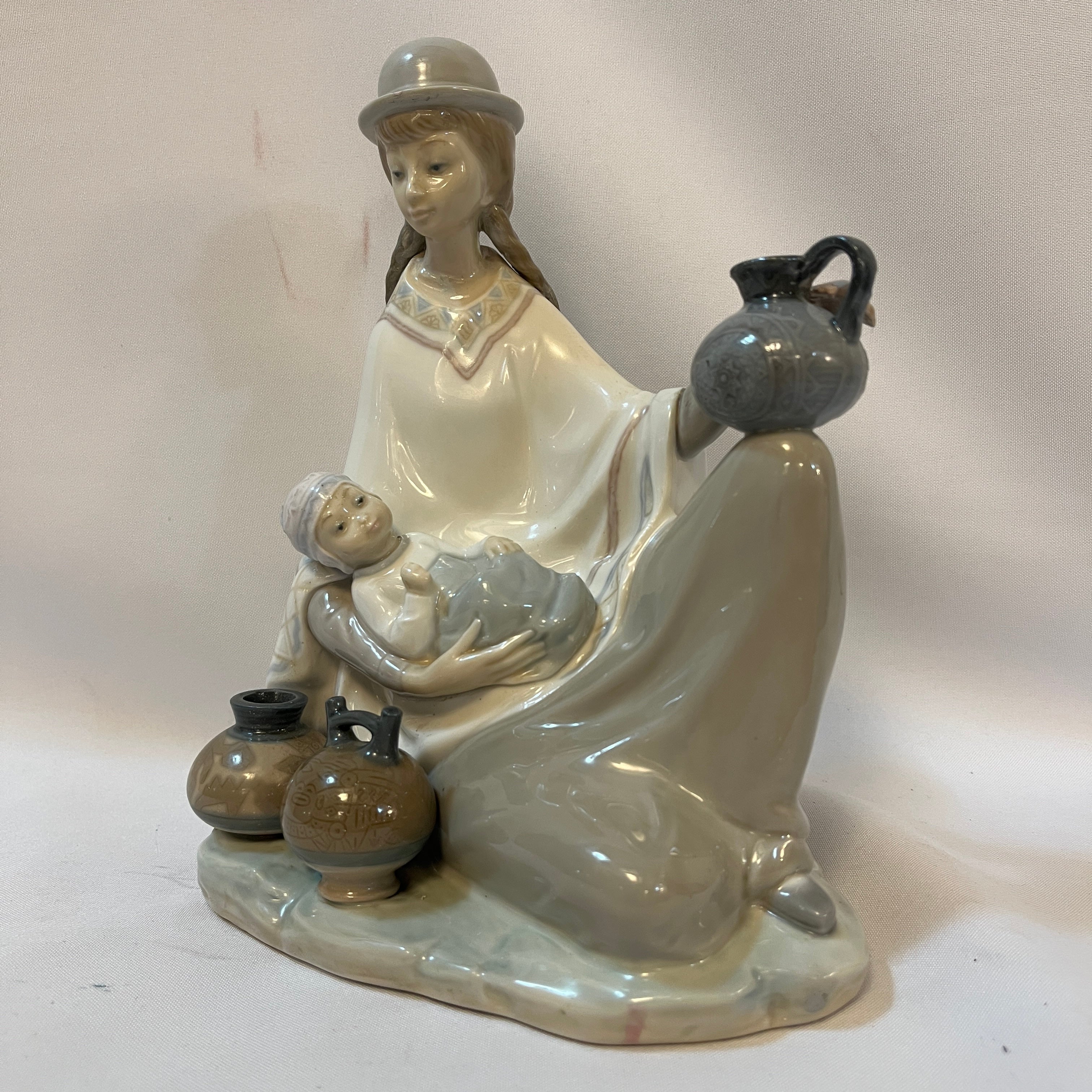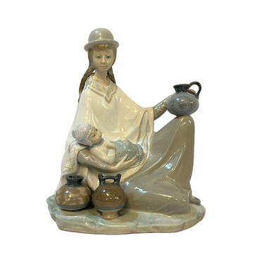 Conmovedora figura de porcelana de la reconocida marca española Lladró de una madre sentada con su bebé en los brazos representativa de la zona altiplánica sudamericana. La figura recoge con mucha precisión elementos característicos, como por ejemplo el poncho, sombrero, pero también podemos observar la preocupación de pintar las vasijas con diseños también muy propios de la zona. Es una pieza muy especial que destaca por lo novedoso del tema elegido.