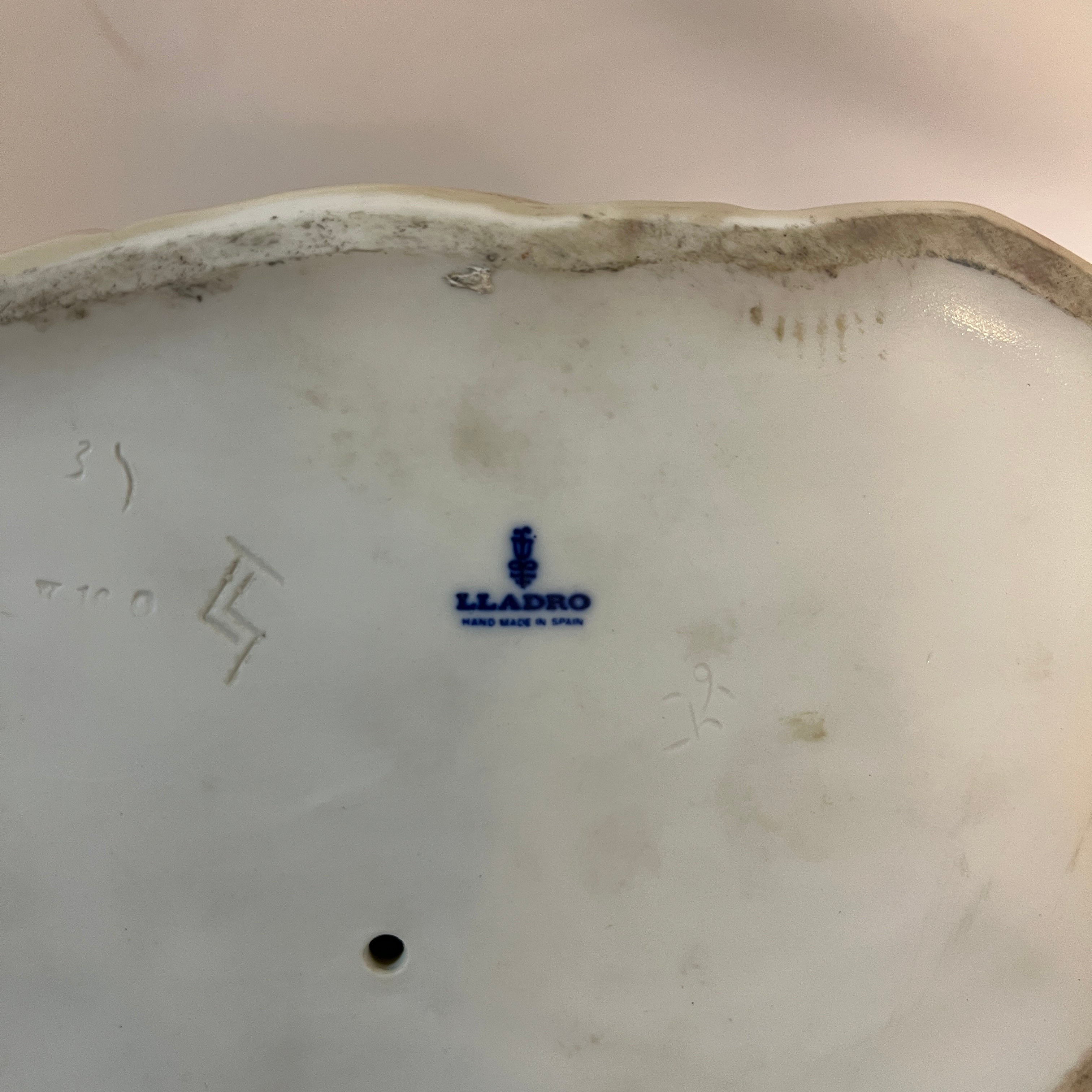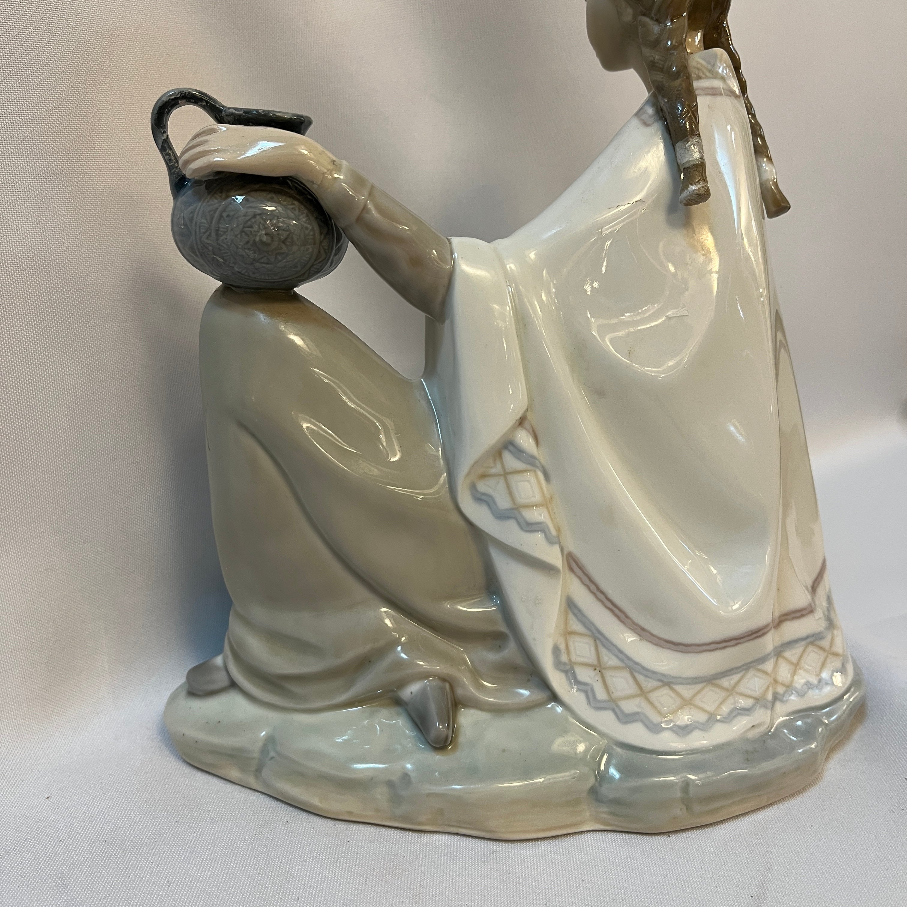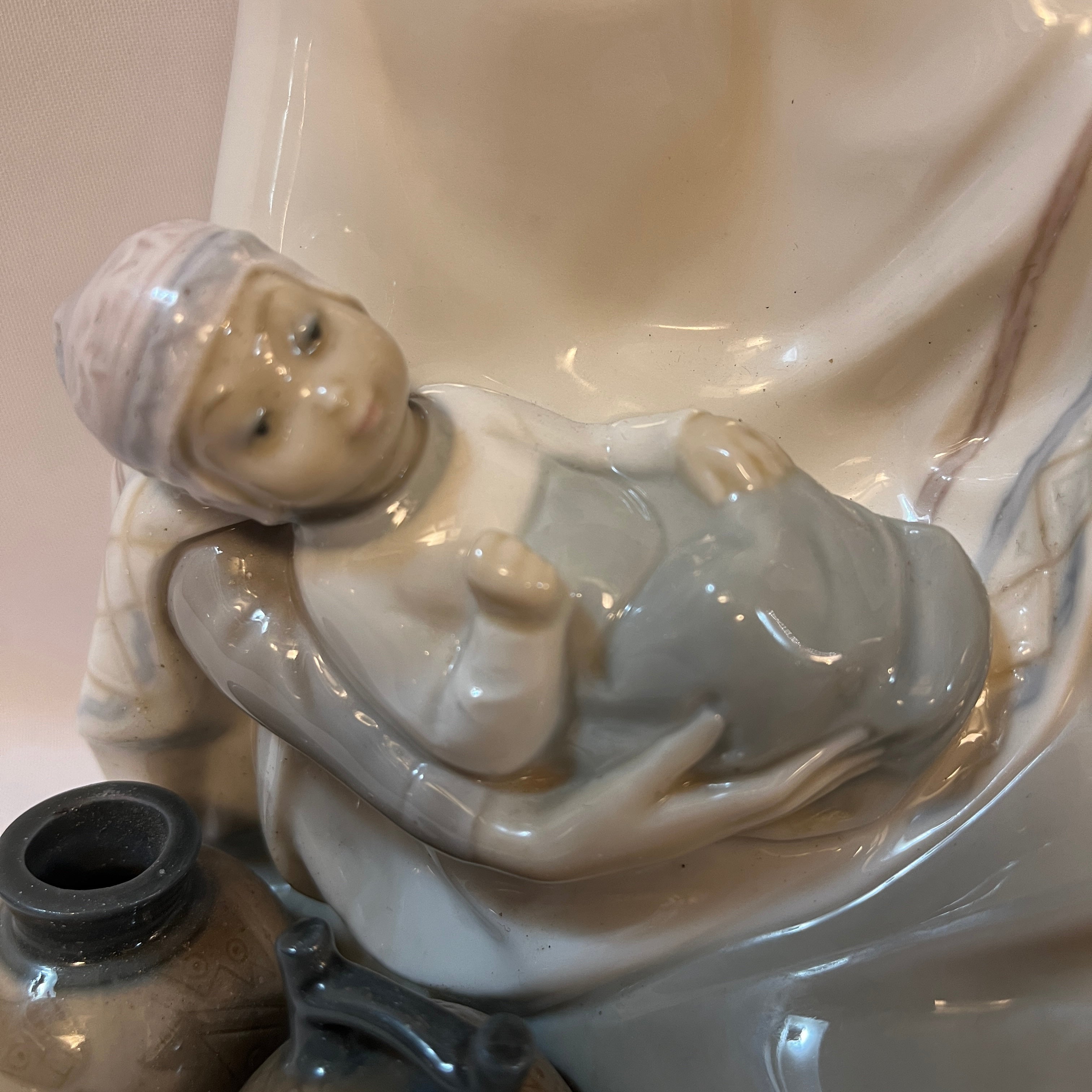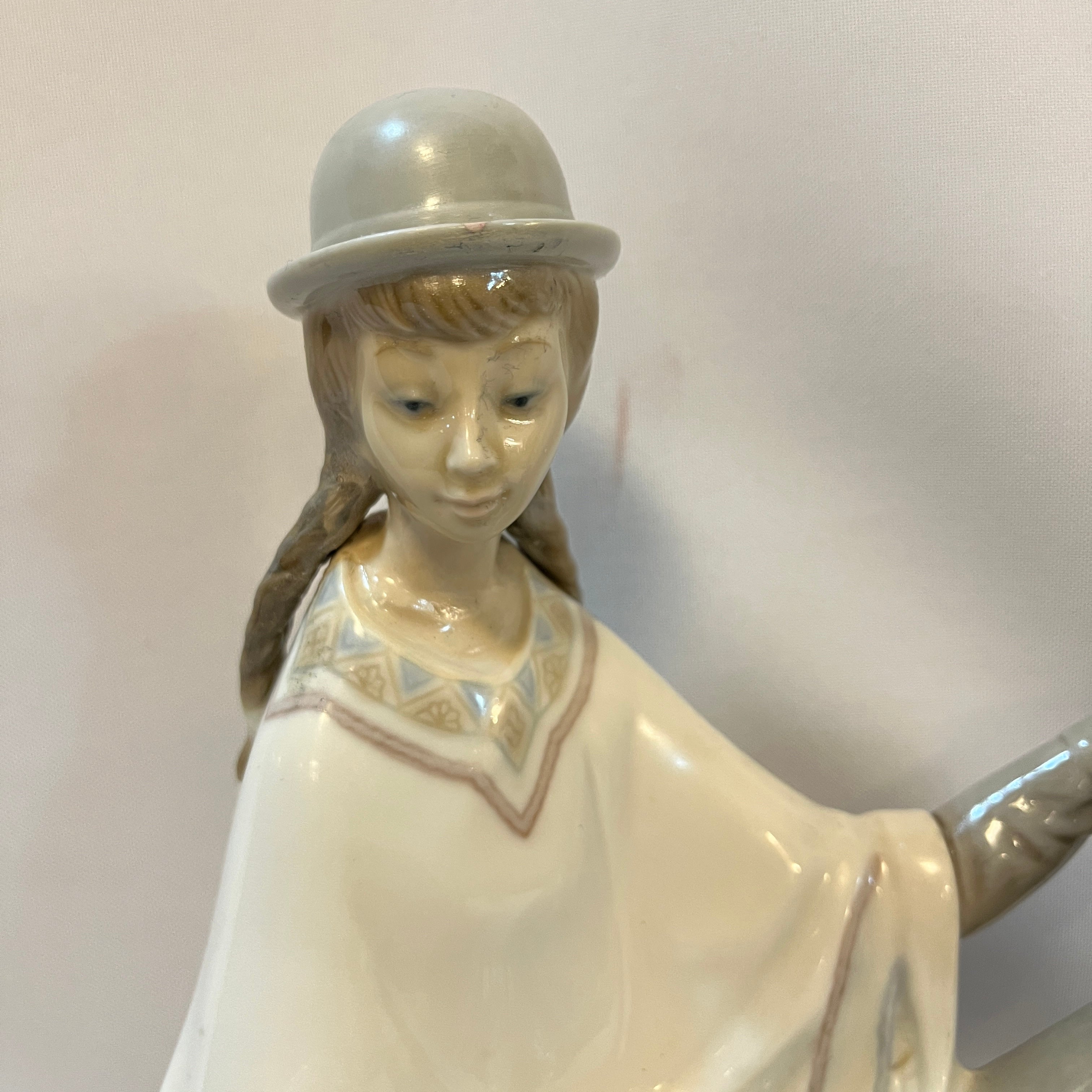 Conmovedora figura de porcelana de la reconocida marca española Lladró de una madre sentada con su bebé en los brazos representativa de la zona altiplánica sudamericana. La figura recoge con mucha precisión elementos característicos, como por ejemplo el poncho, sombrero, pero también podemos observar la preocupación de pintar las vasijas con diseños también muy propios de la zona. Es una pieza muy especial que destaca por lo novedoso del tema elegido.