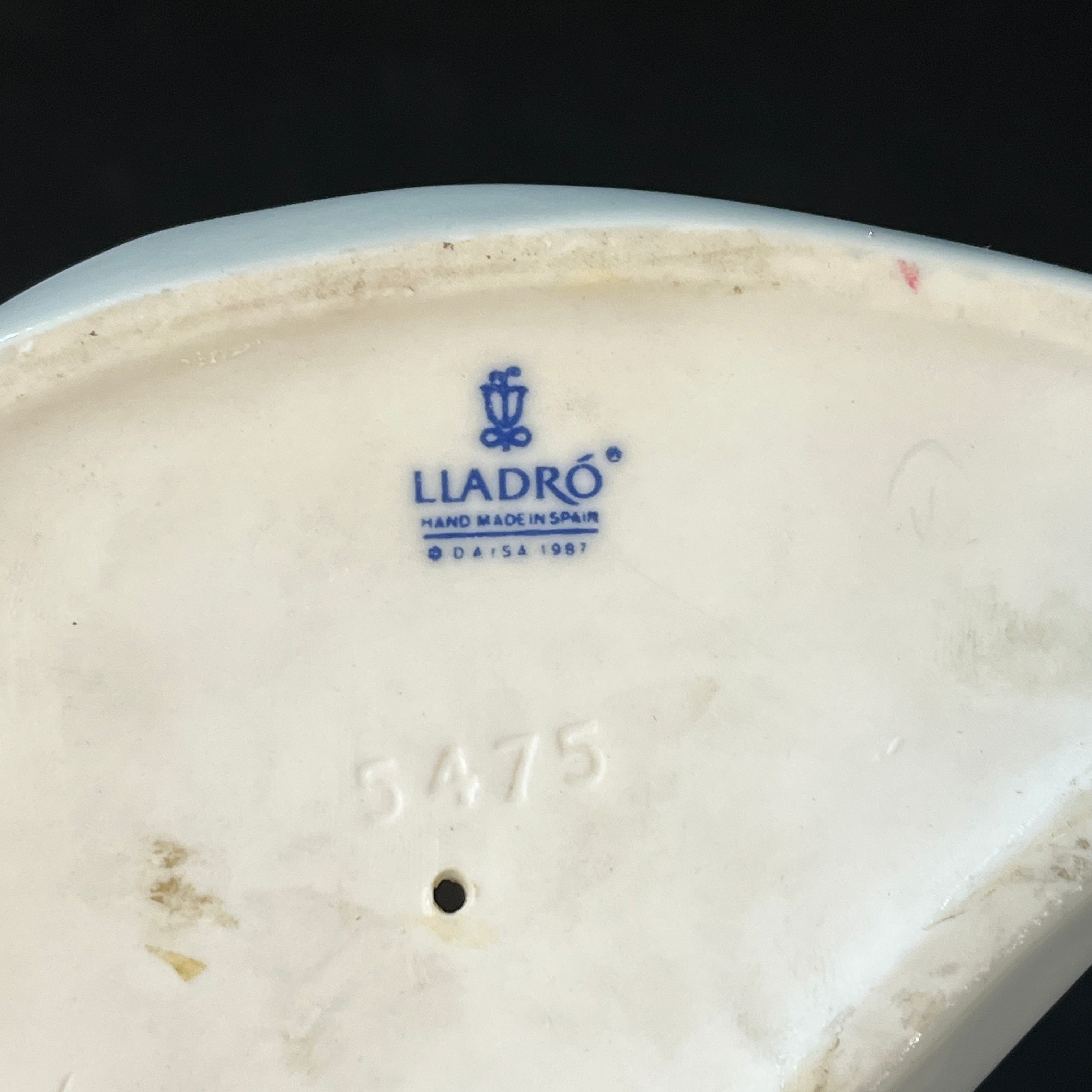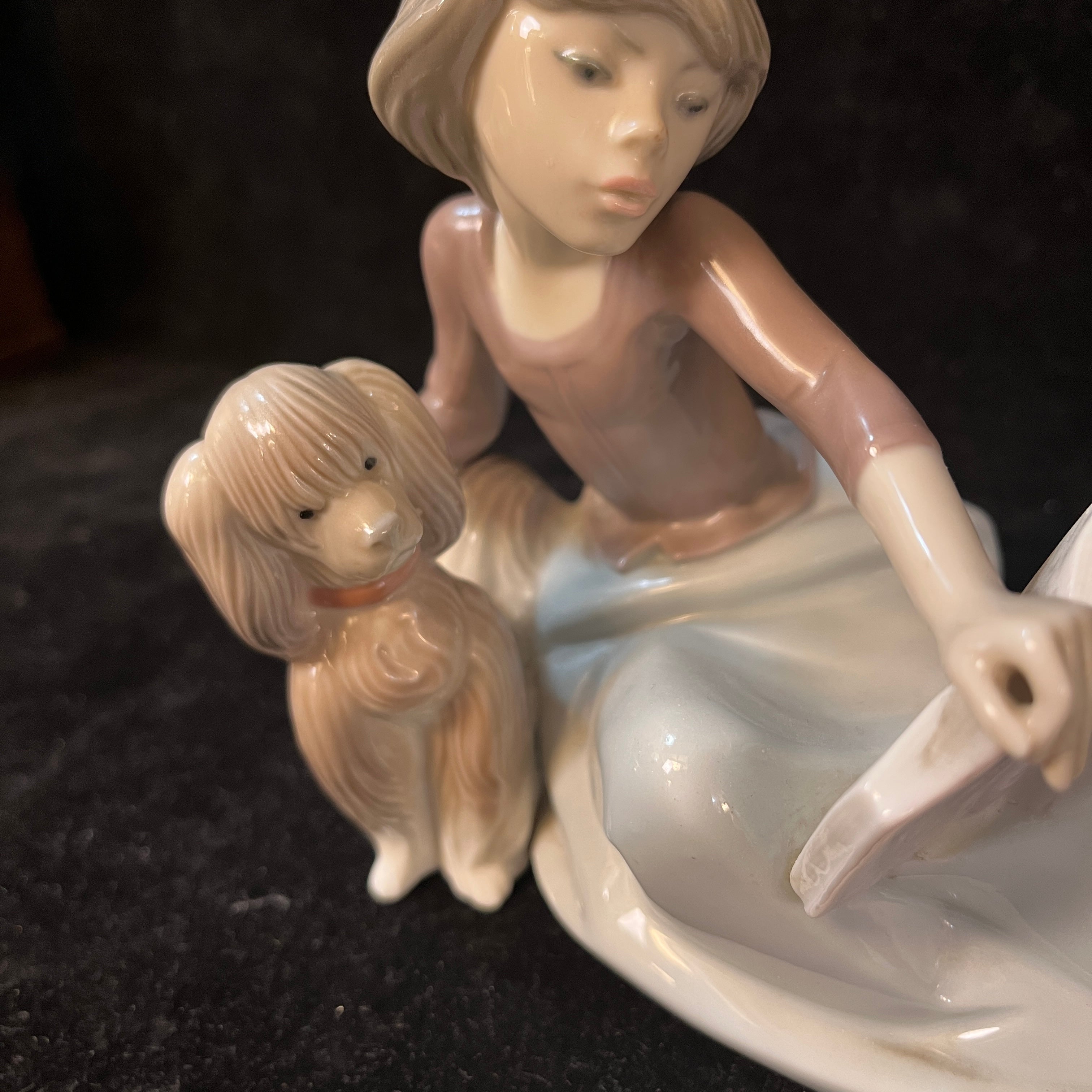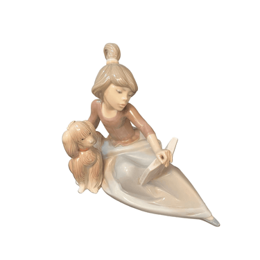 Bella figura de porcelana española de la reconocida marca Lladró, representando a una niña concentrada leyendo un libro junto a un tierno perrito. La figura está esmaltada en tonos pastel de rosas, anaranjados y café.